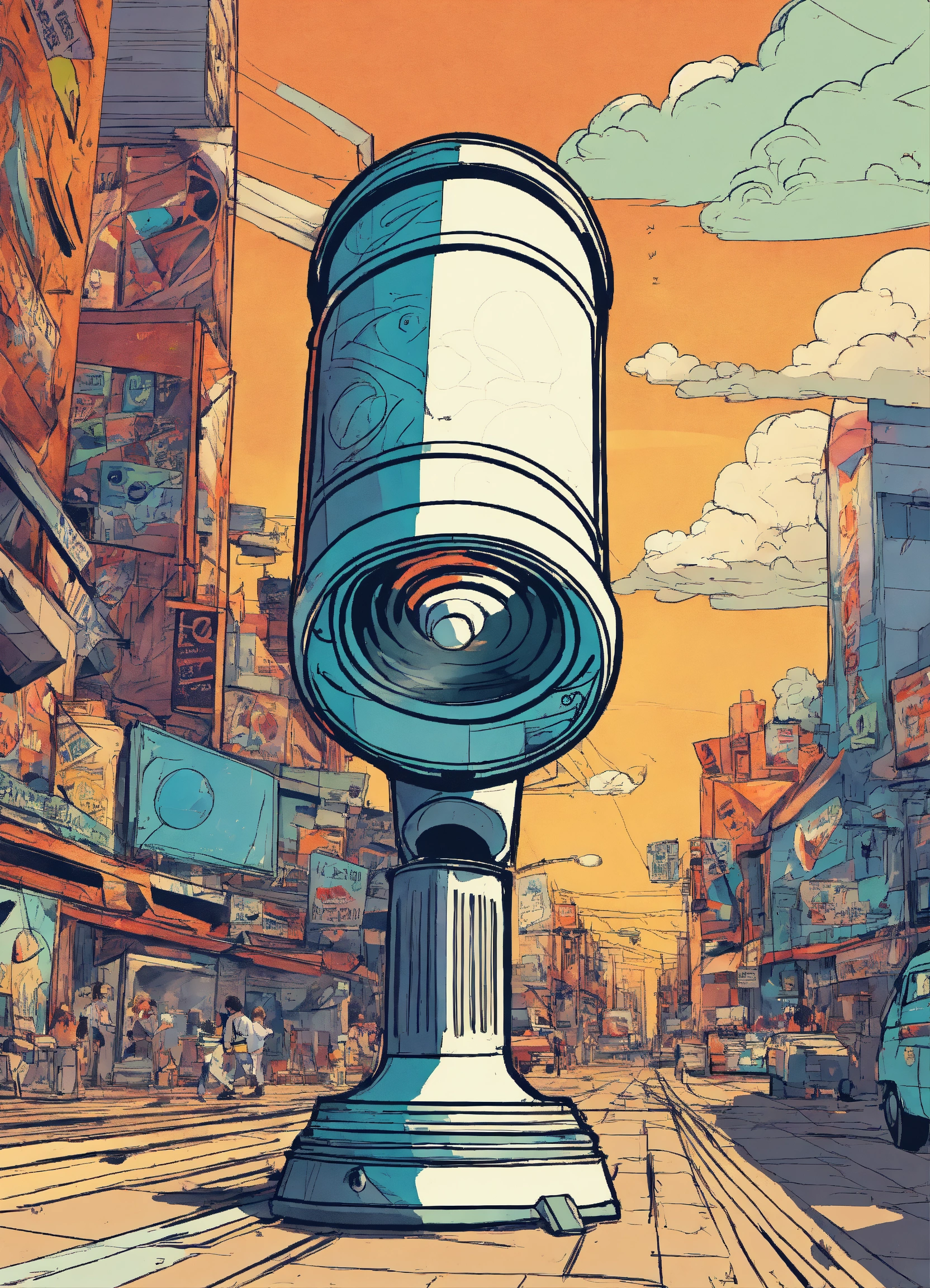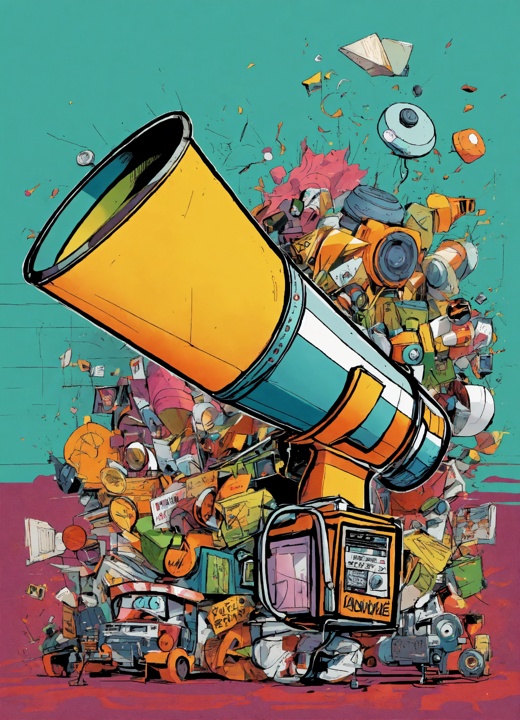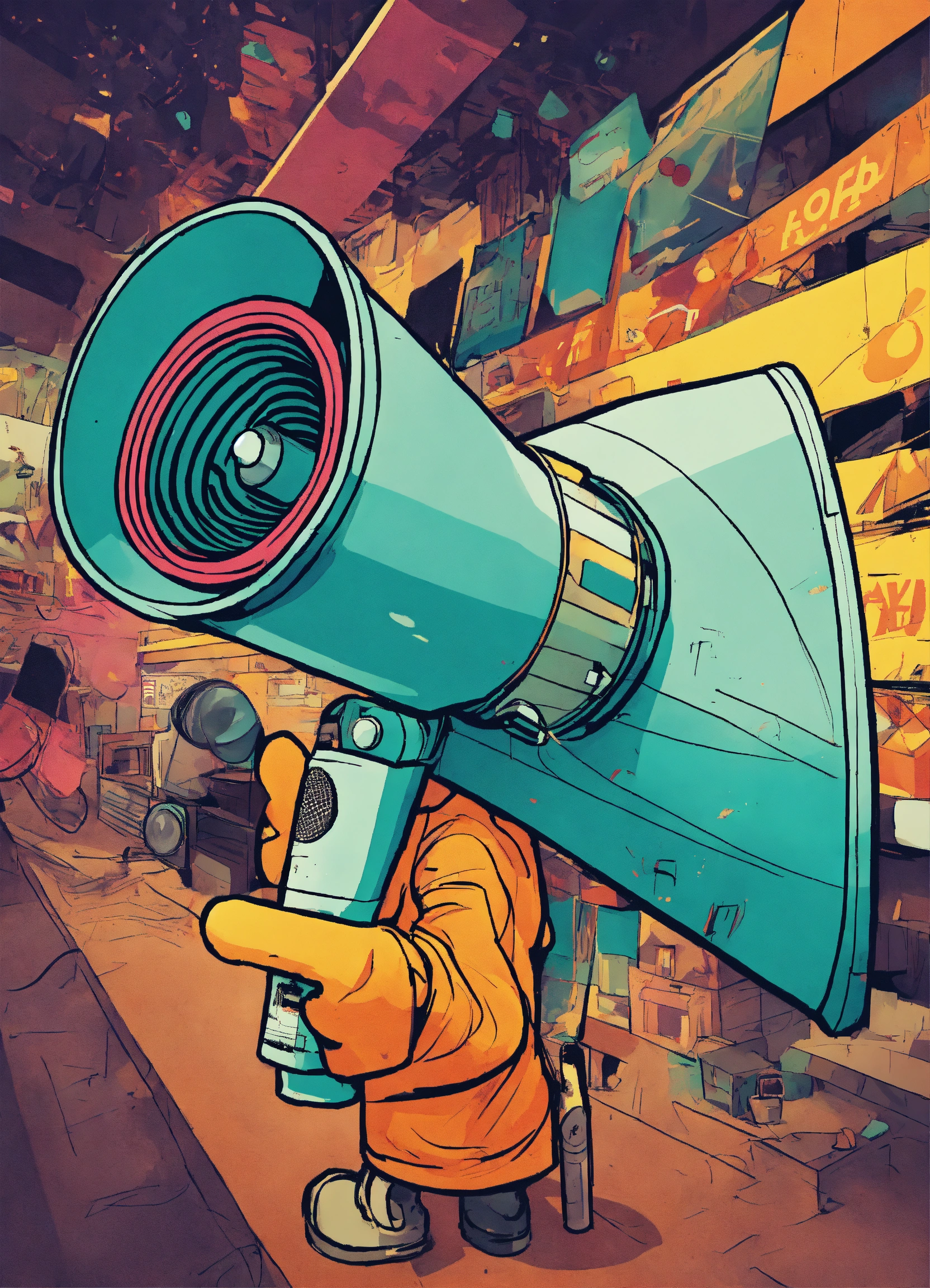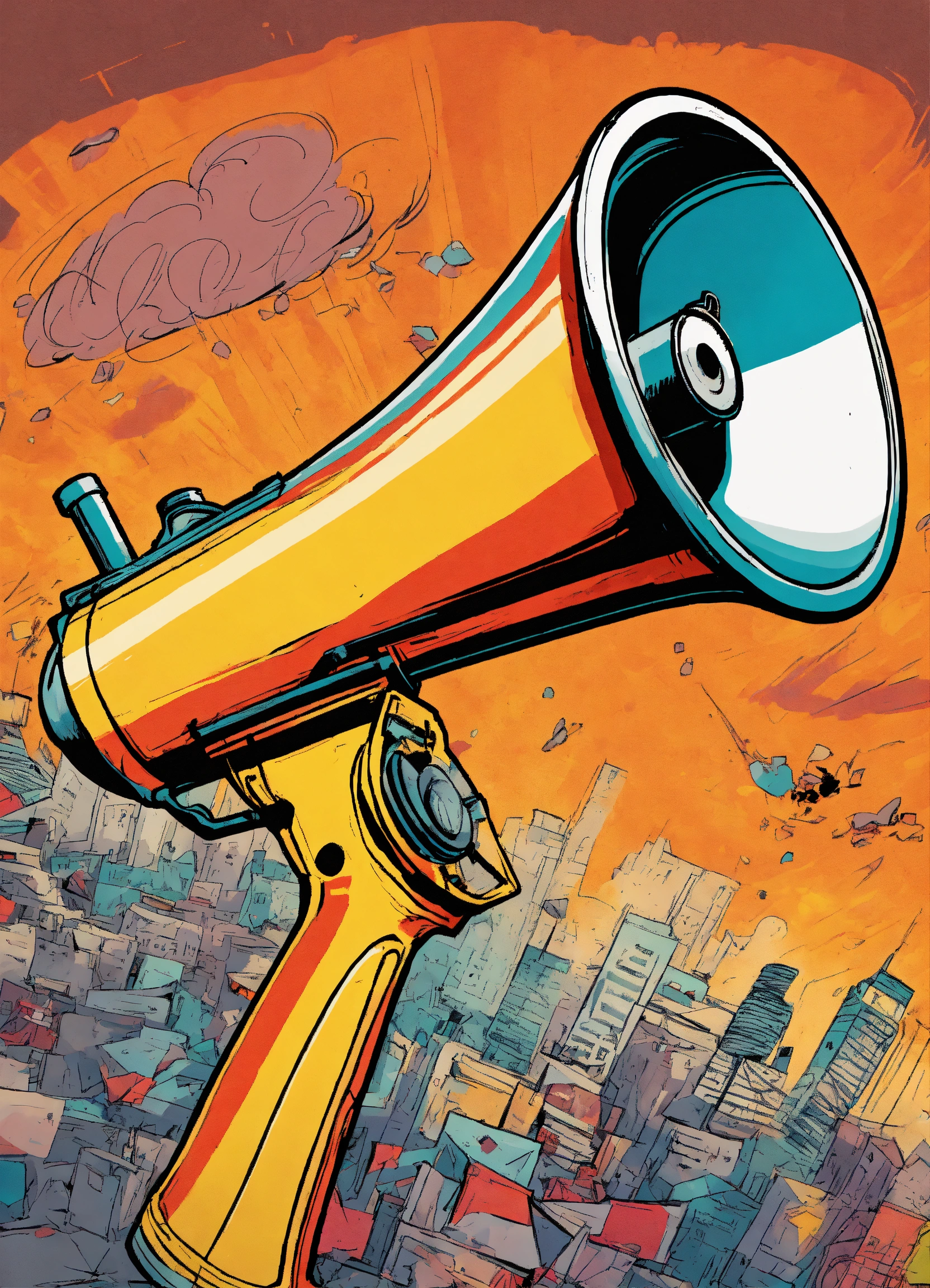 Create a dynamic comic book-style drawing of a megaphone. begin by sketching the basic shape, featuring a cylindrical body for the speaker part and a handle at the bottom. add details like buttons, edges, and iconic stickers with words like 'bang' for a striking effect. illustrate motion and action through dynamic lines, implying the direction of sound or usage. use vibrant, eye-catching colors typical of comic illustrations, incorporating shadows for depth. place expressive stickers strategically, enhancing the visual impact. consider a background that complements the megaphone's character, such as sound waves or action scenes, to bring the drawing to life
