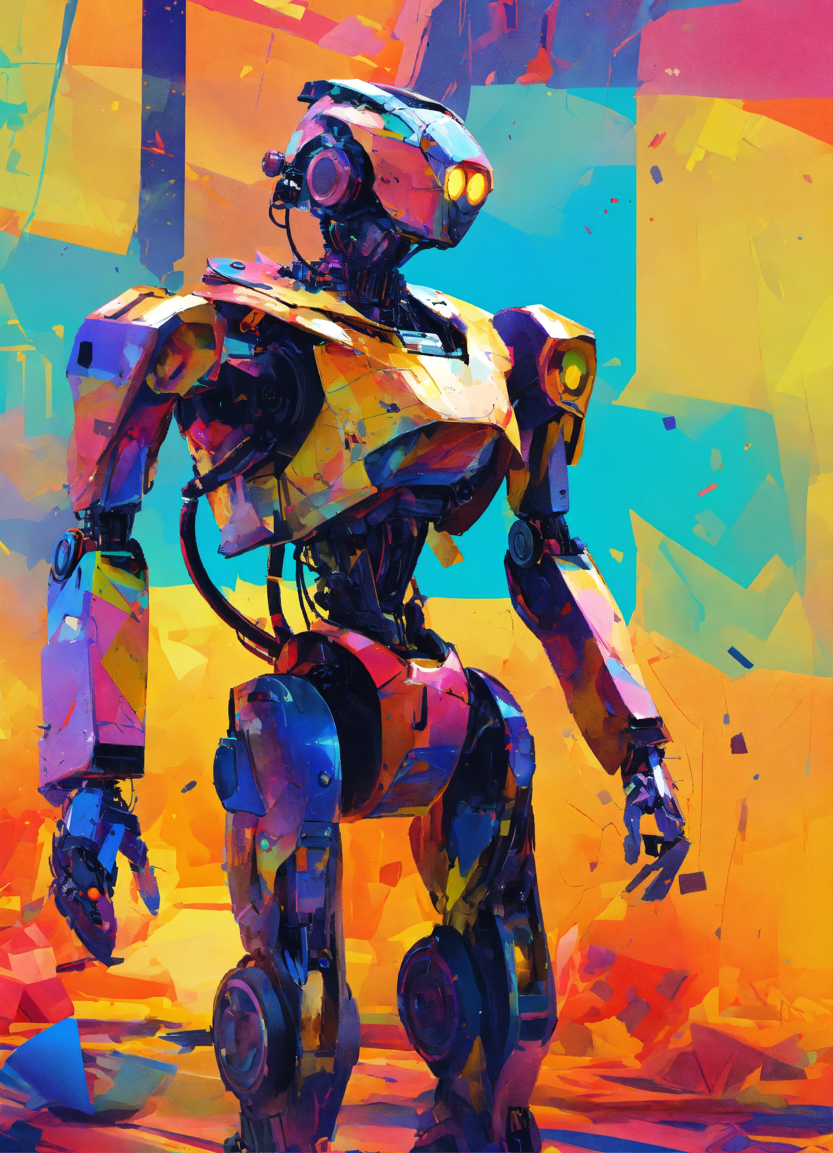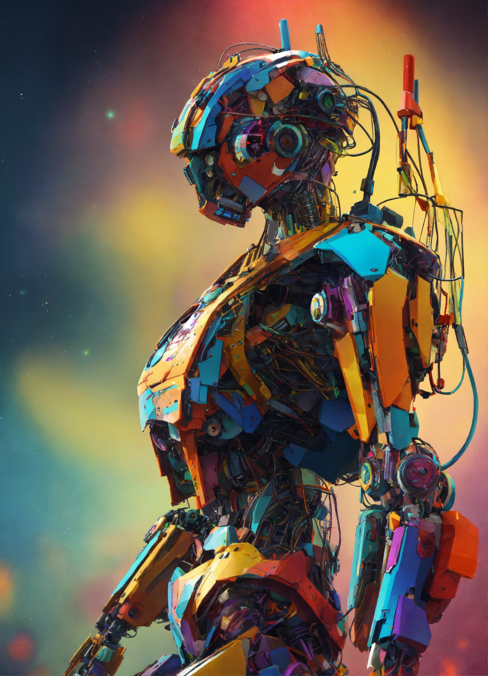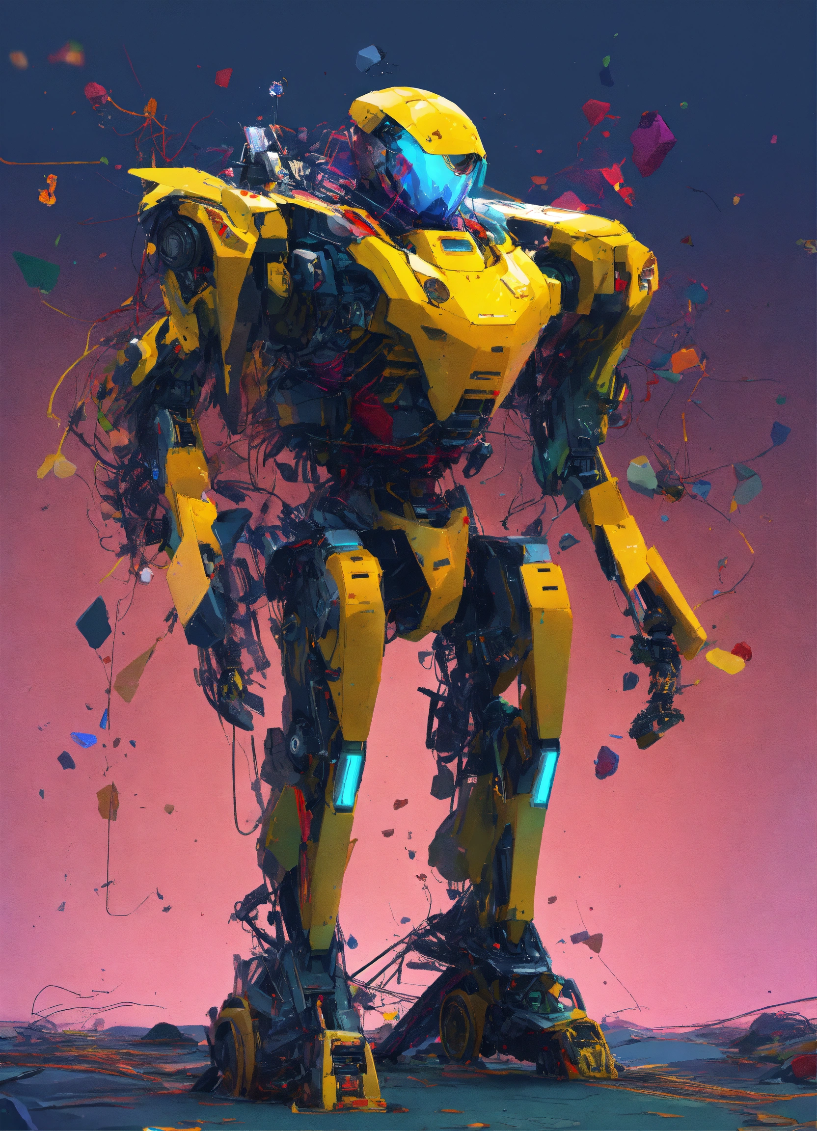 A deconstructed robot, chaotic, organic, digital, living being, approaching dangerously to the front, in colors #5ac307, #010101, and #82da12, rendered in abstract robot deconstructed style.