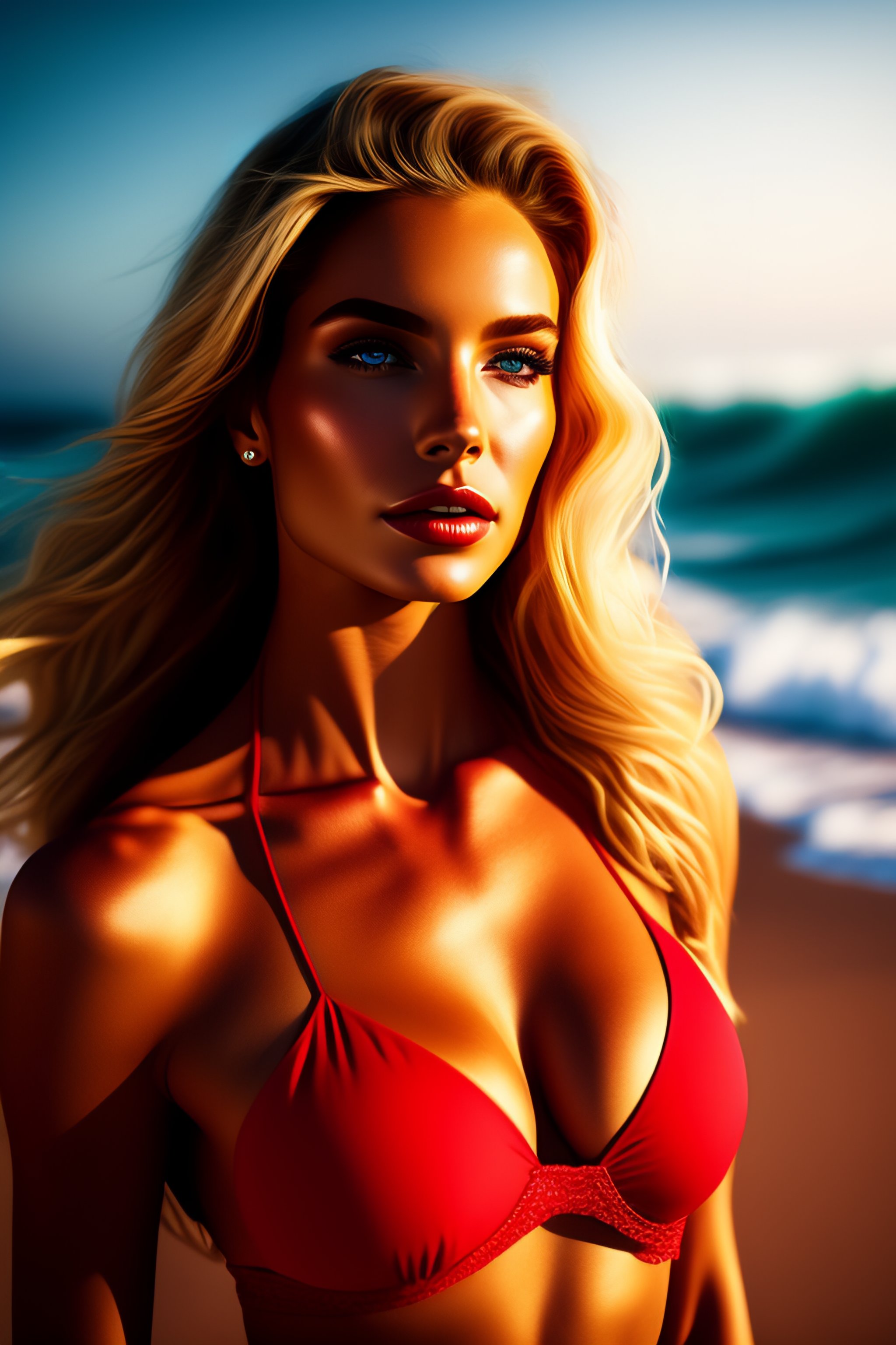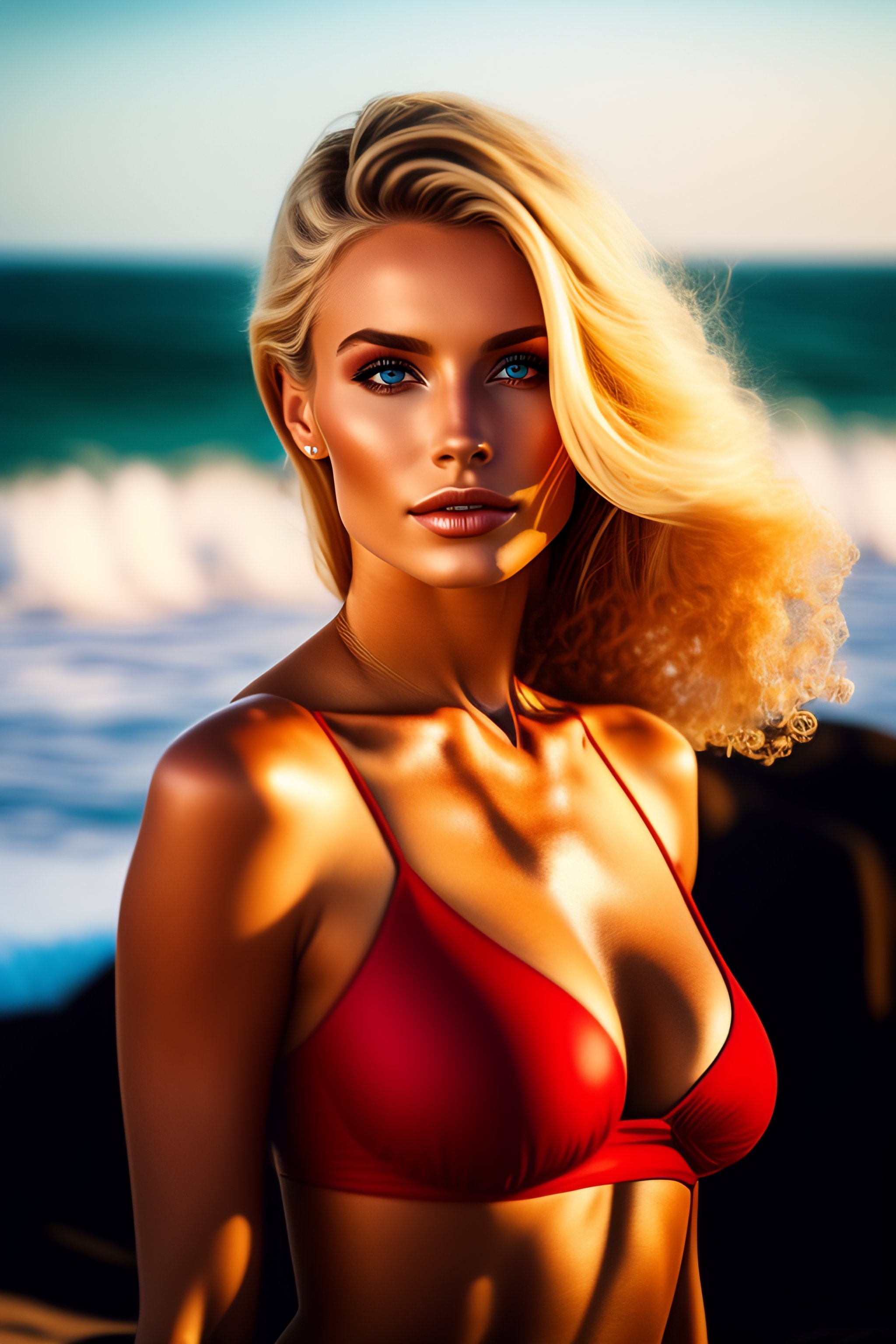 Beautiful blonde haired woman in red bikini lying on a beach with the ocean in the background, cinematic style
