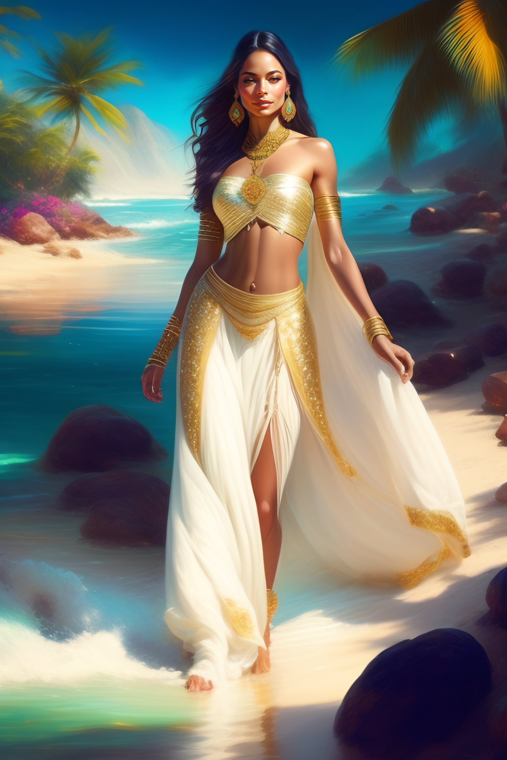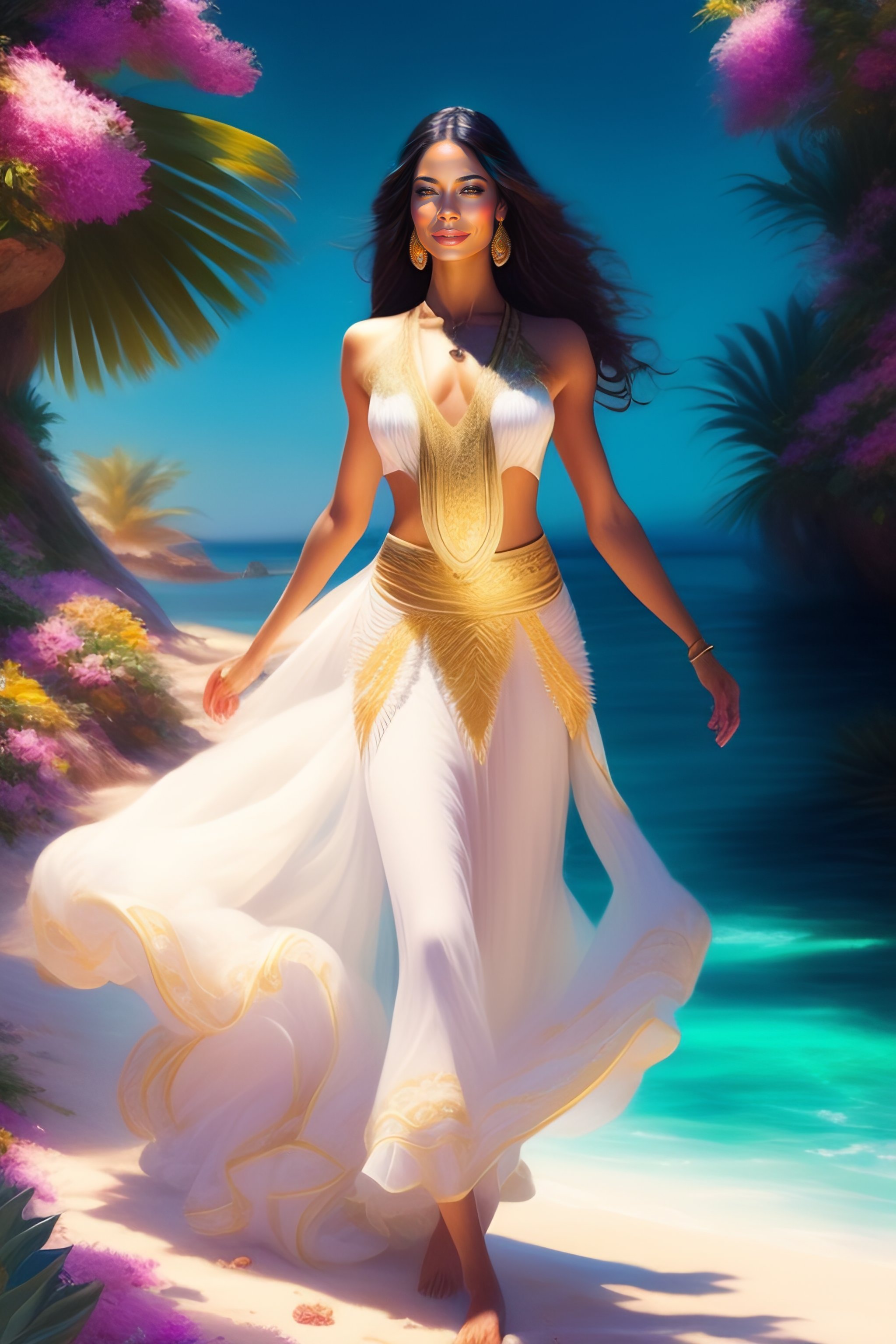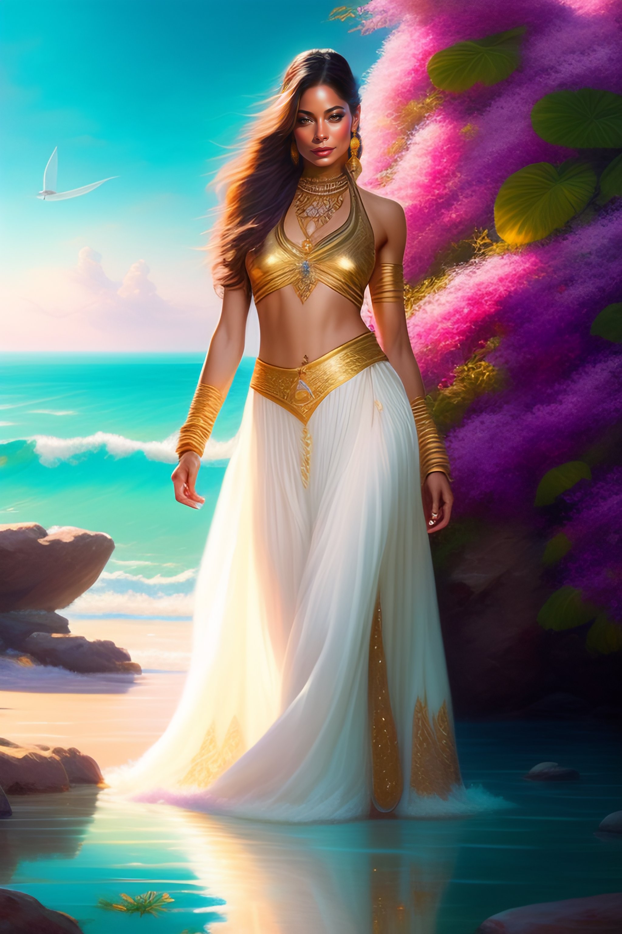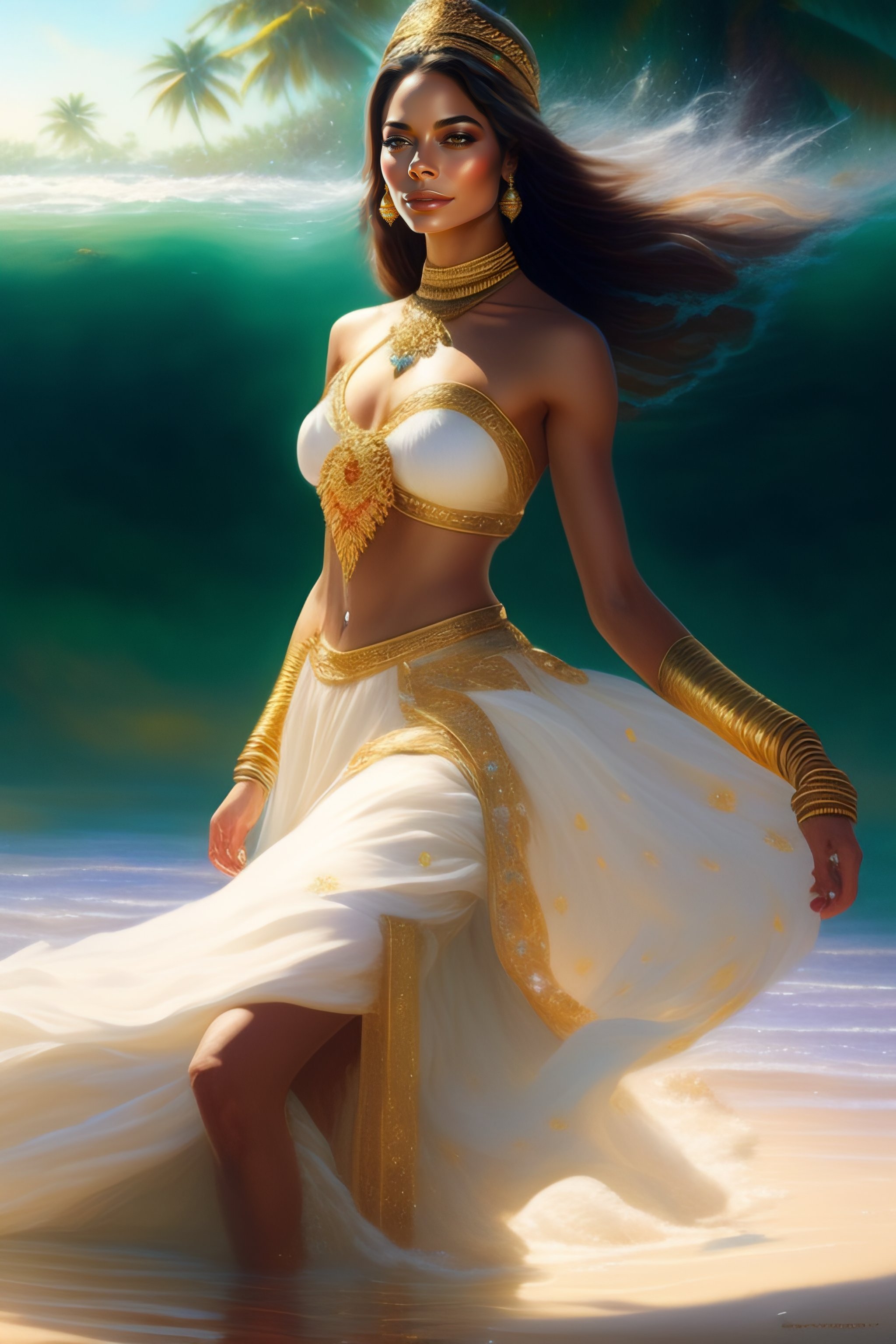 Kristin kreuk beautiful arabian princess wearing white clothes and gold jewels dancing in water on tropical beach with greeneries and colorful flowers, full-body view, greg rutkowski, ultra detailed, volumetric lighting