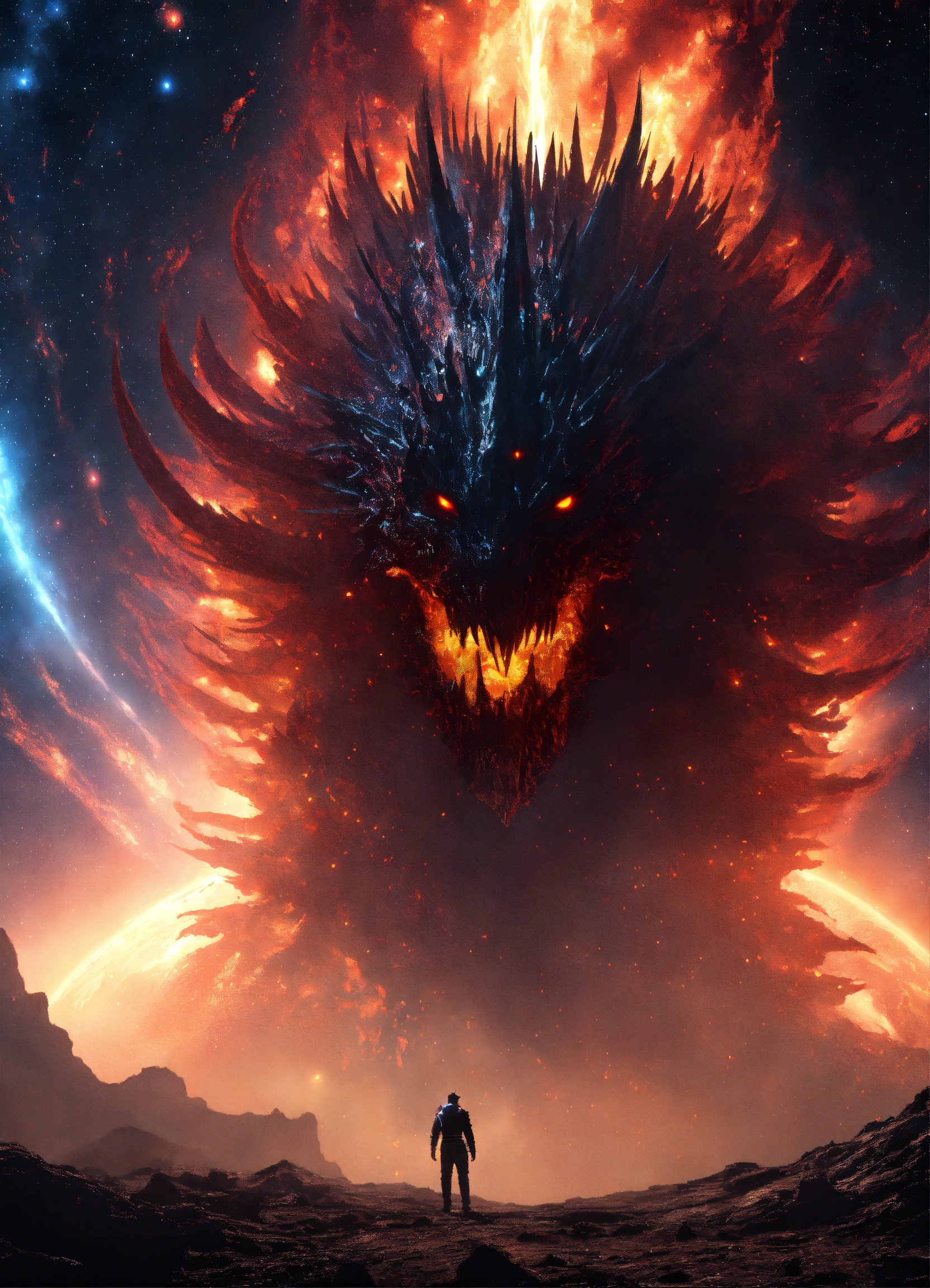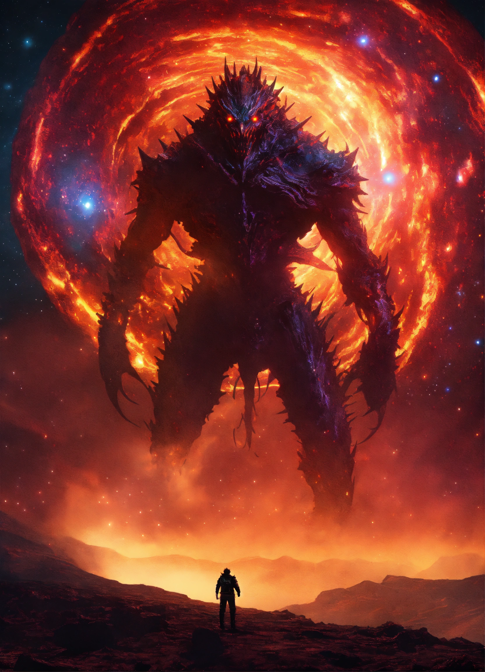 8k uhd - gothic sci-fi - dramatic shadows - a colossal space monster, adorned with spiky ridges and glowing eyes, emerges menacingly from the swirling vortex of a wormhole, set against a backdrop of distant stars and nebulae.