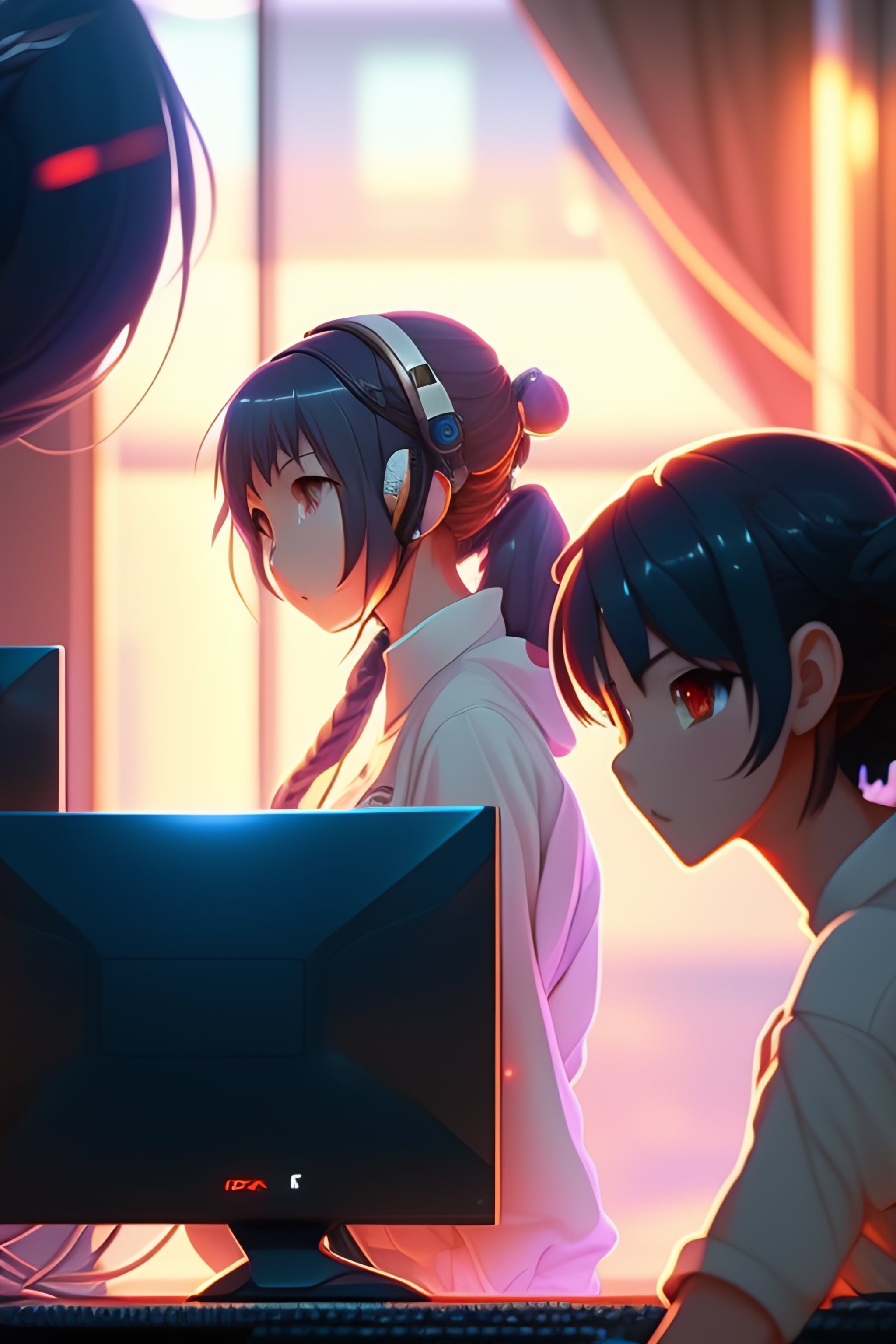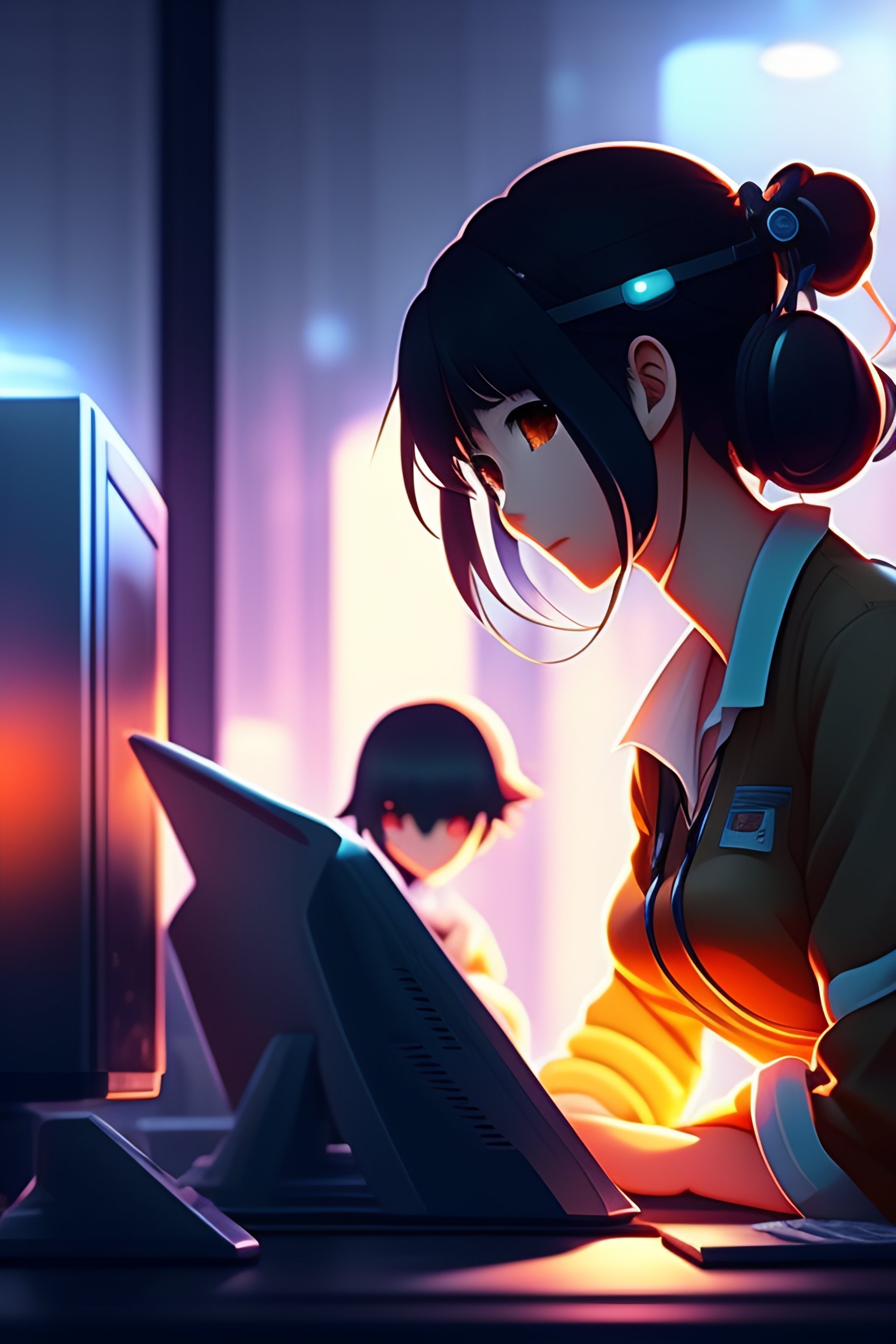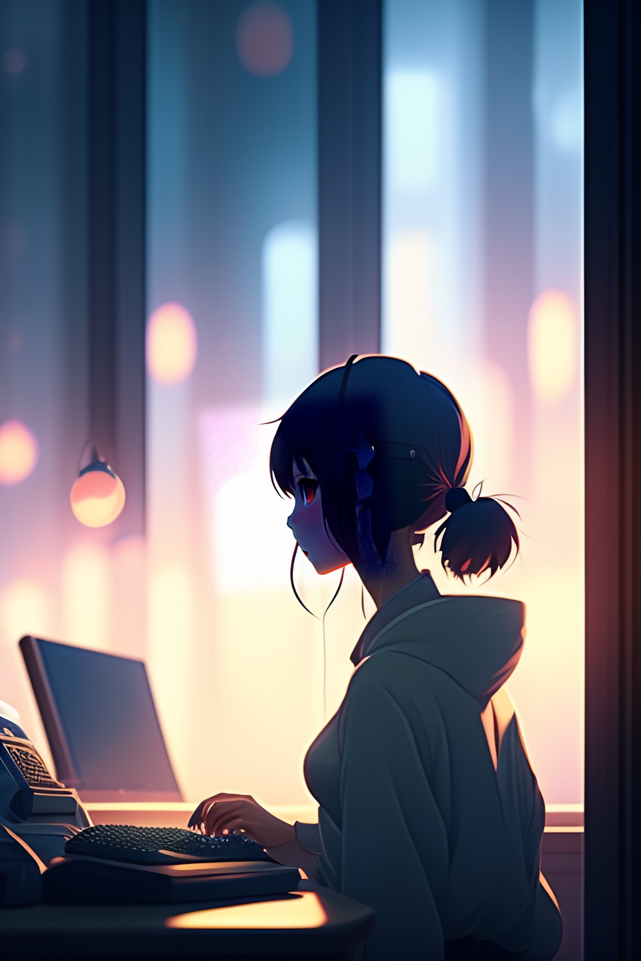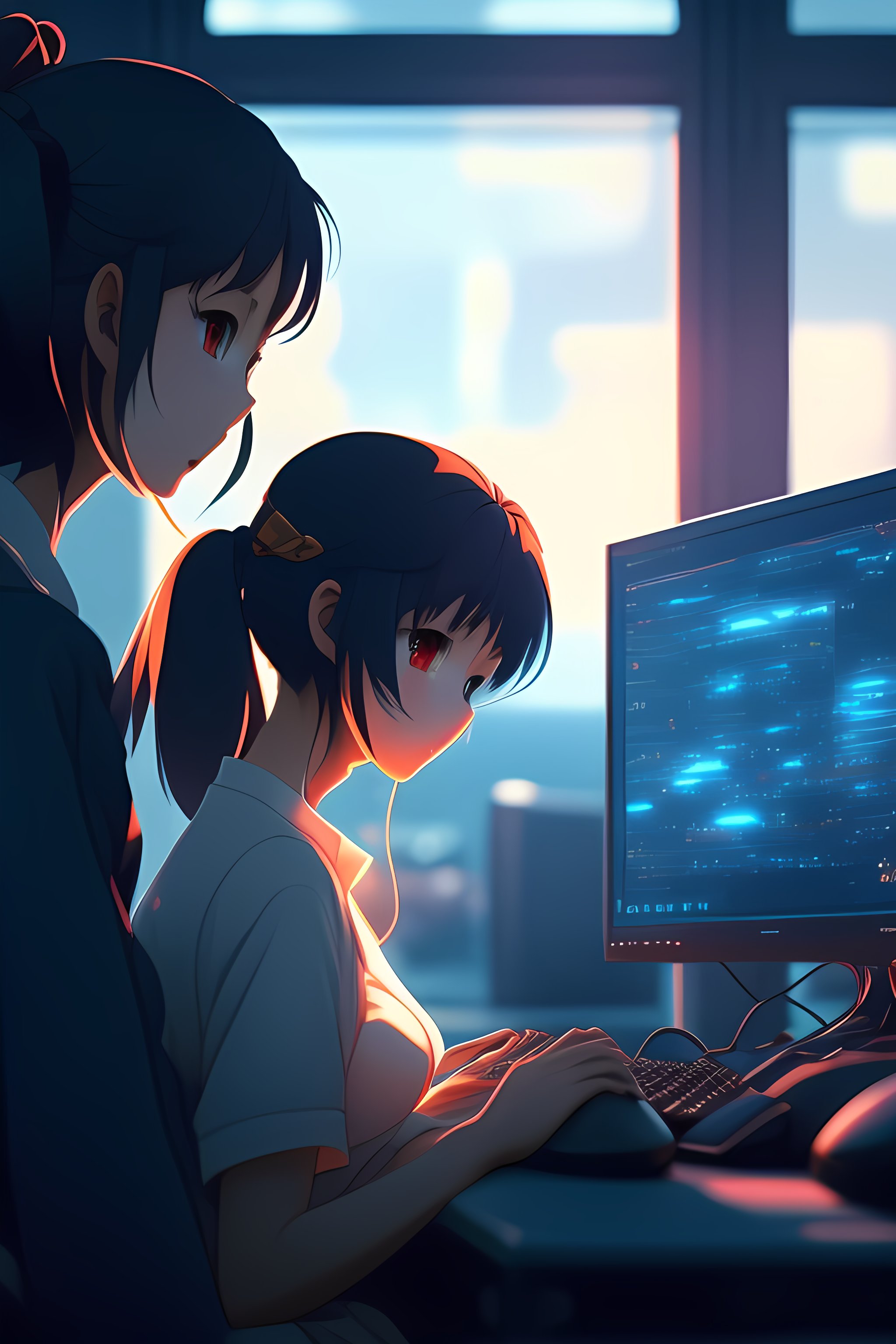 Create a high resolution artwork of anime girl is programming at a computer in a room full of gadgets, web developer, by makoto shinkai and ghibli studio, outlined silhouettes, dramatic lighting, highly detailed, incredible quality, trending on artstation, masterpiece, 8k