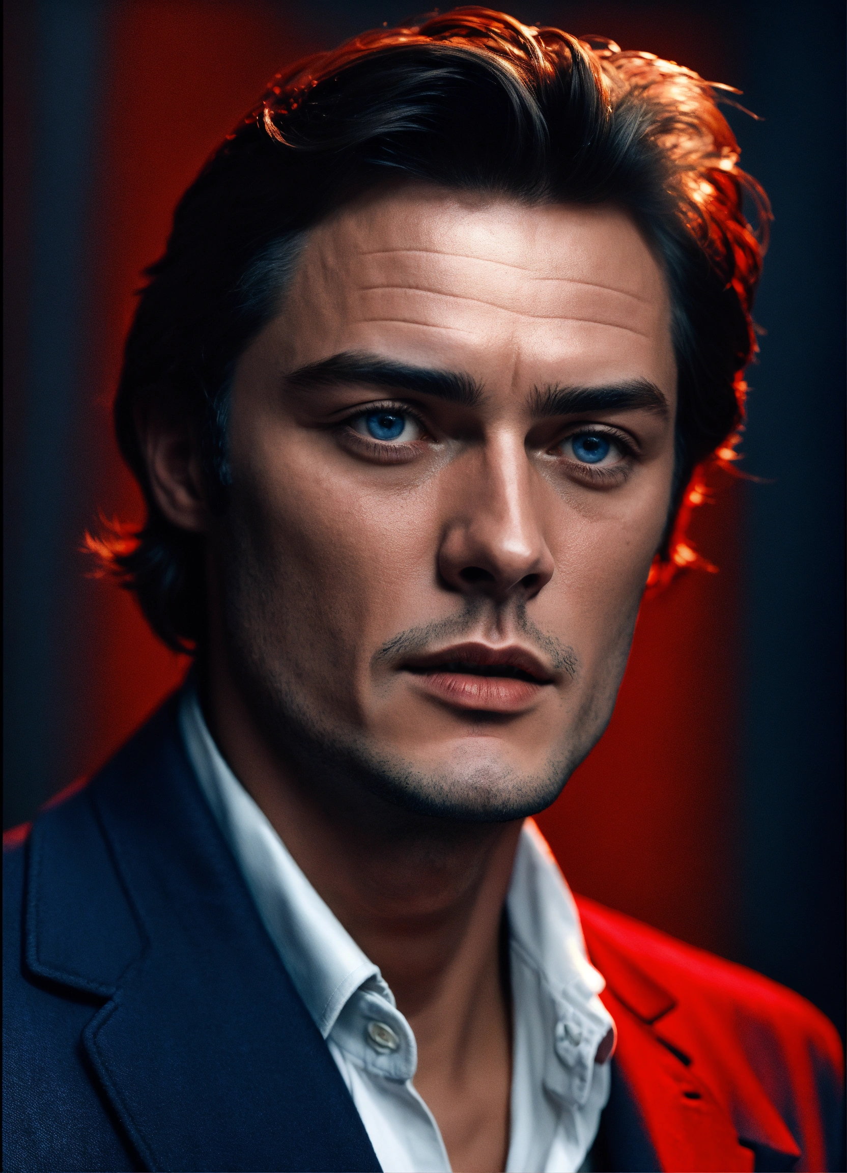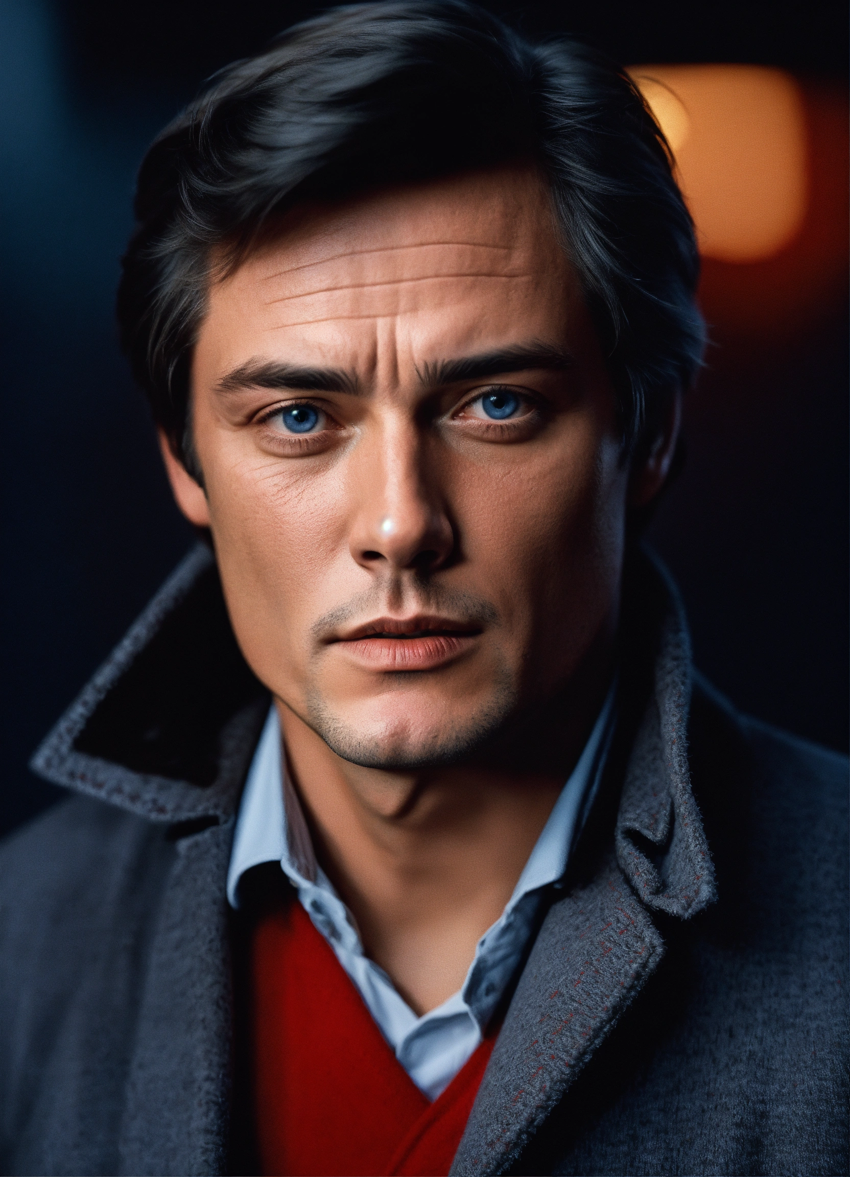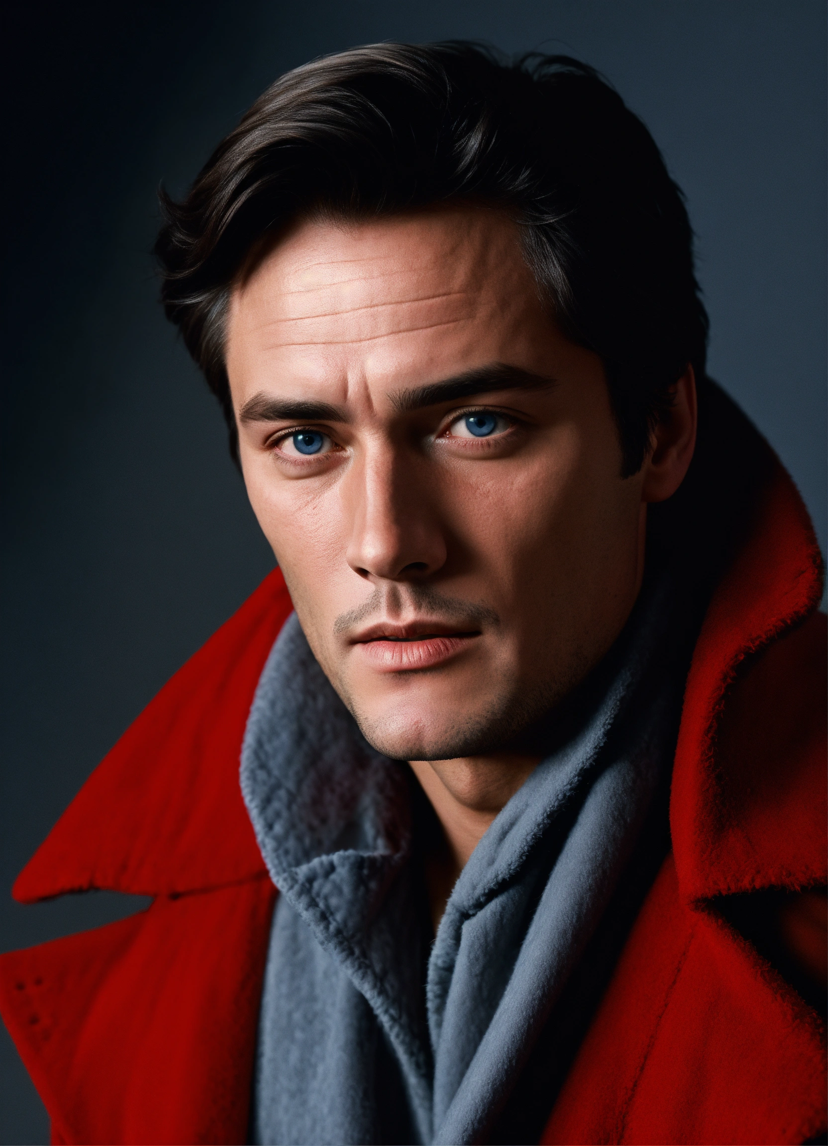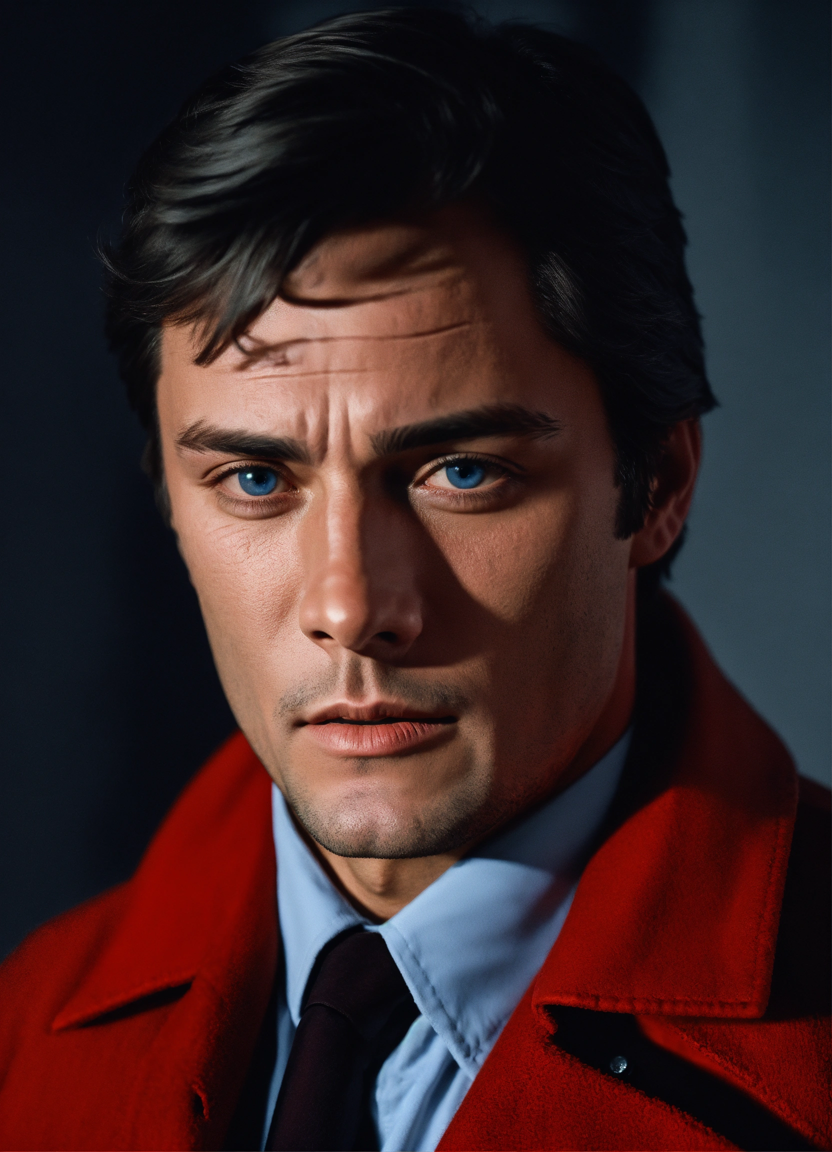 Portrait of alain delon, clean shaven, blue eyes, red clothing, grey coat, whit a black background, dark lighting, realistic, photo