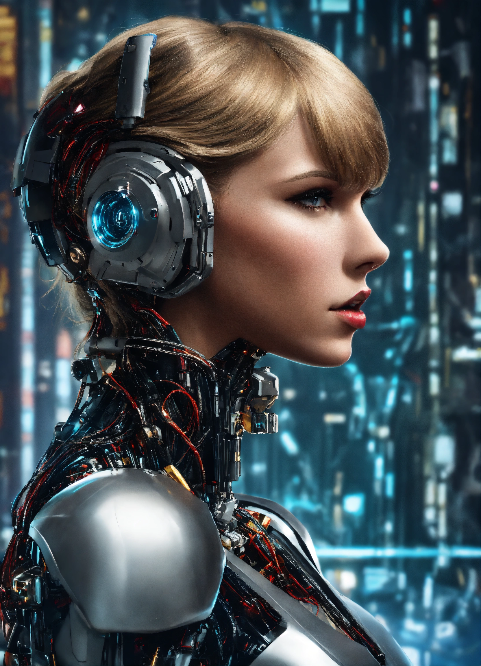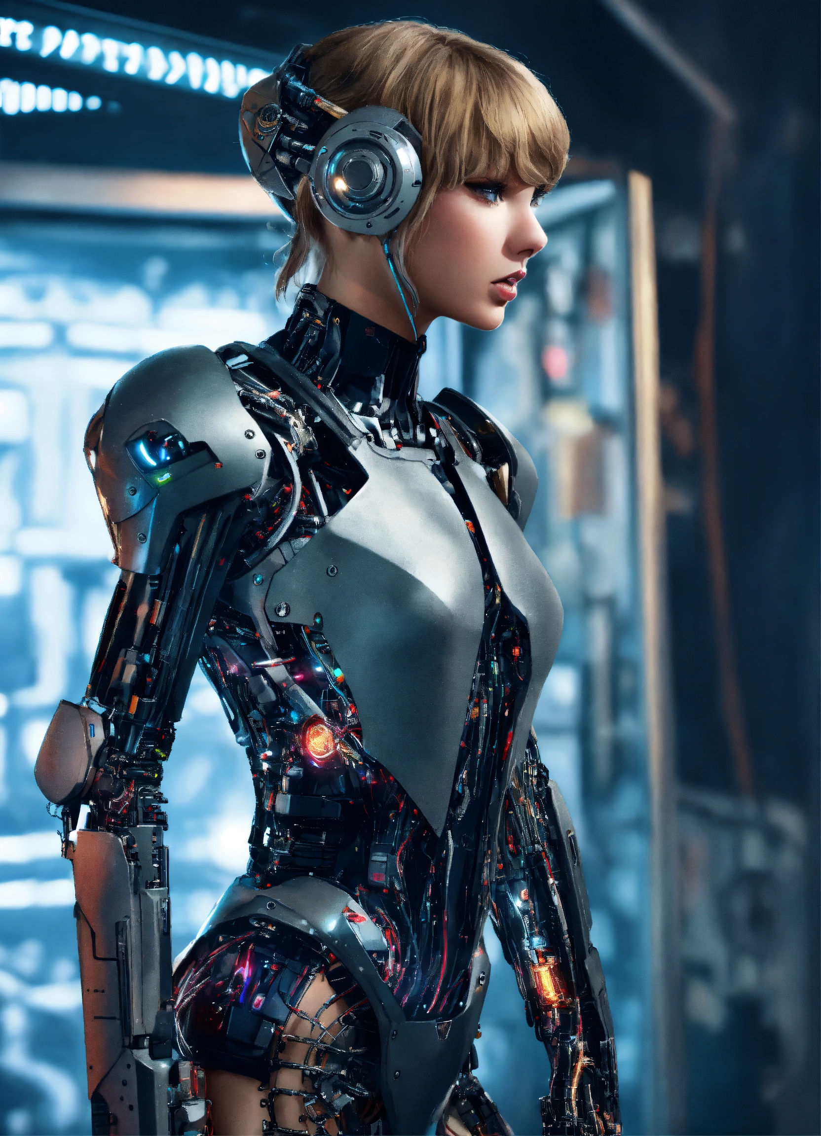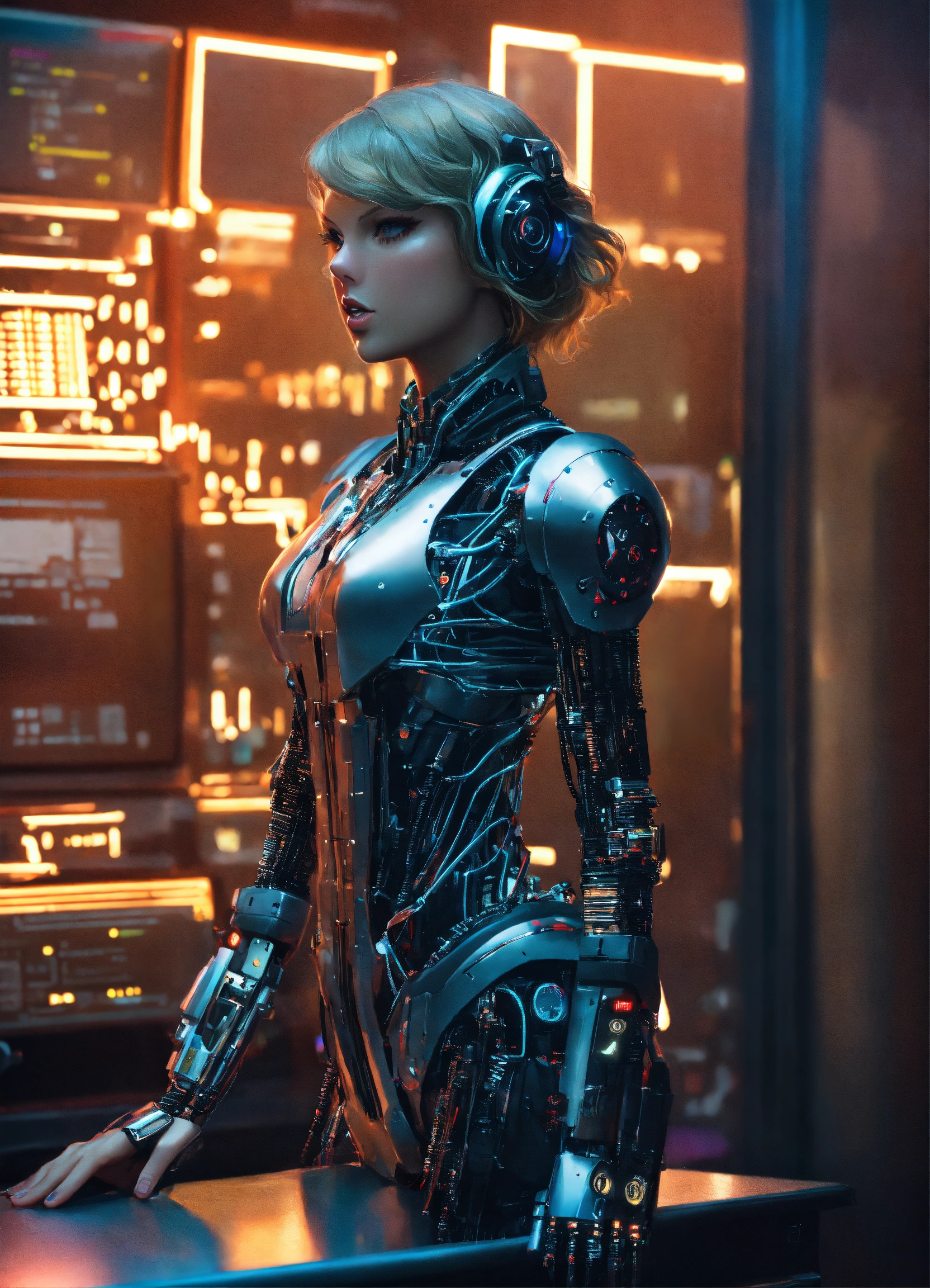 Taylor swift as a cyborg robot with computer, a character side portrait, realistic, full body shot, sharp focus, elegant