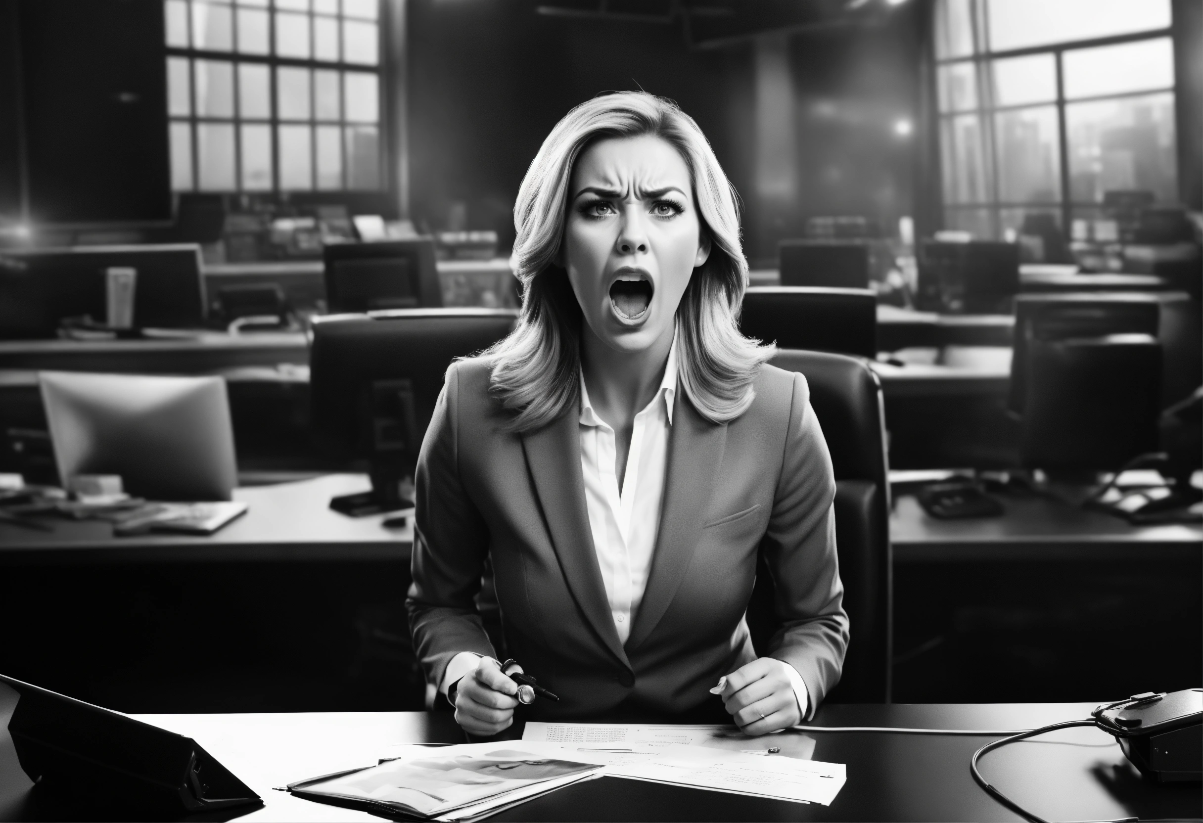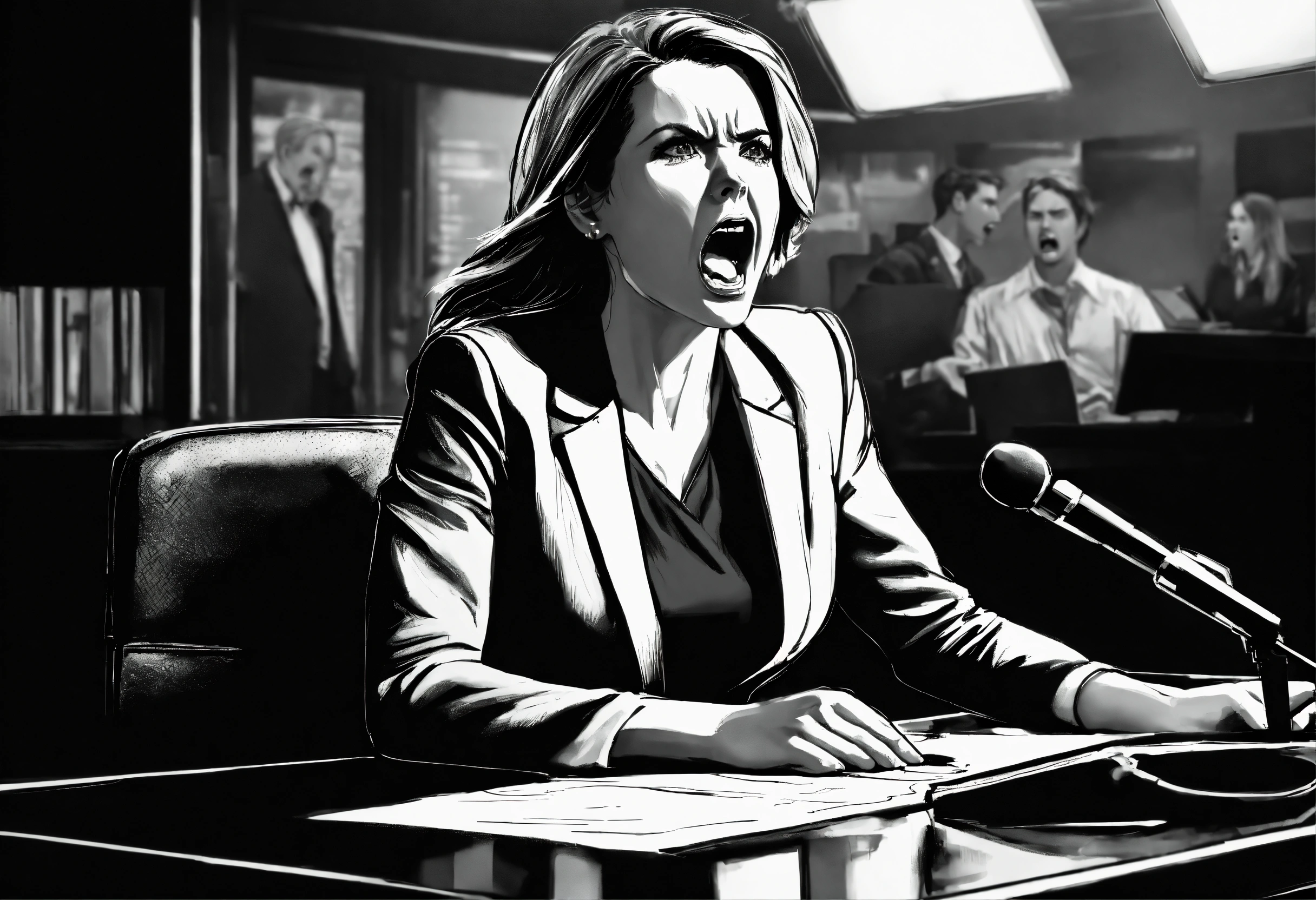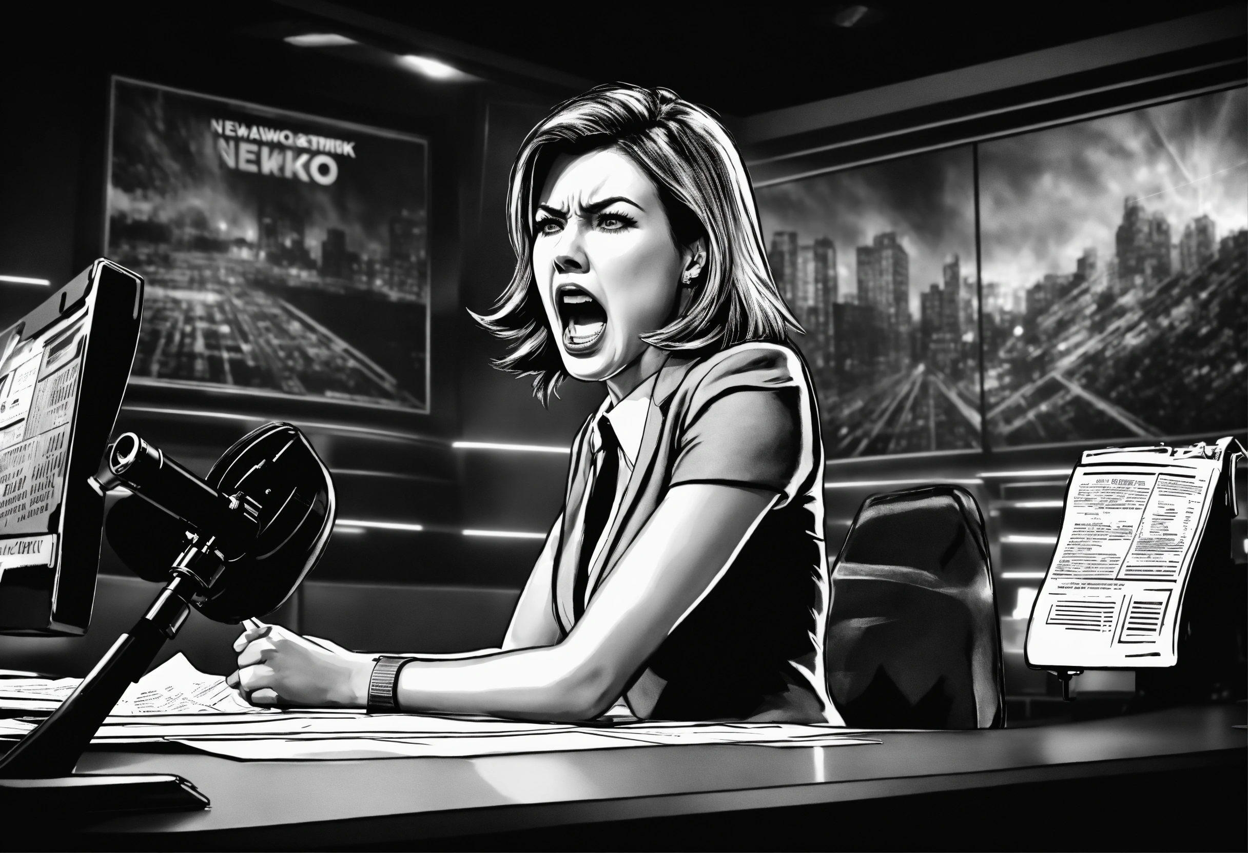 Black and white illustration of enraged female news reporter, facing camera, emotional, screaming, sitting on news anchor desk, shocking, shocked, surprised, angry, mouth dropped, emotinoal (vibrant, photo realistic, realistic, dramatic, dark, sharp focus, 8k).
