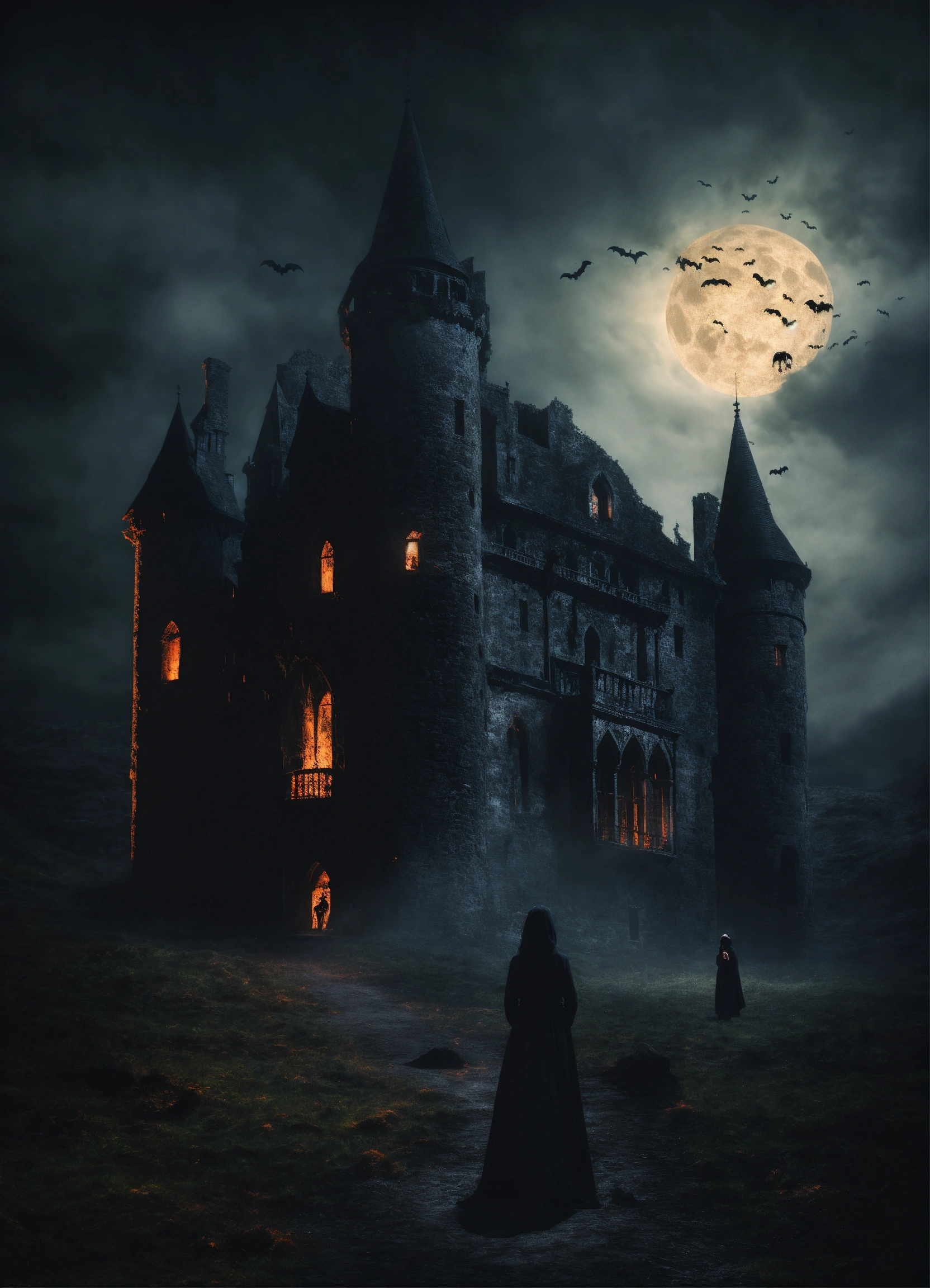 Mourning sobbing spirits in spooky pitch-black abyss in scary castle