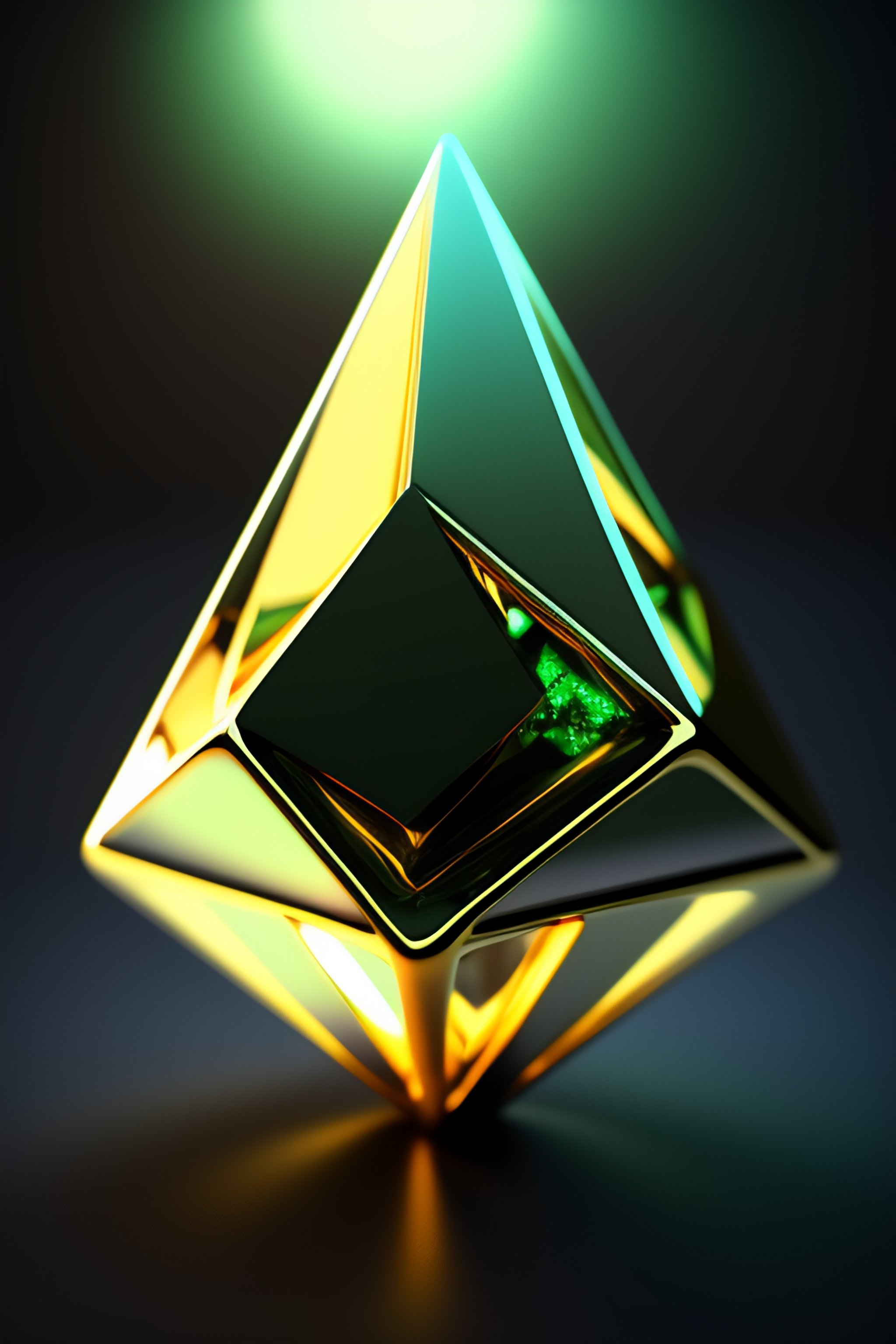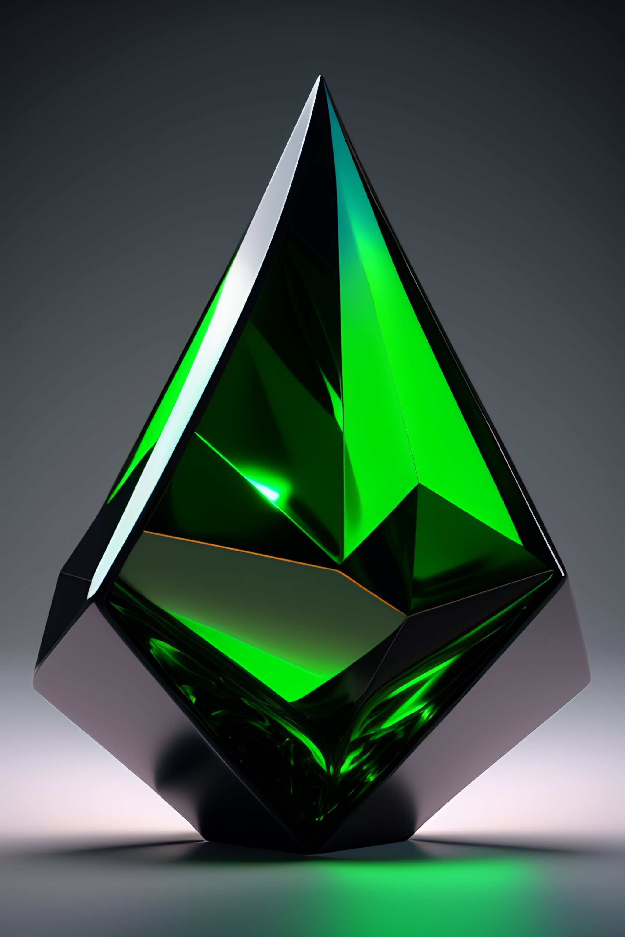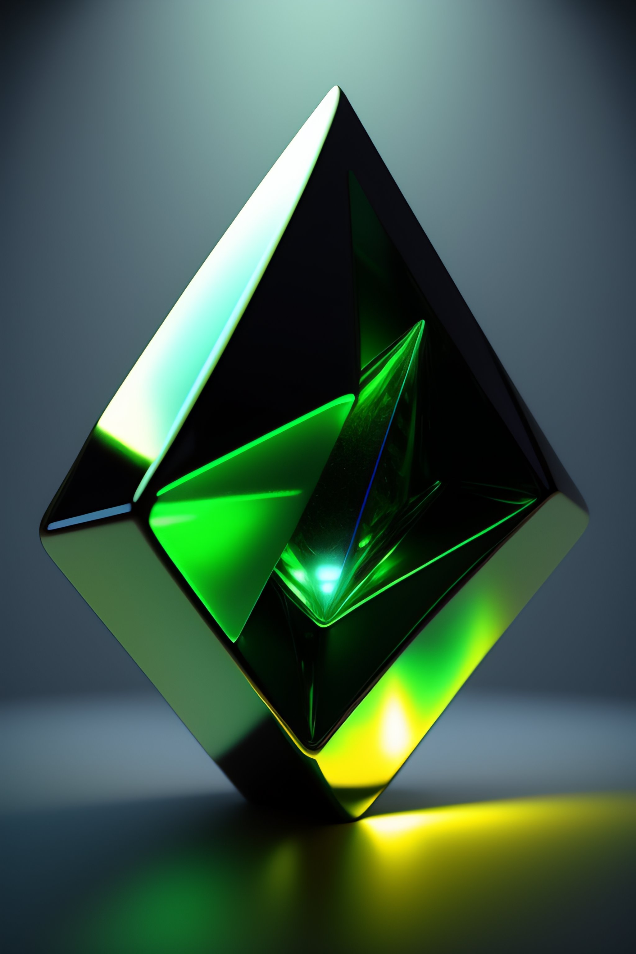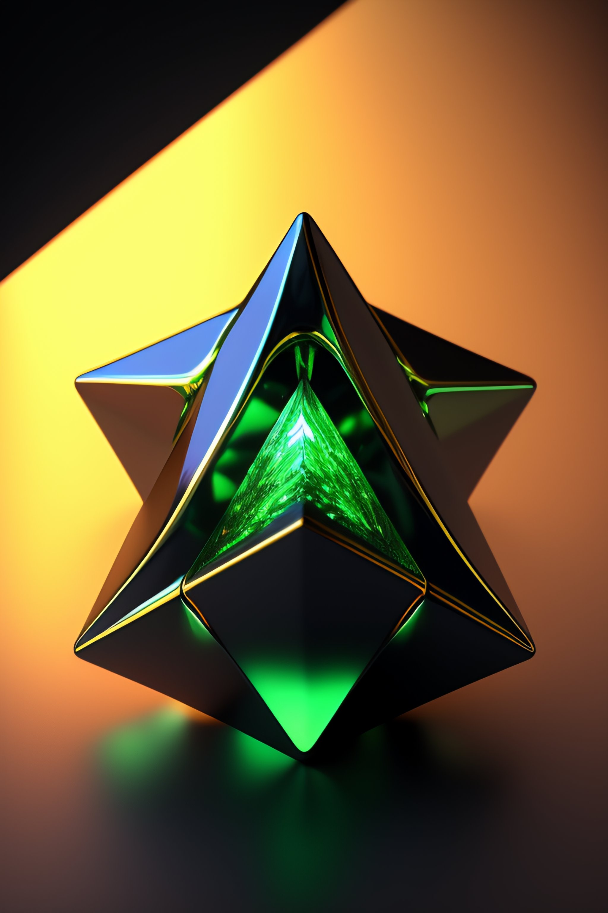 A photorealistic render of a metallic crystalline neotribal tetrahedron as floating sculpture breaking, made of green hot metal and black obsidian, c 4 d, by liam brazier and zhelong xu, neutral background, futuristic poster scifi, hard edges, sharp focus, highly detailed, wide angle, hyper realistic, 8 k, global illumination, studio lighting, octane render