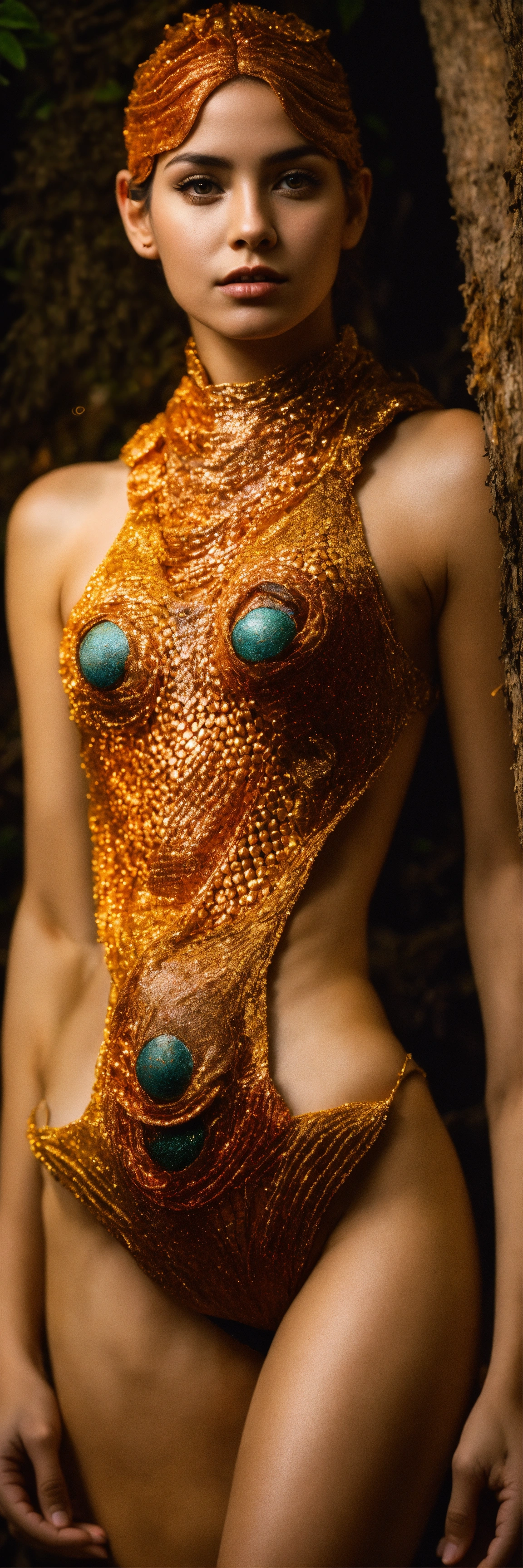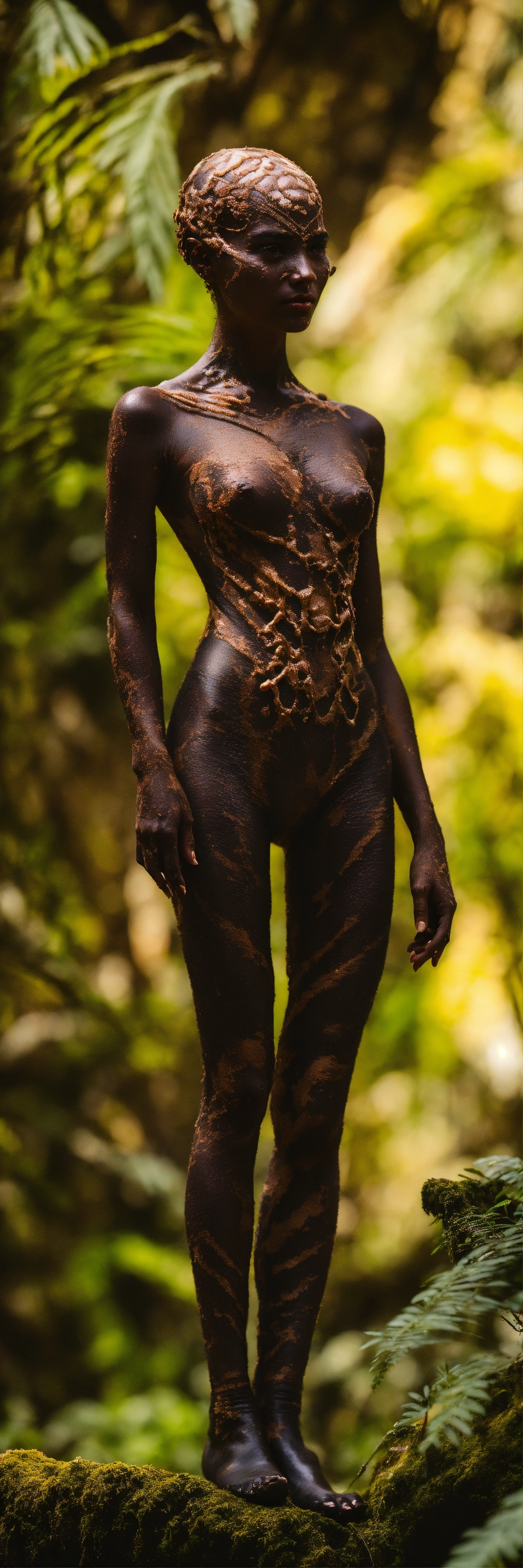 Fotografia de cuerpo entero humanoide extraterrestre femenina con piel de escamas de 21 años, muy alta y delgada sin rasurar en la jungla, detalles fotográficos hiperrealistas, plano general, f2.8, enfoque en los ojos, 1/250, iso 3200, nikon z9, angulo de cámara de 120 grados