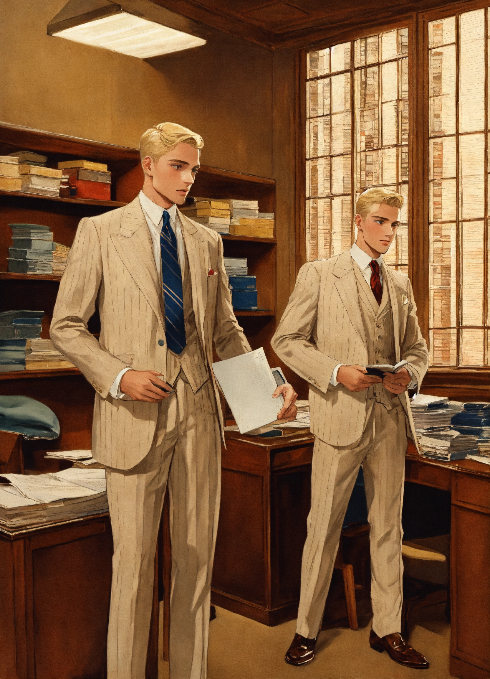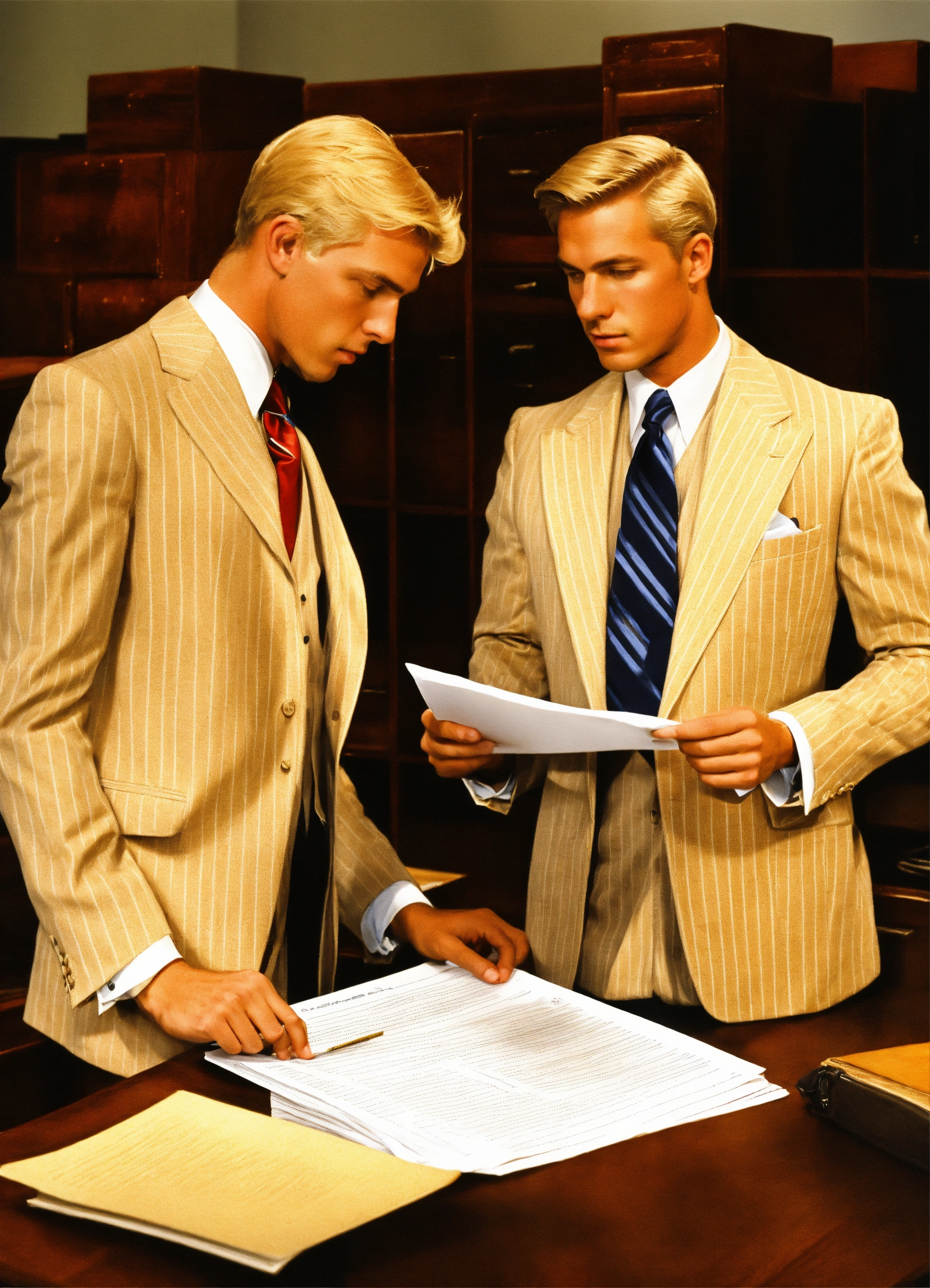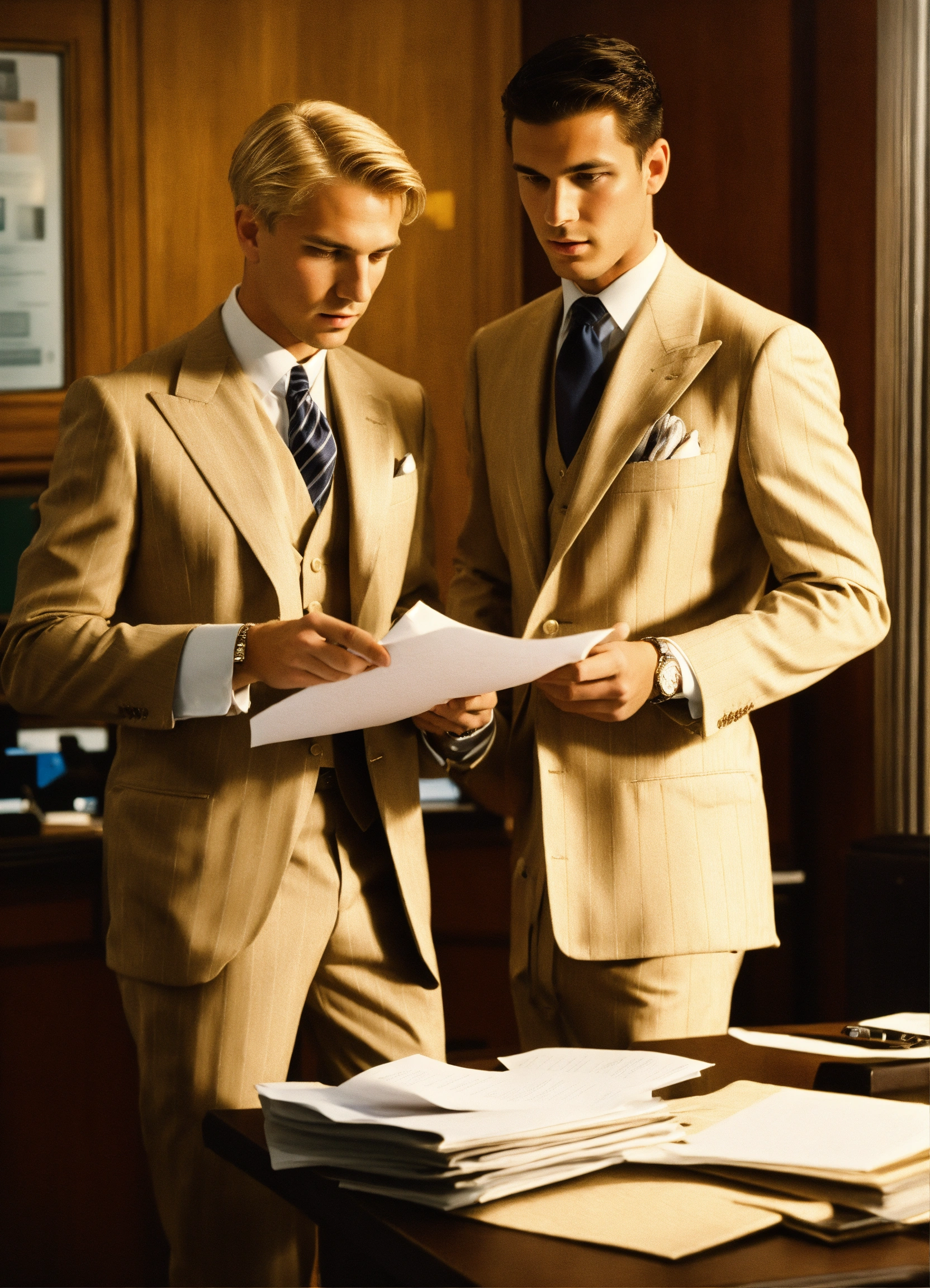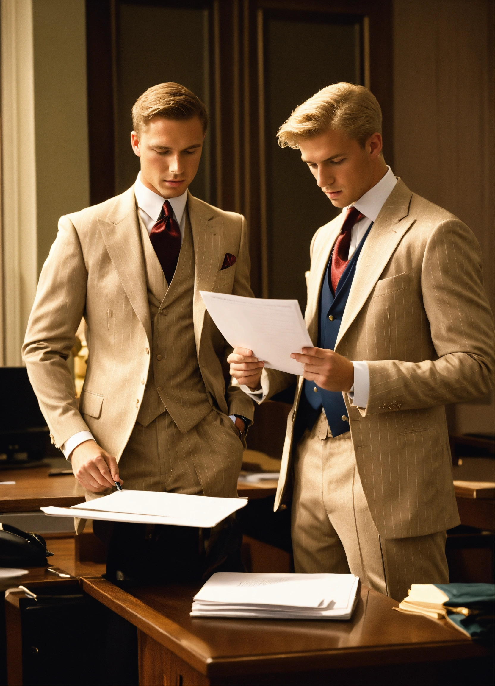 Two young blonde gentlemen in light beige pinstripe vested suit, club tie, stealing a document at office