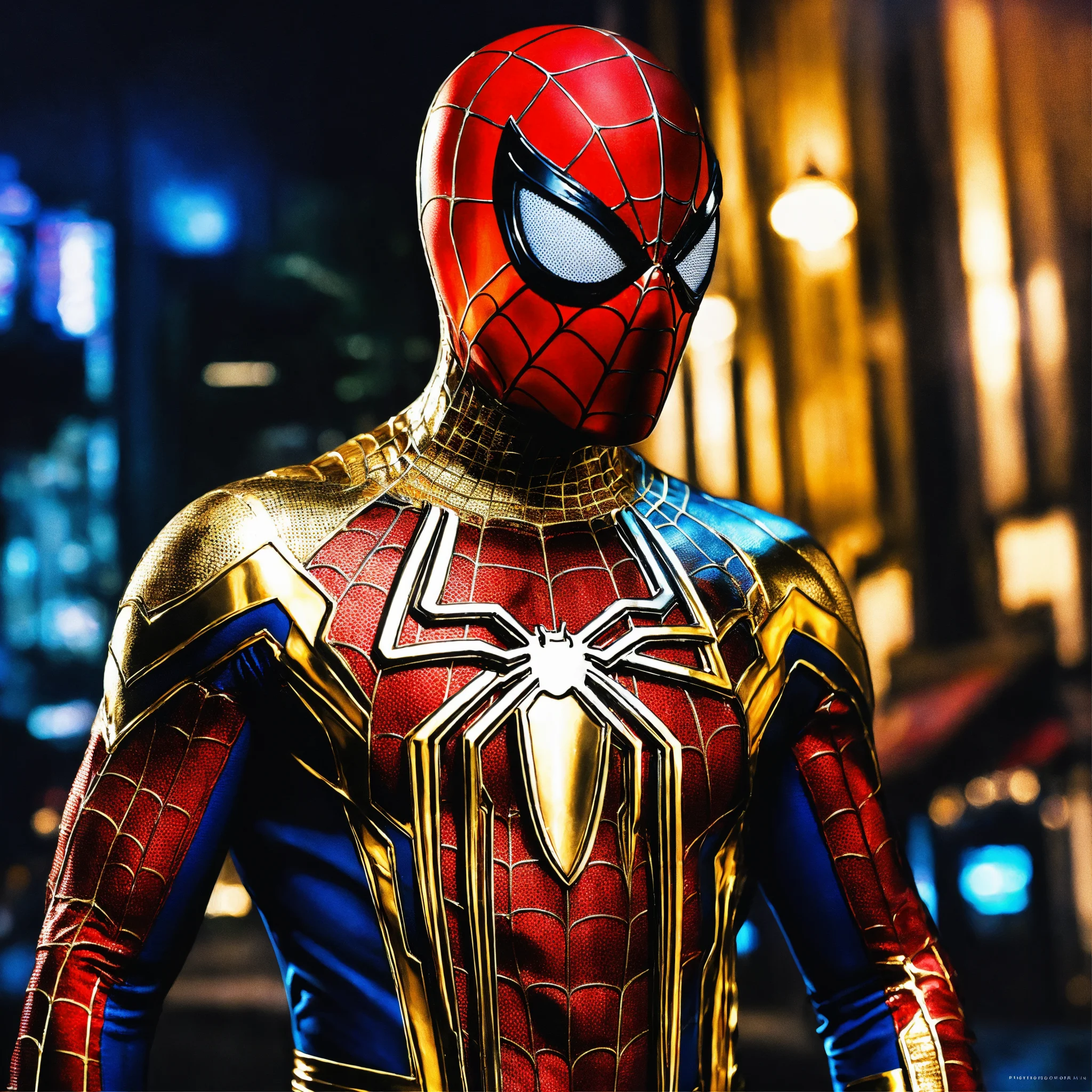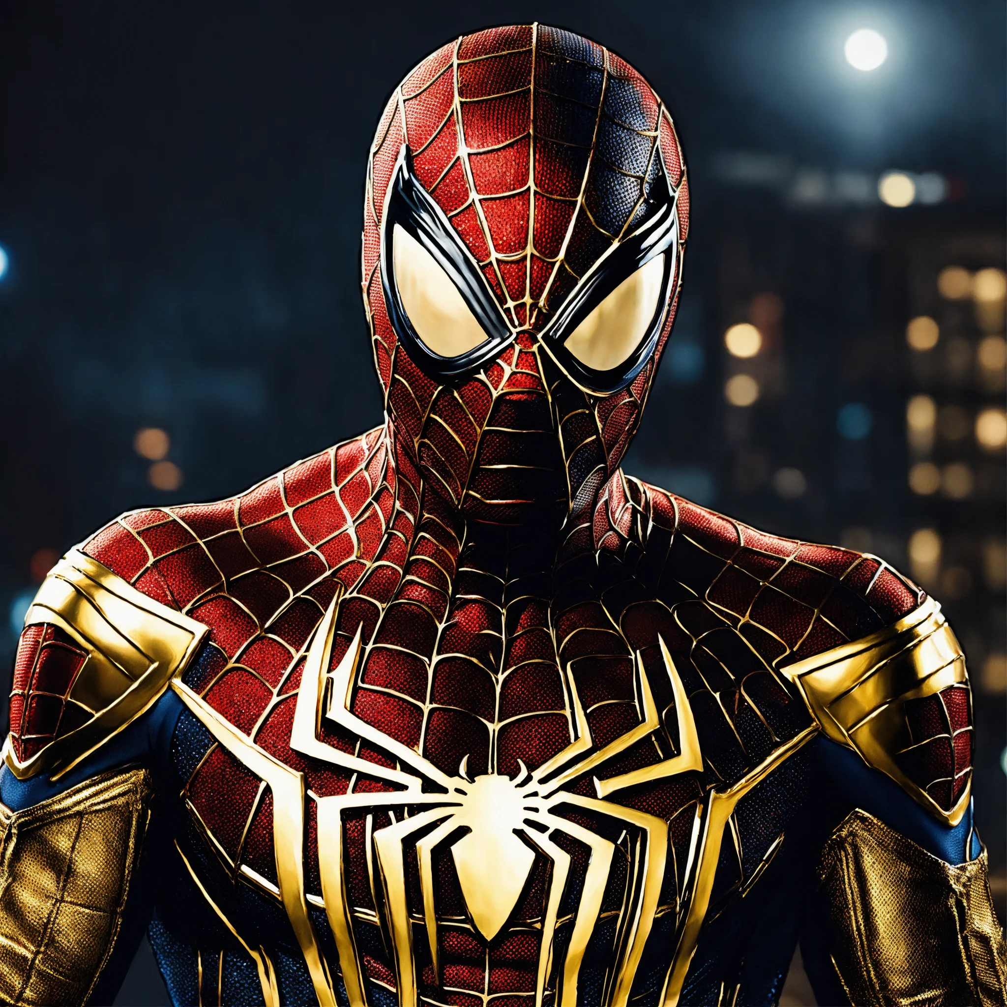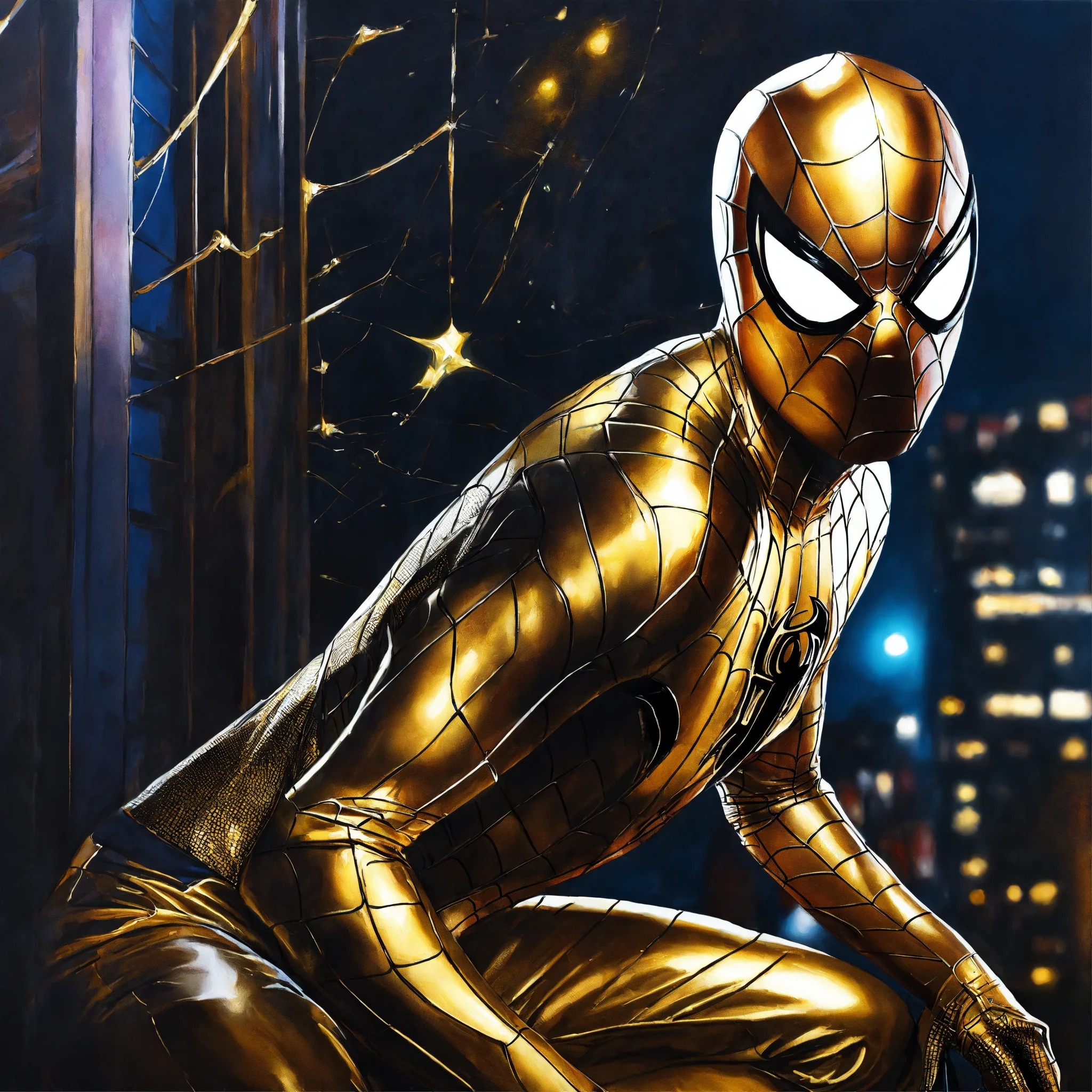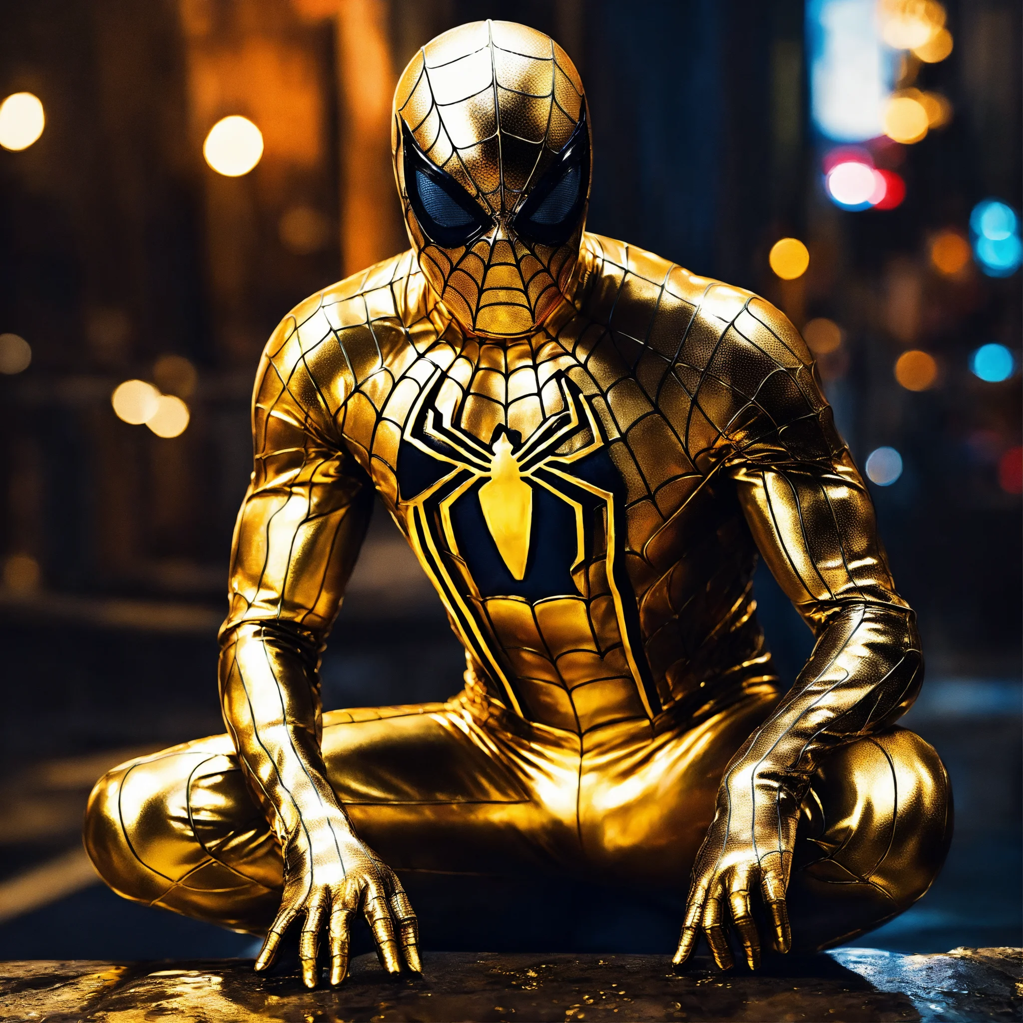 Portrait painting of spider-man wearing a gold metallic suit, ultra realistic, concept art, intricate details, eerie, highly detailed, photorealistic, full body, night time, photshoot