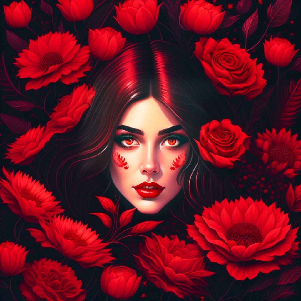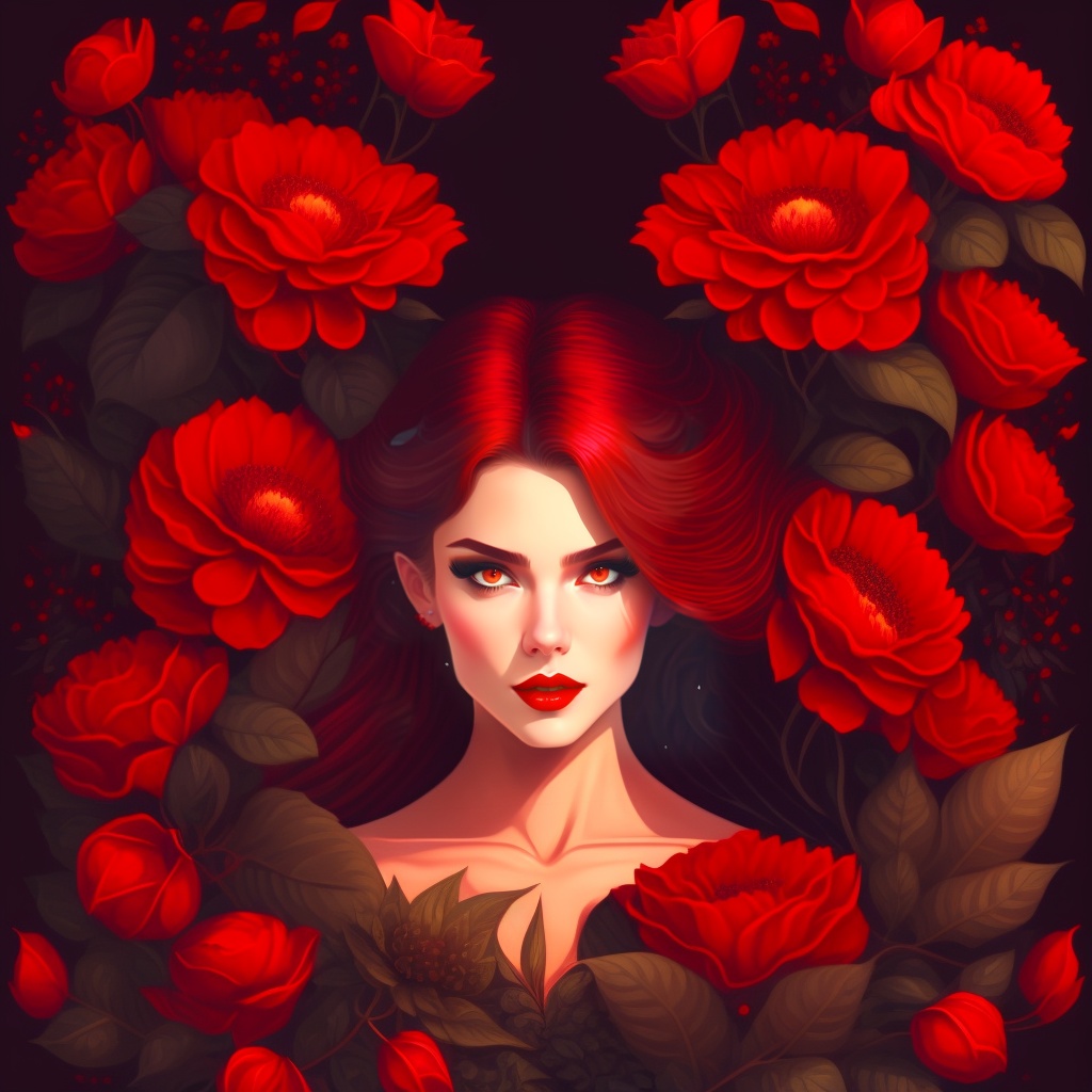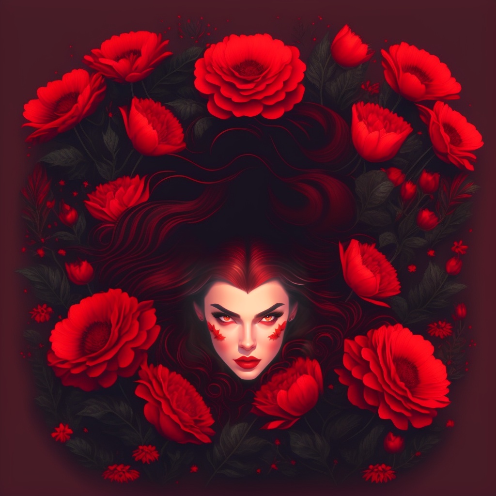 Illustration of an evil vampire woman lying in flowers, open red eyes, horror, dark spooky, vintage art style