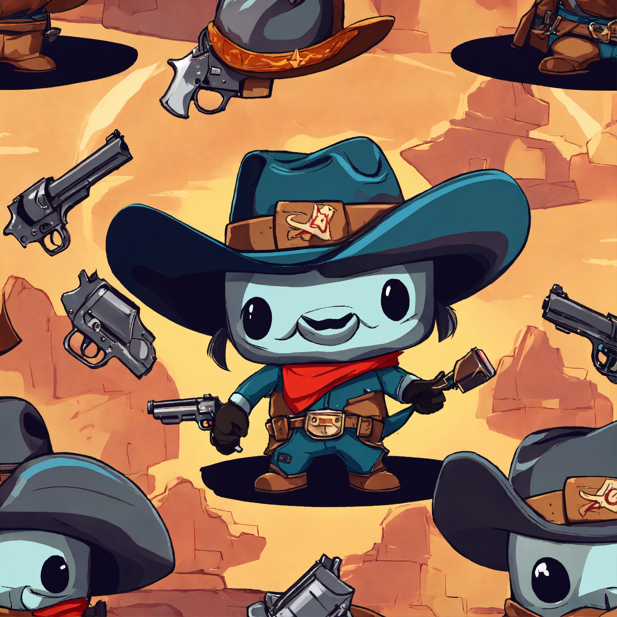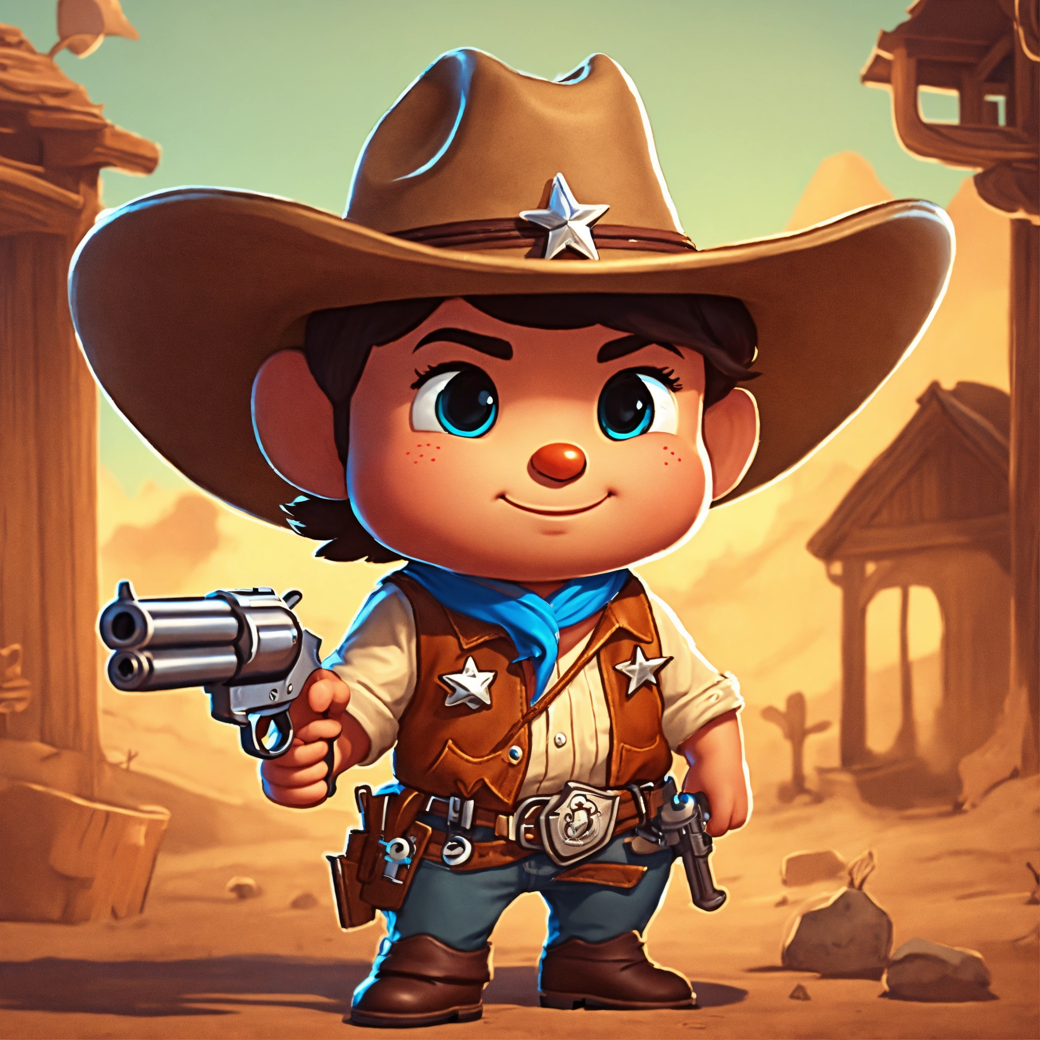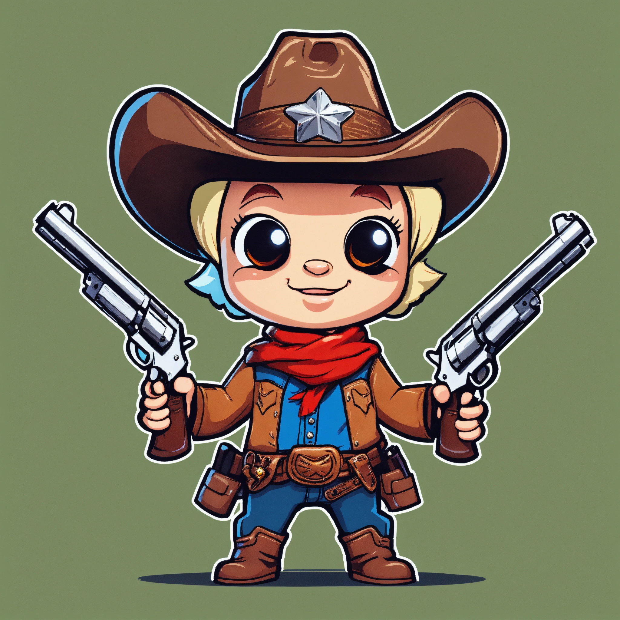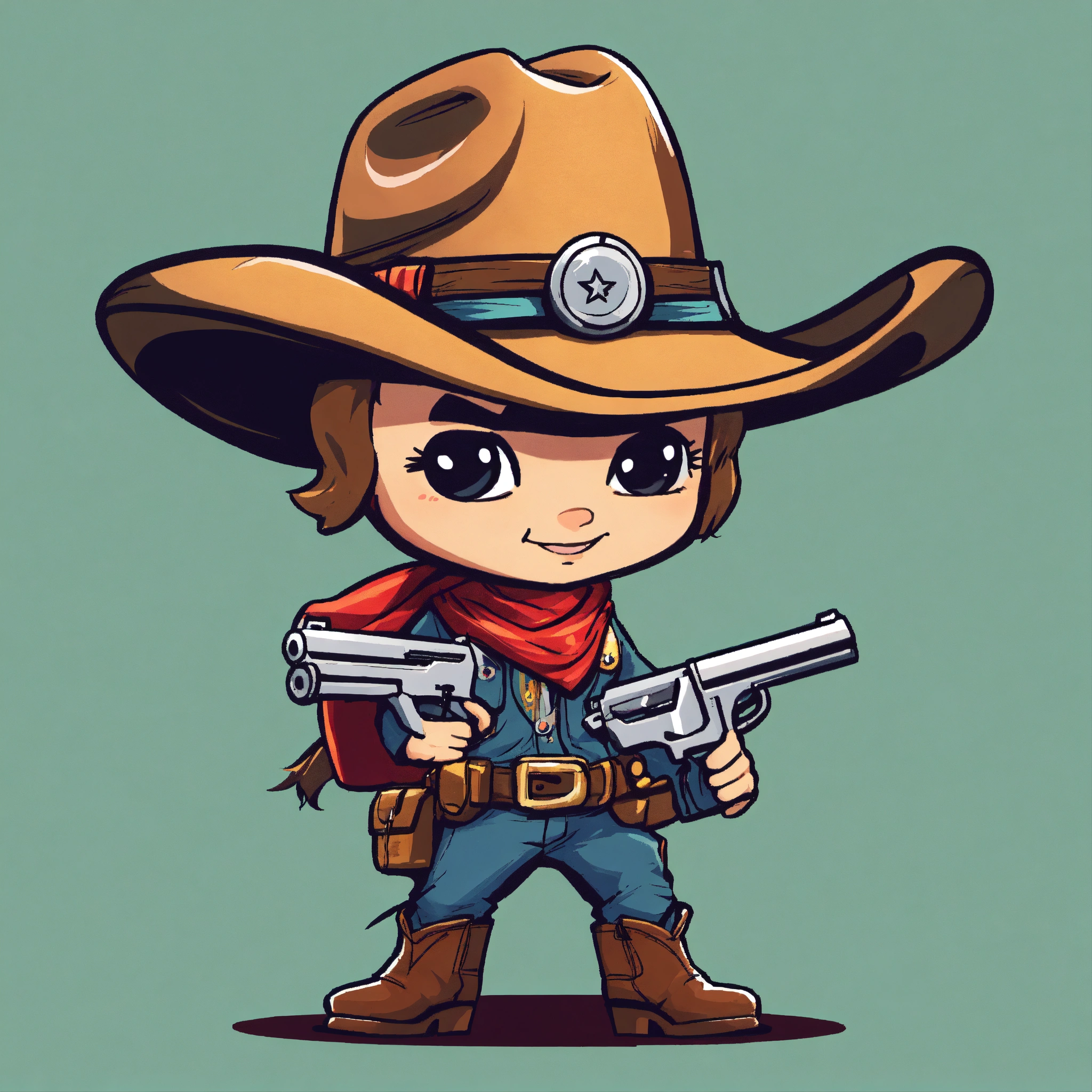 Cute little cartoon character wearing a cowboy hat with 2 six shooter pistols