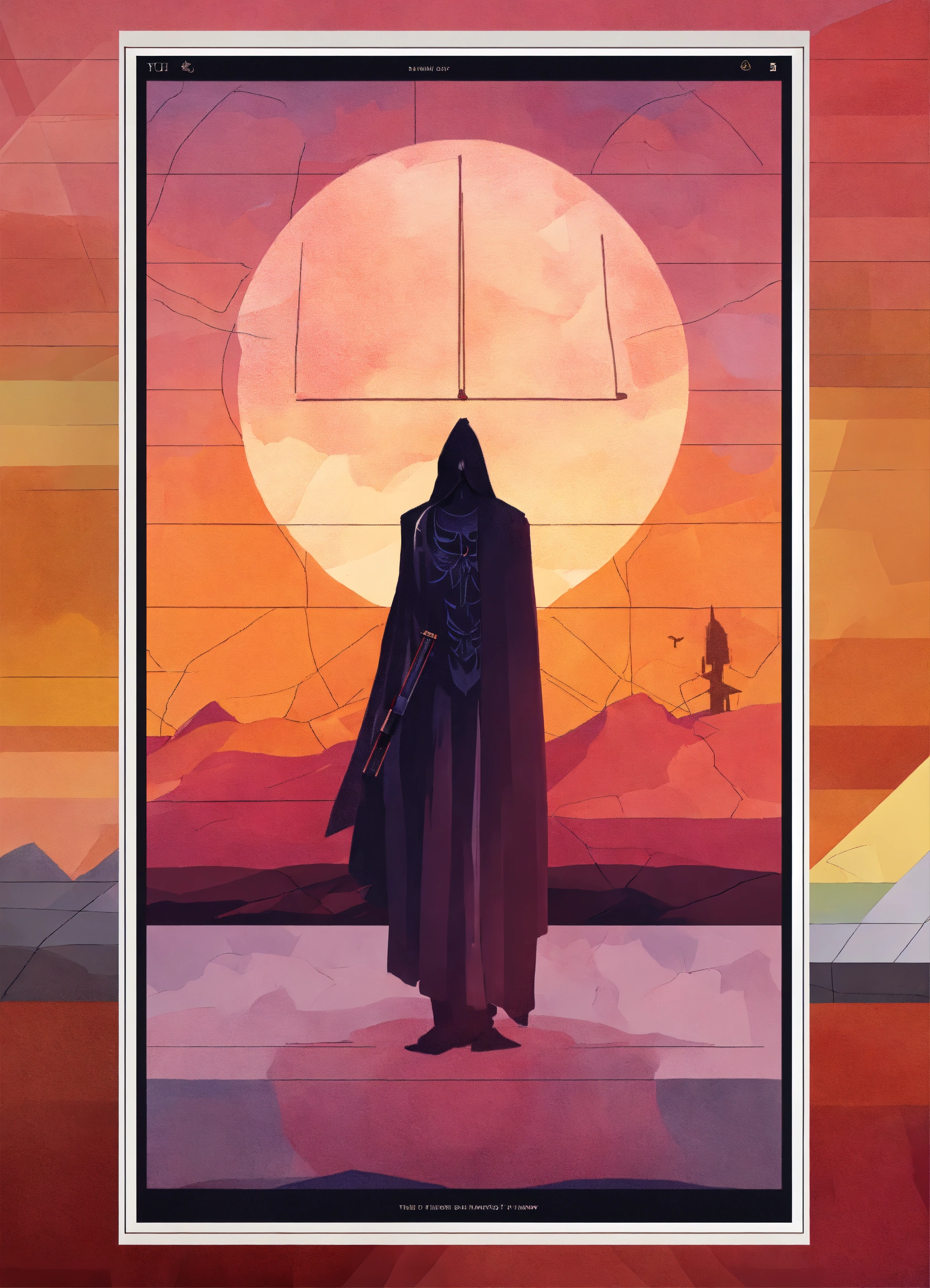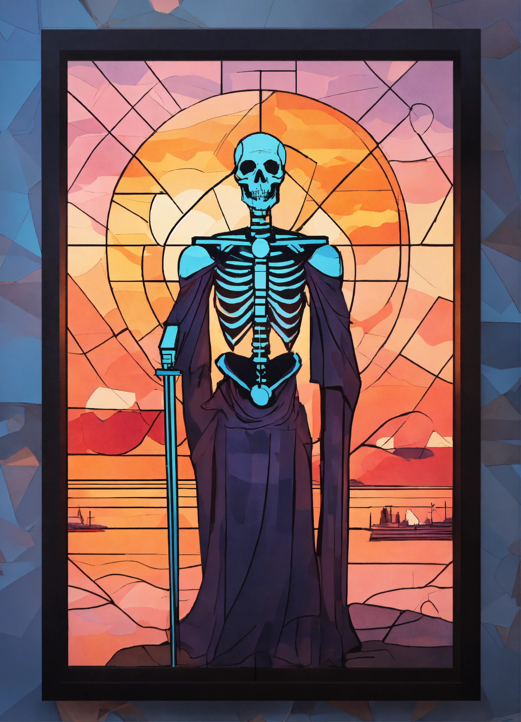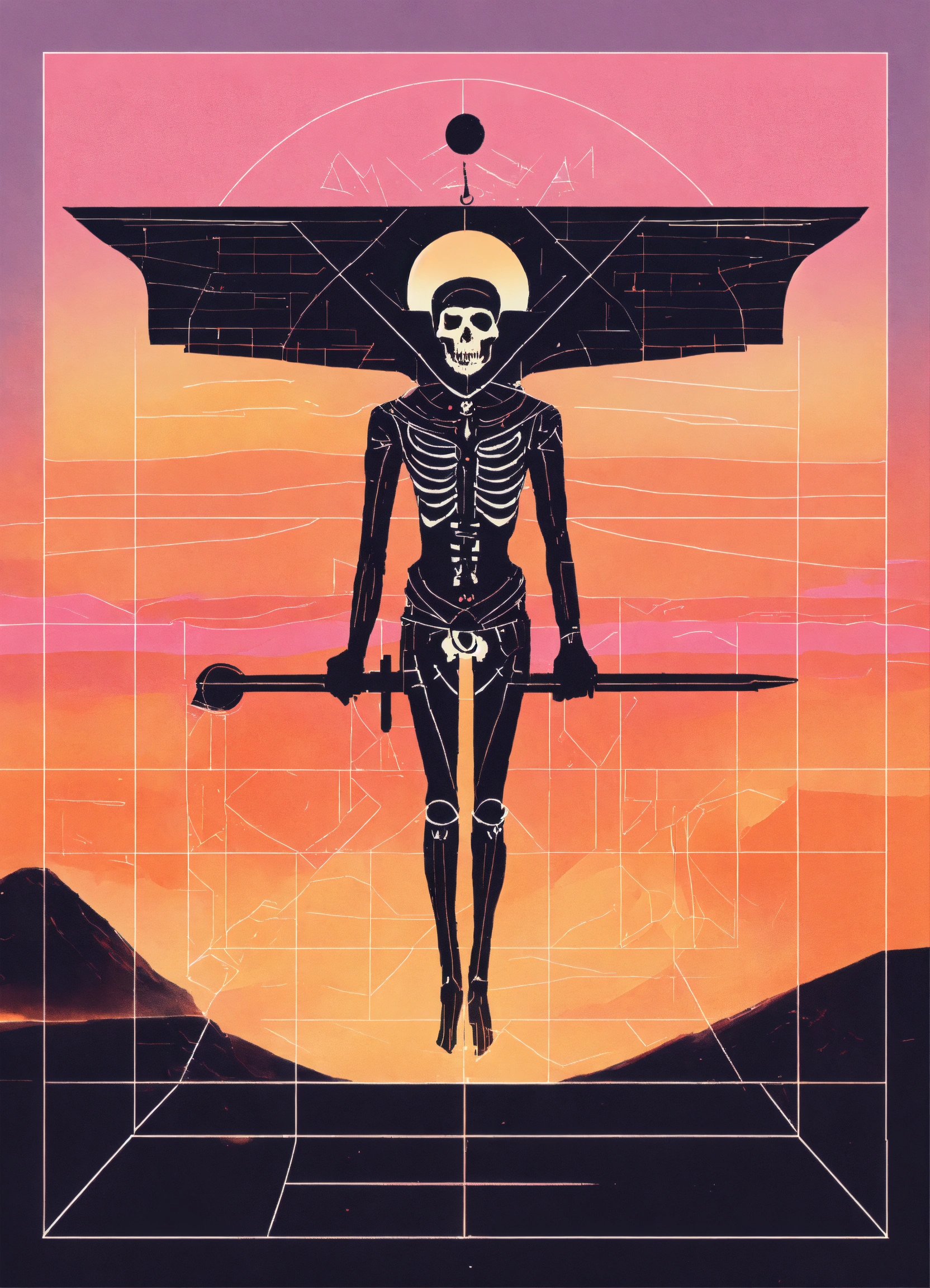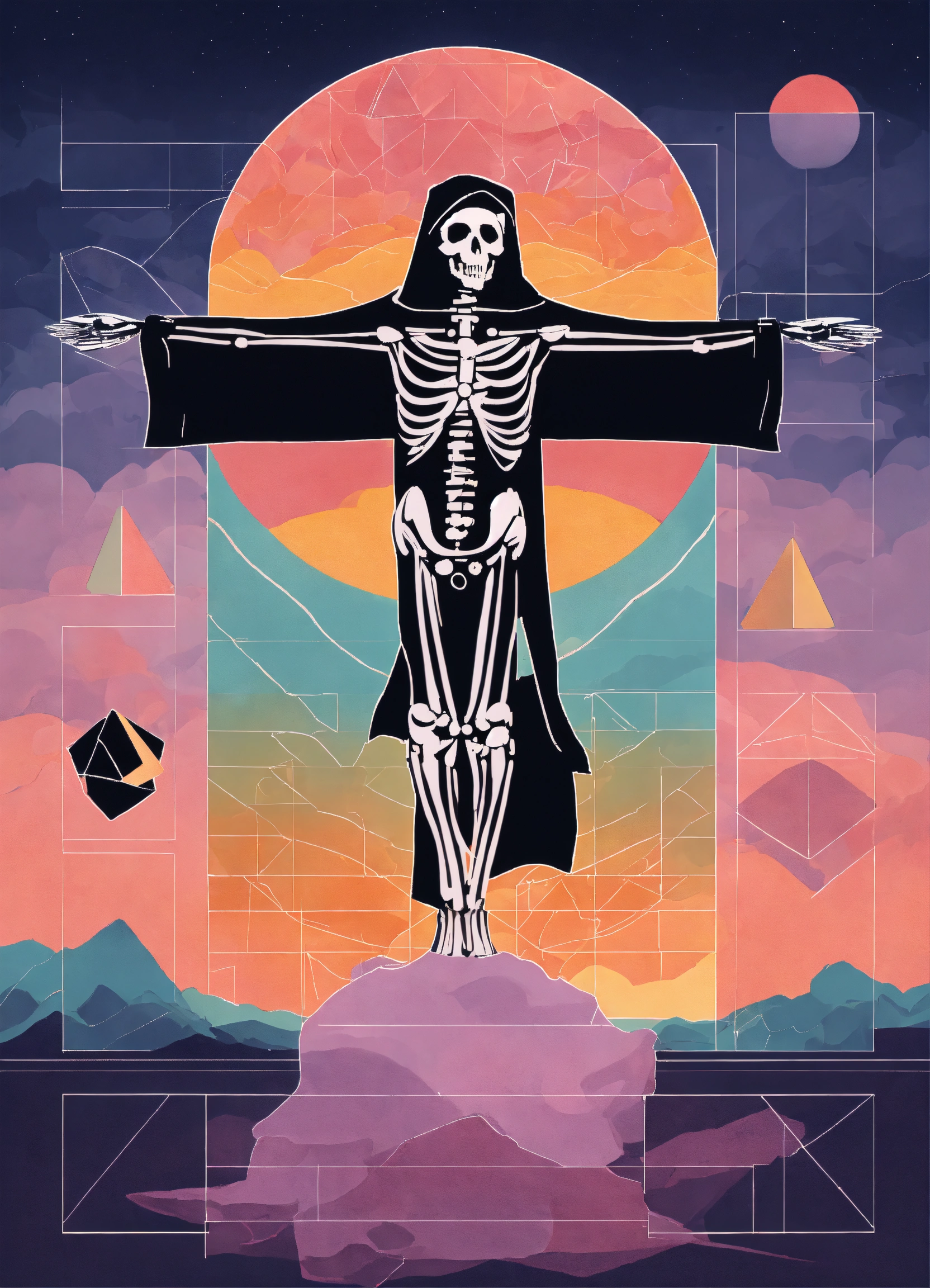 Create a poster with the outline of a personification of death, painted with a few pastel strokes. in the background there are three geometric figures overlaps. all on a sunset background.
