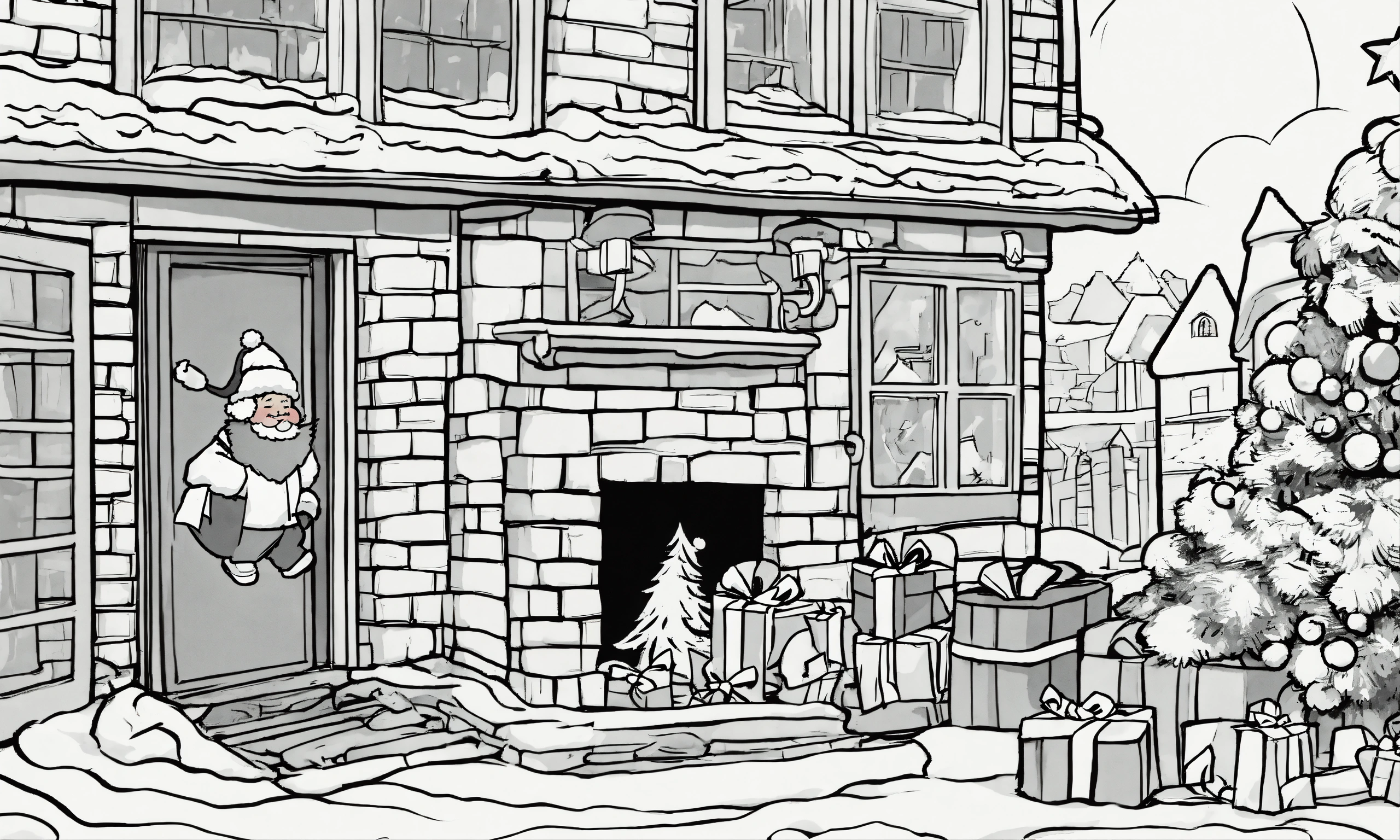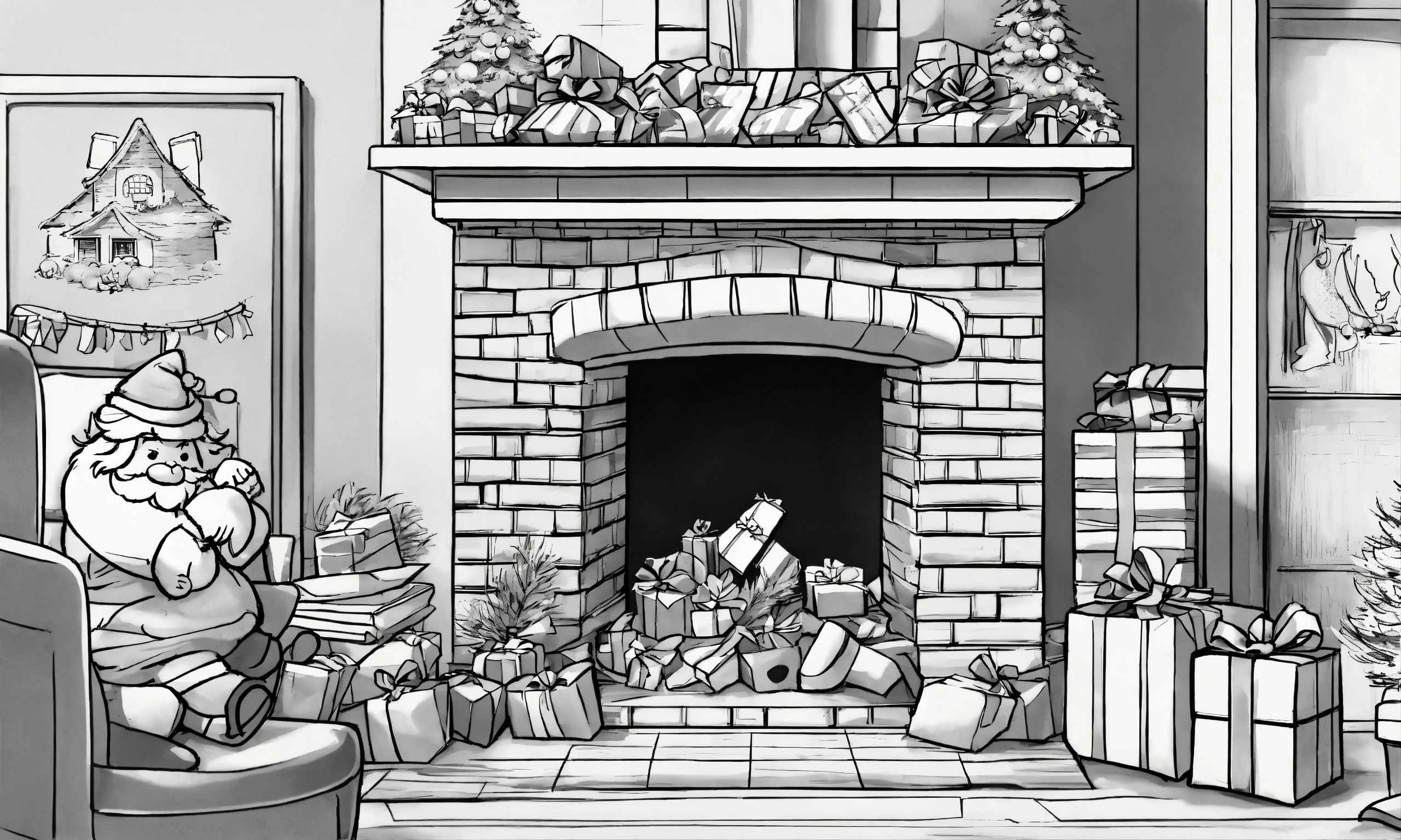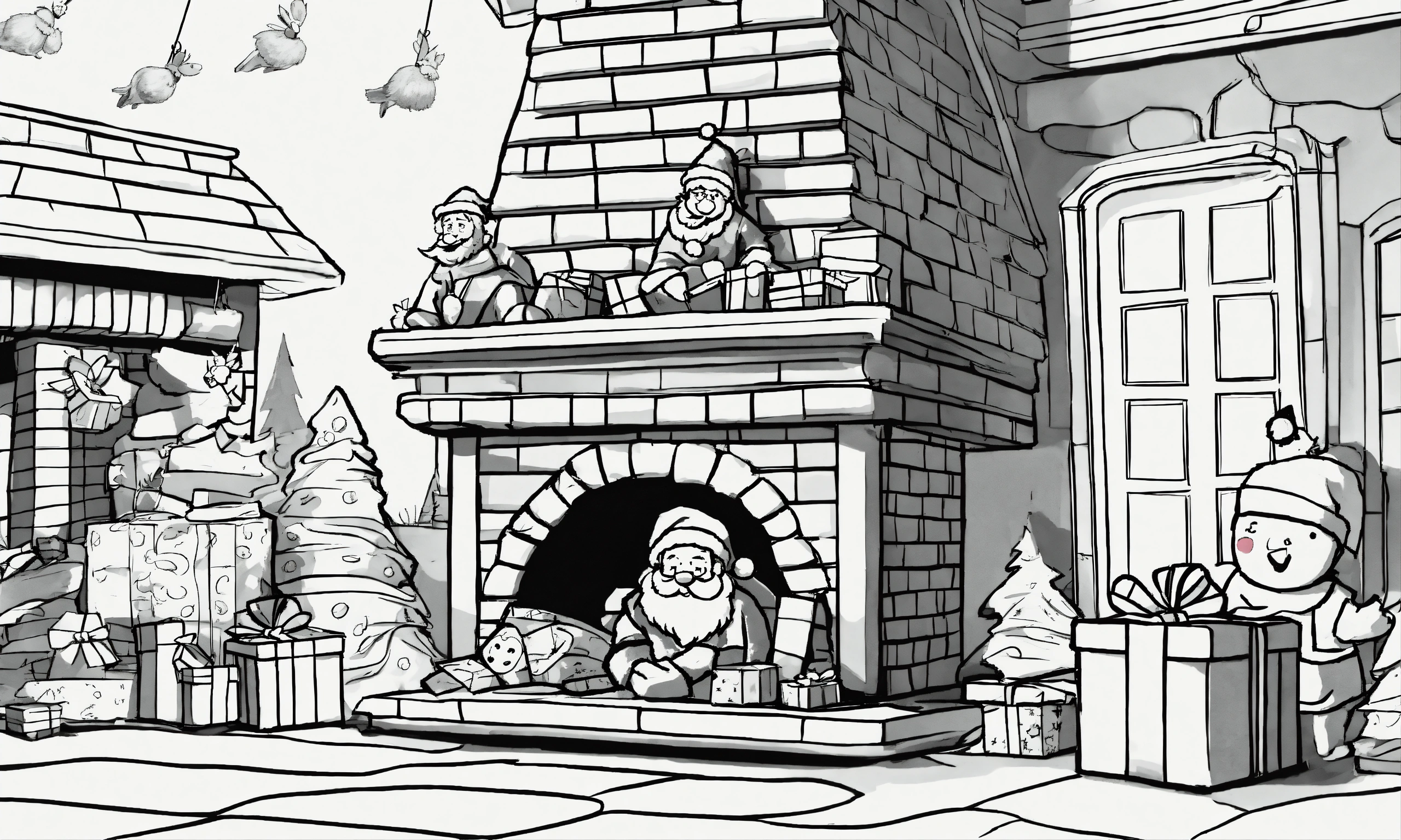 Create a humorous christmas card with santa claus stuck in a chimney, surrounded by comically oversized presents. add playful elves trying to help him out. in black and white outlines