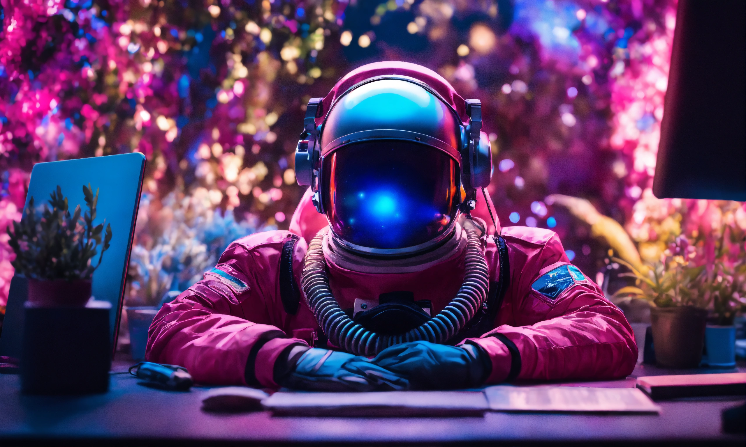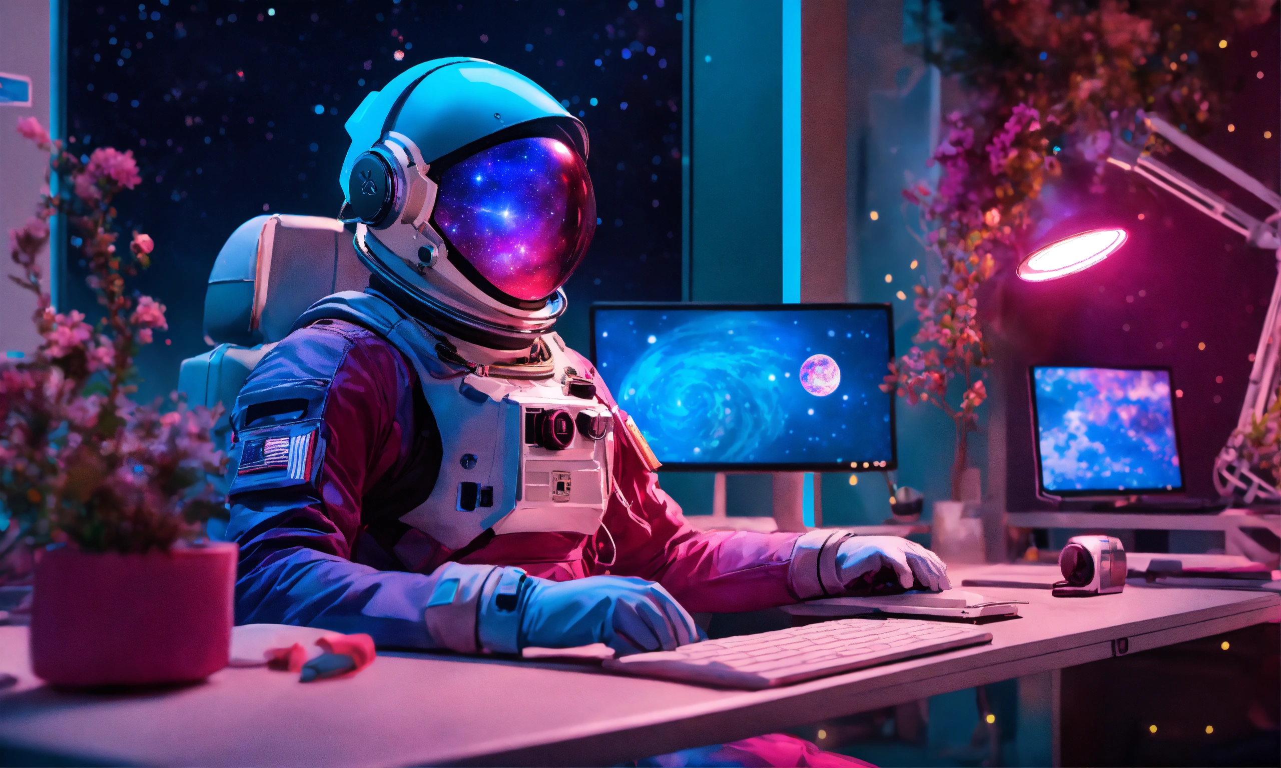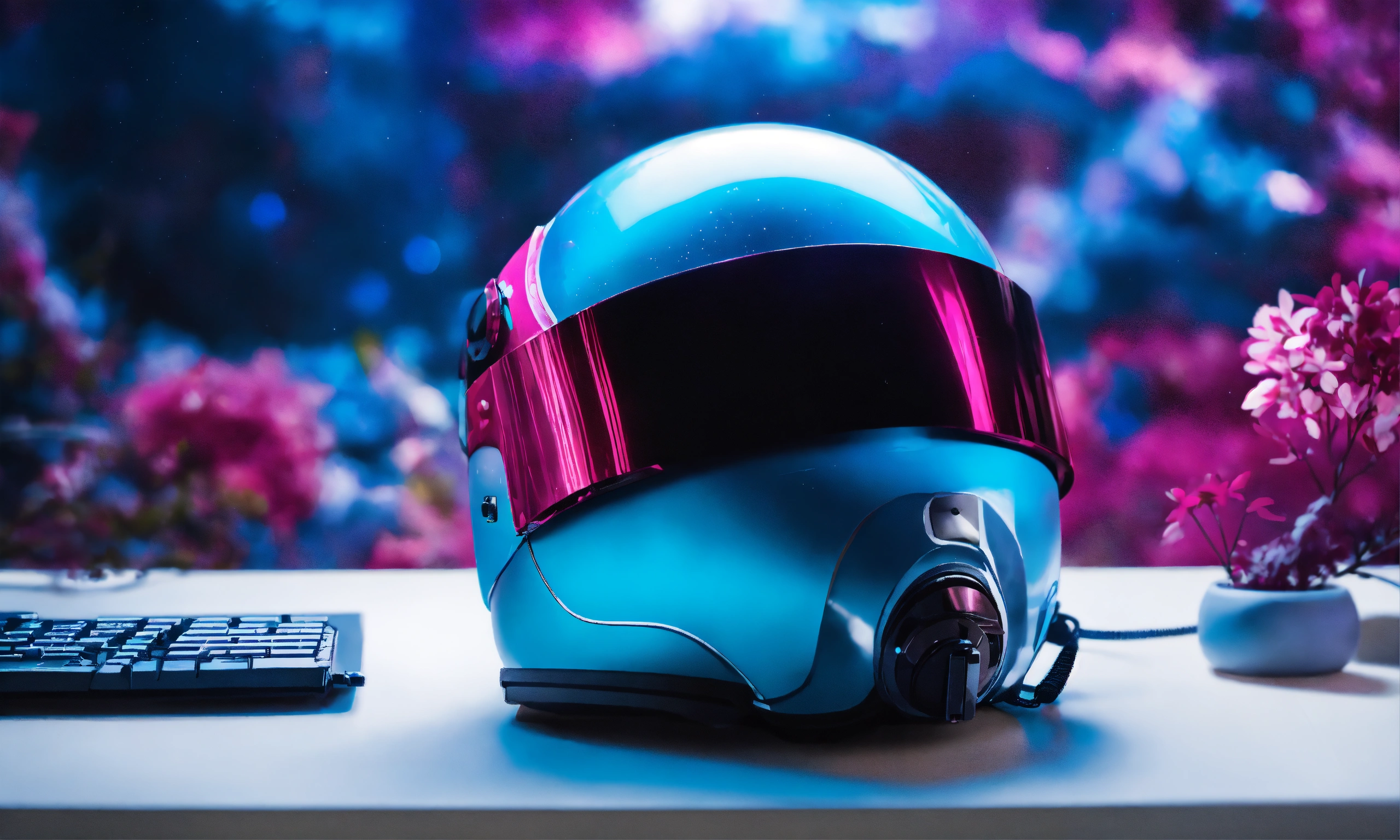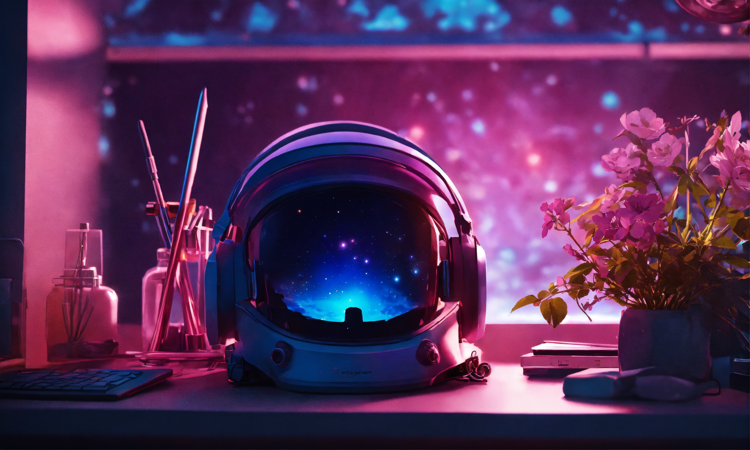 Casque de l'astronaute pas de corp posé sur un bureau ayant à l'intérieur le cosmos, une galaxie et neptune de couleur bleu ciel et nocturne avec du magenta et autour du casque des outils et des plantes en 8k