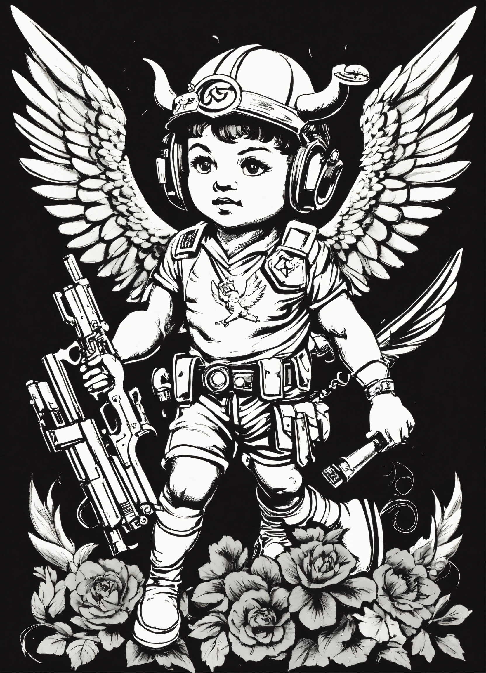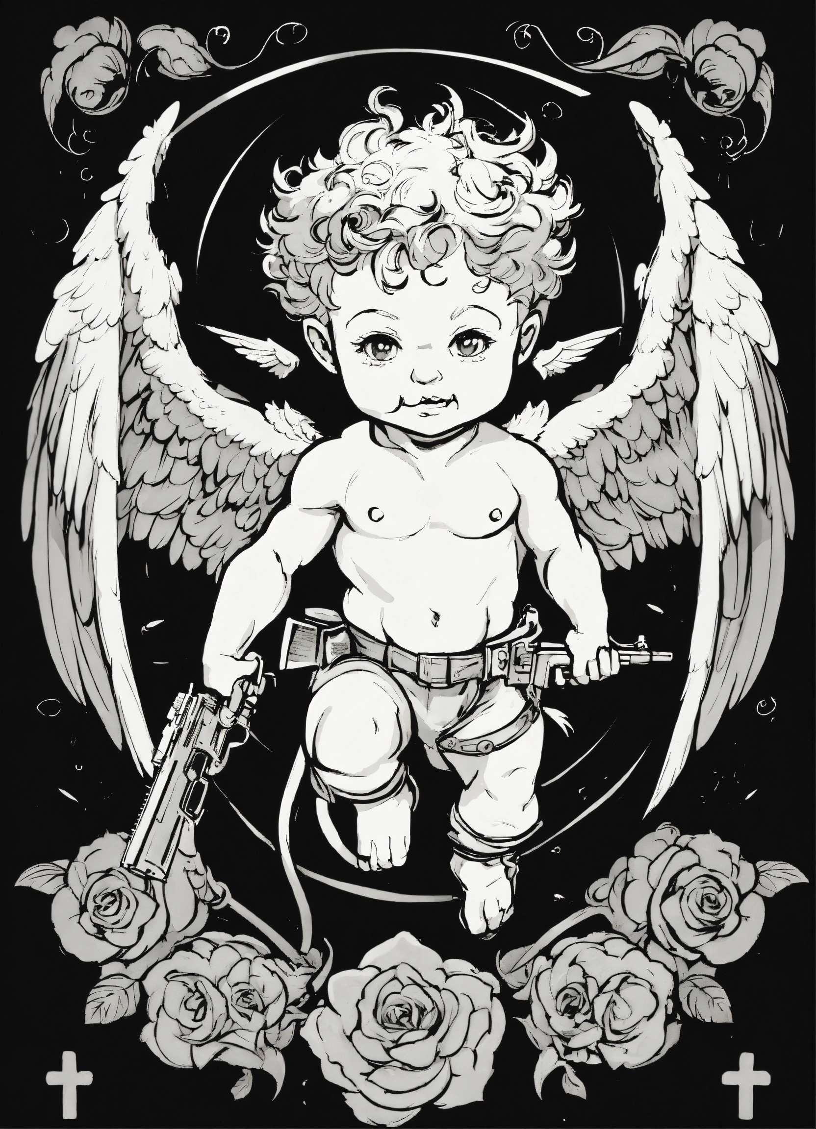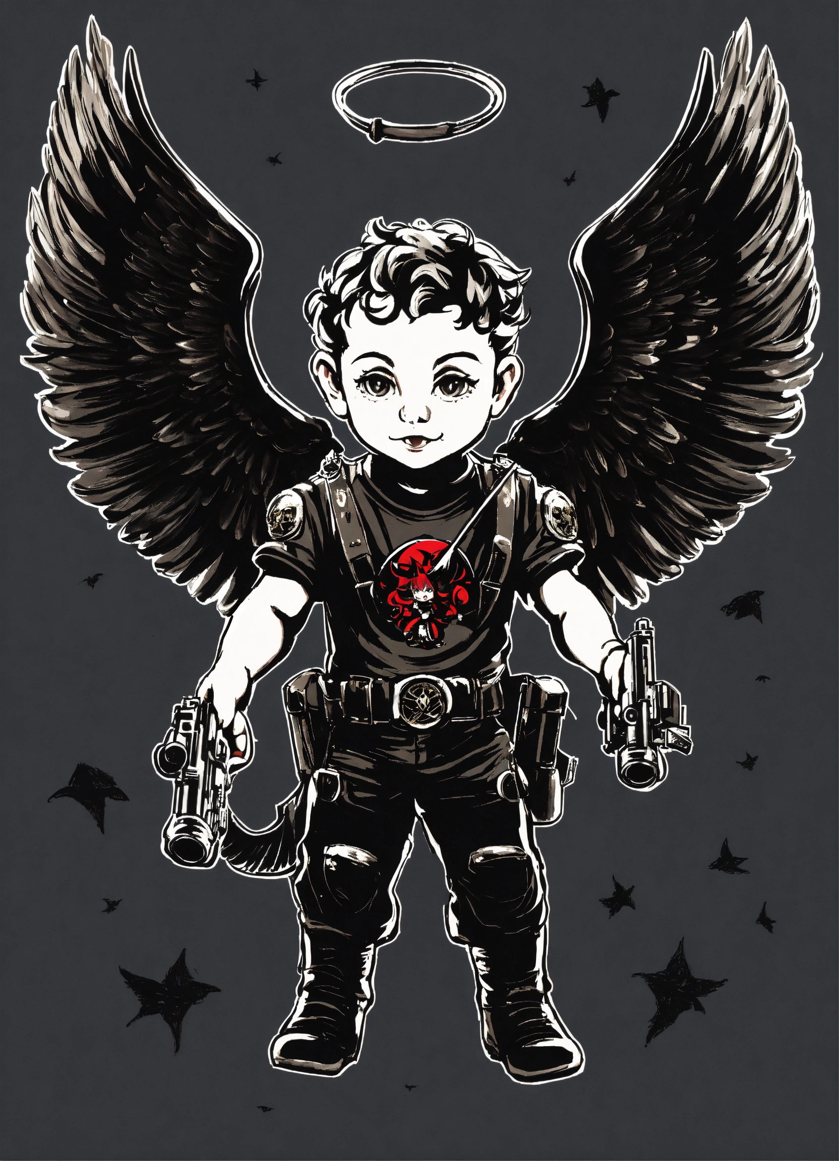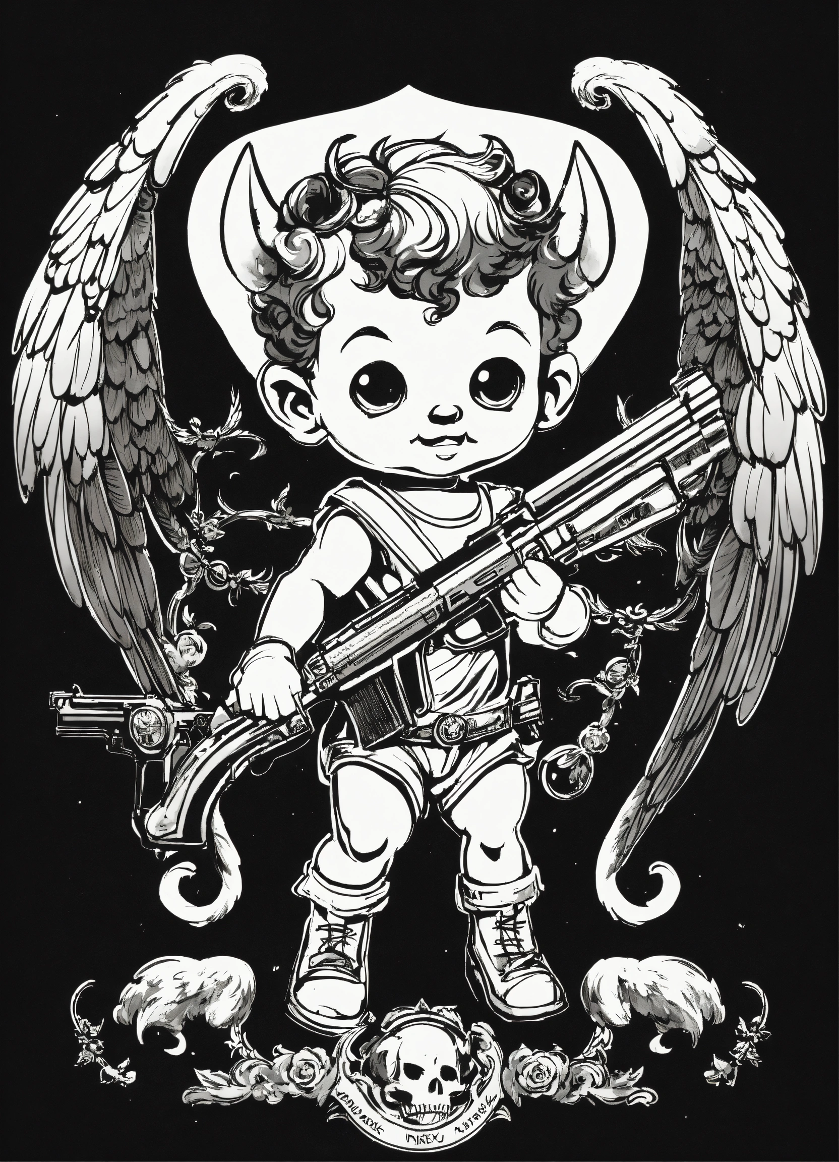 Cherub holding two pistols one in each hand, devil horns, and black wings flying, solid black background, cartoon-styled, cupid