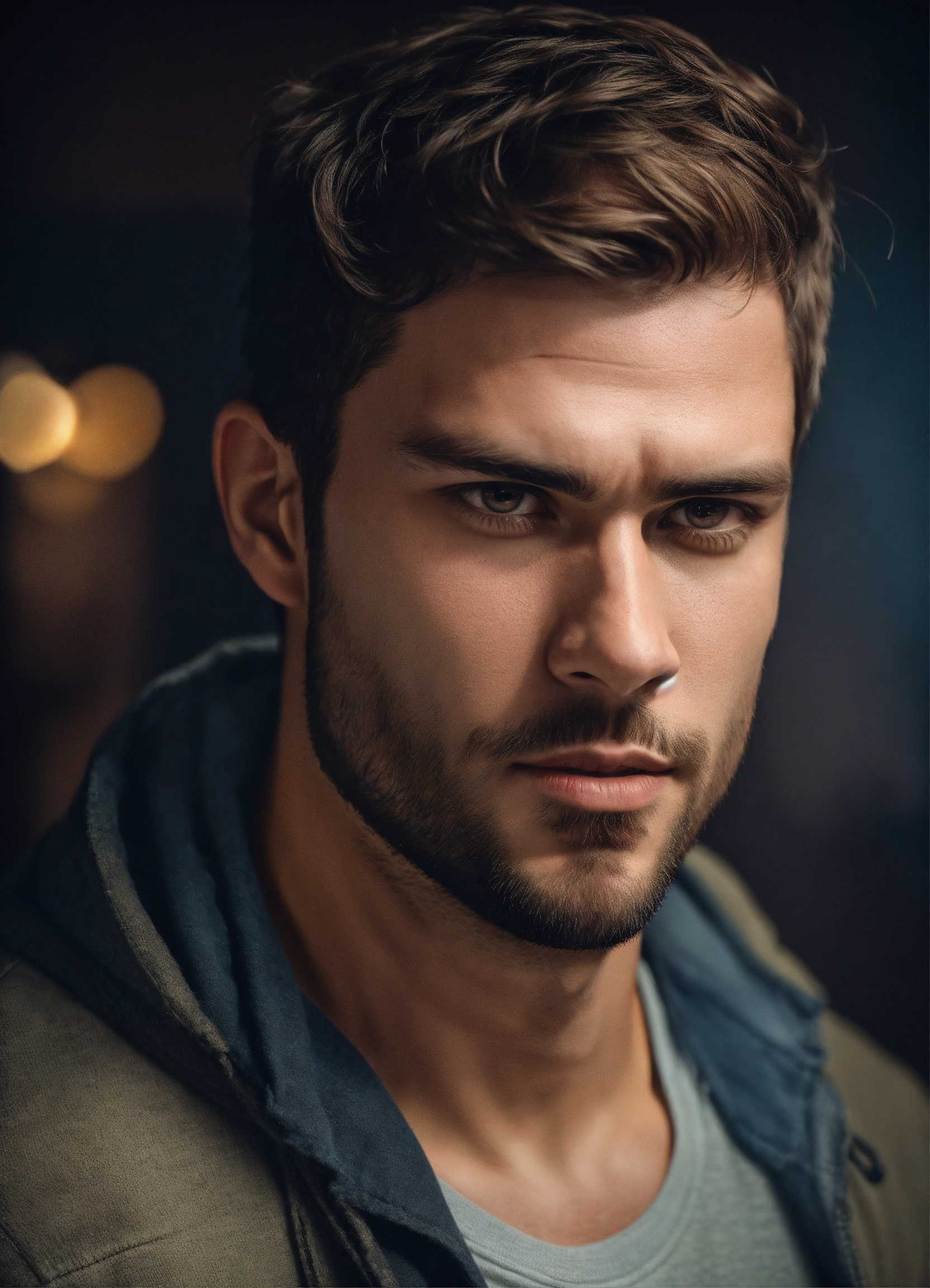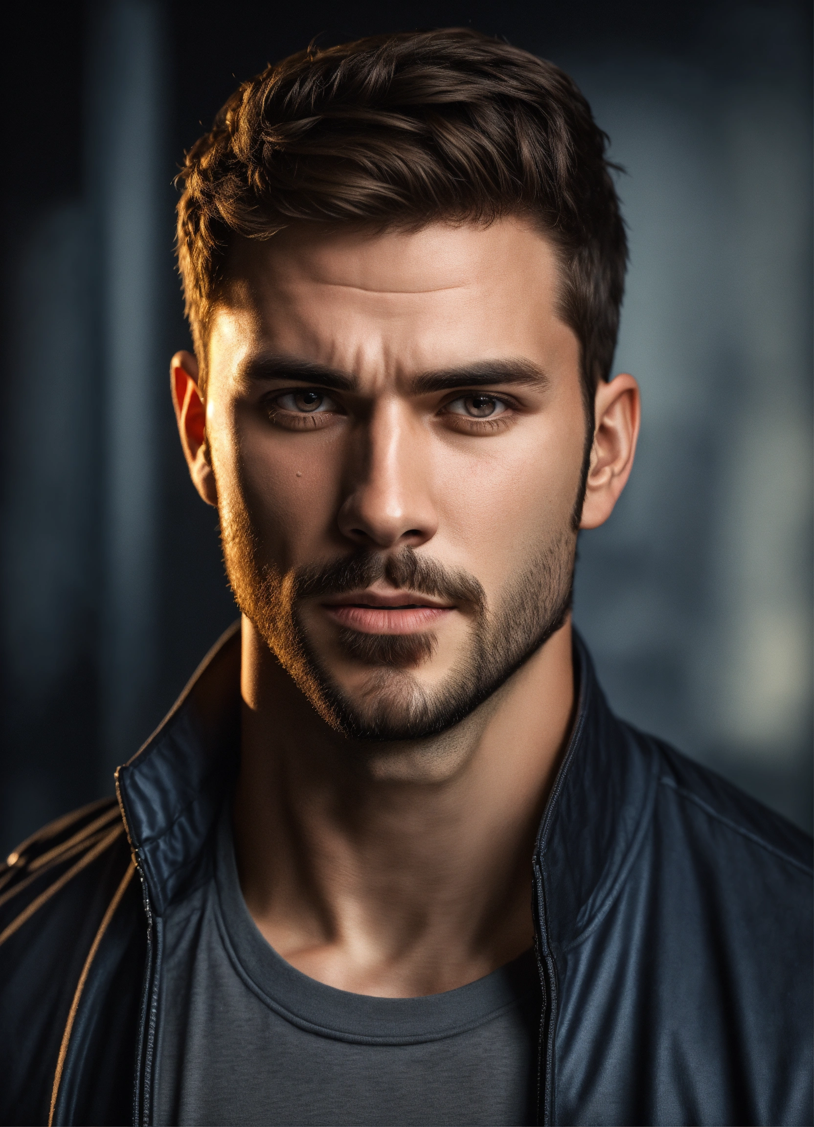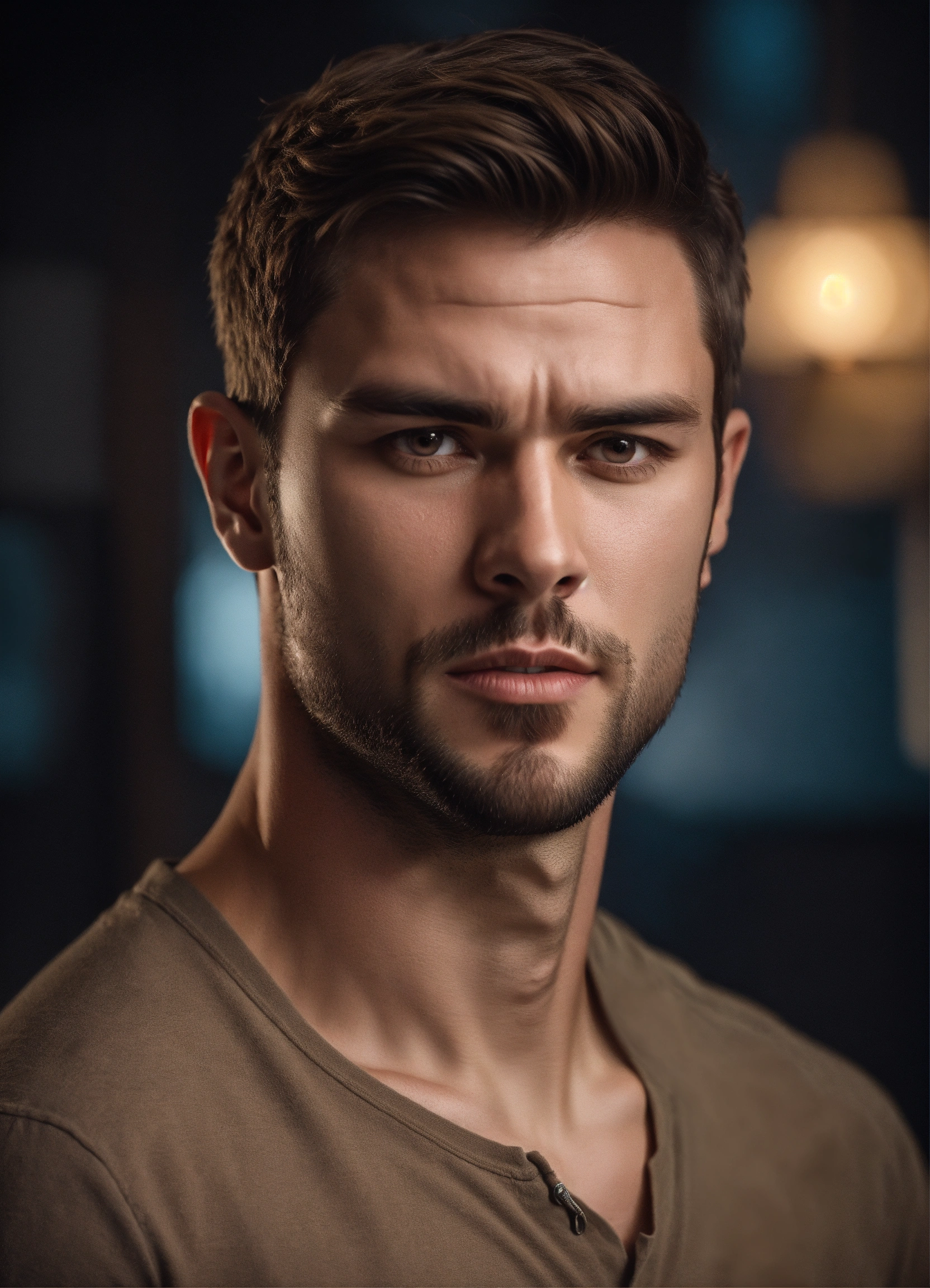 Very attractive strong and brutal man, 29 years old, with stern light brown eyes, brown-haired, dressed in casual style on a dark background, photorealistic
