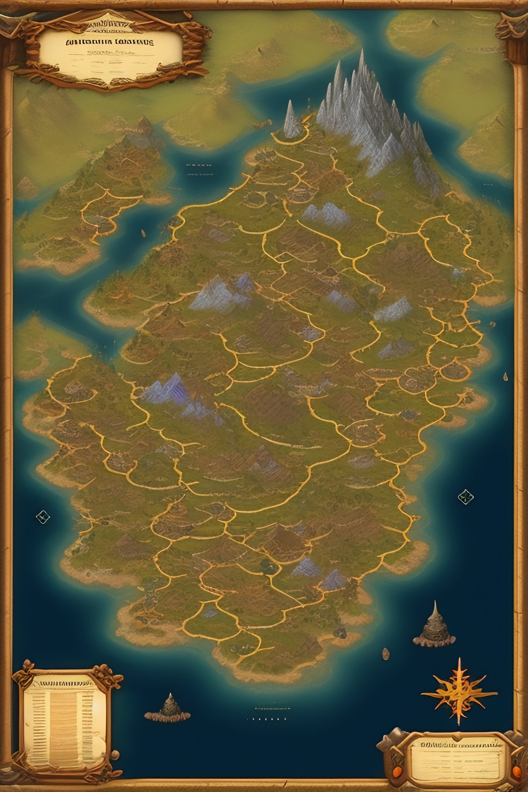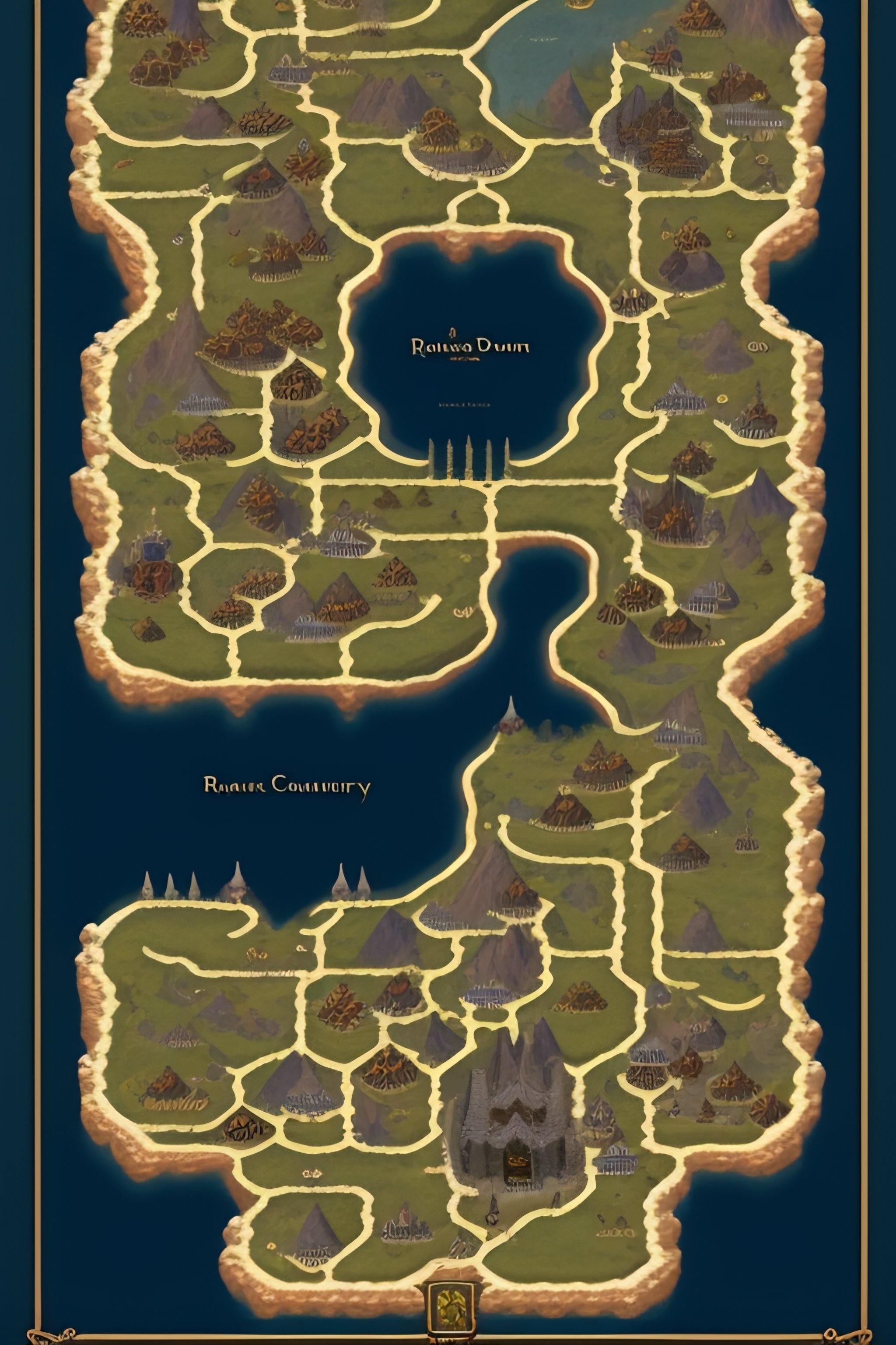 Dungeons and dragons, realm map, country, fantasy, city, towns, ruins, temples, fortress, medieval, tabletop game.