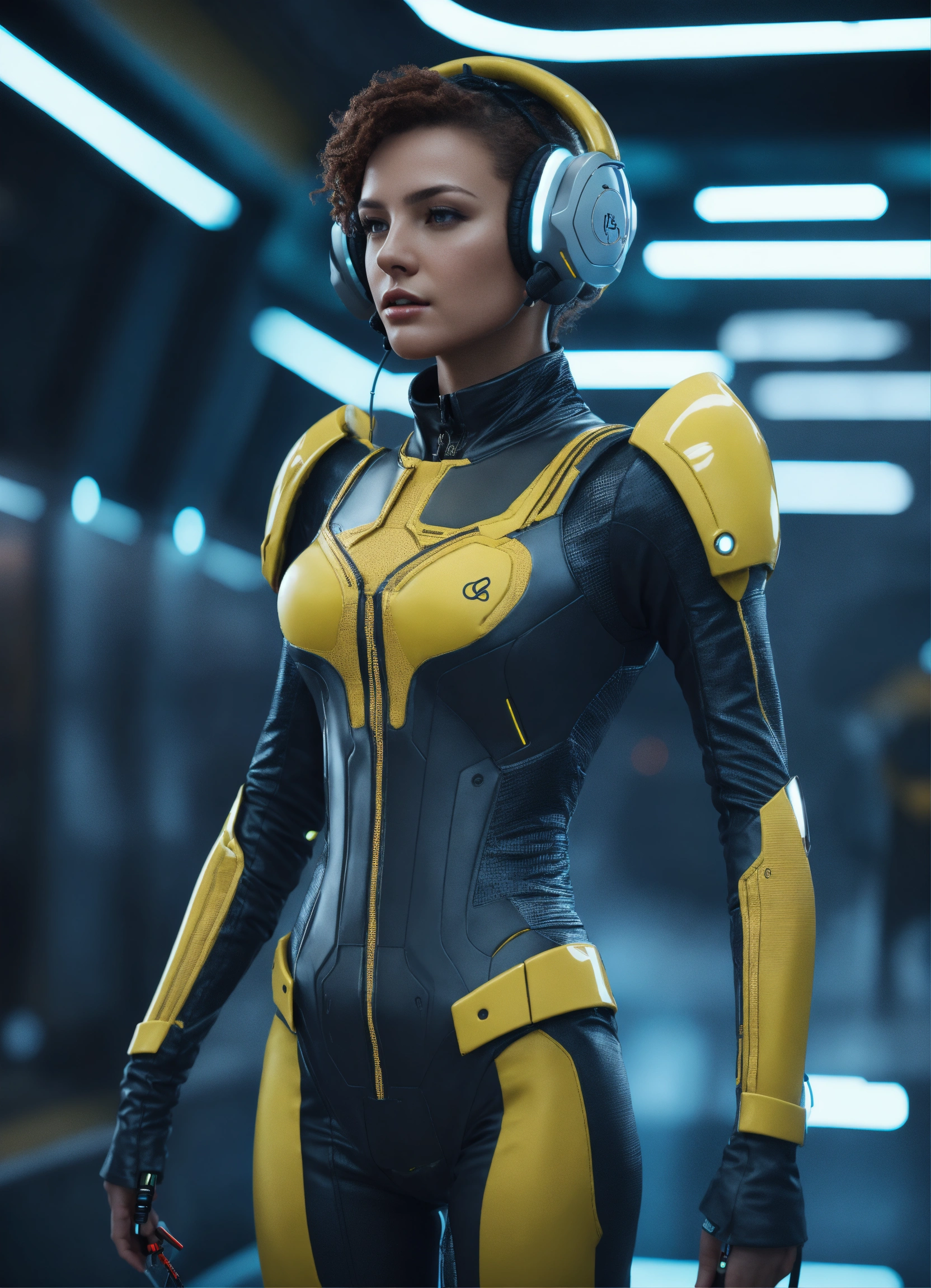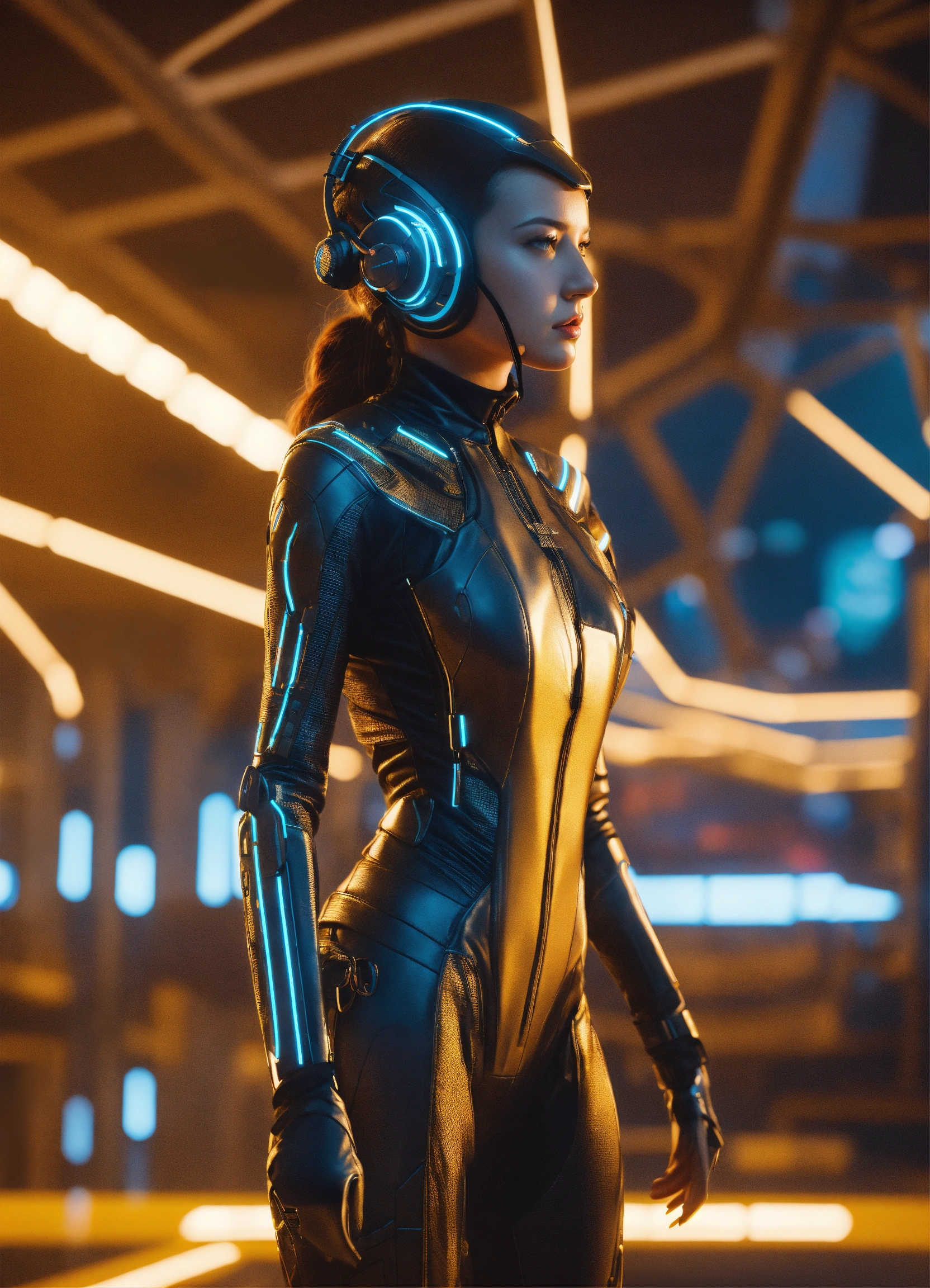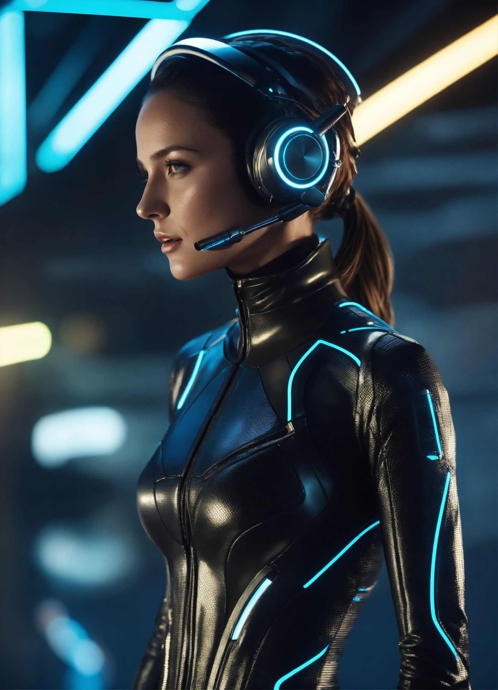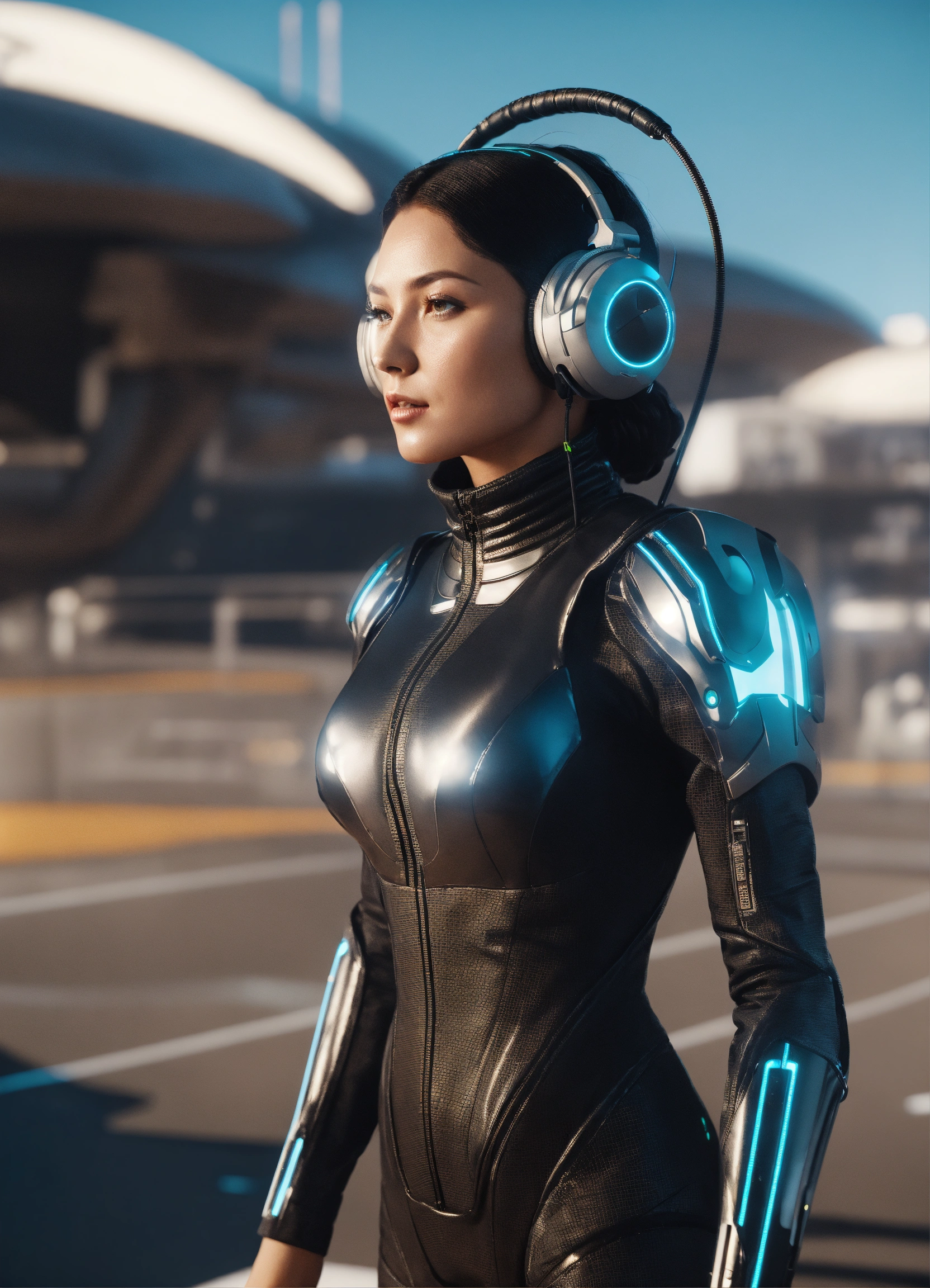 Wide shot of a female spy wearing a tight futuristic spy suit and alien earphones with long pointy antennas, hacking on the controls at a spaceport of a space port, realistic, futuristic, sci-fi, 8k, tron, unreal engine
