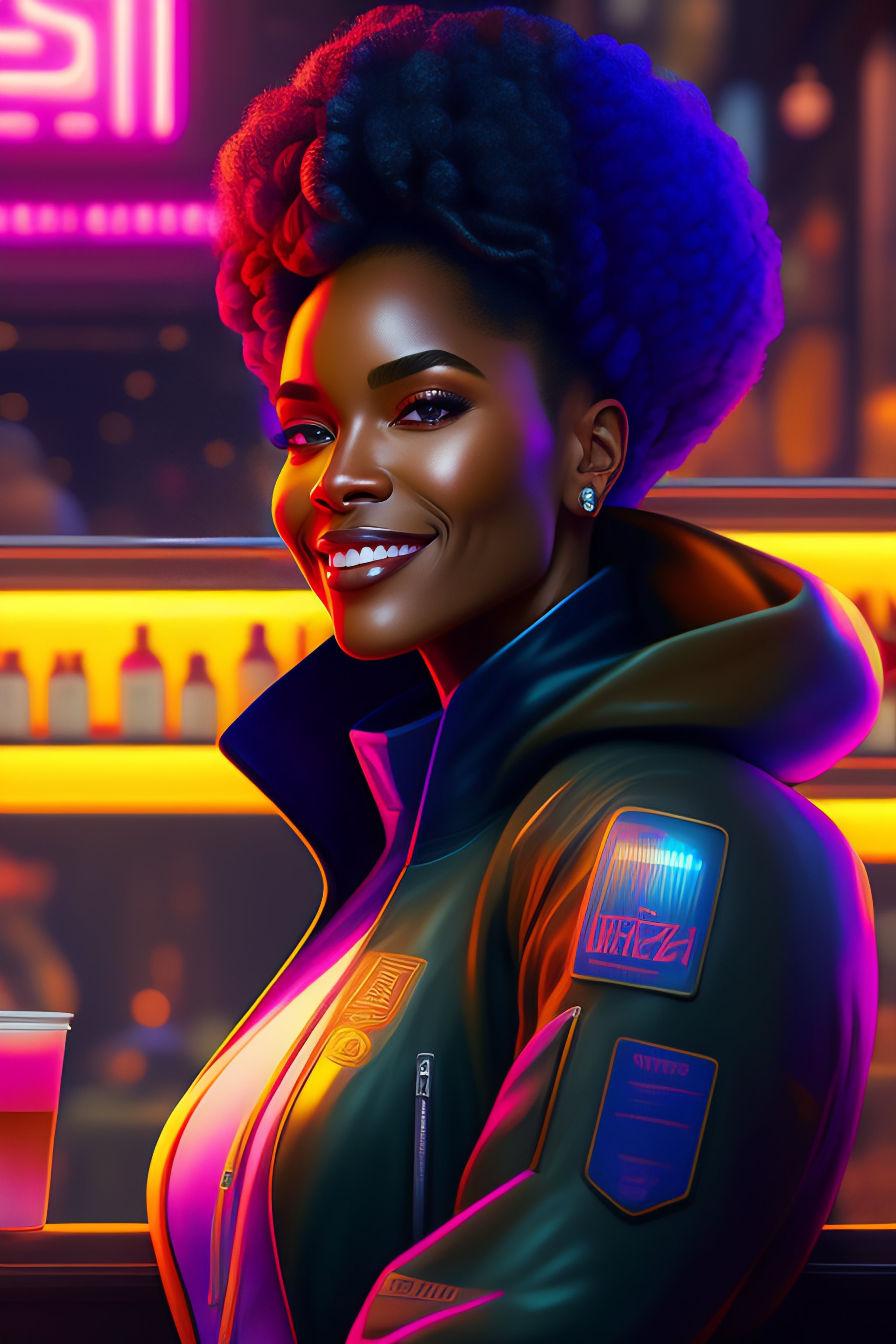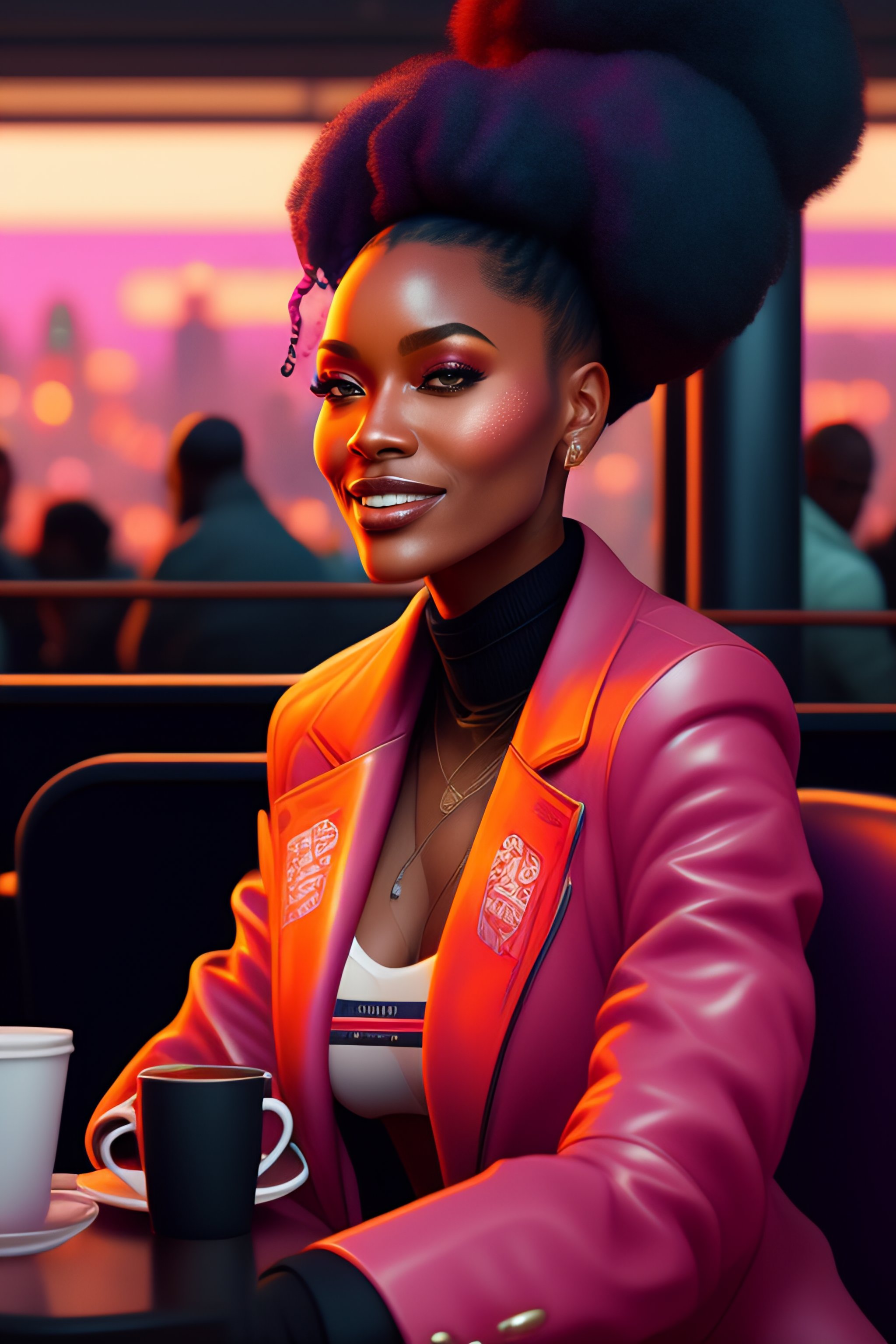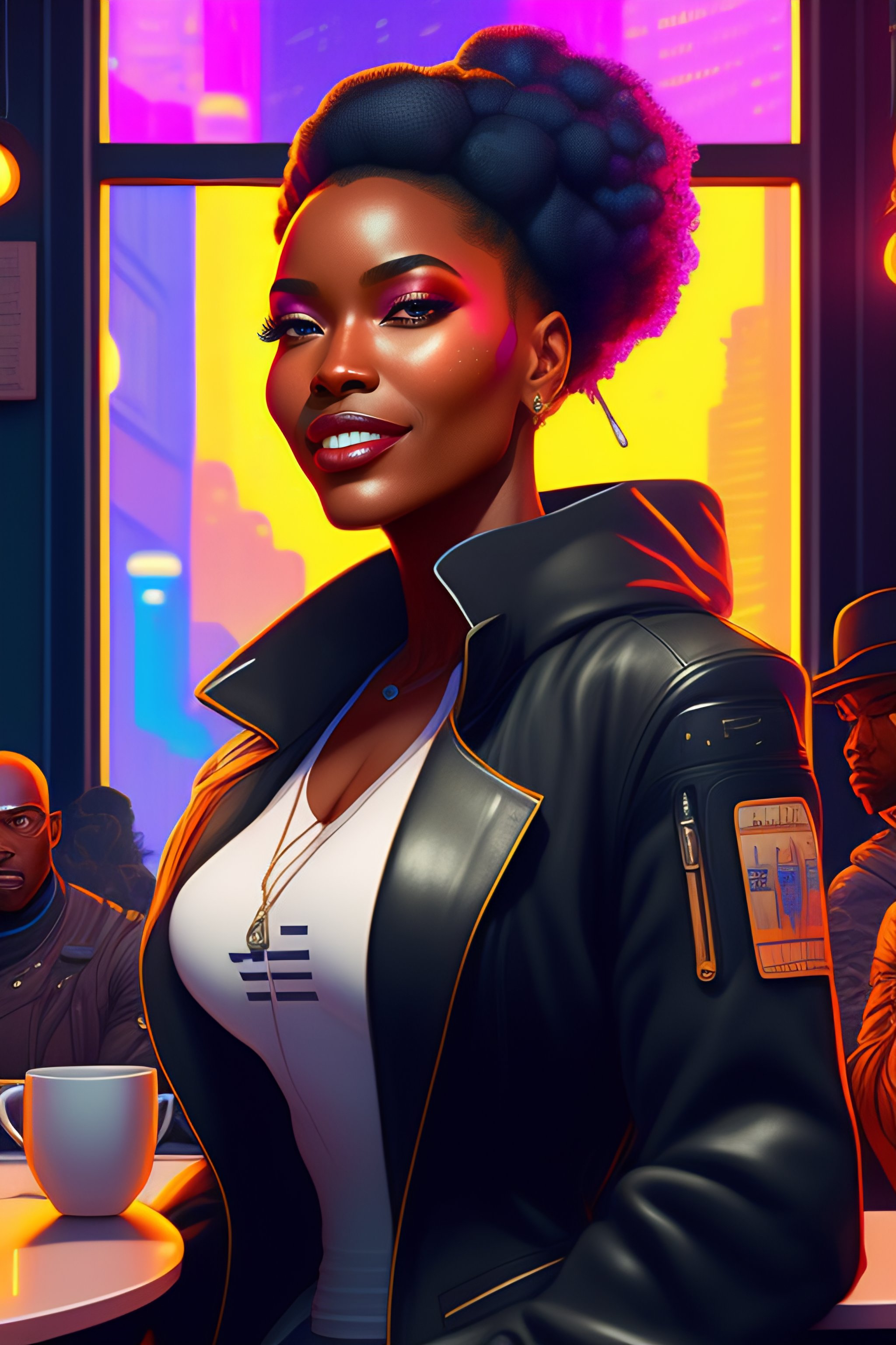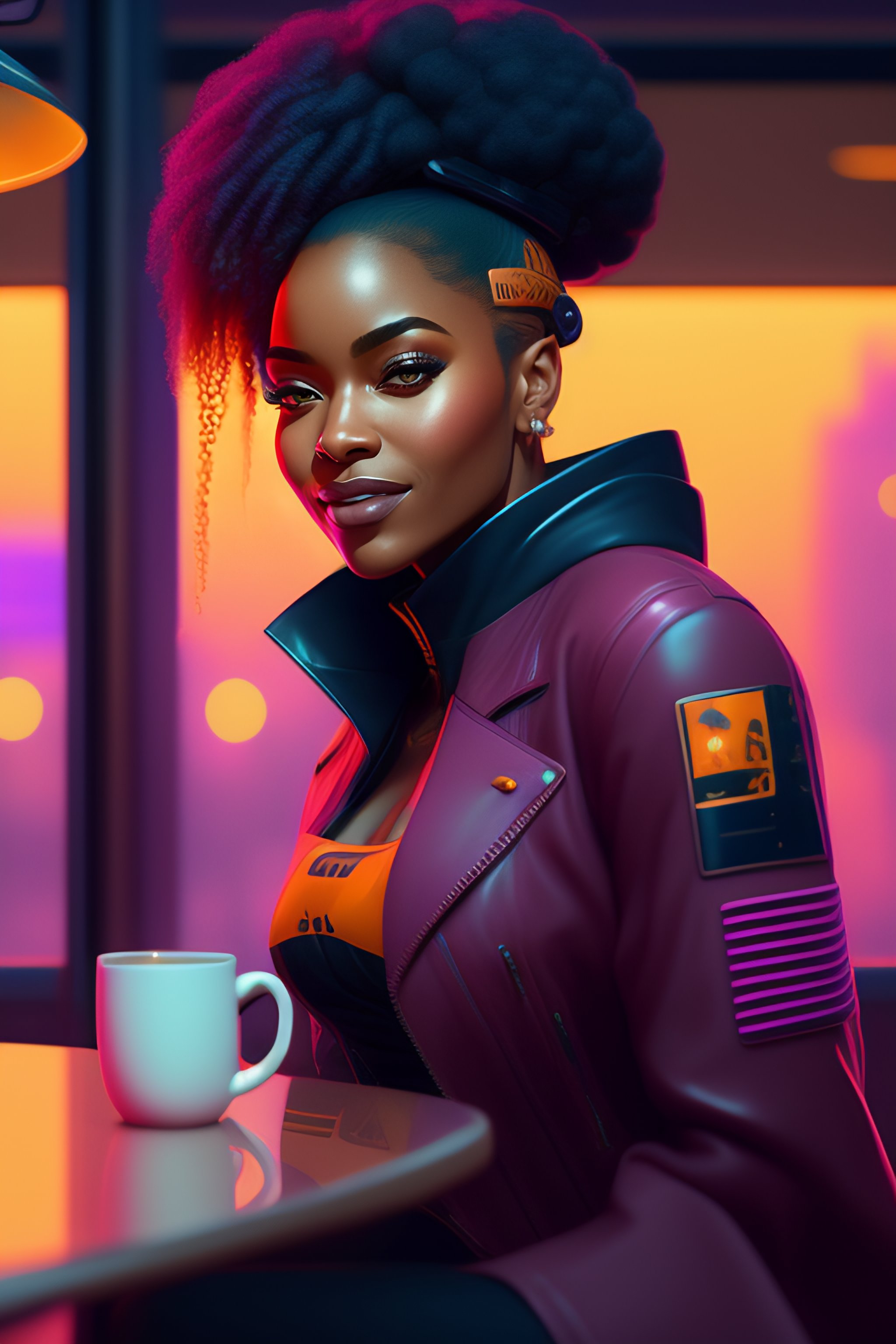 A black woman sitting at a cafe looking happy, cyberpunk, by josan gonzalez and tomer hanuka and geof darrow and brad rigney and greg rutkowski and moebius, highly detailed, uhd, 8k, ghost in the shell, blade runner, trending on artstation, bokh, dof