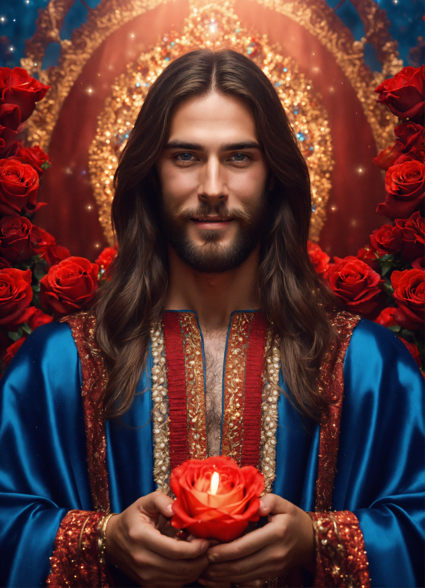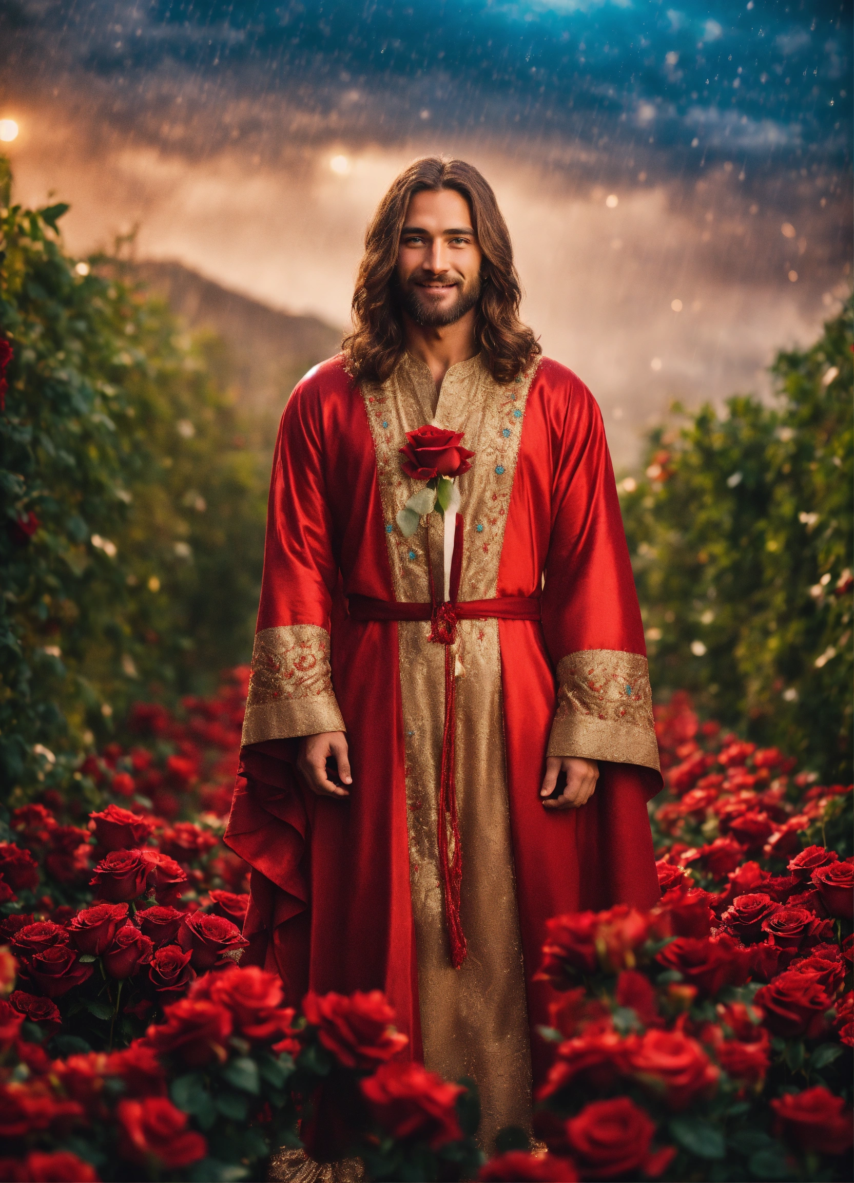 Iconoclastic surreal triumphant photo portrait of gorgeous handsome fit joyous kind-faced masculine glorified jesus christ supermodel white blissfully joyous, gentle loving smile and staring lovingly straight ahead directly into camera at me, long brown hair and trimmed beard, brilliant glowing blue eyes centred on me, wearing sparkling intricately designed red kingly robes over a sparkling tunic with high neckline, symmetrical, iconic, striking, award winning photo, powerful, glorious, emotional, editorial fantasy photoshoot, background is raining sparkling roses in morning garden. film grain.