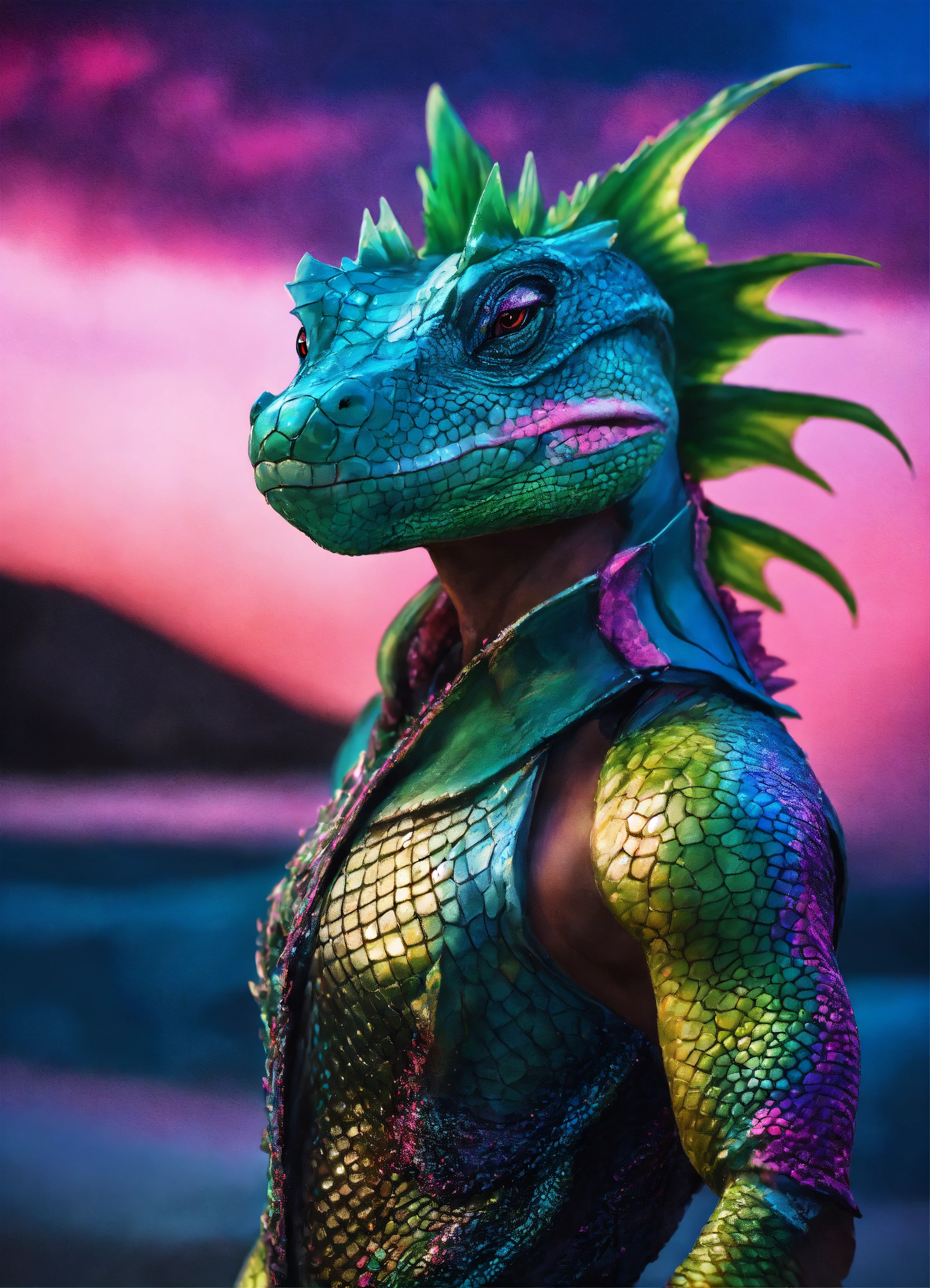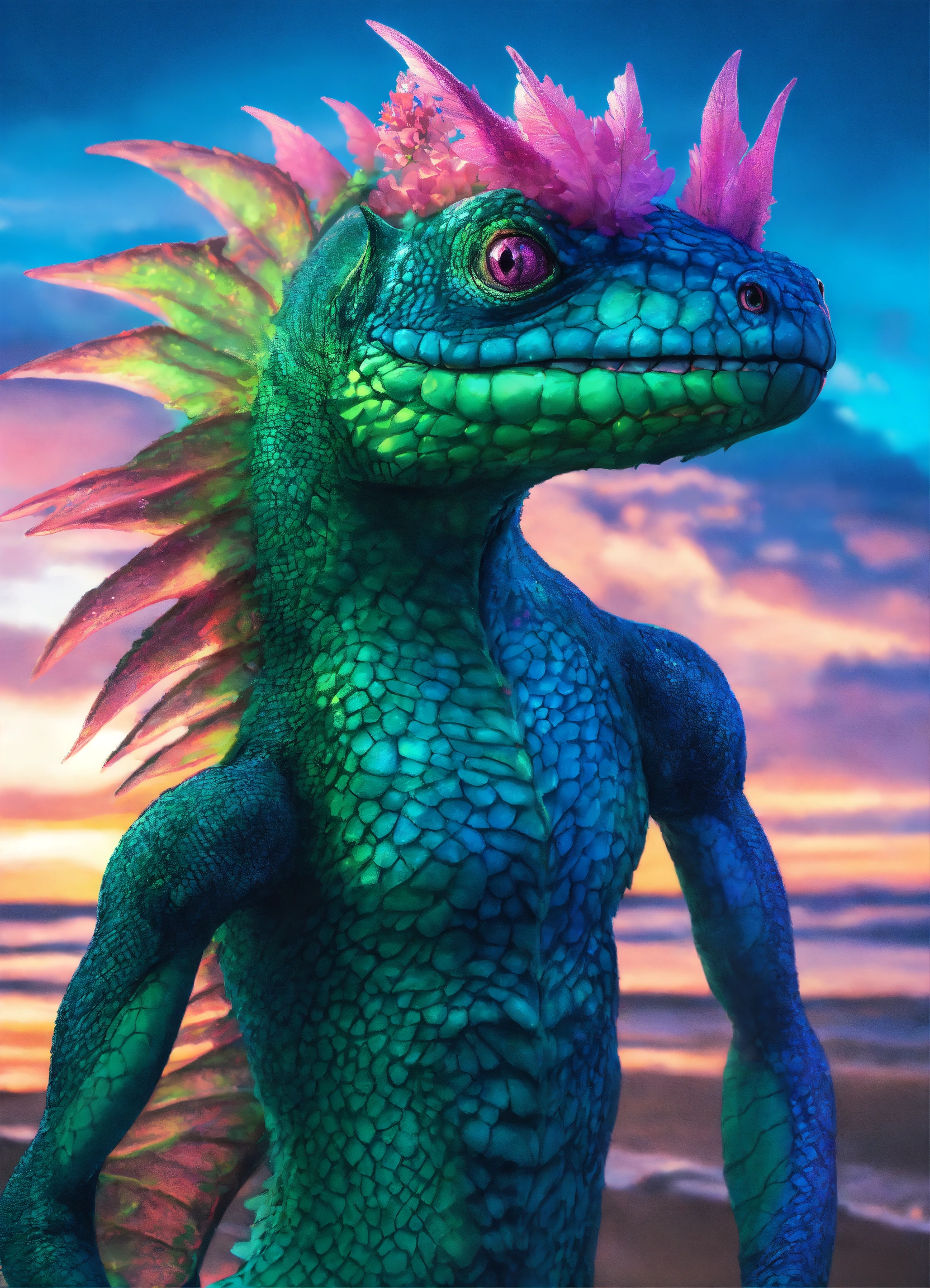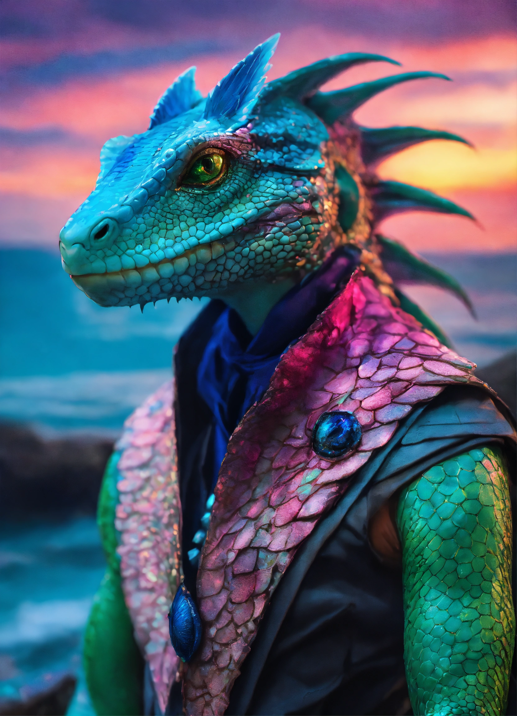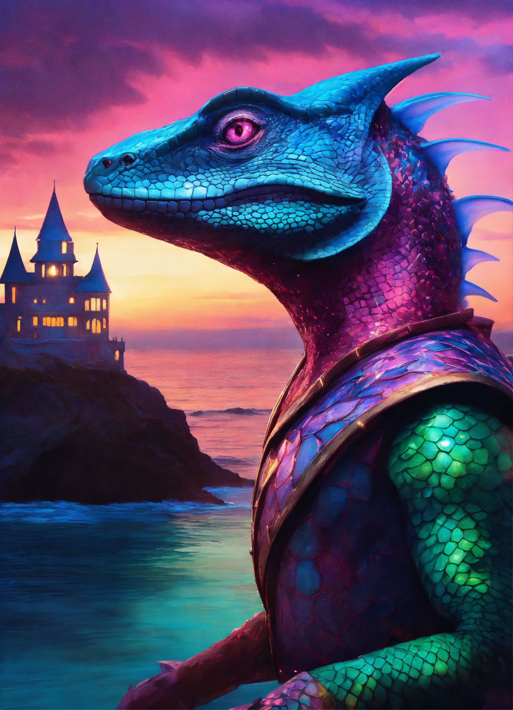 Fantasy portrait of a lizardfolk, masculine humanoid face, gills, facial fins, humanoid eyes, shimmery skin, bioluminescent blue fins, pink and green magic, coastal sunset castle background
