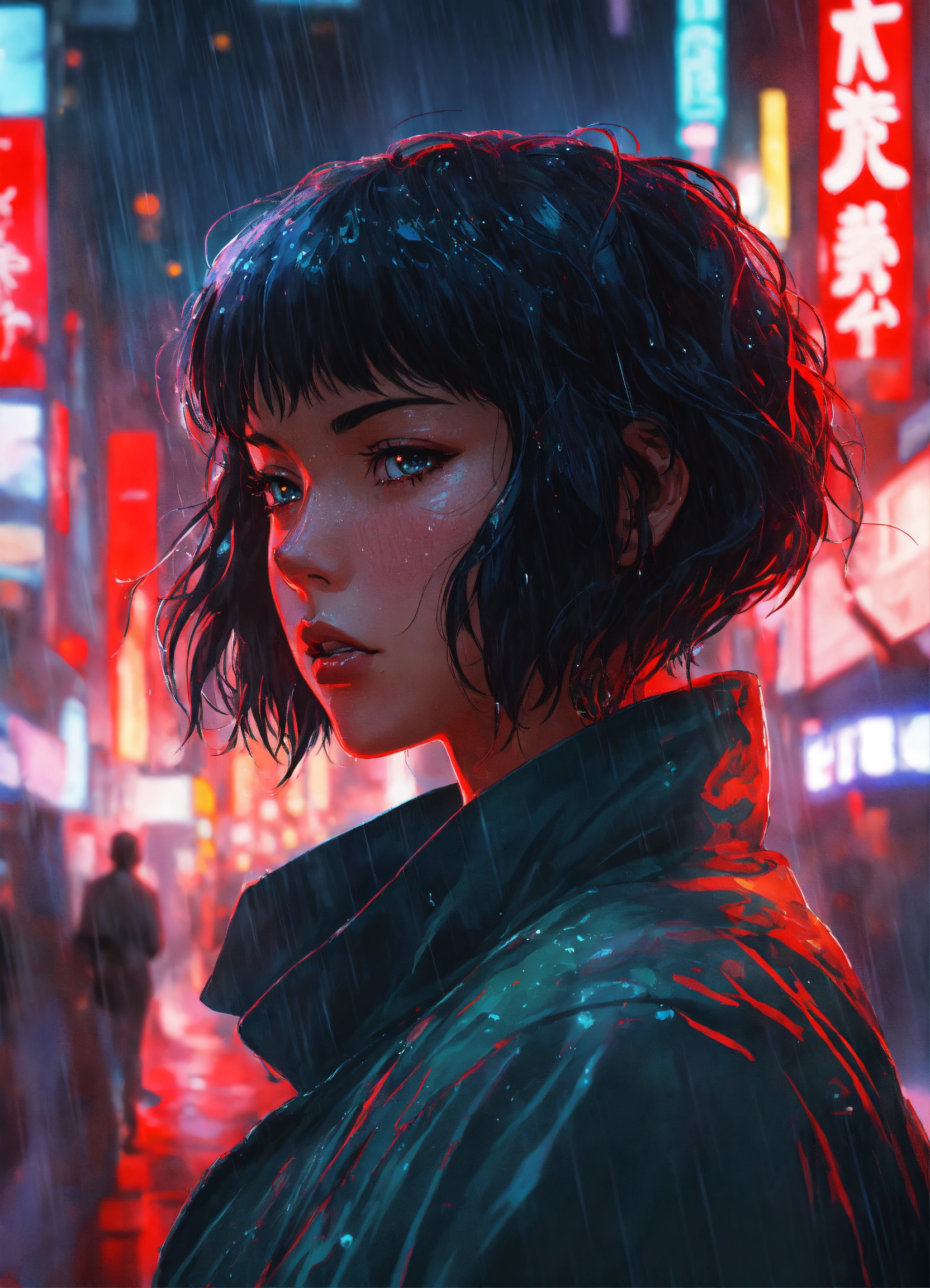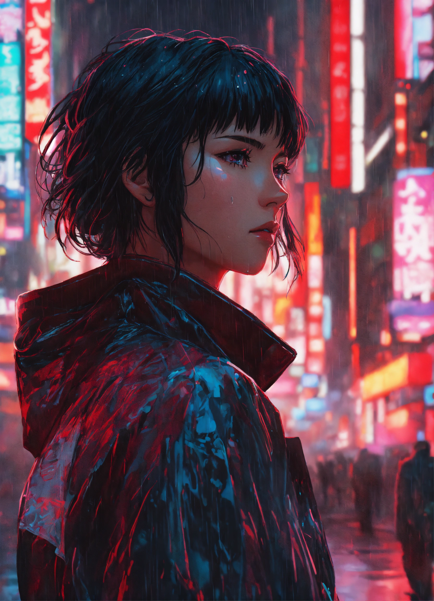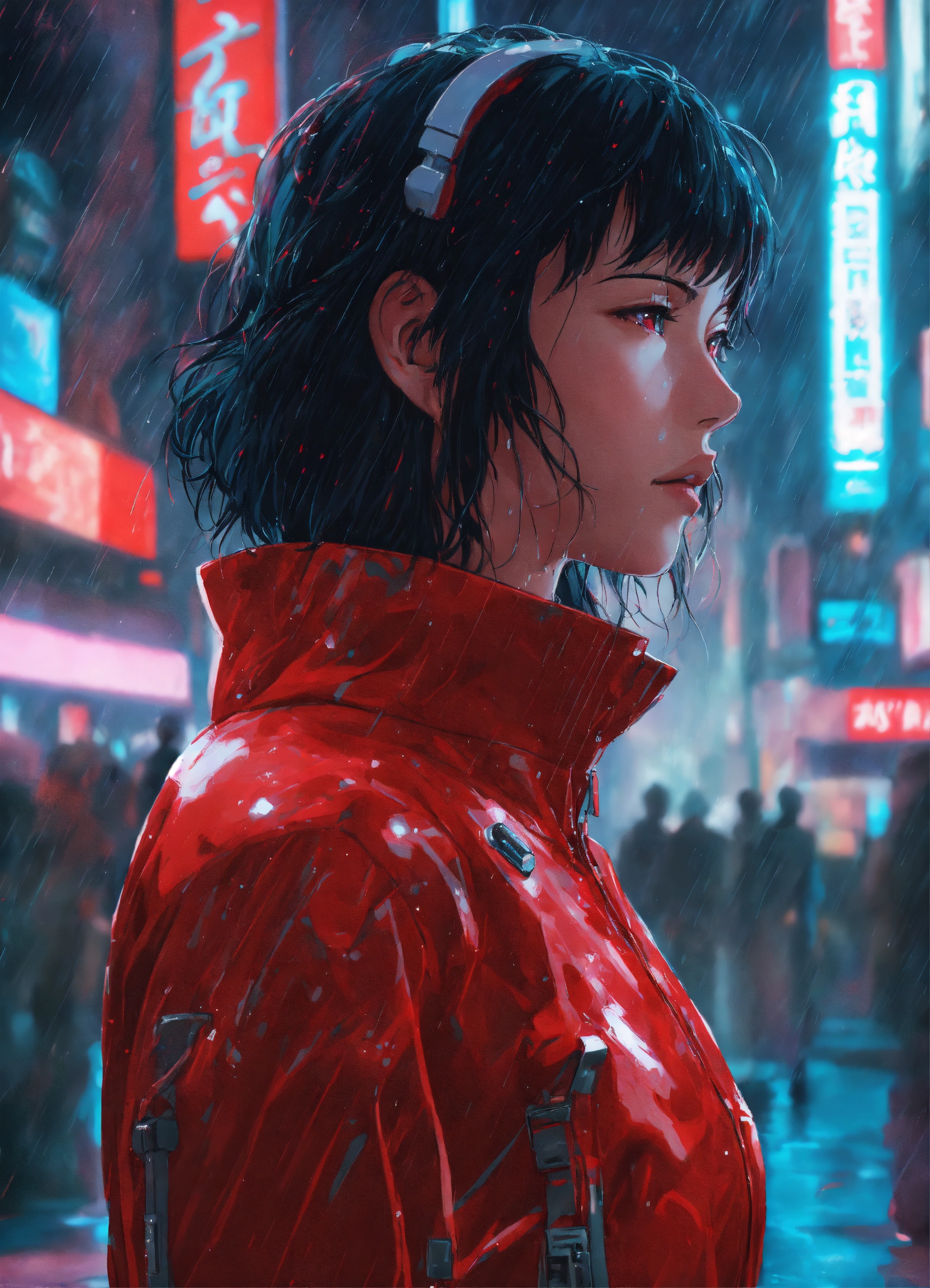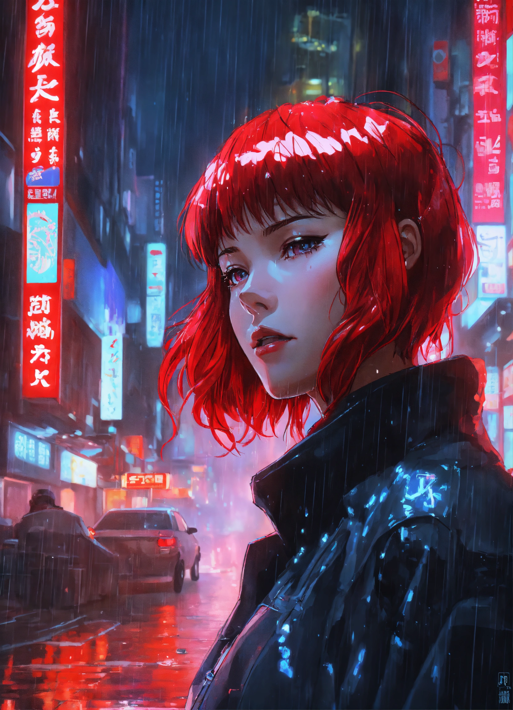Anime art of ghost in the shell, detailed scene, red, perfect face, intricately detailed photorealism, trending on artstation, neon lights, rainy day, ray-traced environment, vintage 90's anime artwork.