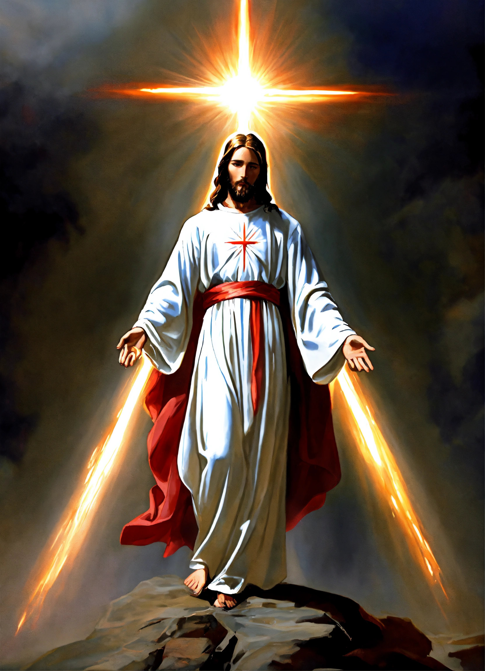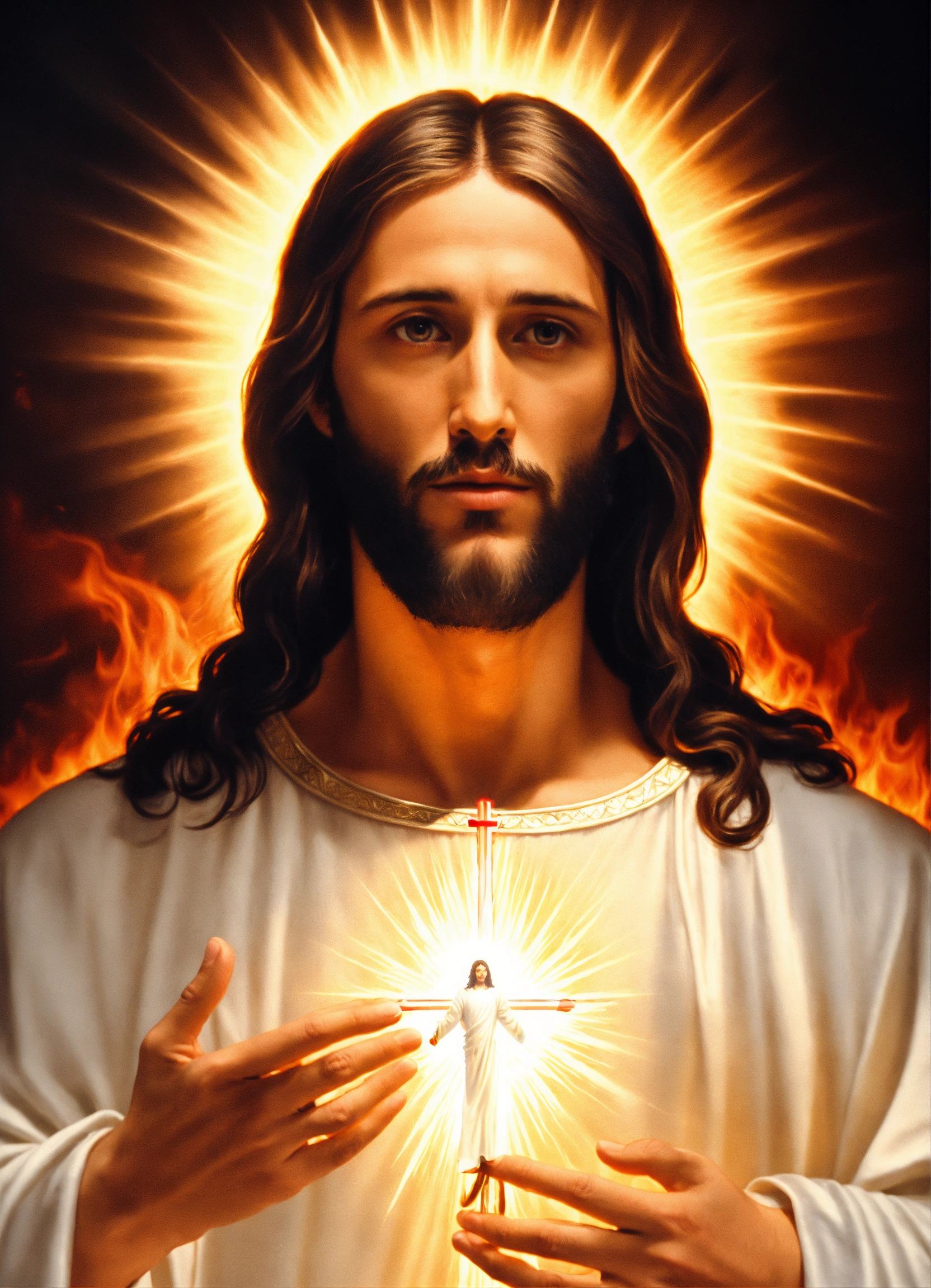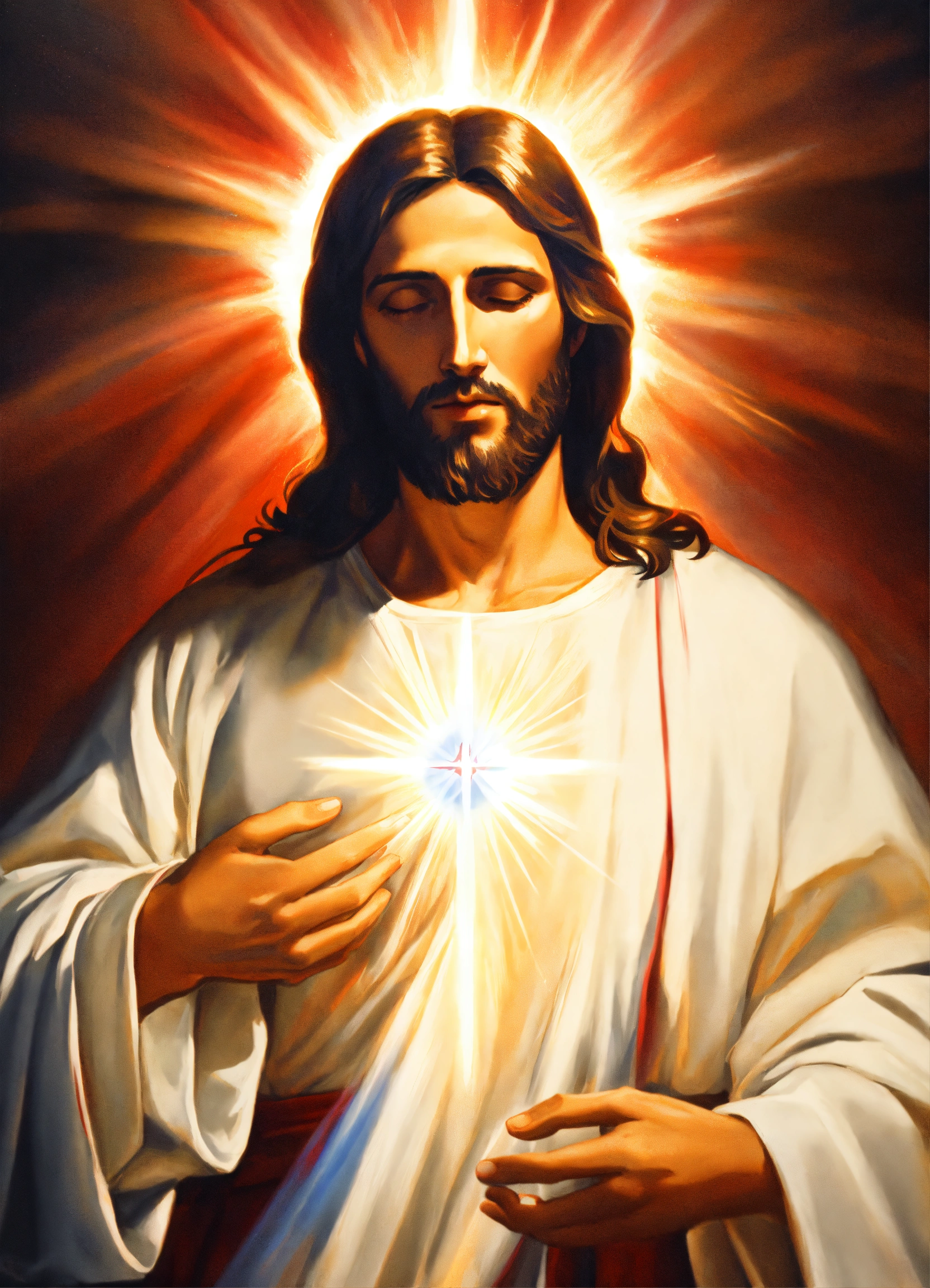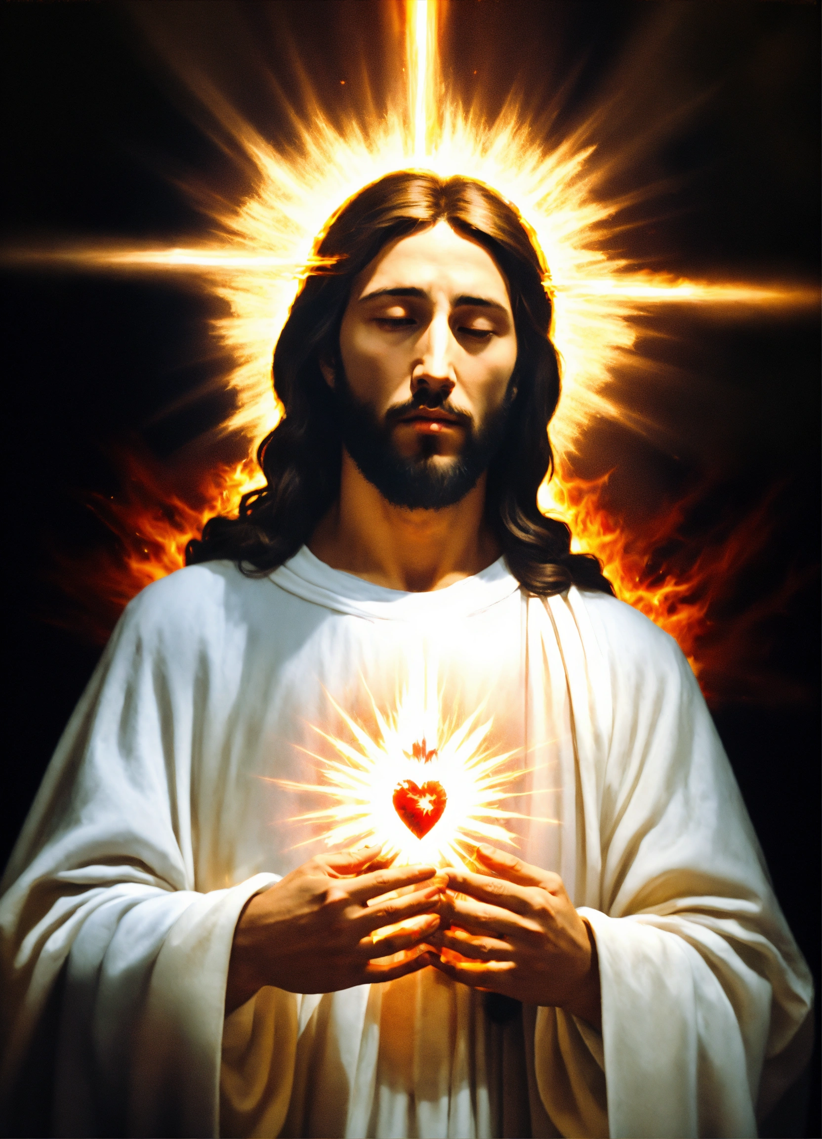 Movie still from "close encouners with the christ". closeup of divine mercy jesus. he is wearing a white tunic. he is surrounded by a dark pitch blackness, and shows his flaming heart. a blaze of light emerges from it. amazing light coming out of his chest. 8k. ultra realistic.