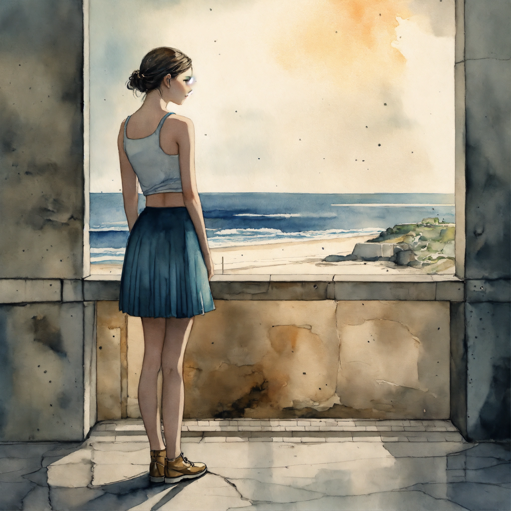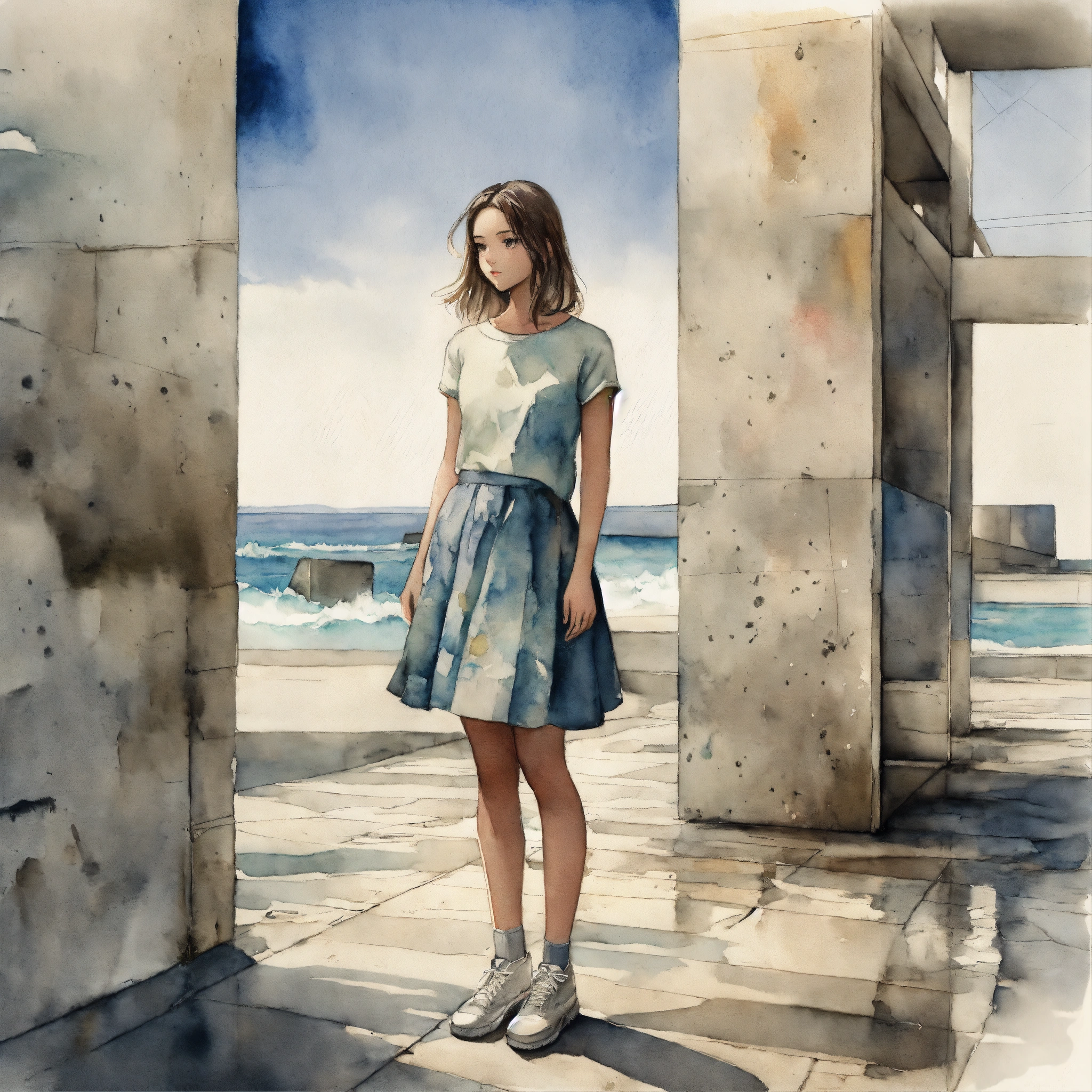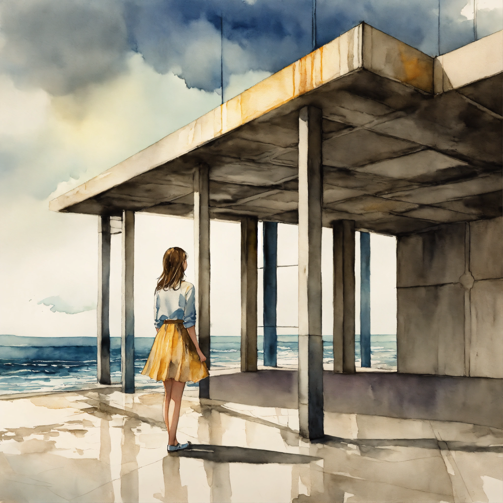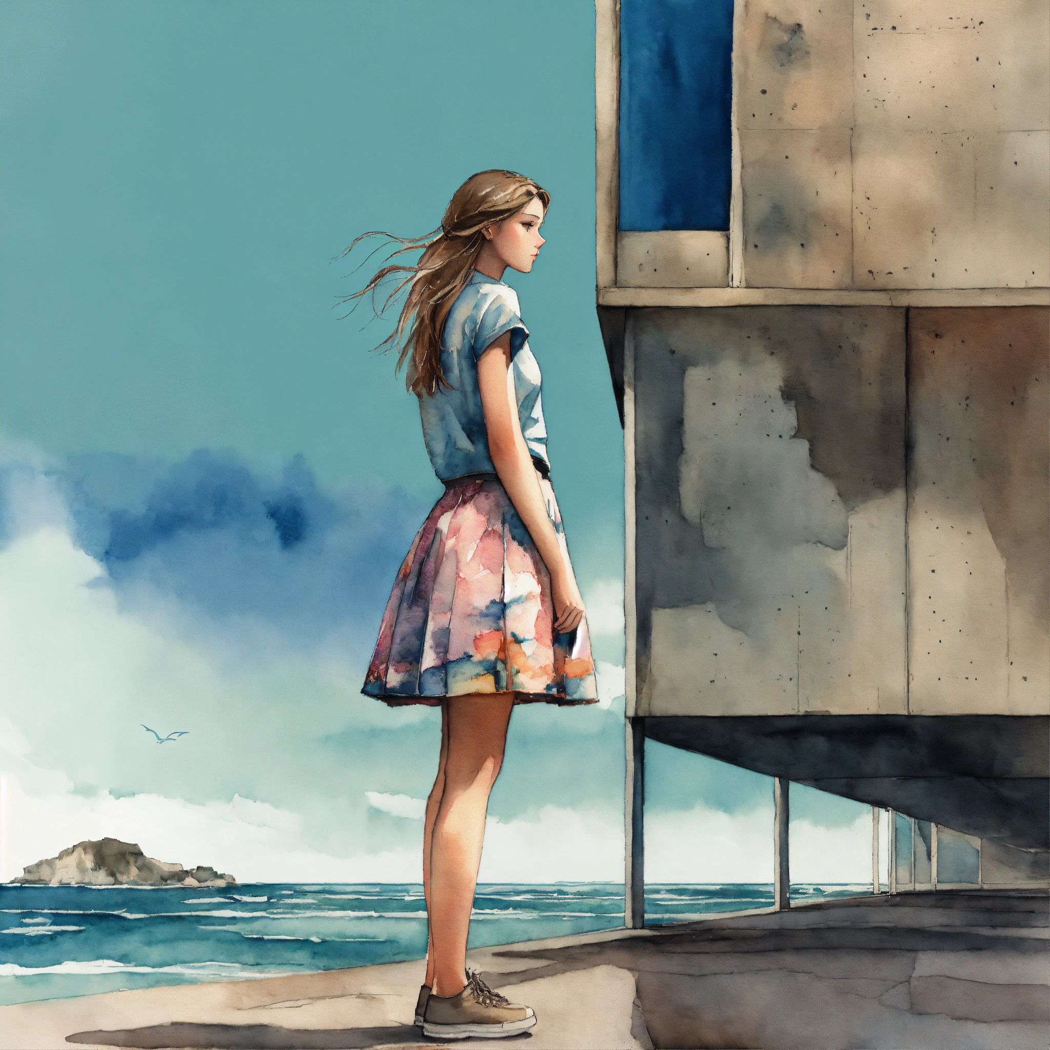 Full body illustration of a woman, young, 18 years old, wearing a skirt, beautiful, daydreaming in a modern concrete structure, ocean view, watercolors, gloomy and depressing ambient, artwork by tom björklund