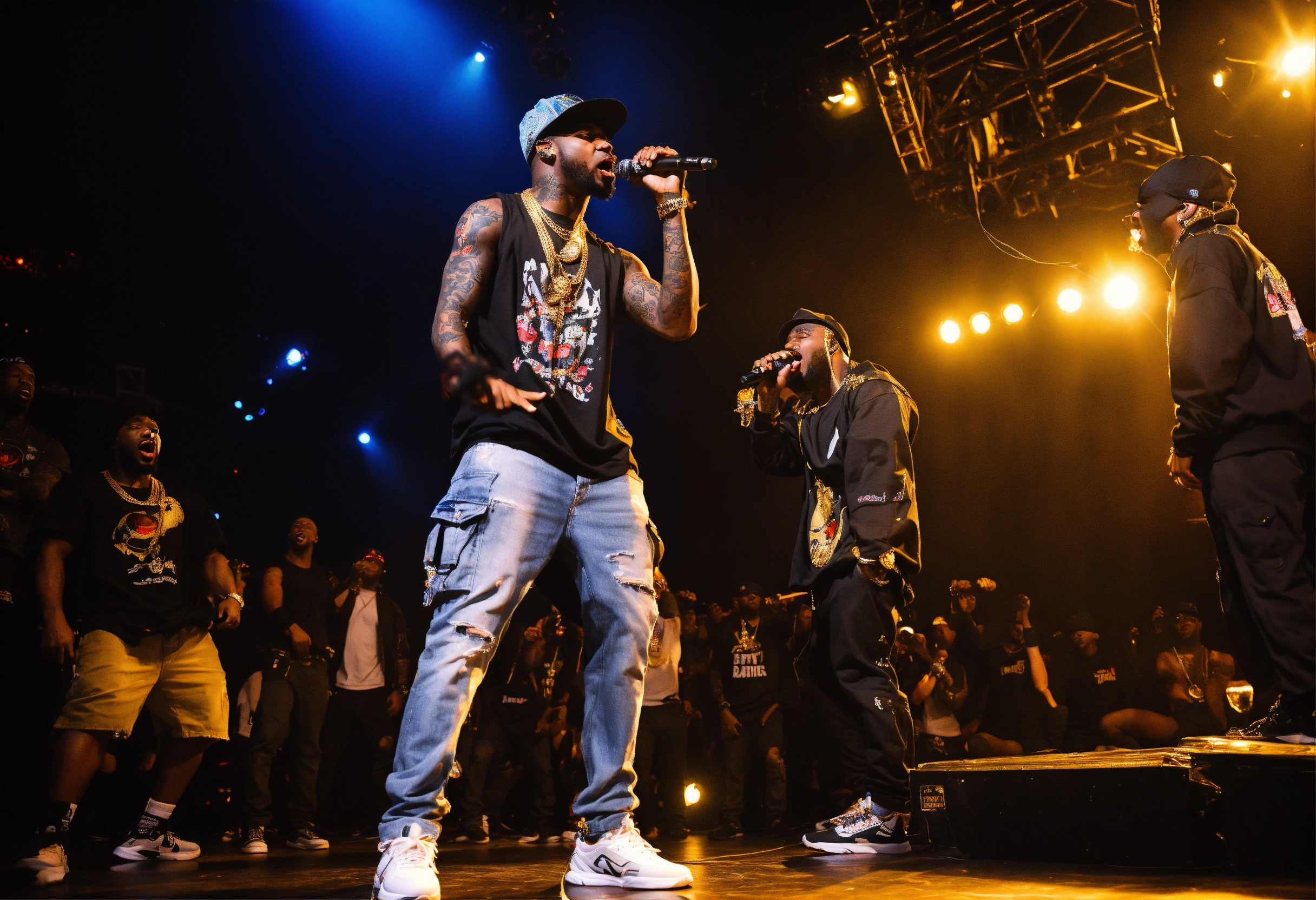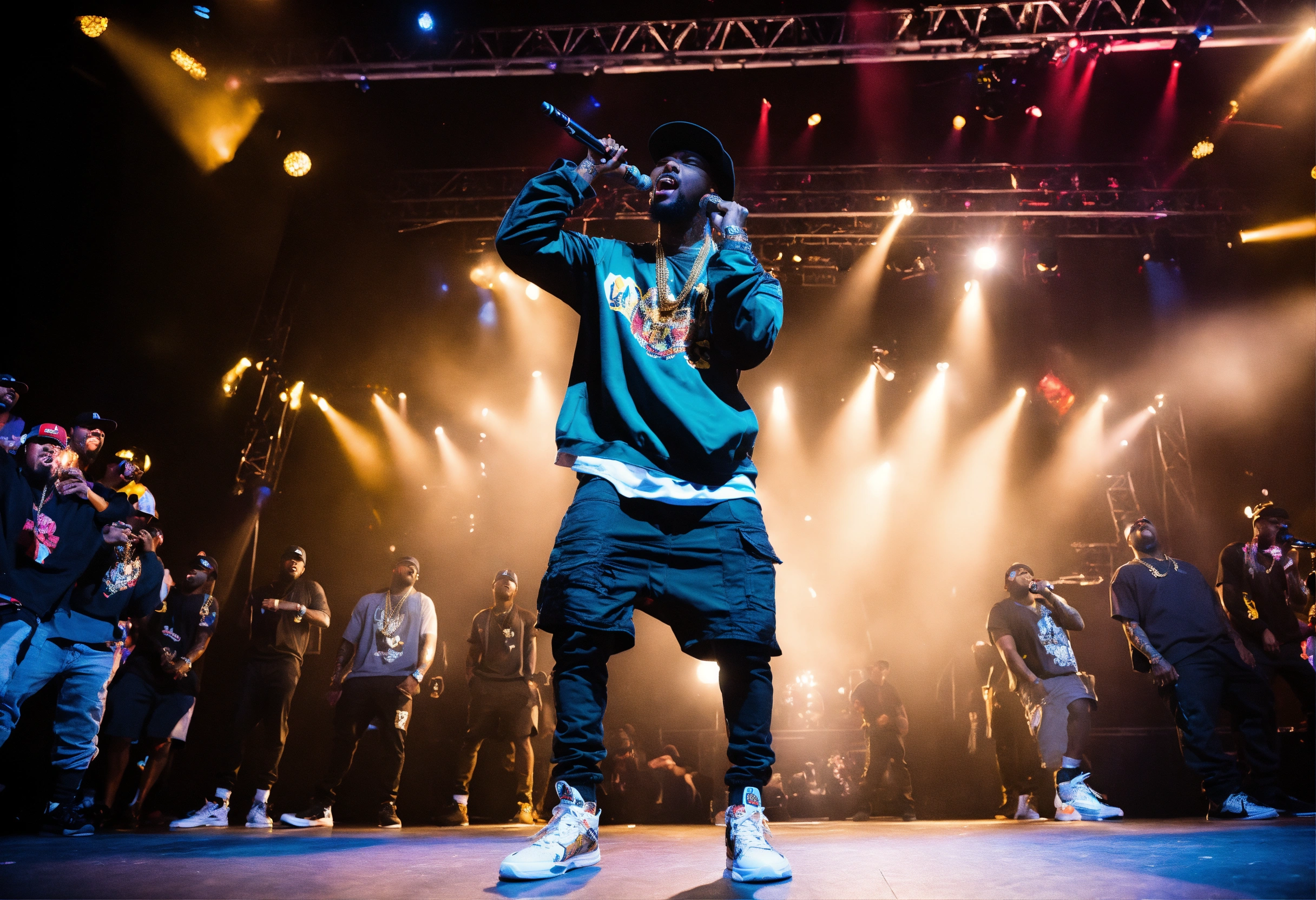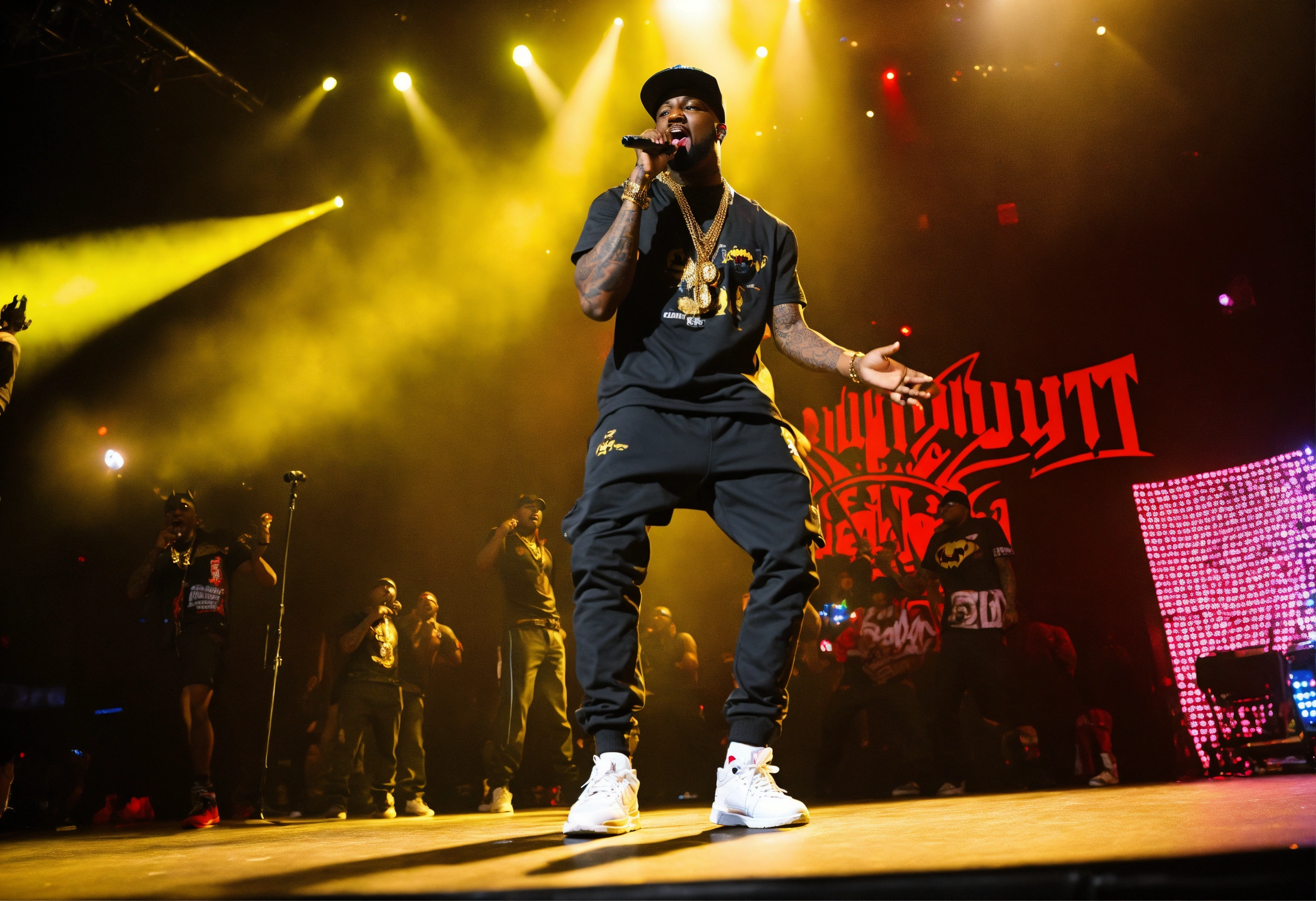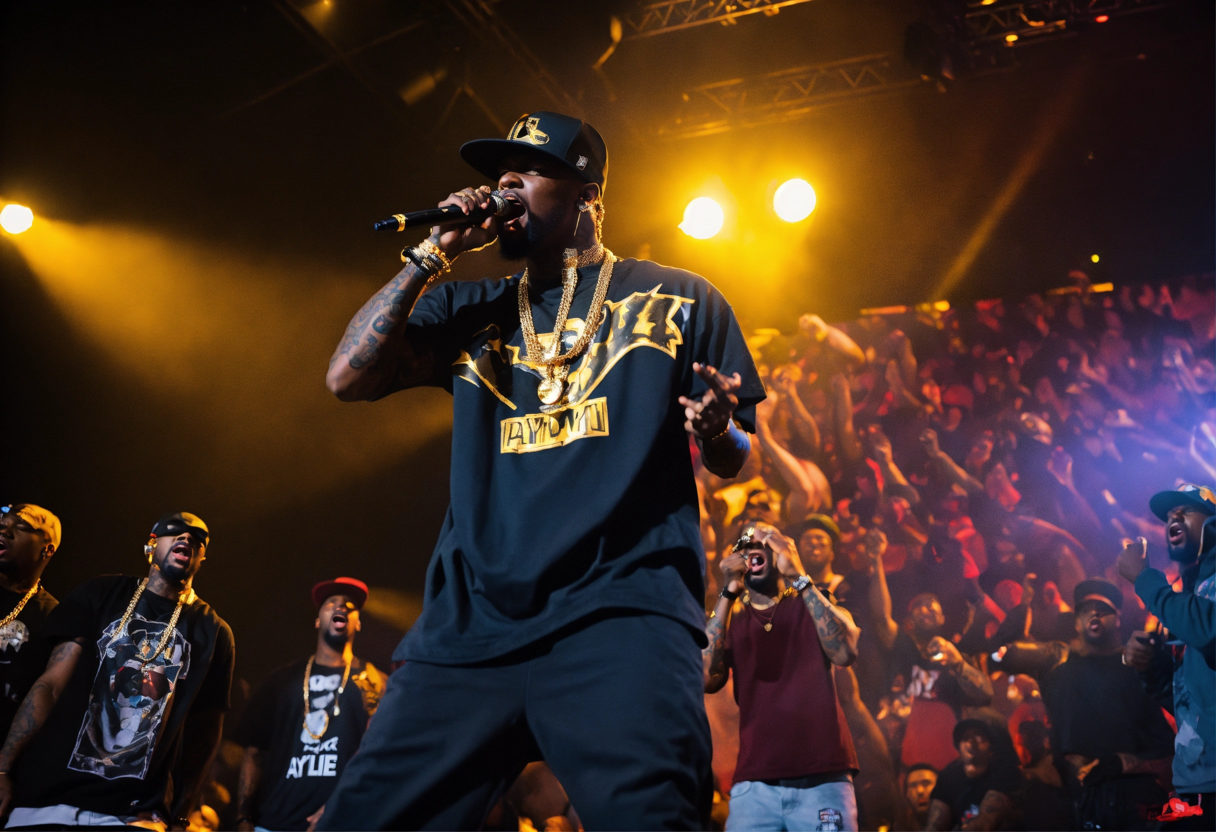 Full body shot black battle rapper "daylyt" rapping battling "loaded lux" on stage in the staple center with batman light shining from sky watts, los angeles background talking, epic details 8k, super high quality, tattoo, gold neckless, canon eos 5d, burst out screaming, background.
