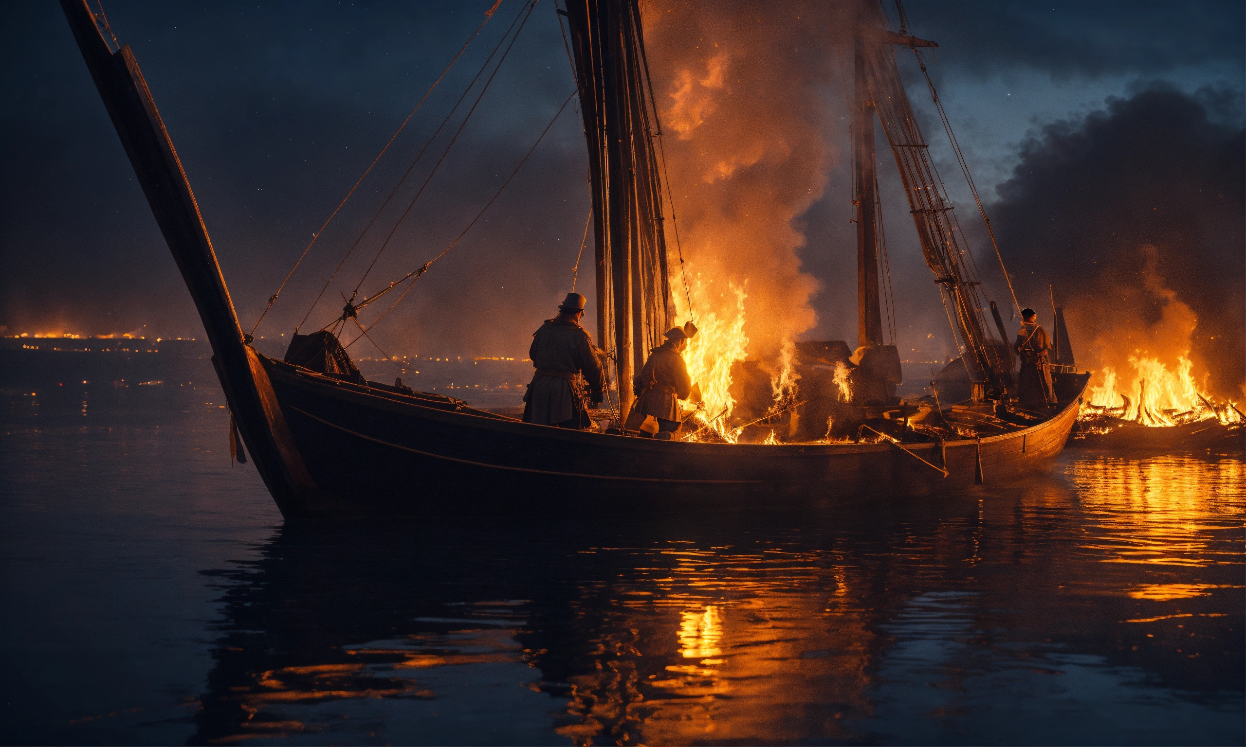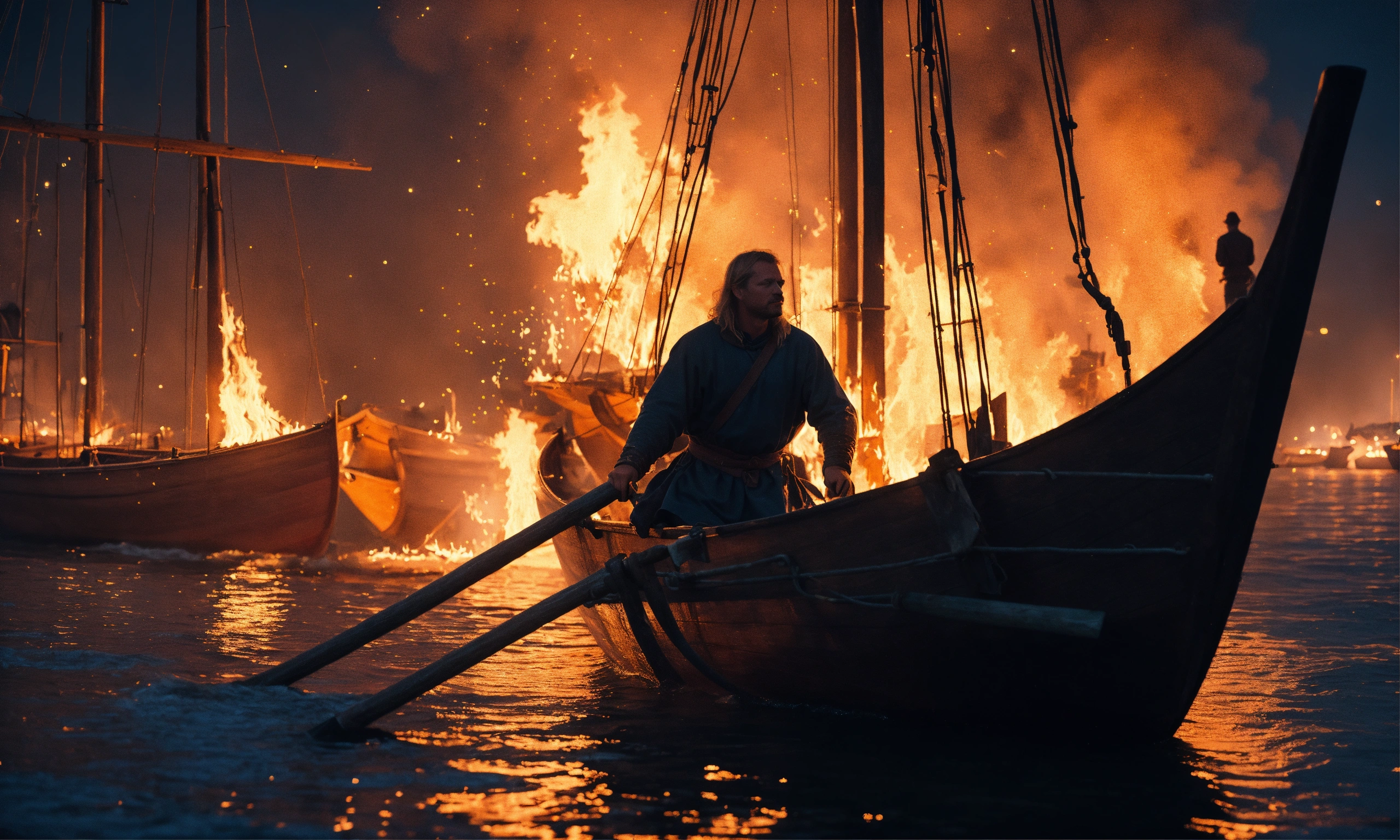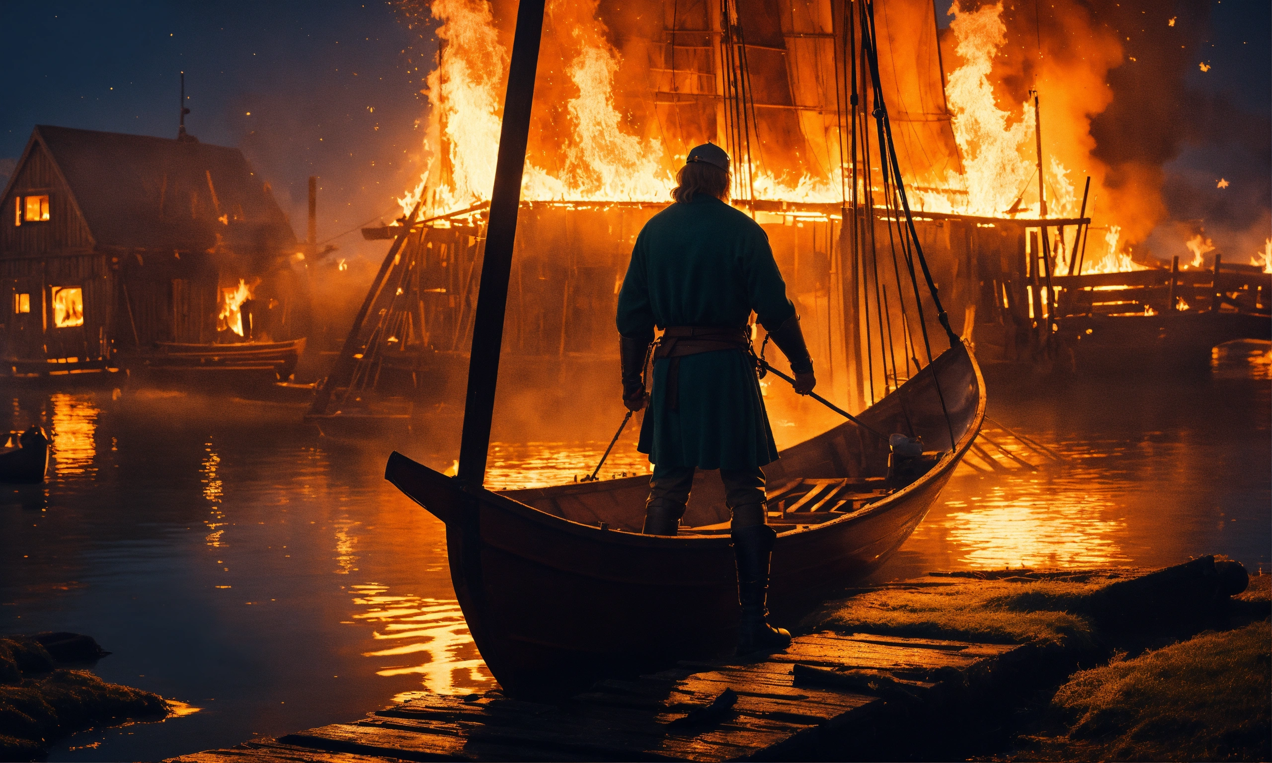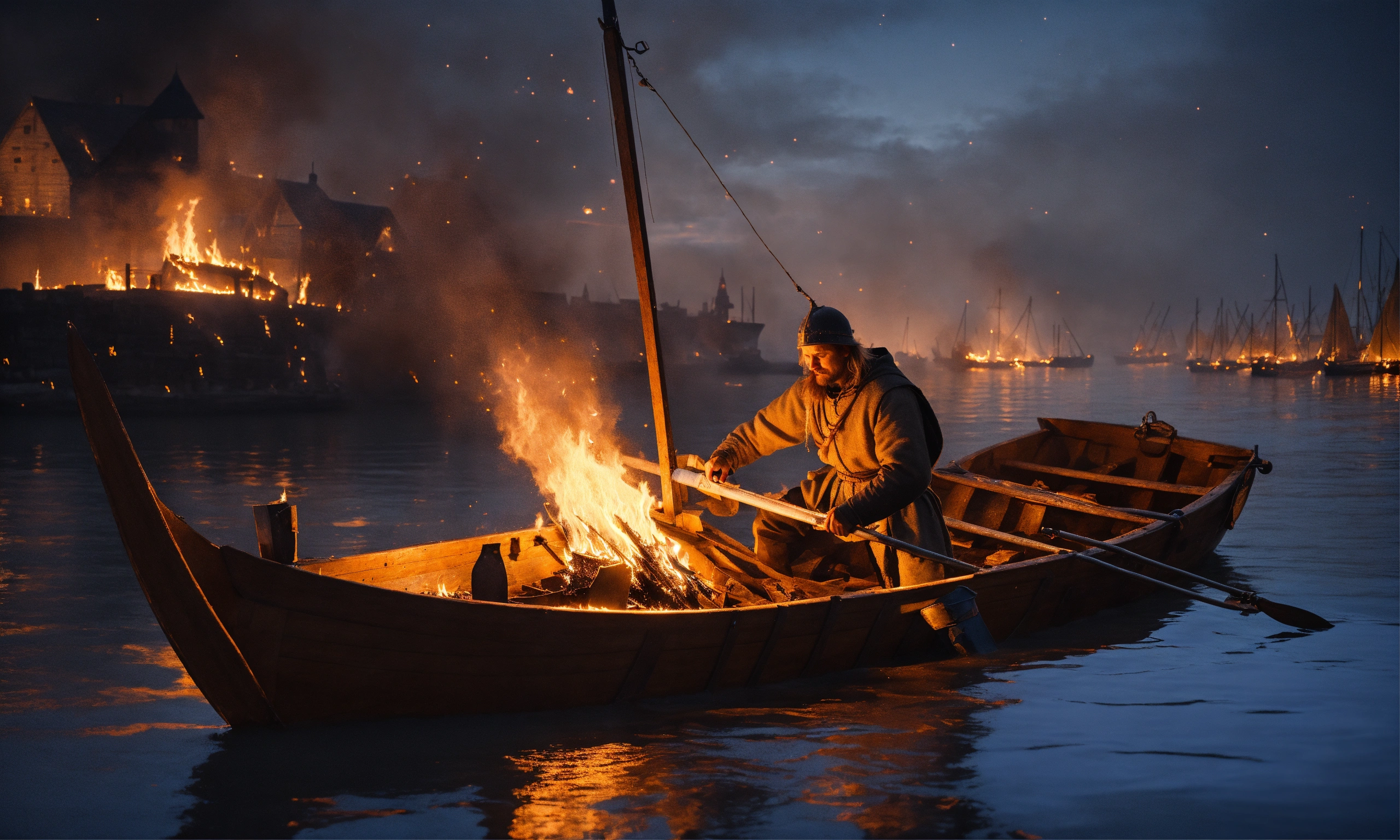 Scandinavian boat builder in medieval times during the night illuminated by fire