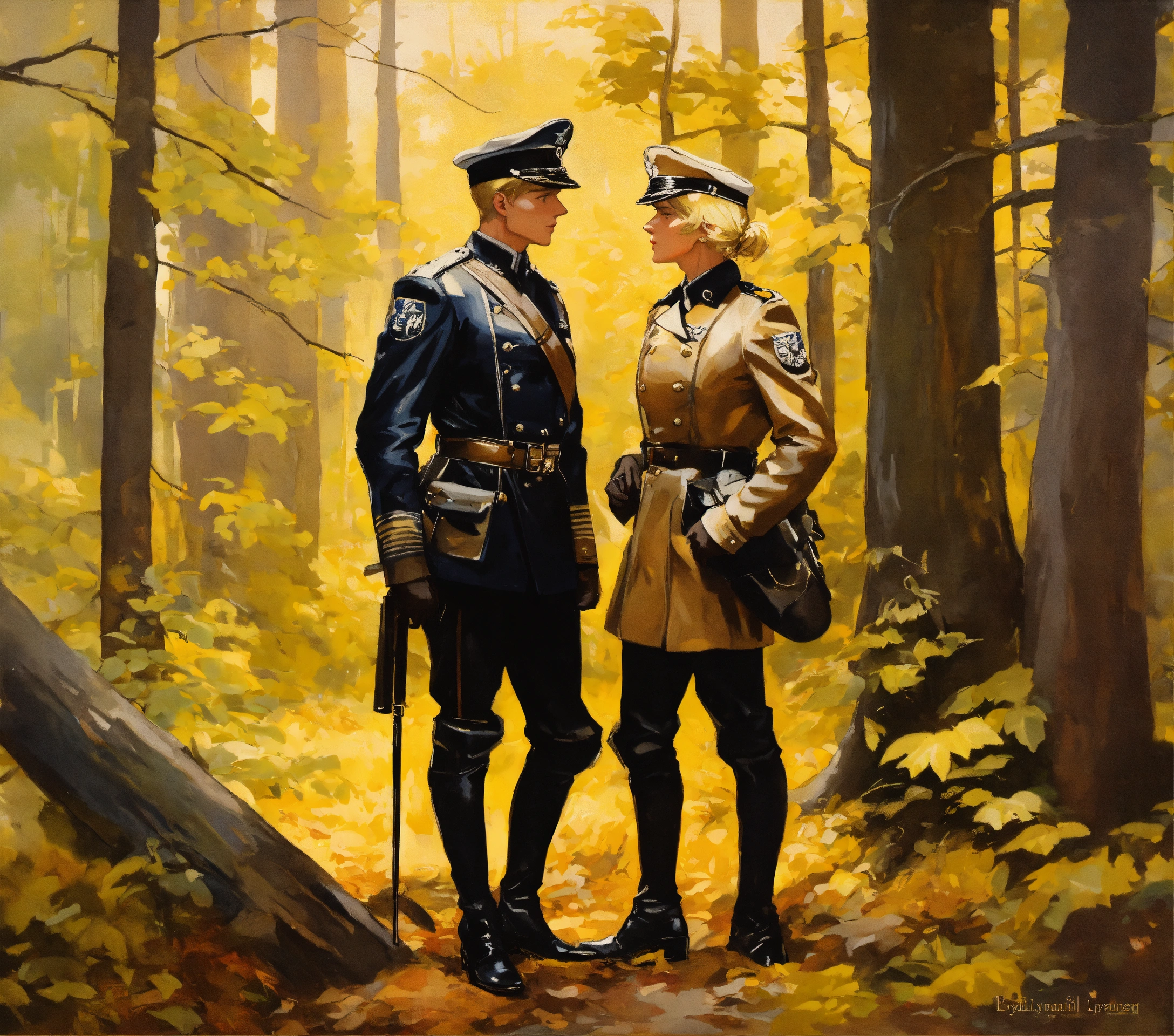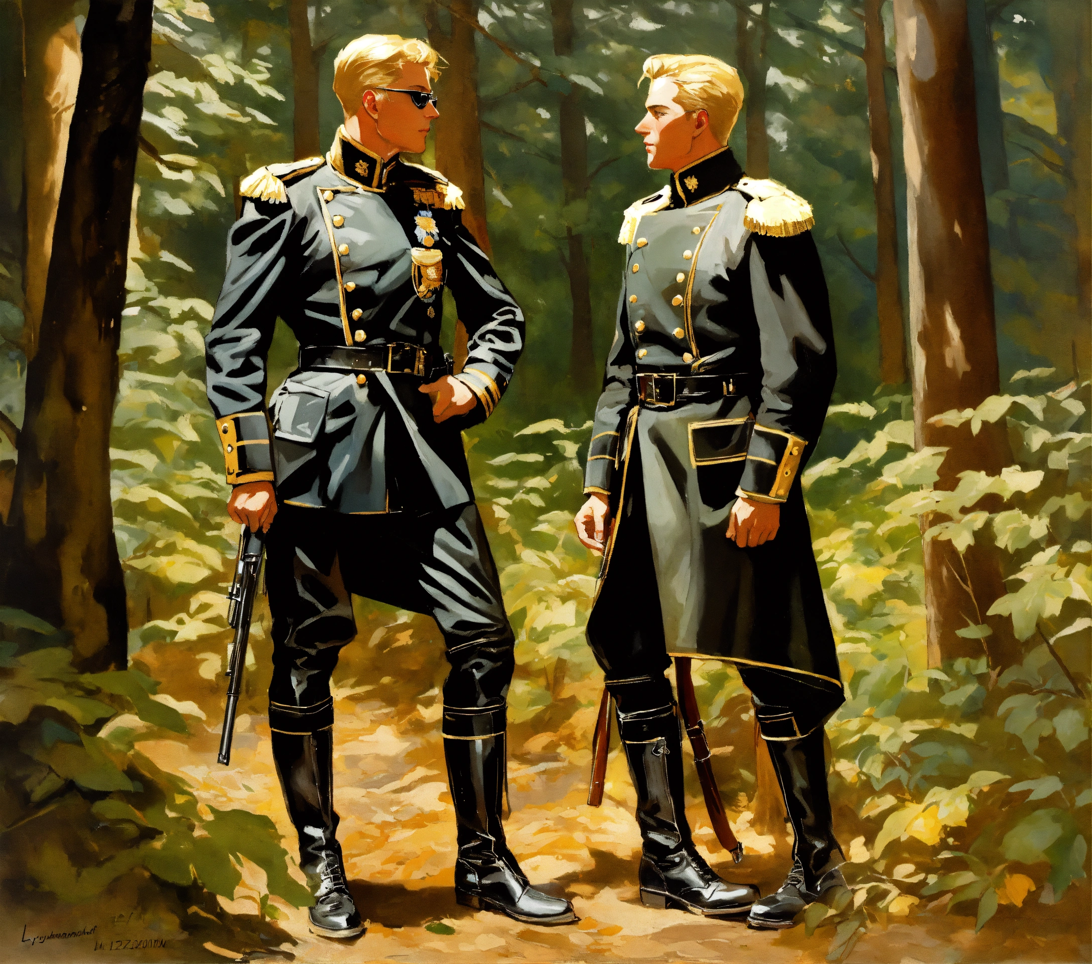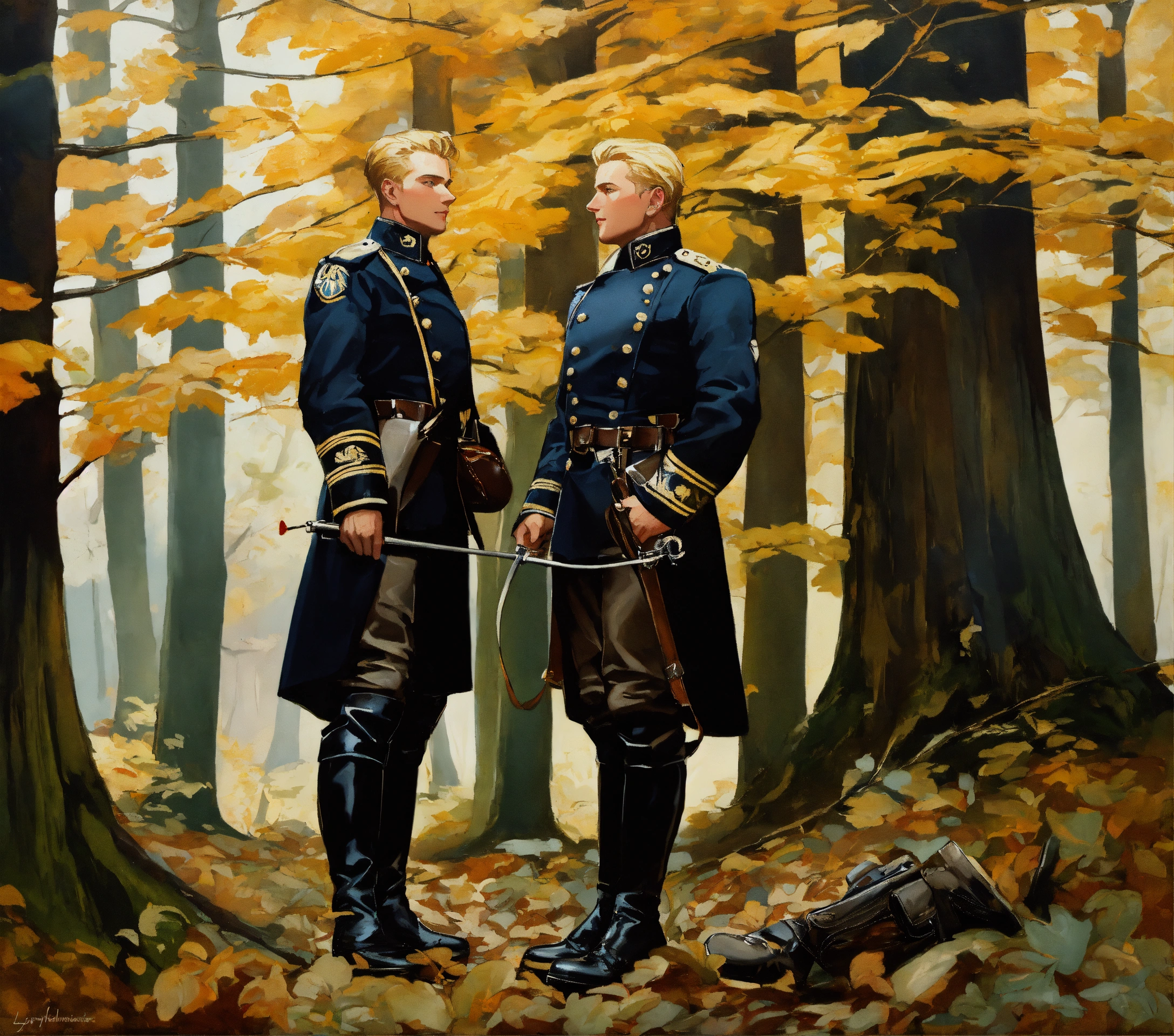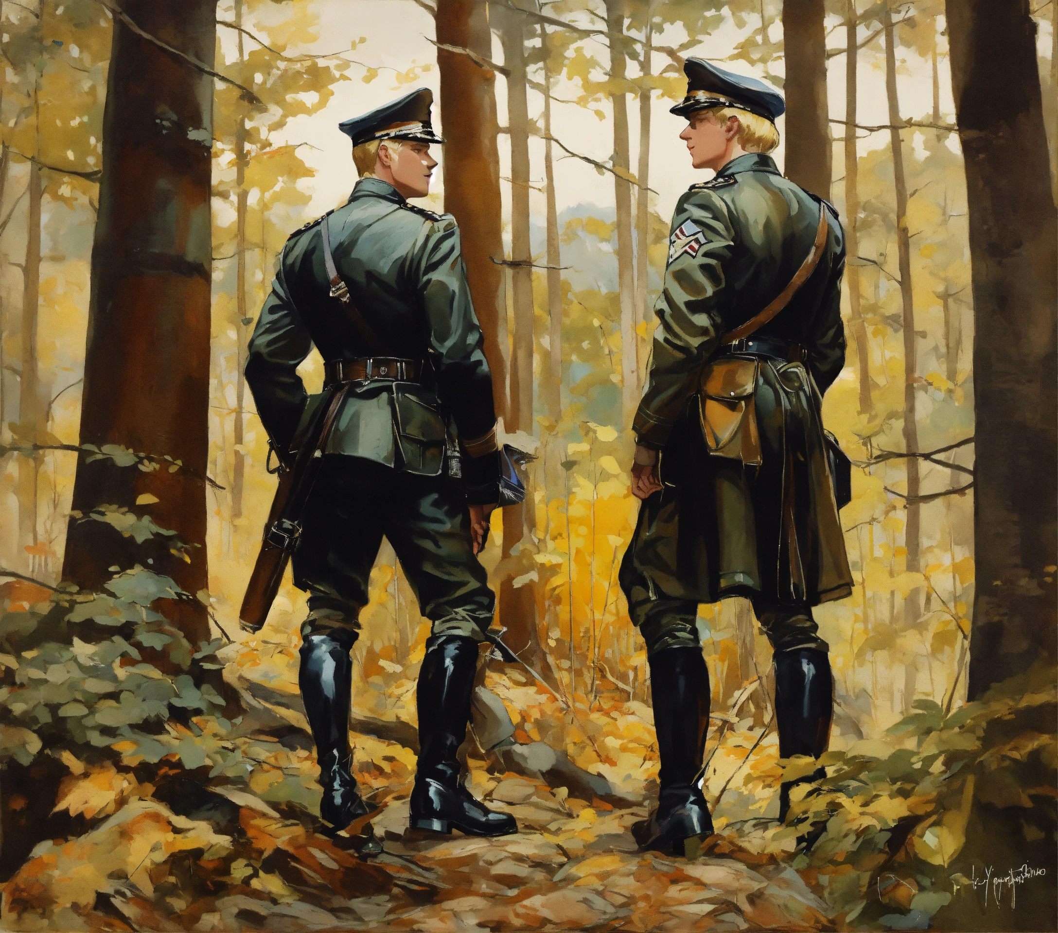 Two blonde german officers in leather jacket, leather boots, meeting in the forest, leyendecker style