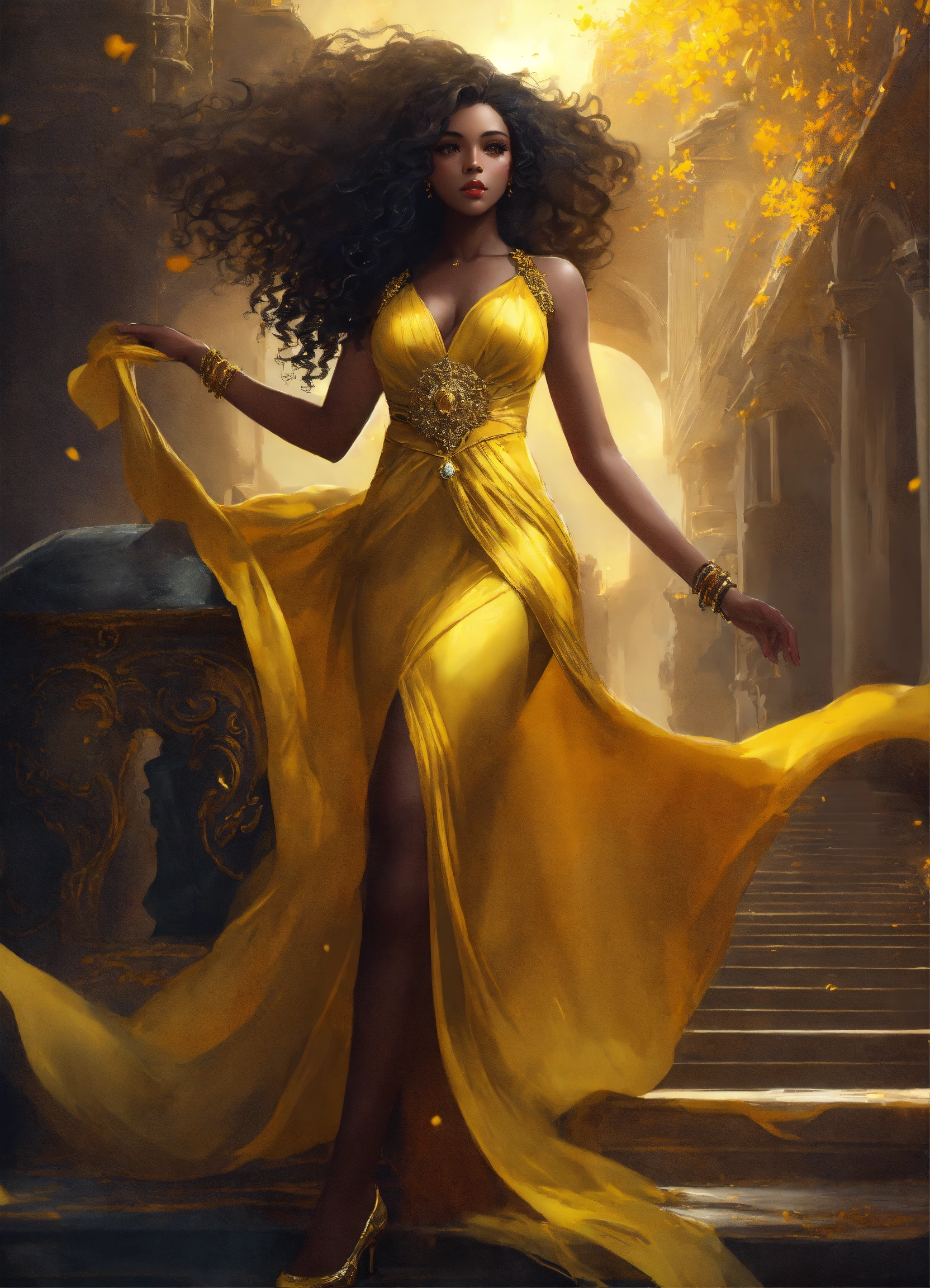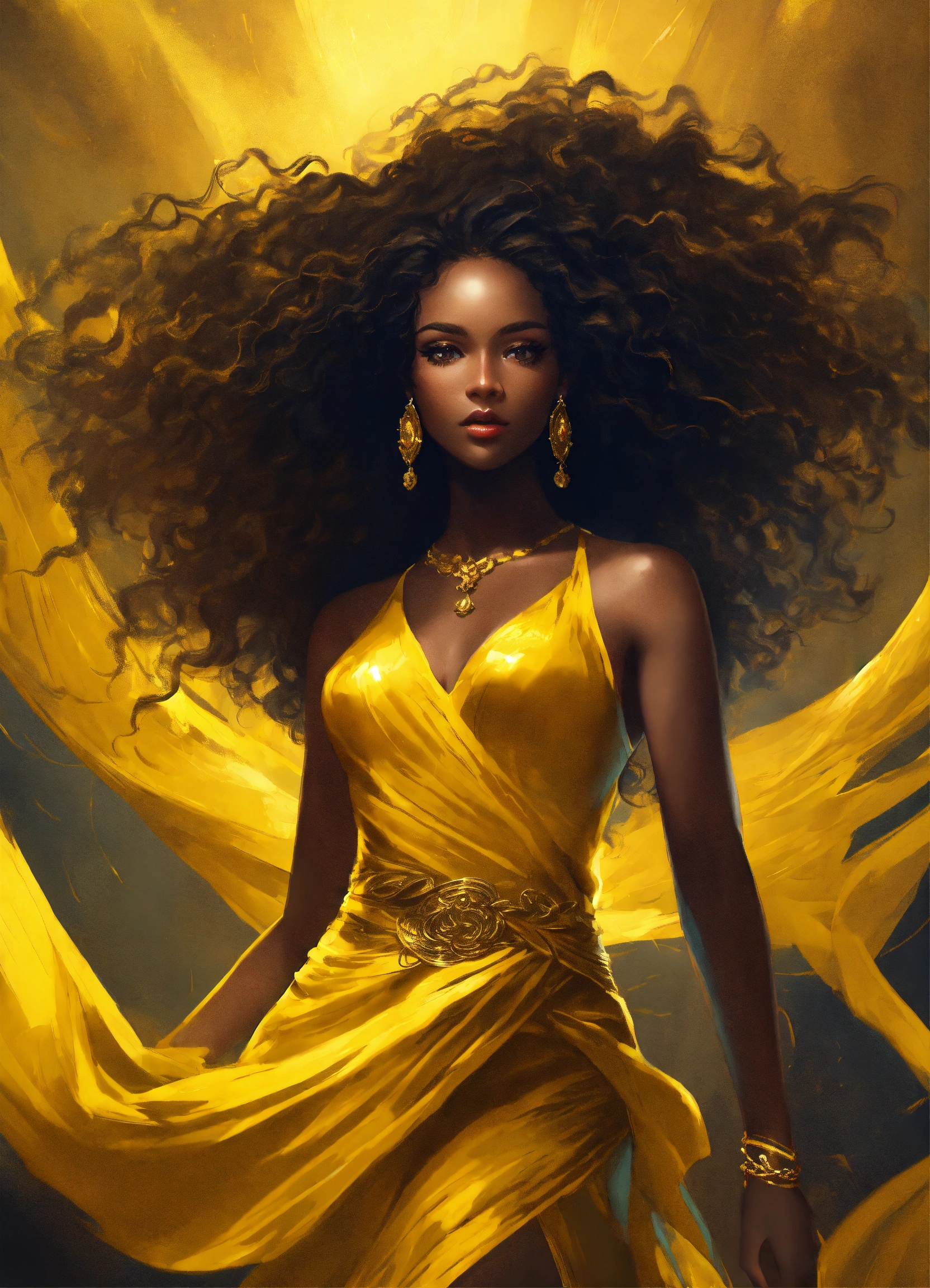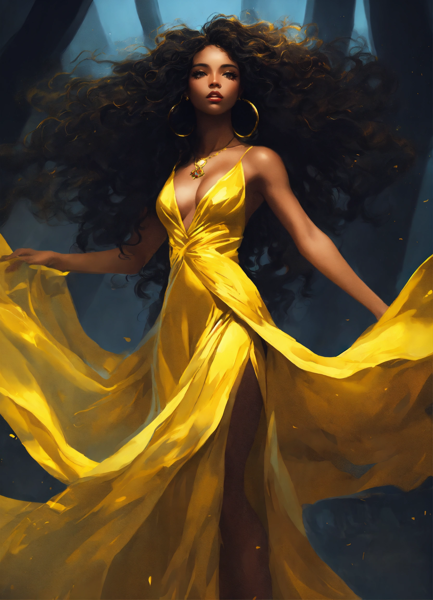Black goddess wearing flowing yellow dress, golden jewelry, digital painting, concept art, sharp focus, cinematic lighting, full body, highly detailed, digital art, curly flowing hair