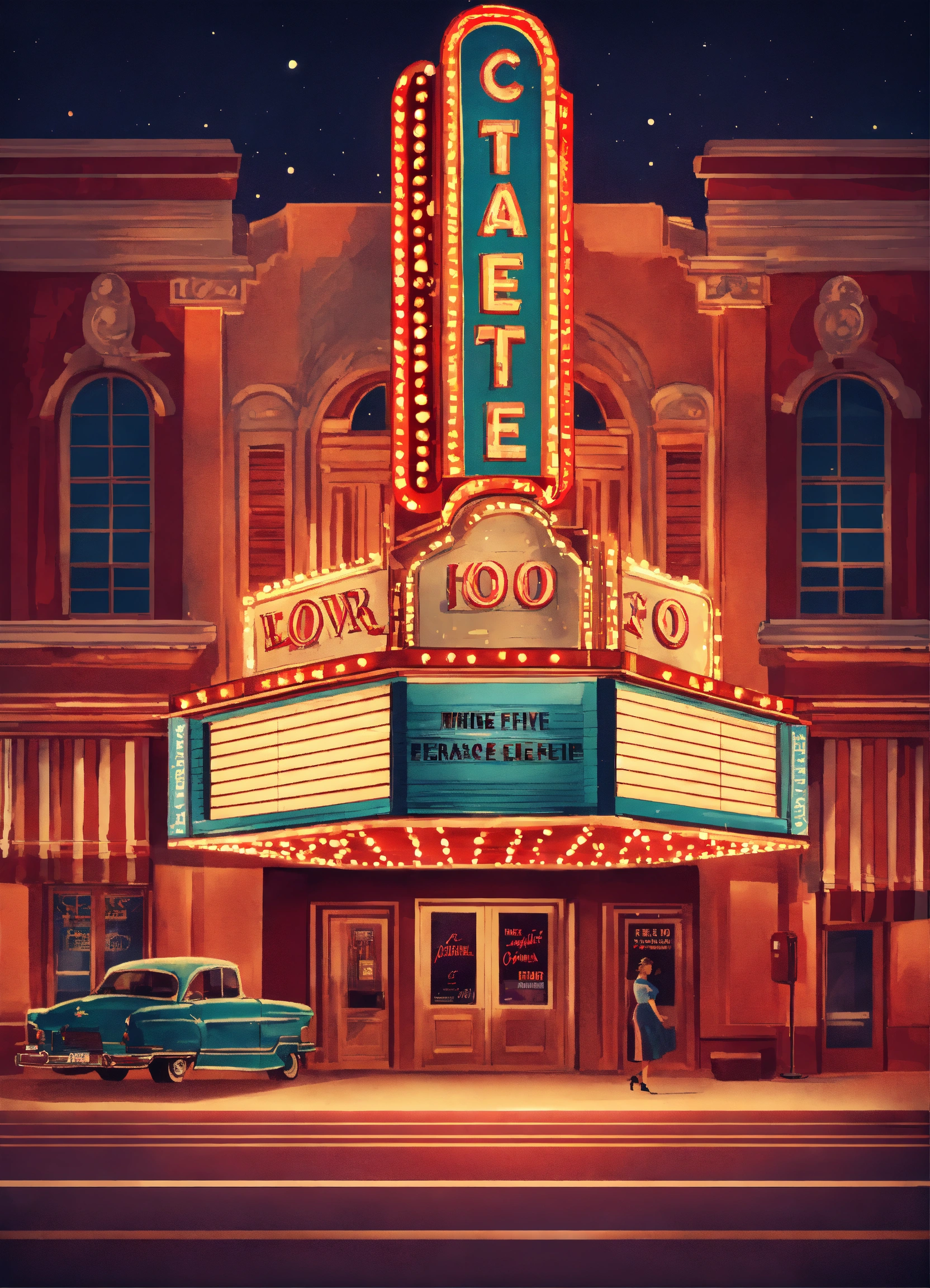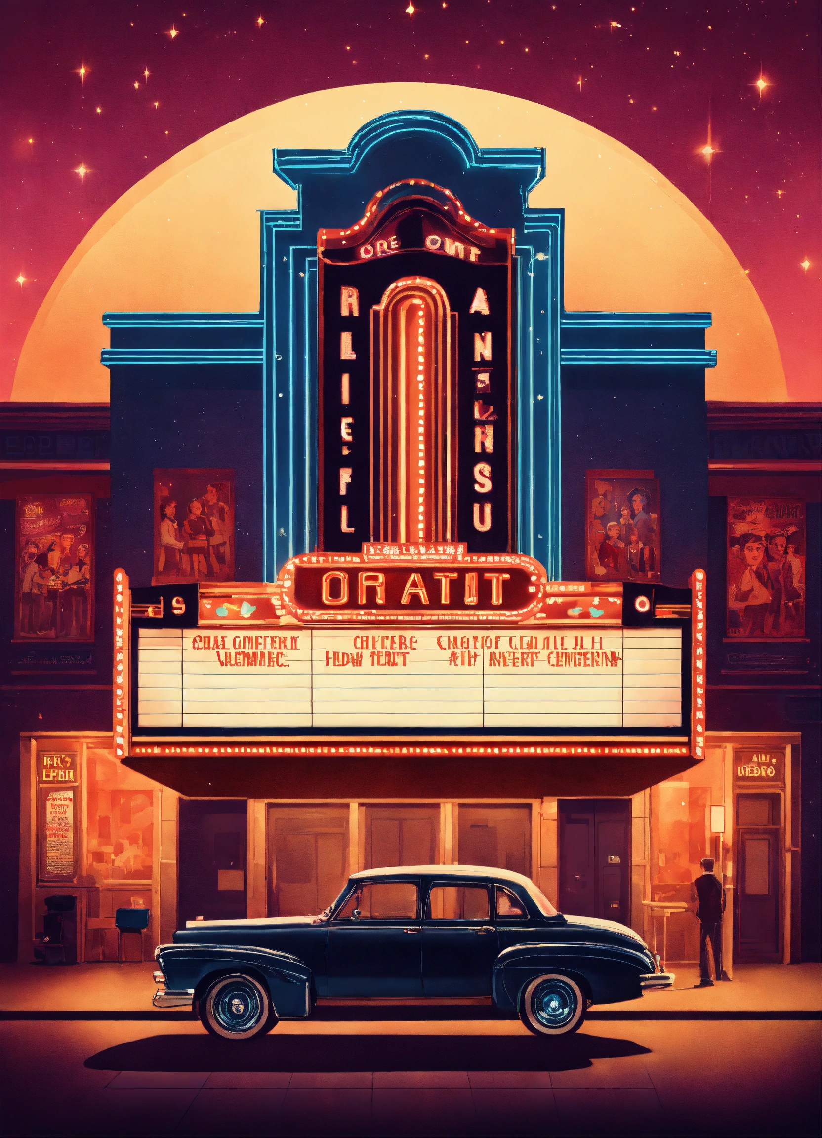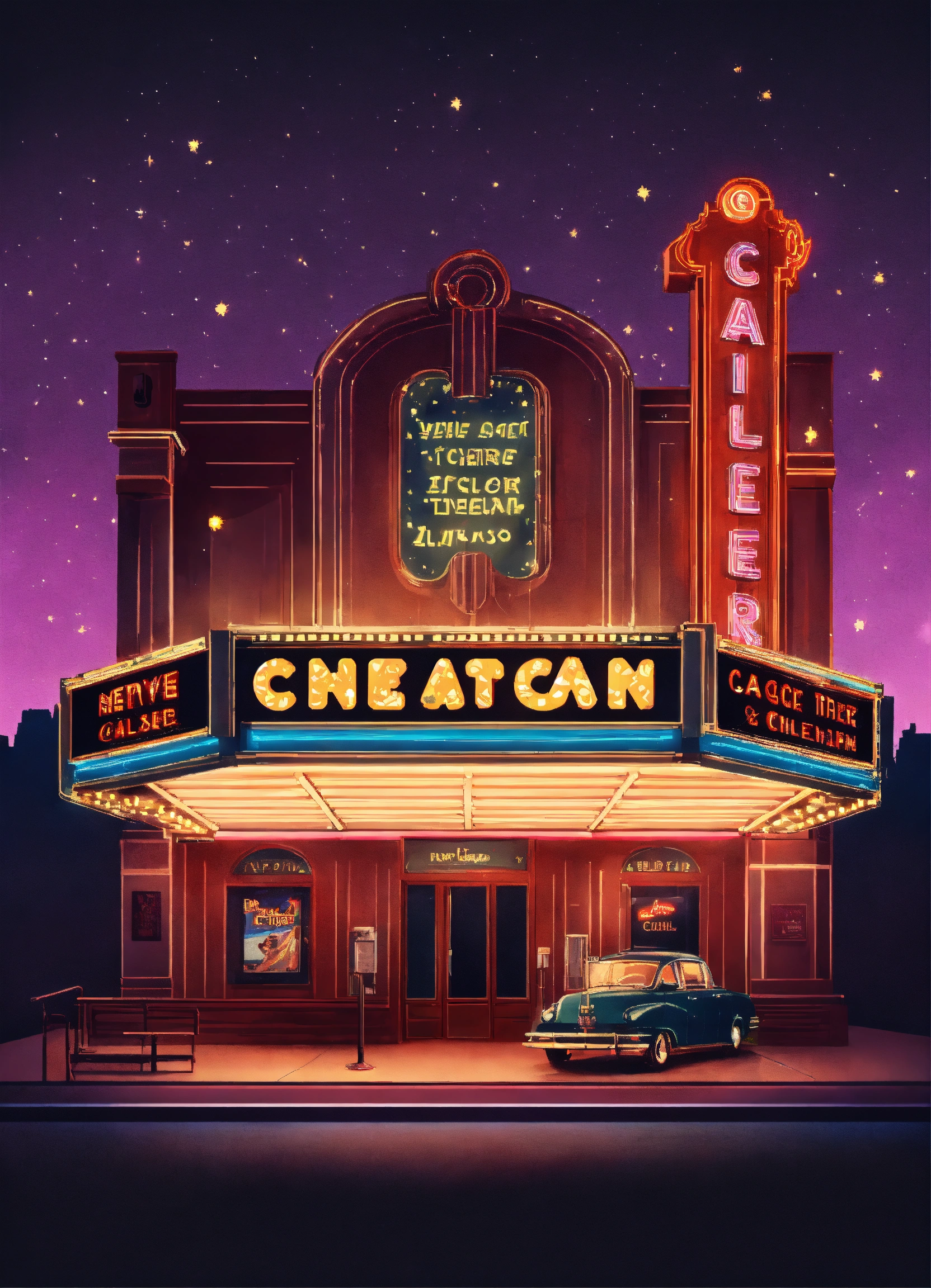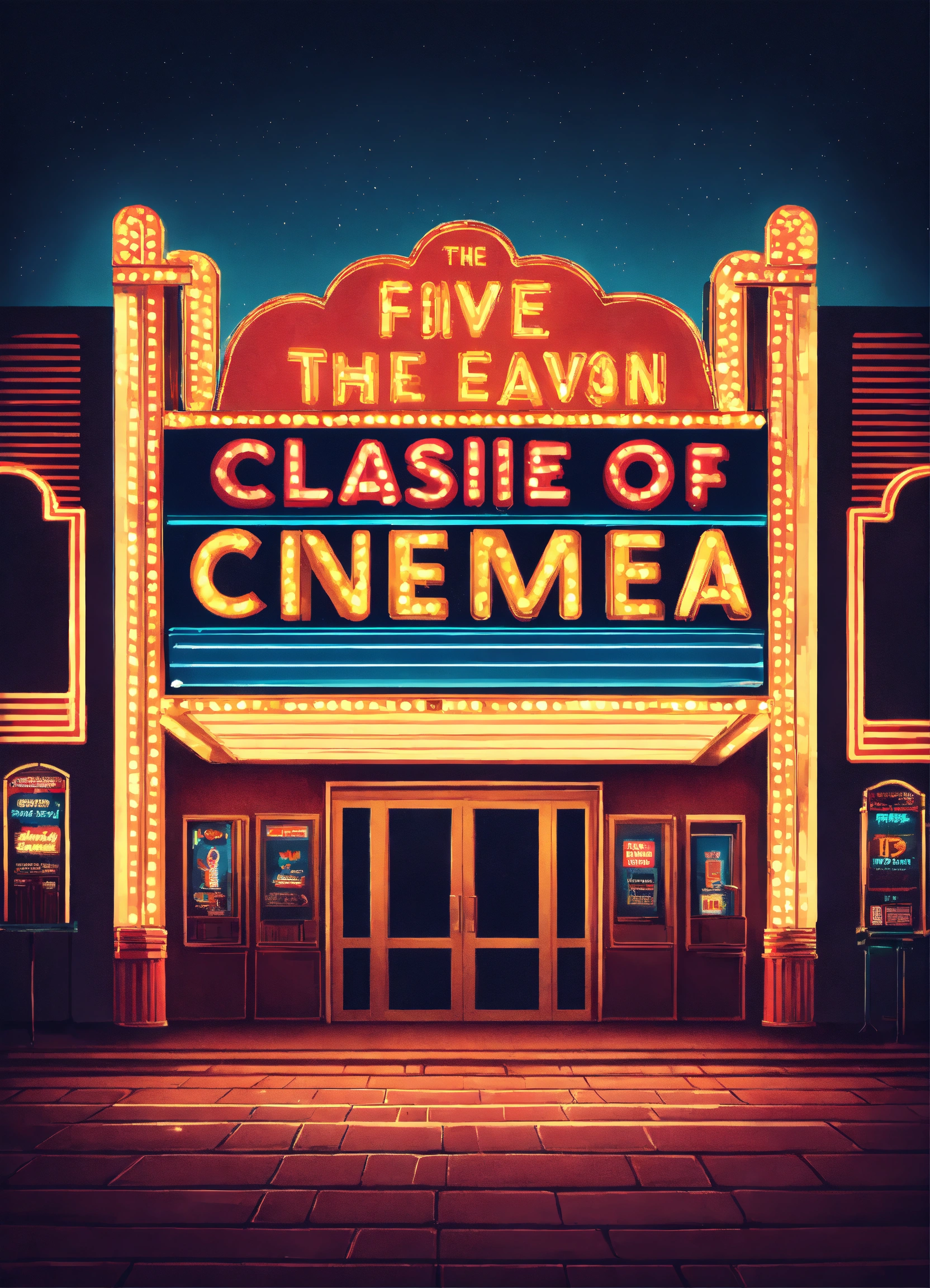 A retro-style movie theater with a marquee displaying classic films and neon lights illuminating the night nostalgic cinema vintage entertainment illustration