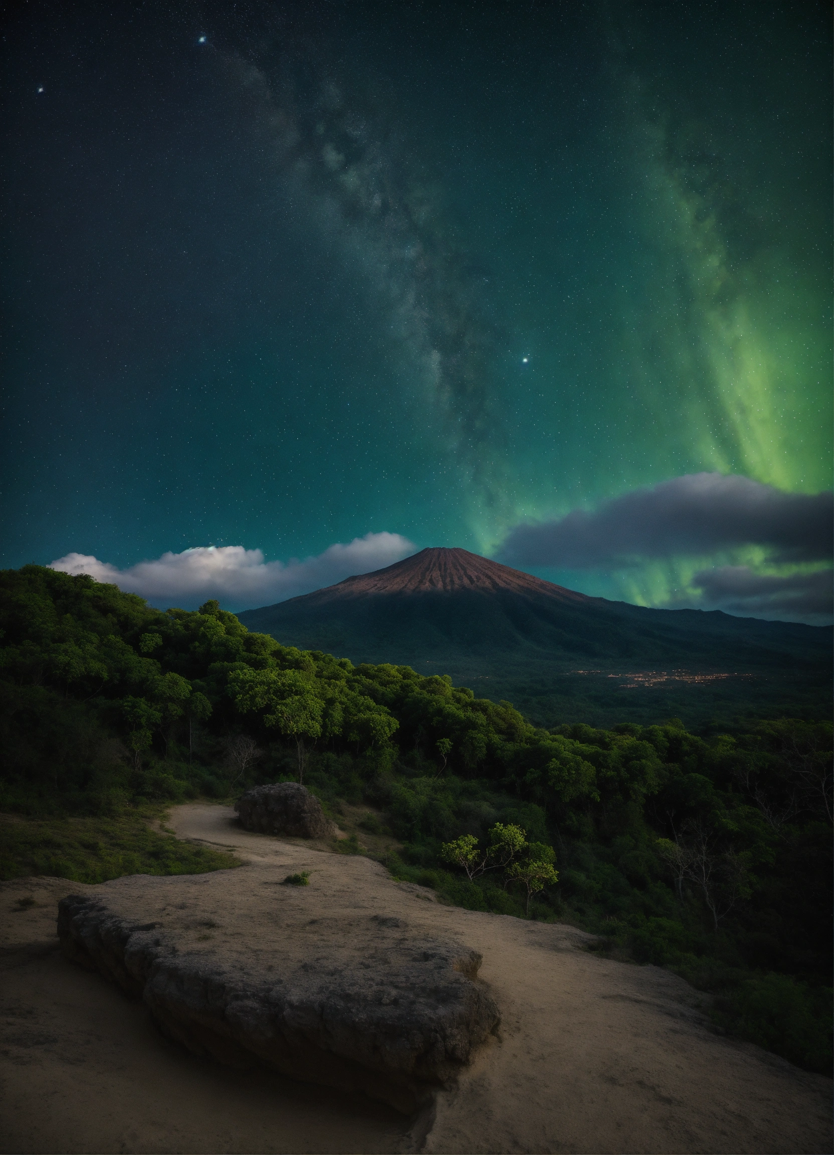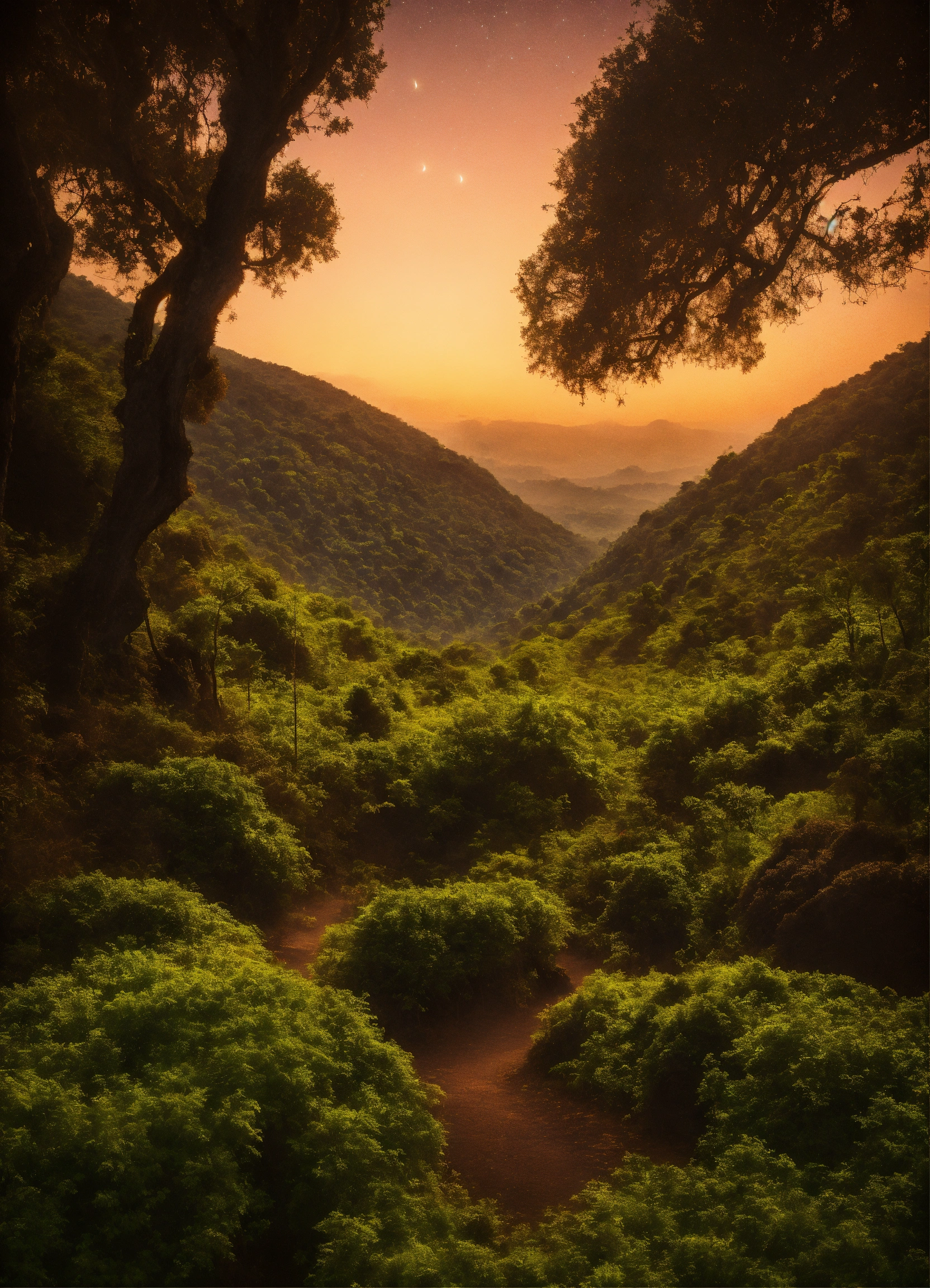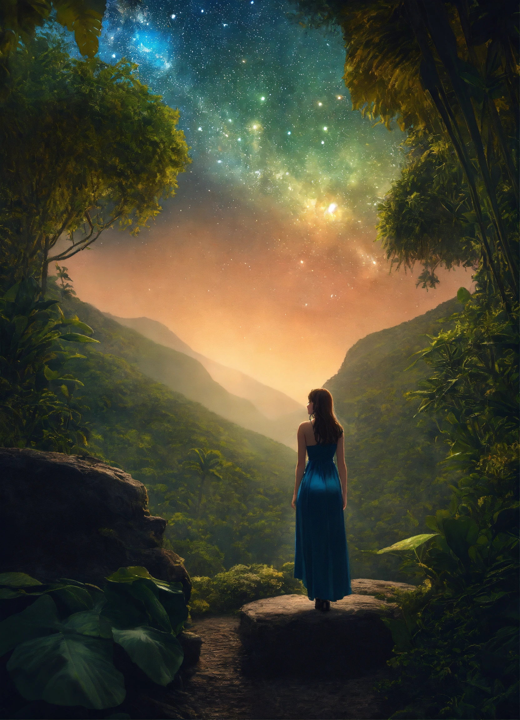 Portrait photo de face ultra réaliste de film d'animation au plan moyen d'une exploratrice astrologue de 25 ans de, qui se sert d'un télescope qu'elle tiens avec ça main, elle est séduisante, sensuelle et audacieuse, une silhouette fine en x, un tour de poitrine 85 d en forme de volcan, elle habillée d'une tunique vert kaki au décolleté plongeant fendue, elle porte un collier avec une pierre bleue, ses cheveux sont châtain foncée et un peu ondulée, elle est dans une jungle tropicale entourée de beaucoup de végétations; la scène se déroule au milieu de la nuit le ciel sombre et très étoilé, avec des constellations.