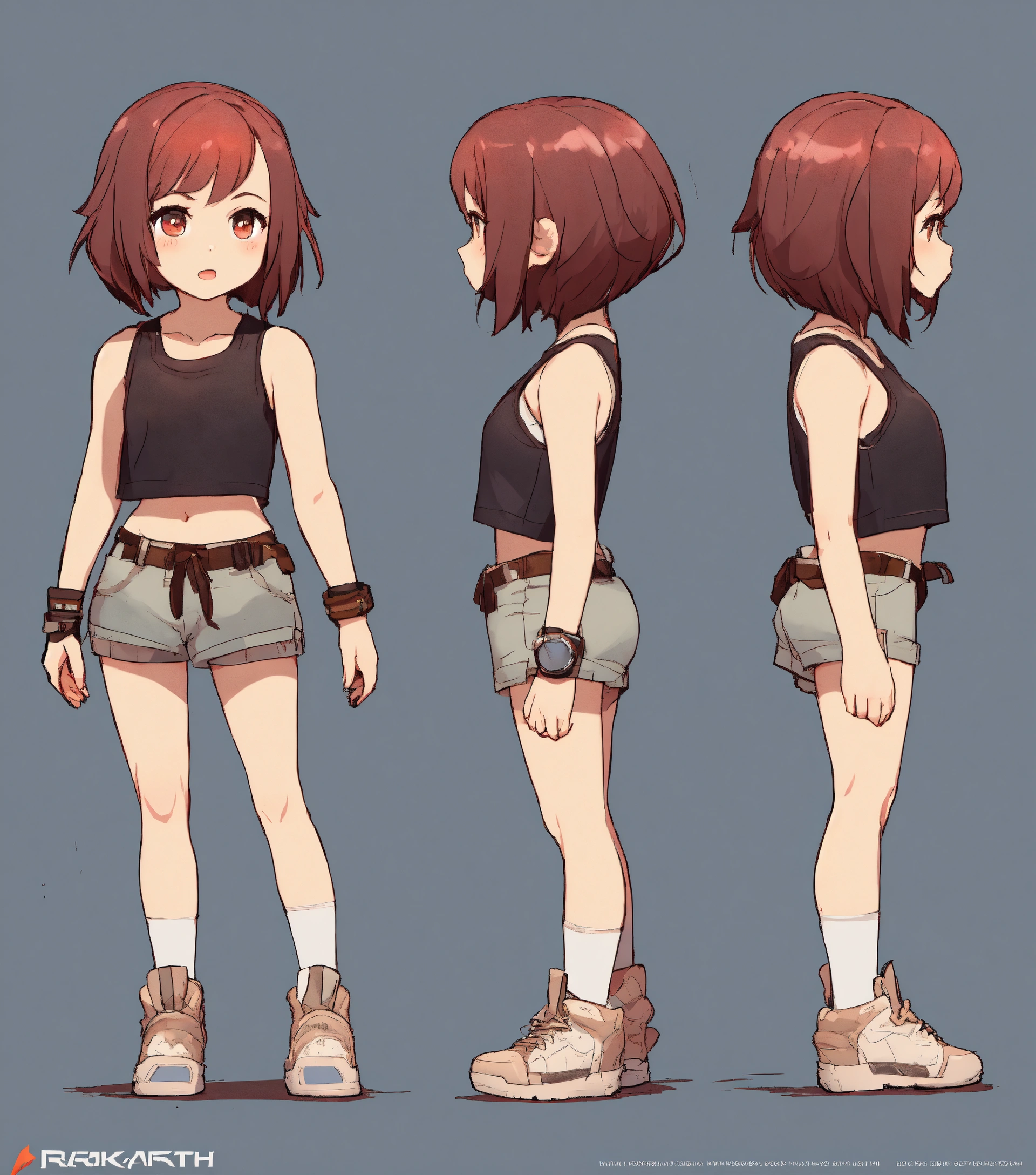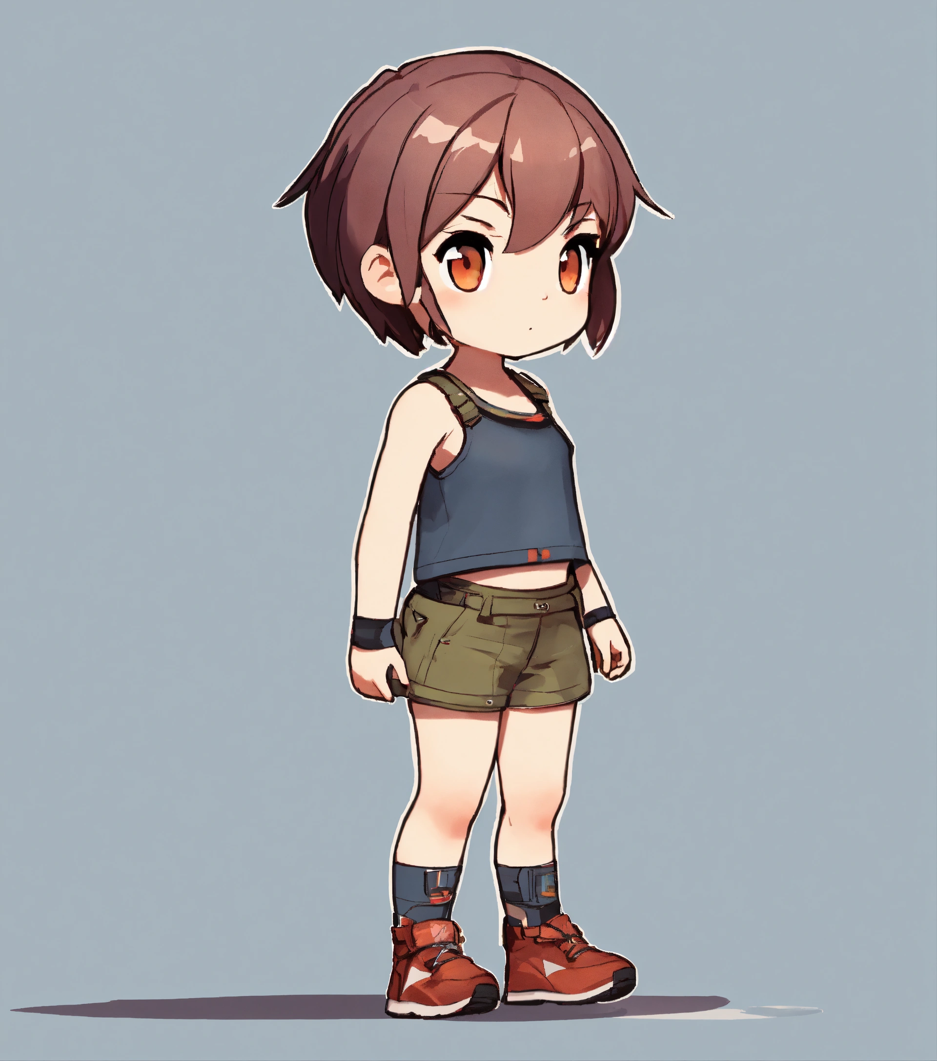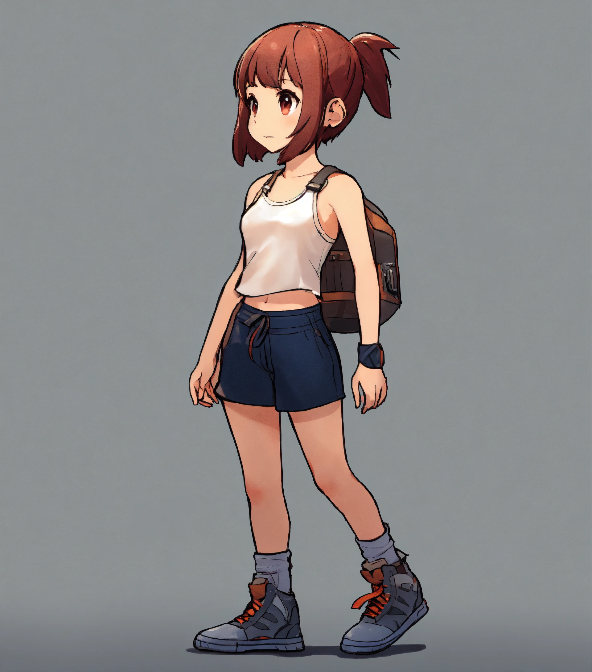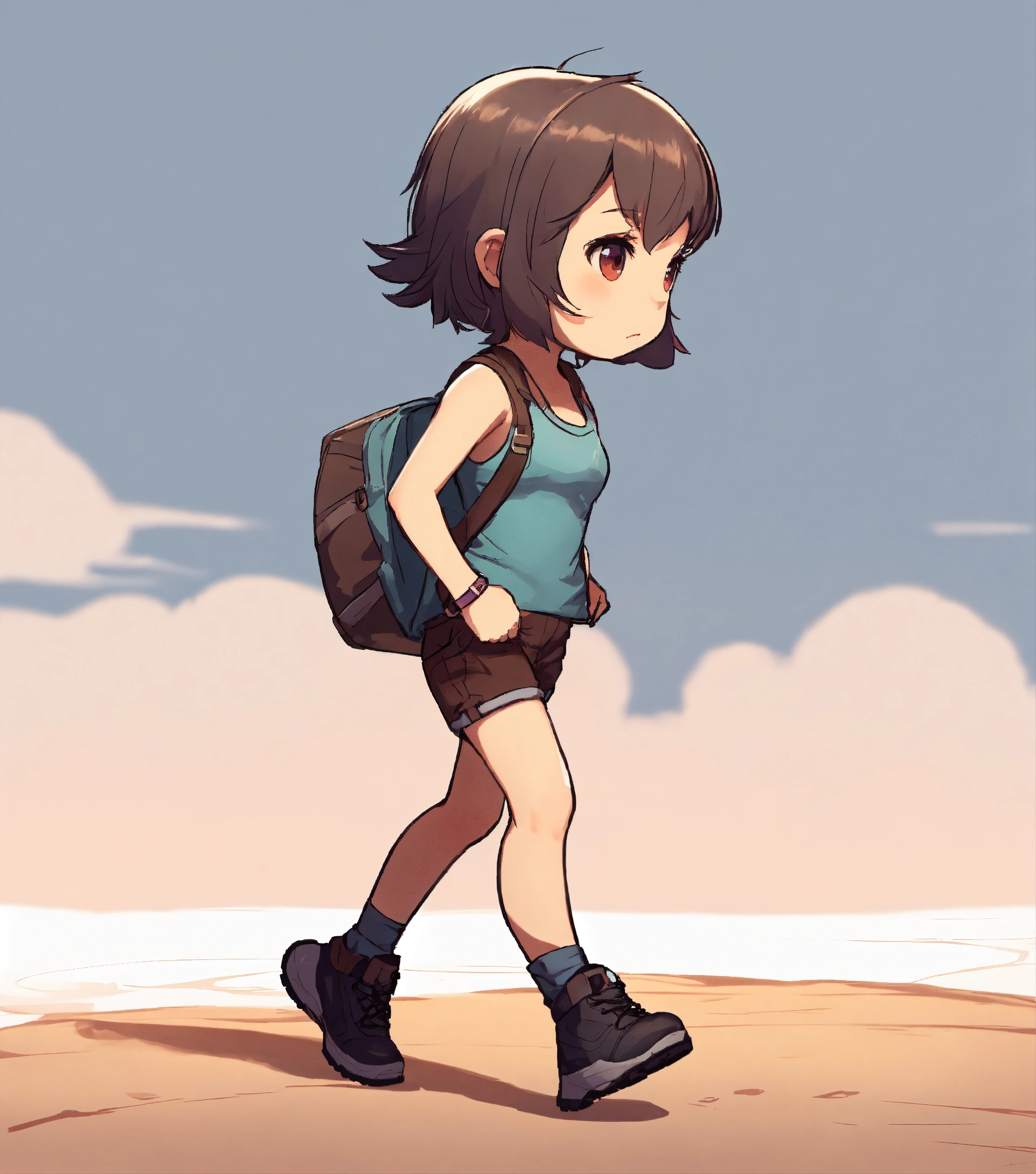 Short haired girl wearing tank top and shorts, walking, game art, full body view, side view, chibi proportions, blank background, artstyle from the game ragnarok