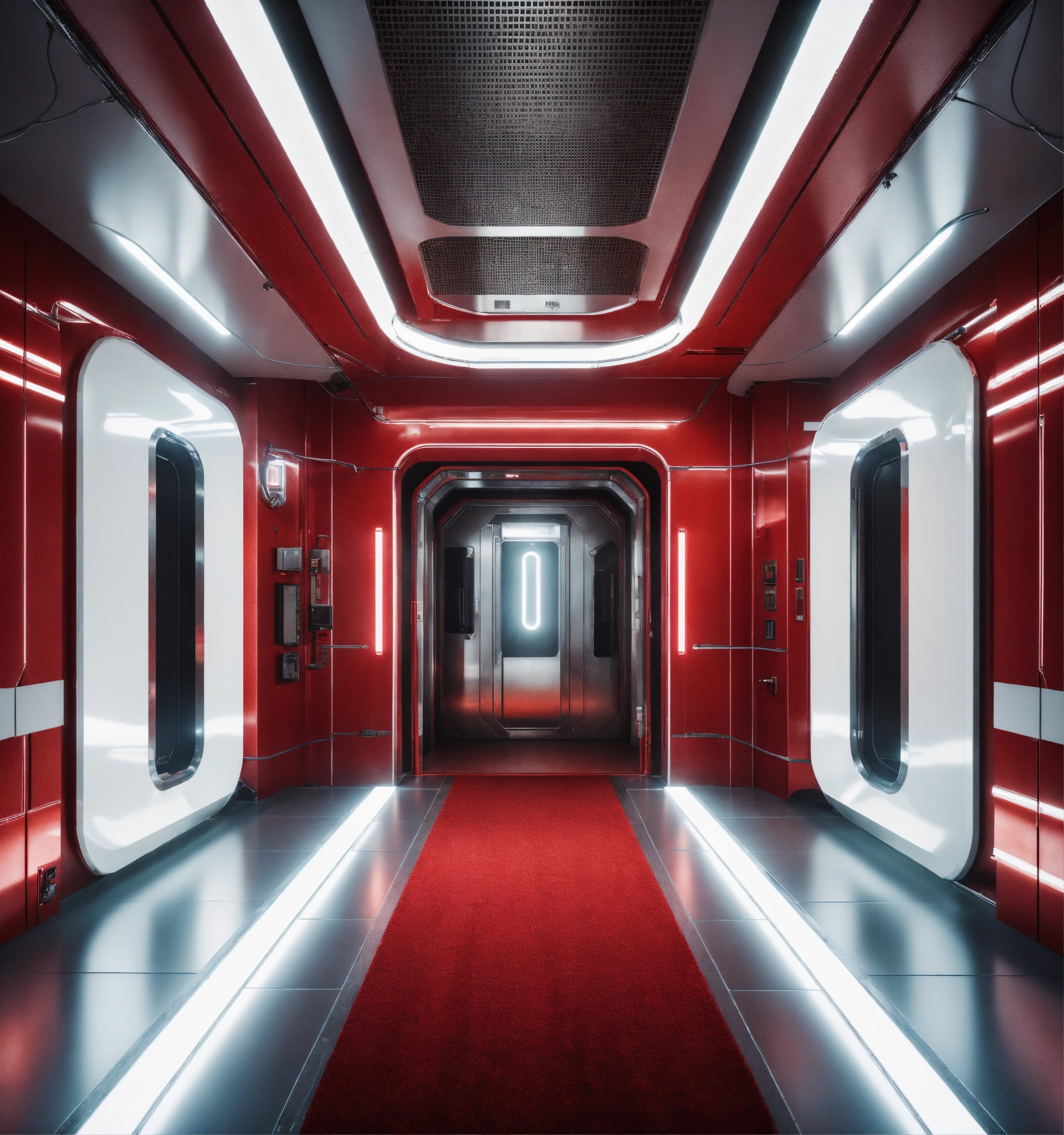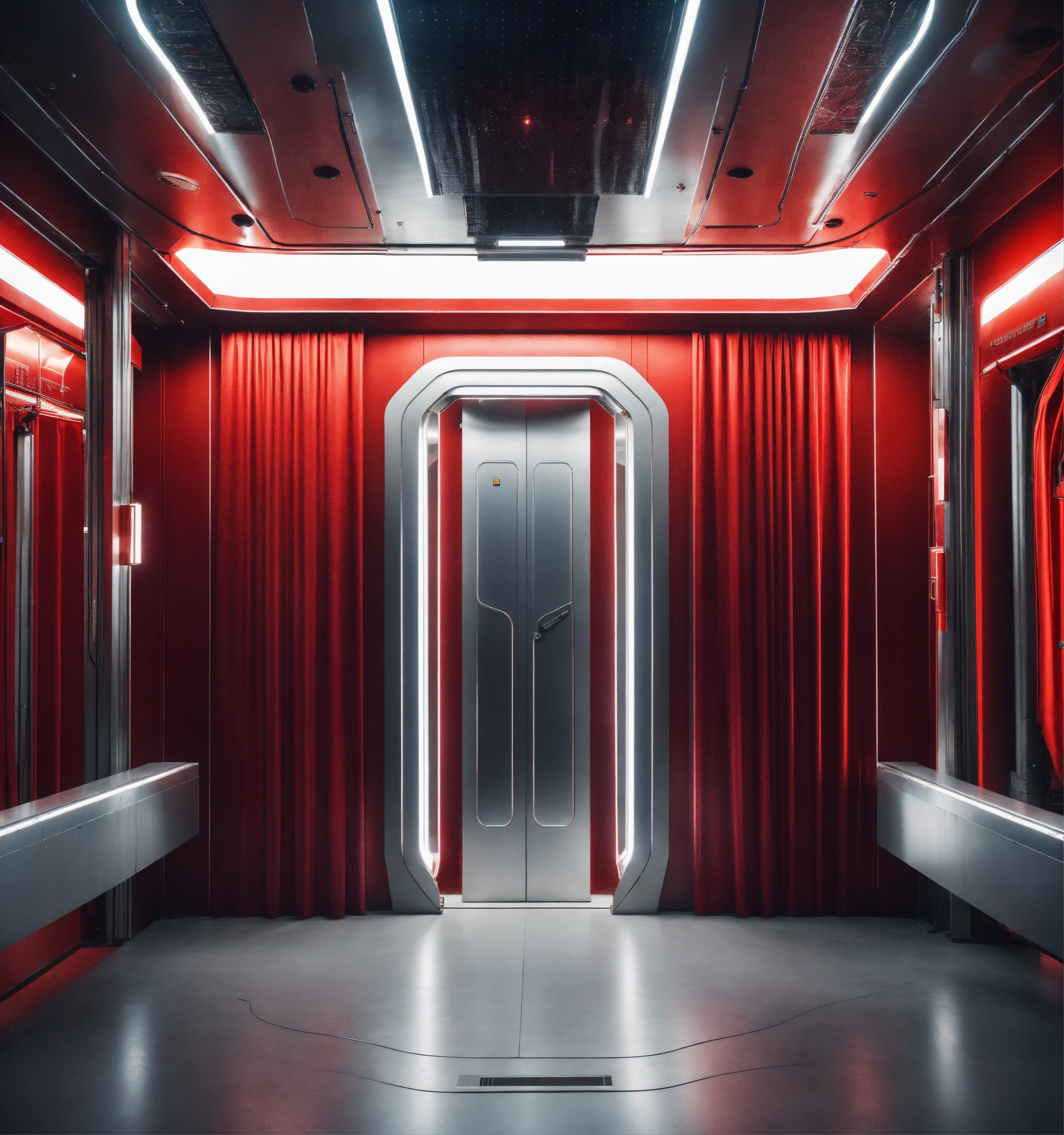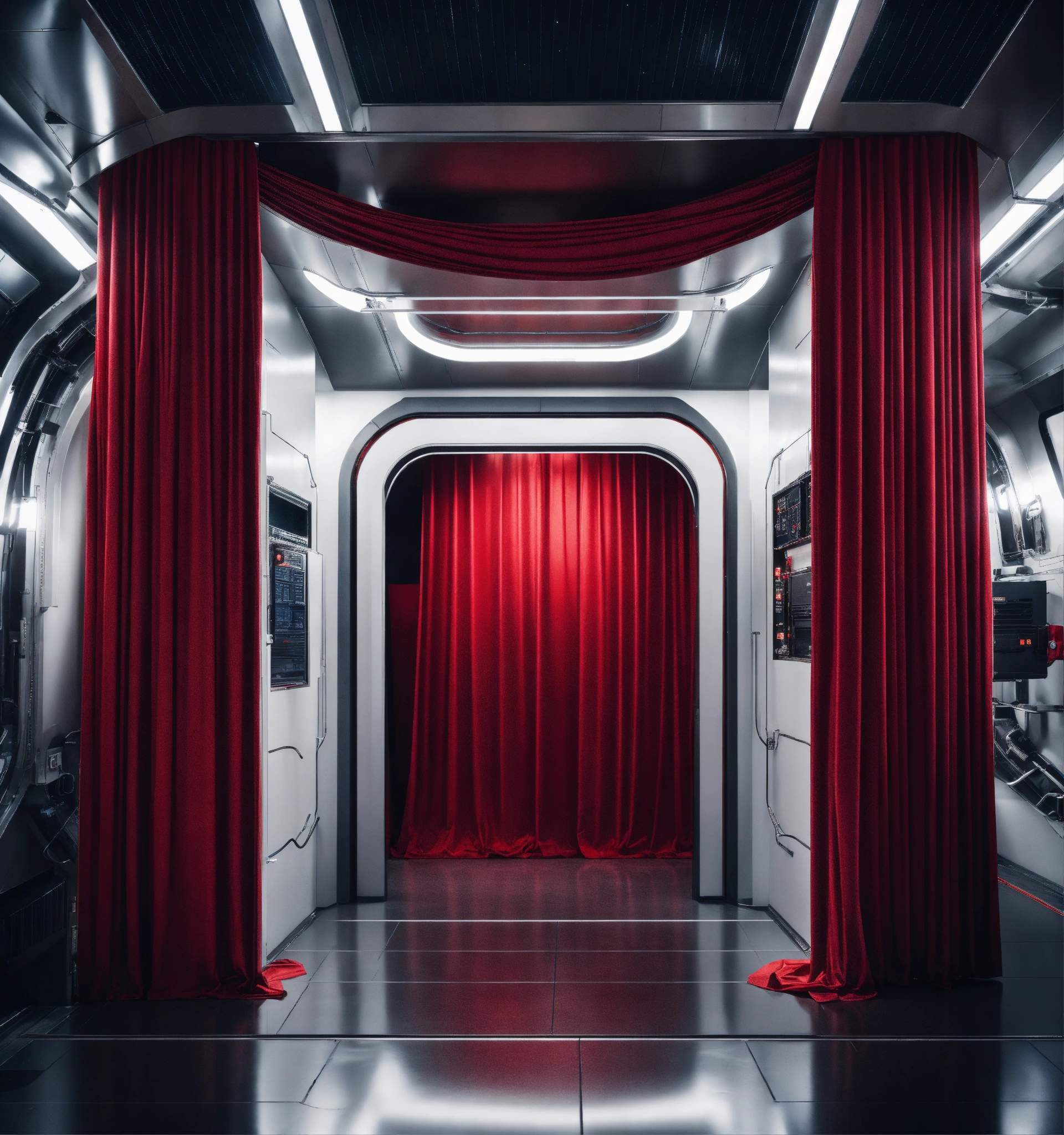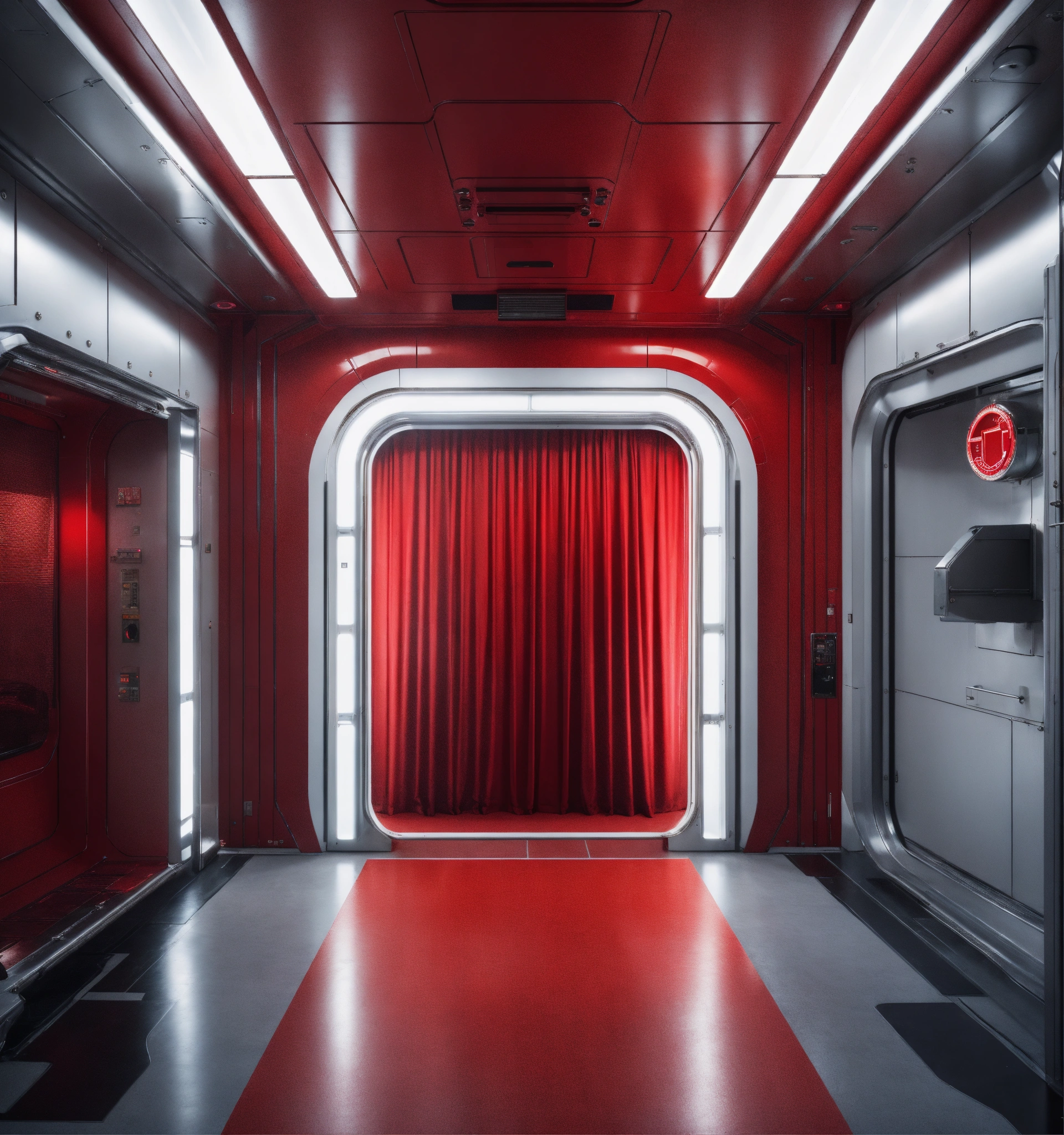 An ultra-realistic photo of the entrance of a futuristic, sci-fi theater, inside a space station, with red steel curtains and white metal walls, sleek, modern style, 8k