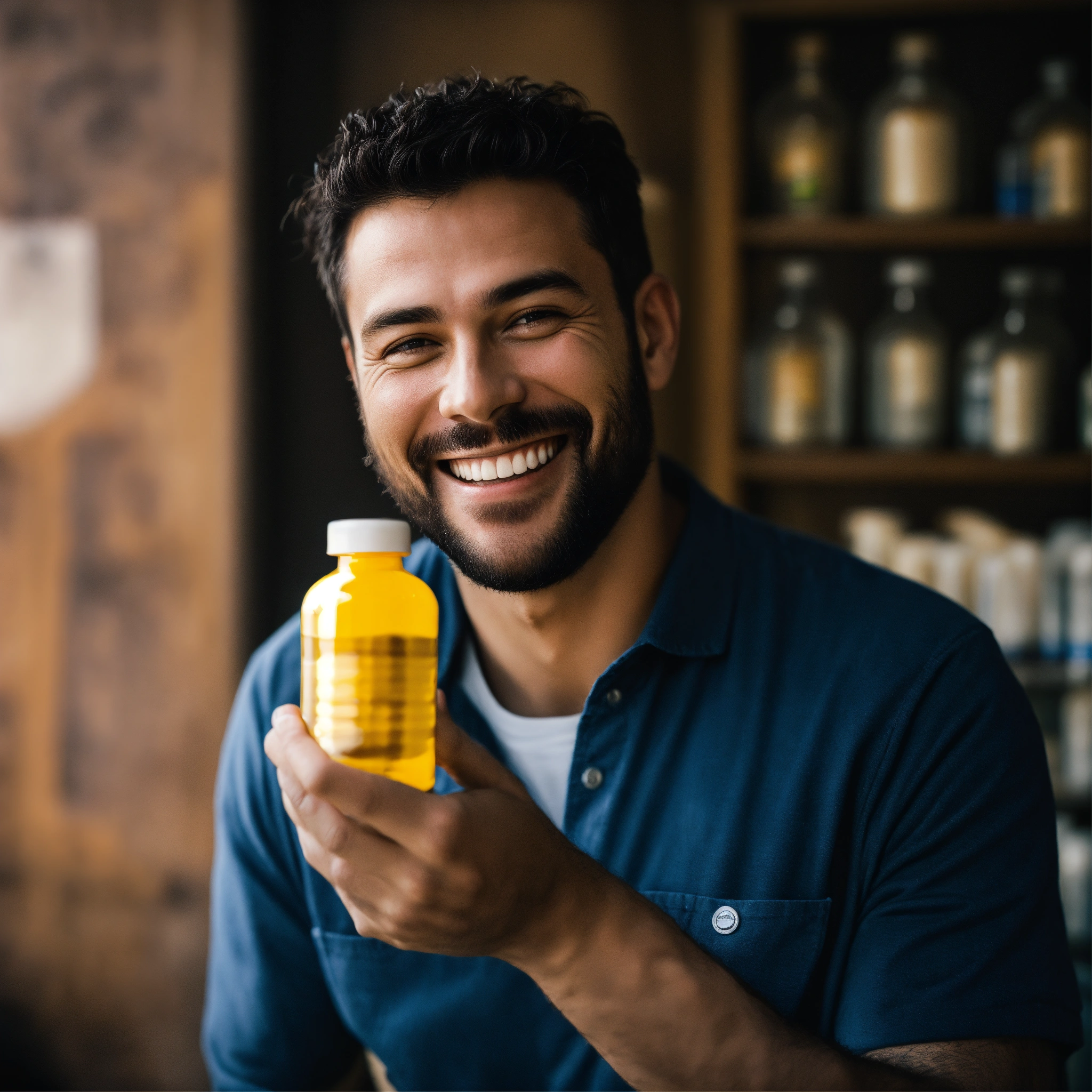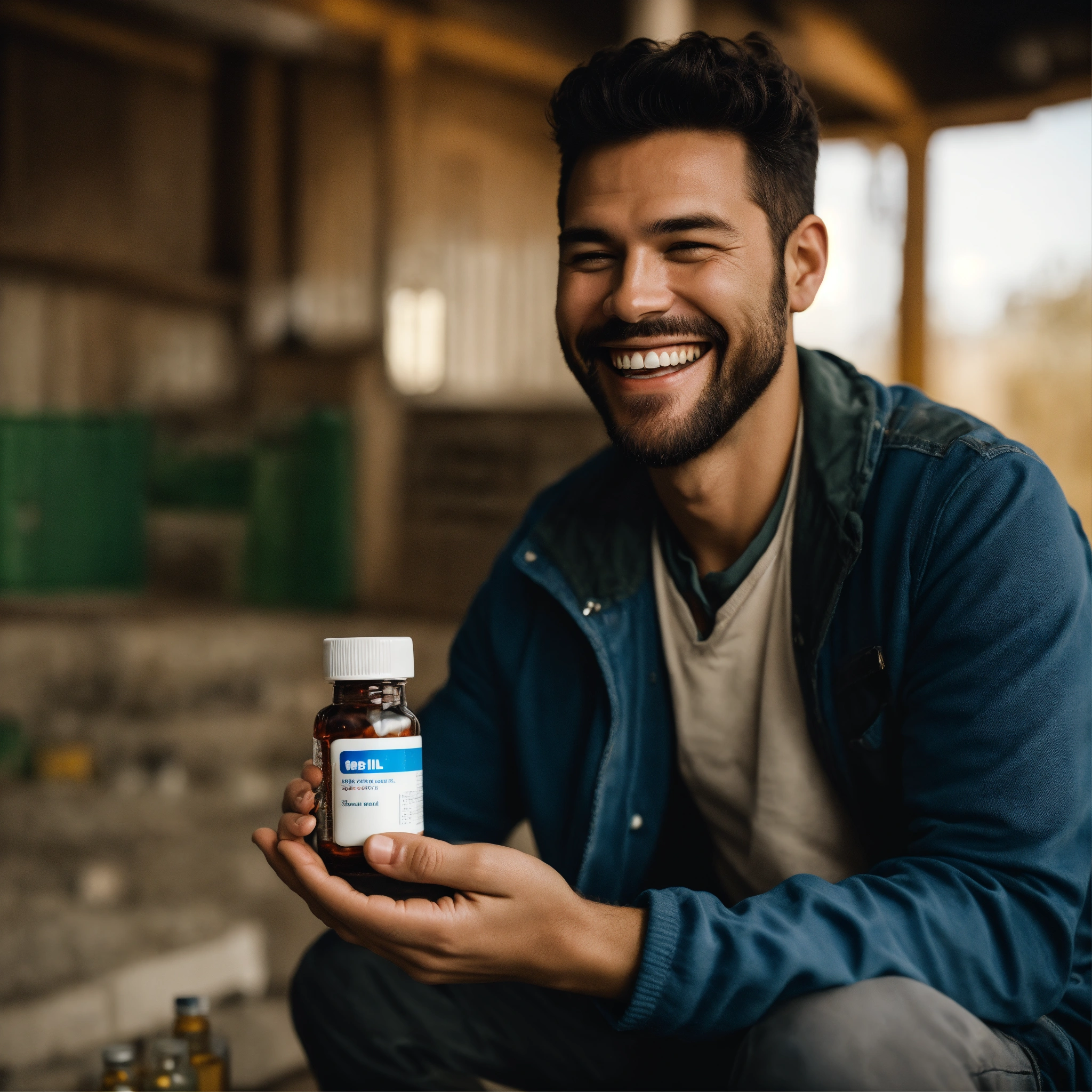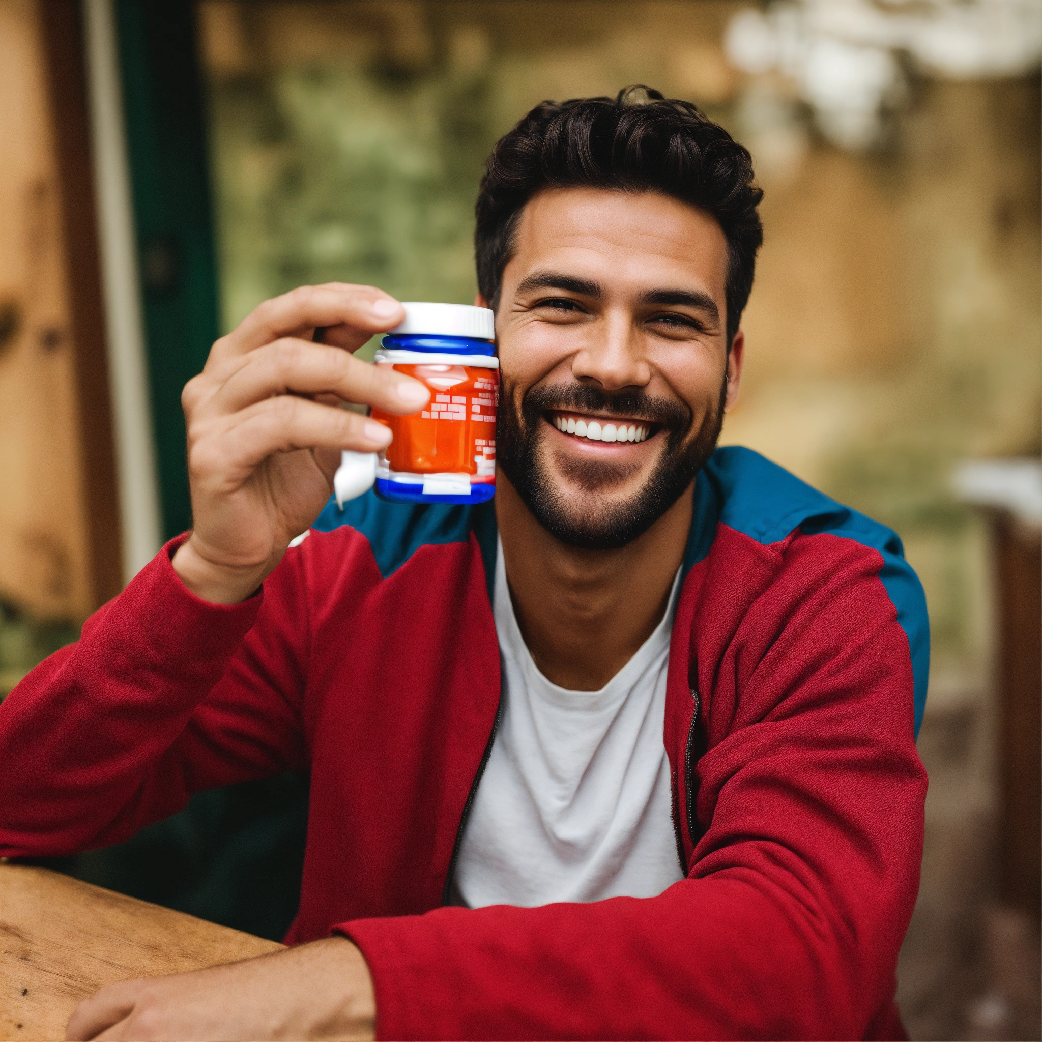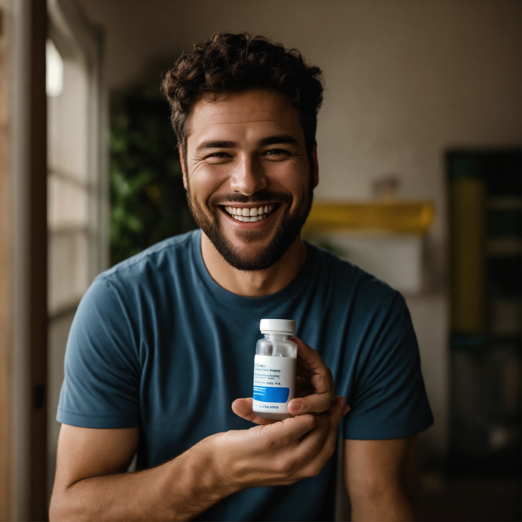 A photo of a man holding a pill bottle