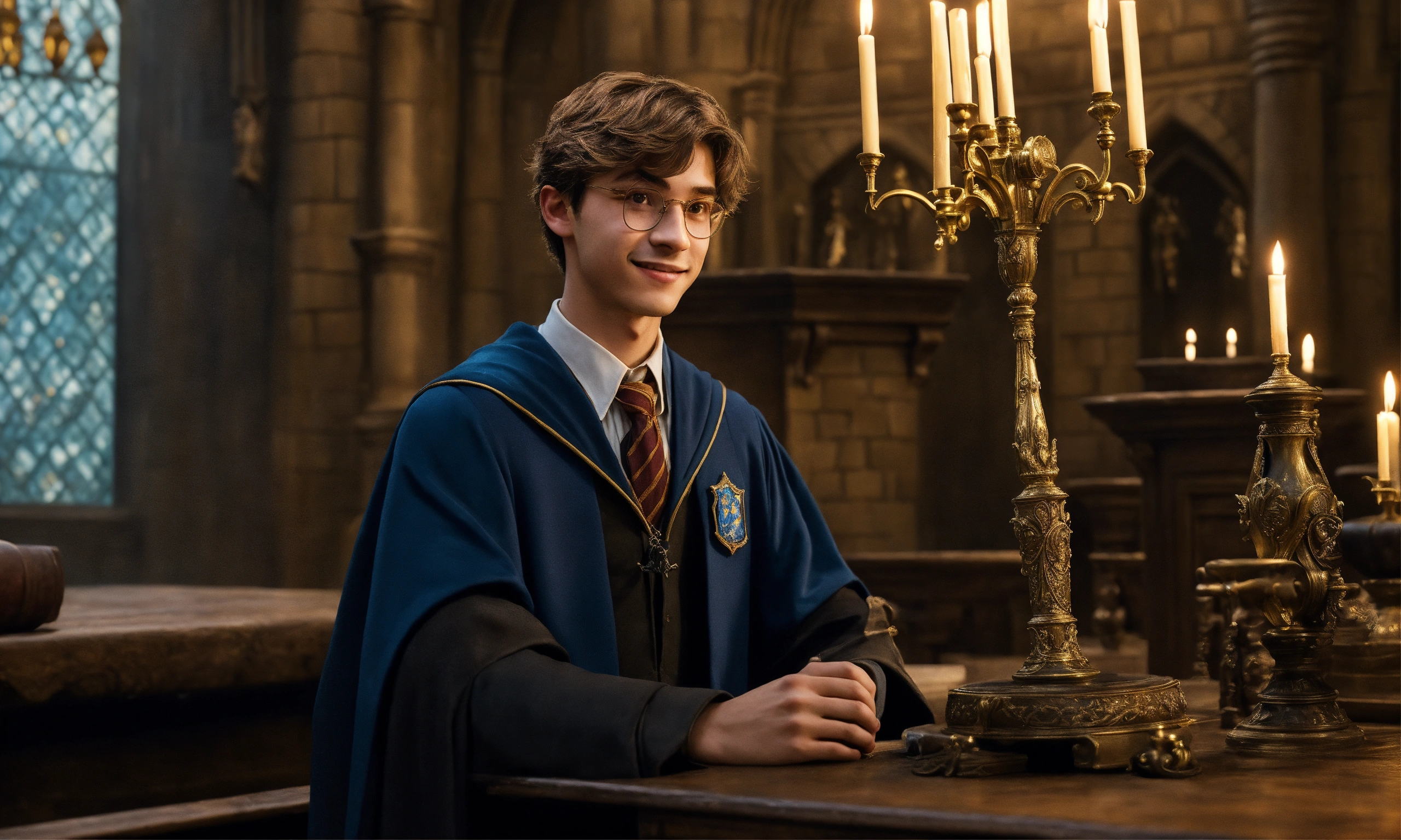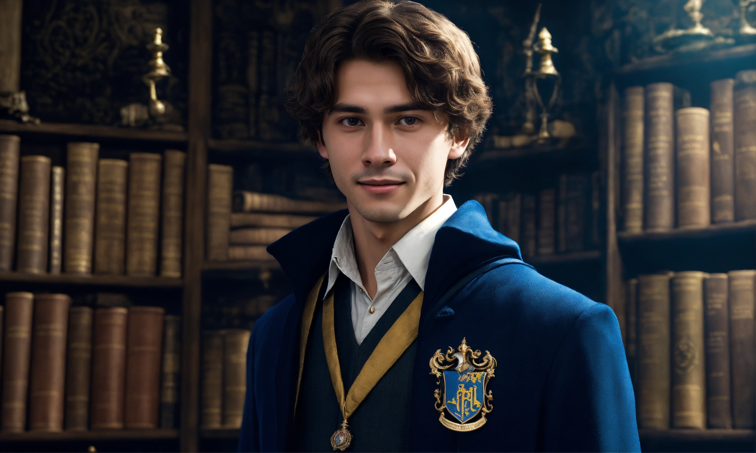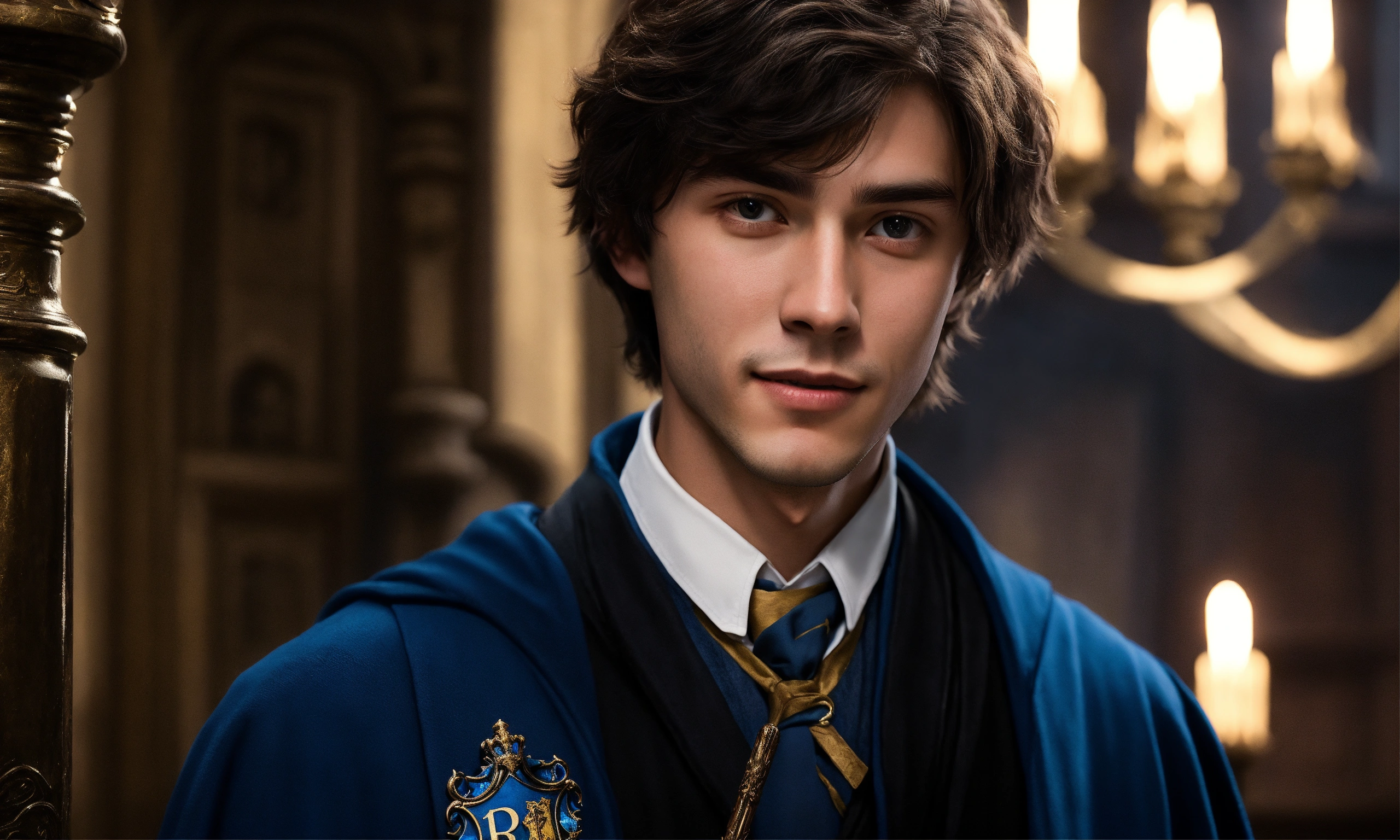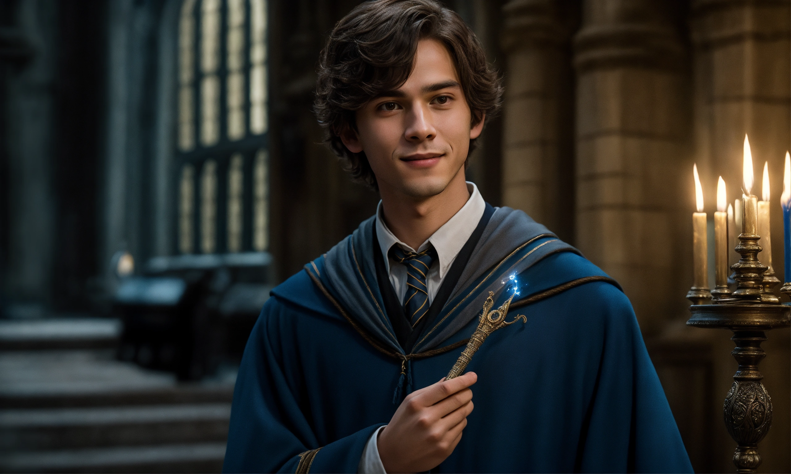 Describe a photograph of a young wizard, aged 18, standing inside hogwarts in the year 2023. depict him as a charismatic and enigmatic figure, exuding an aura of intelligence and ambition. capture the intricate details of his refined features, the depth of his gaze, and the mischievous smile hinting at a touch of wickedness. portray him delicately holding a small magic wand, emanating an air of sophistication and potential. showcase the classic ravenclaw attire, embellished with subtle personal elements reflecting his unique character and style. highlight his notable achievements and dedication to the pursuit of knowledge within the prestigious walls of hogwarts, embodying the essence of a young wizard on the brink of greatness