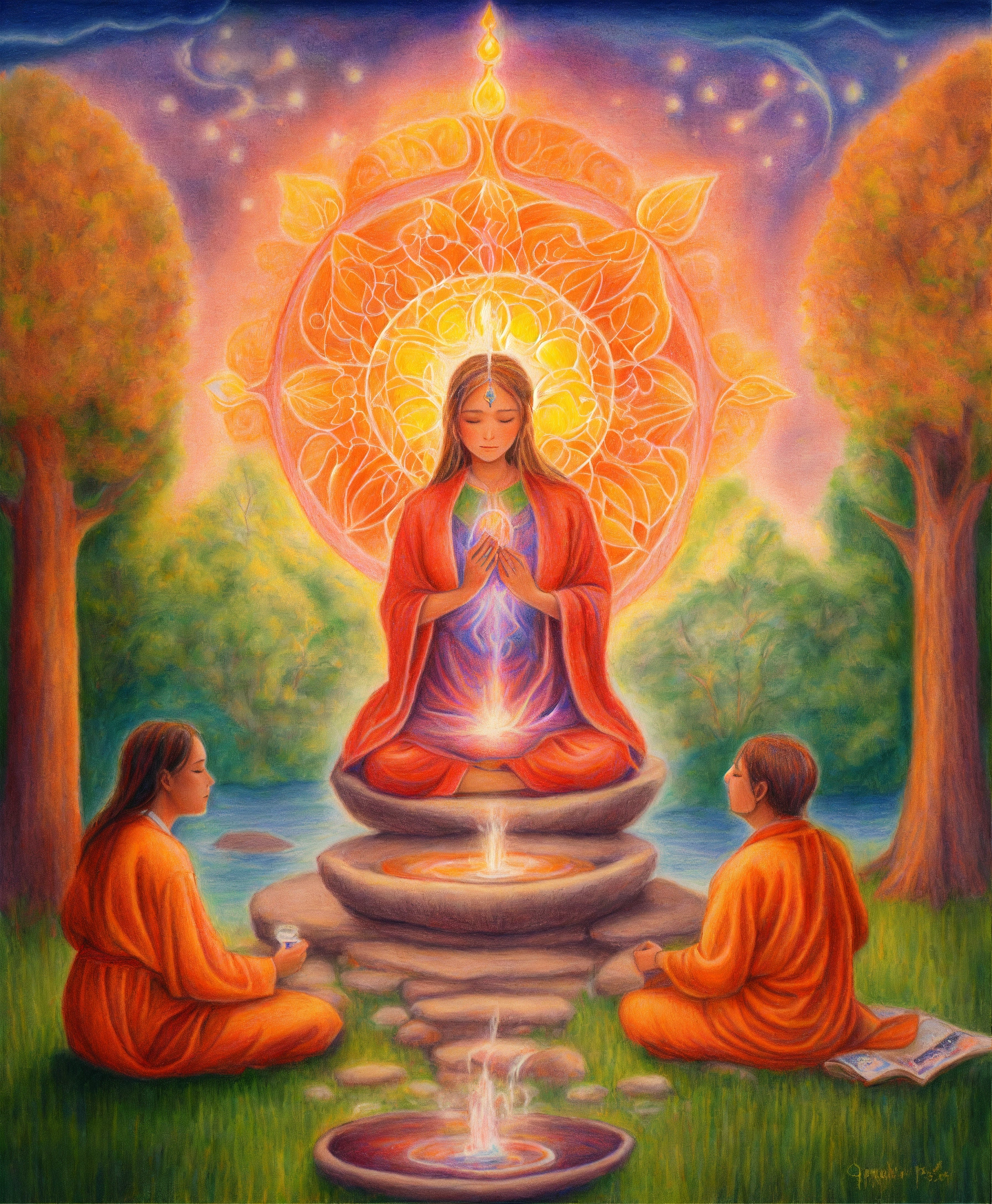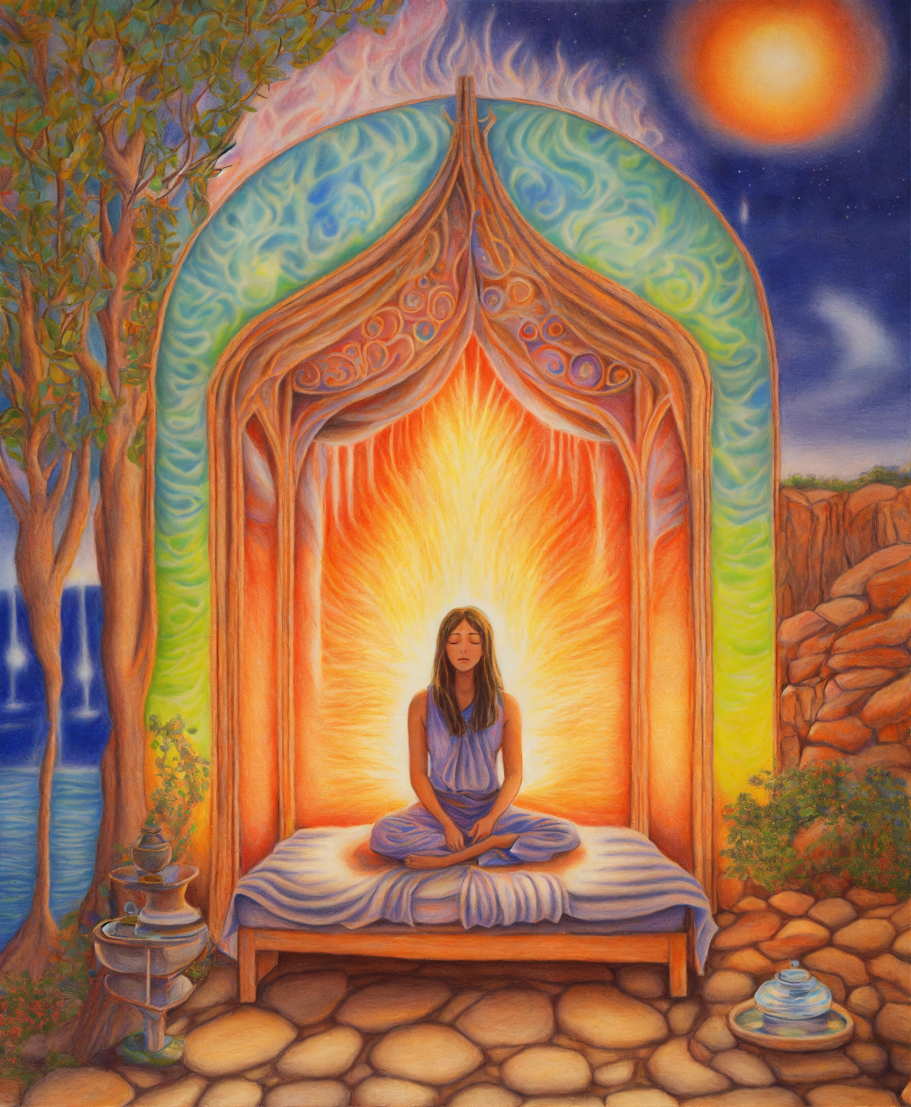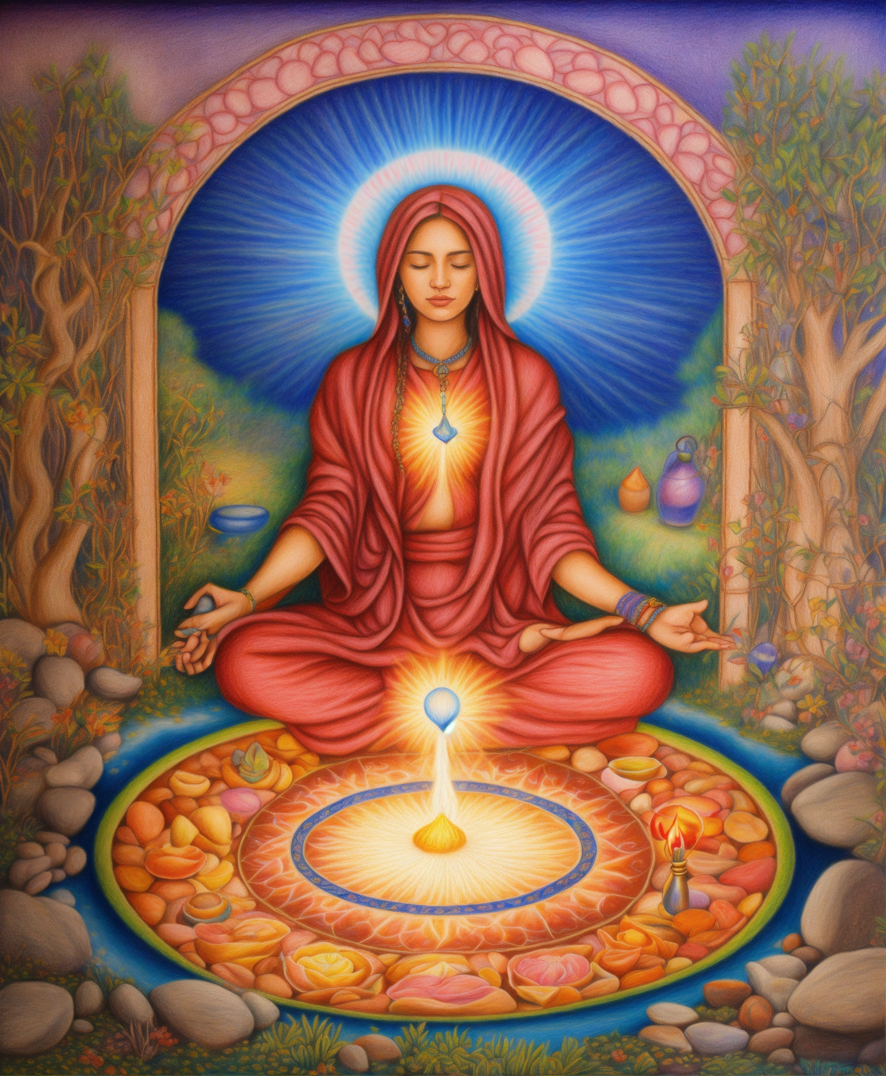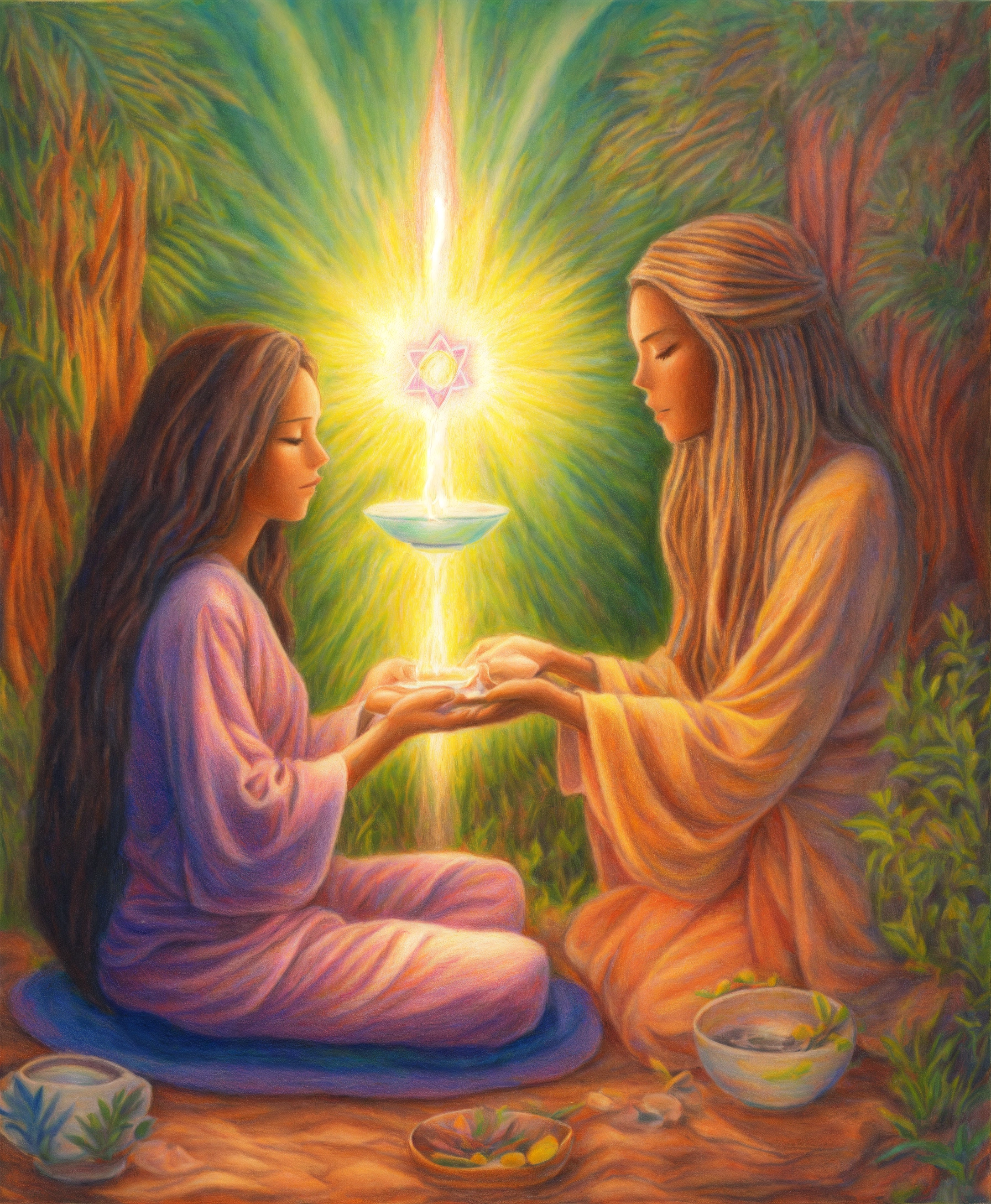 Colored pencil drawing of spiritual cleansing treatment, enlightened spiritual beings caring for a person