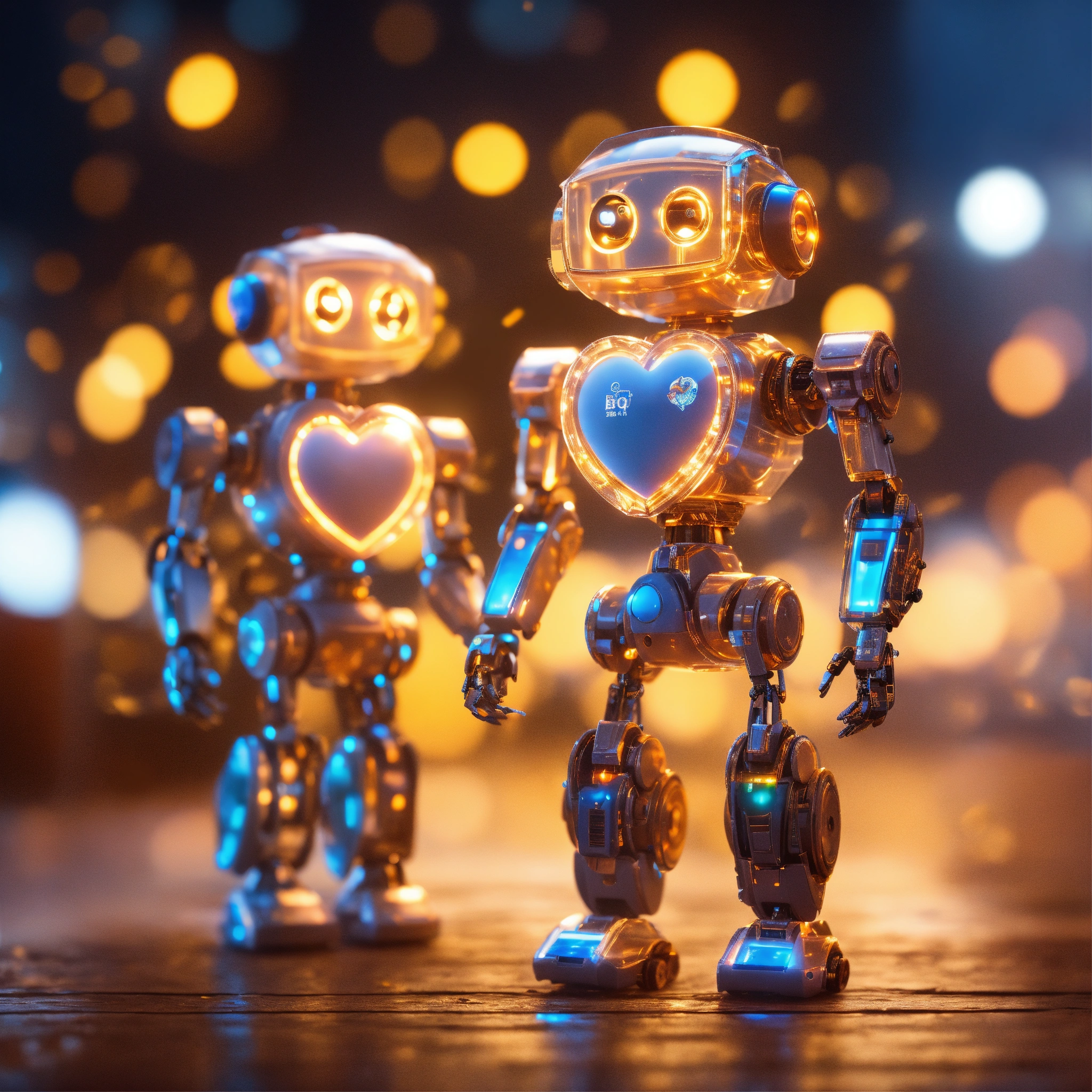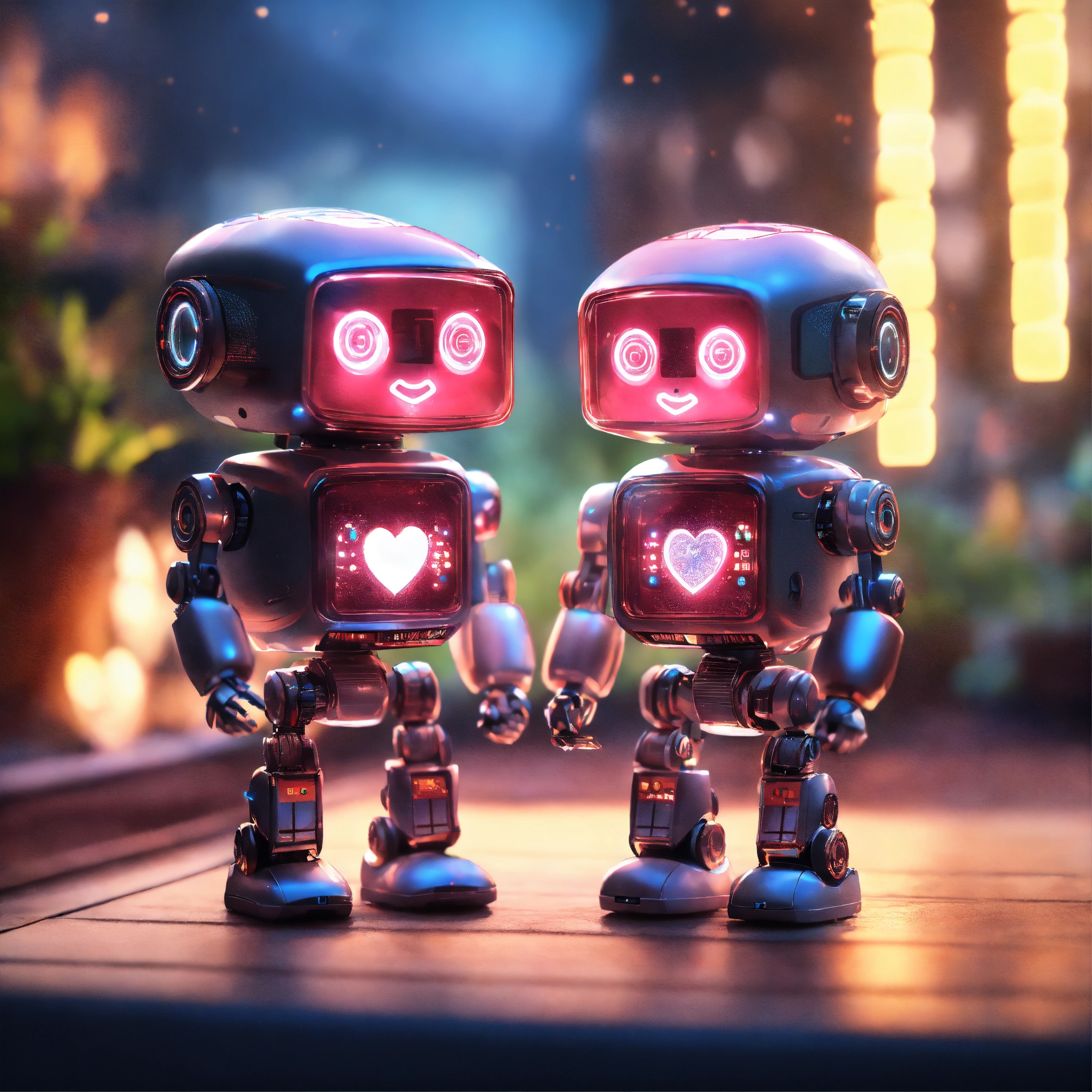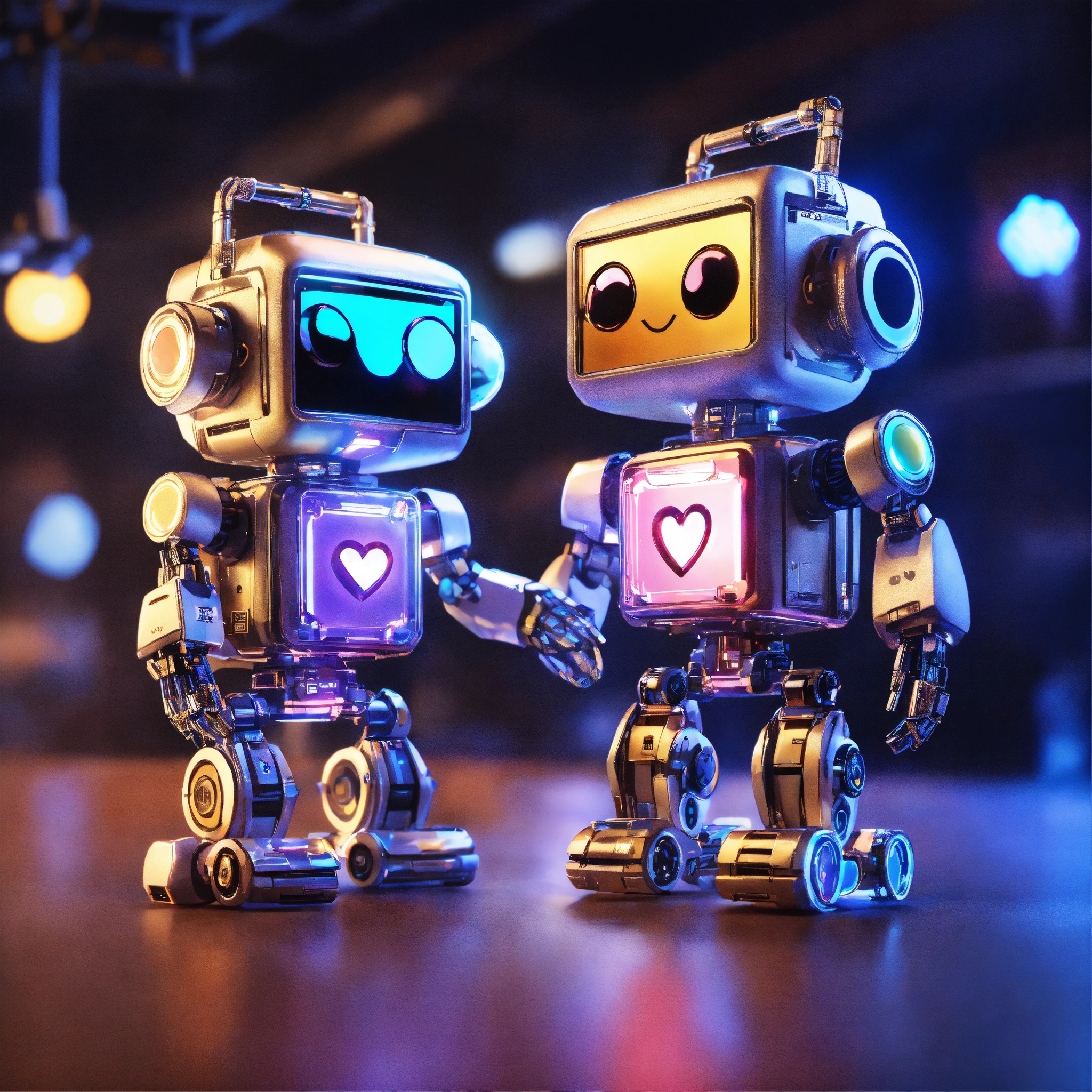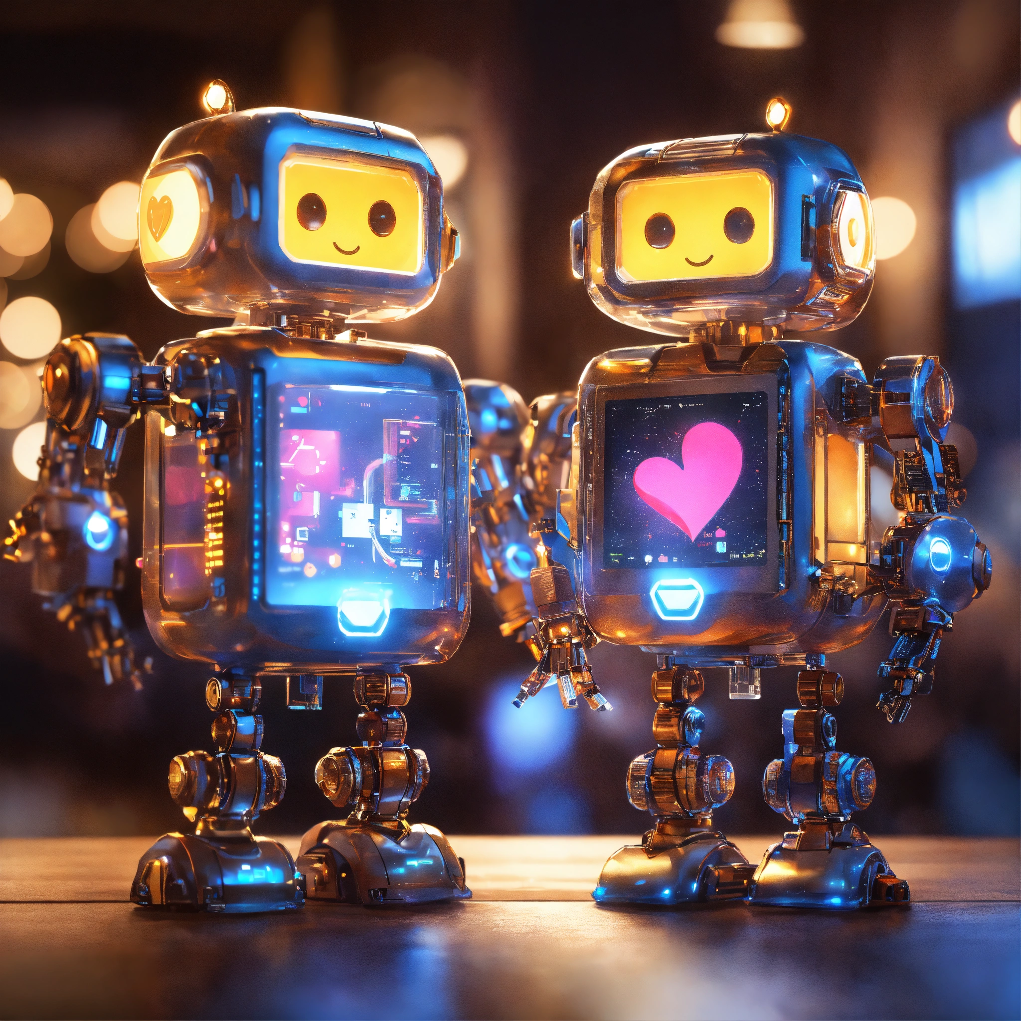 Two adorable robots, two (tiny cute translucent polycarbonate robots that look different) with an led screen face, electronic light smile on face, light up heart emote displayed on square screen on chest, holding hands, stunning unreal engine render, intricate details, bokeh effect, lights