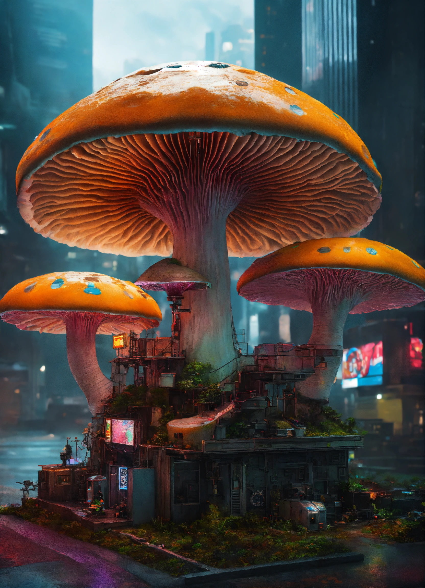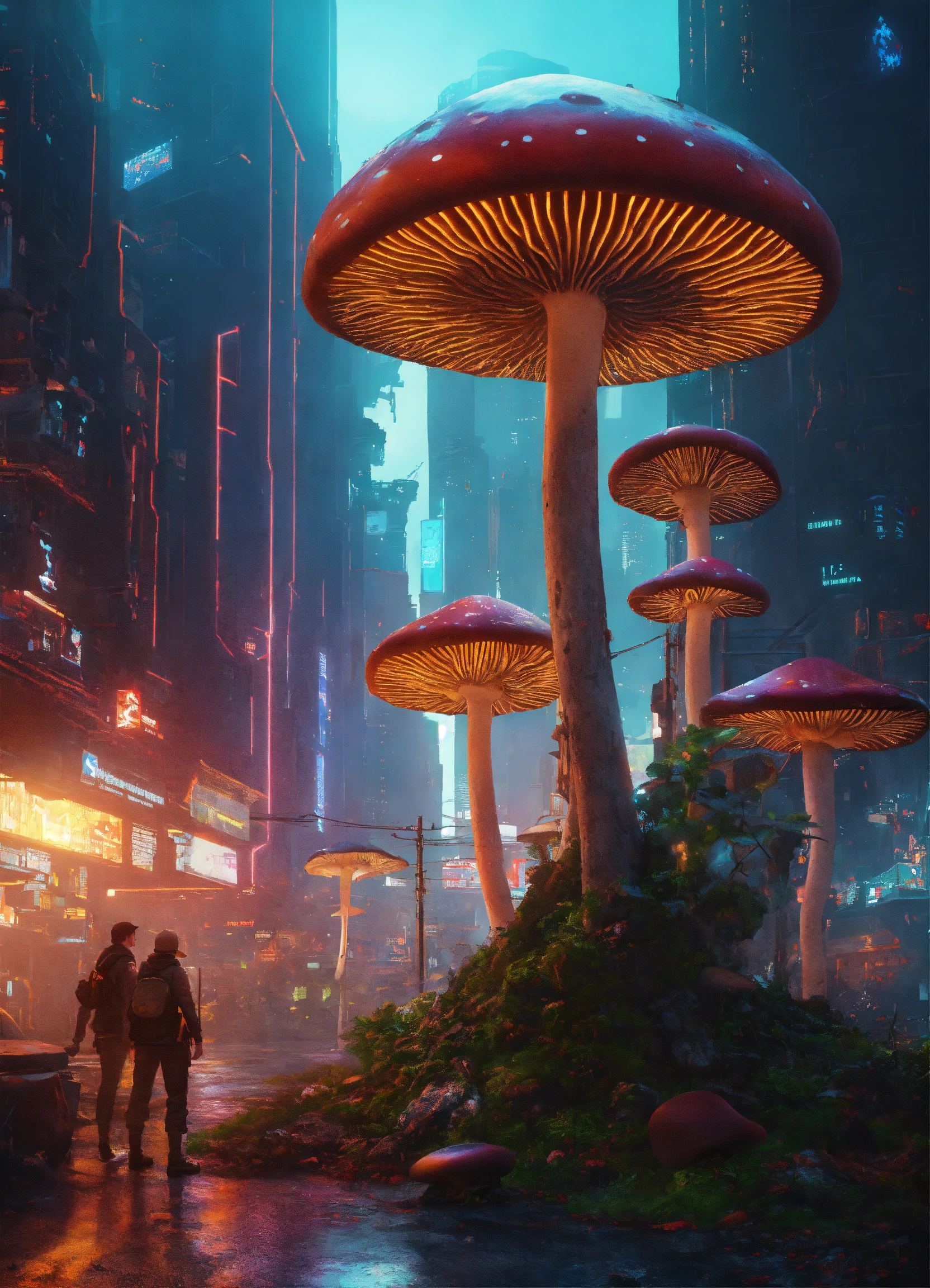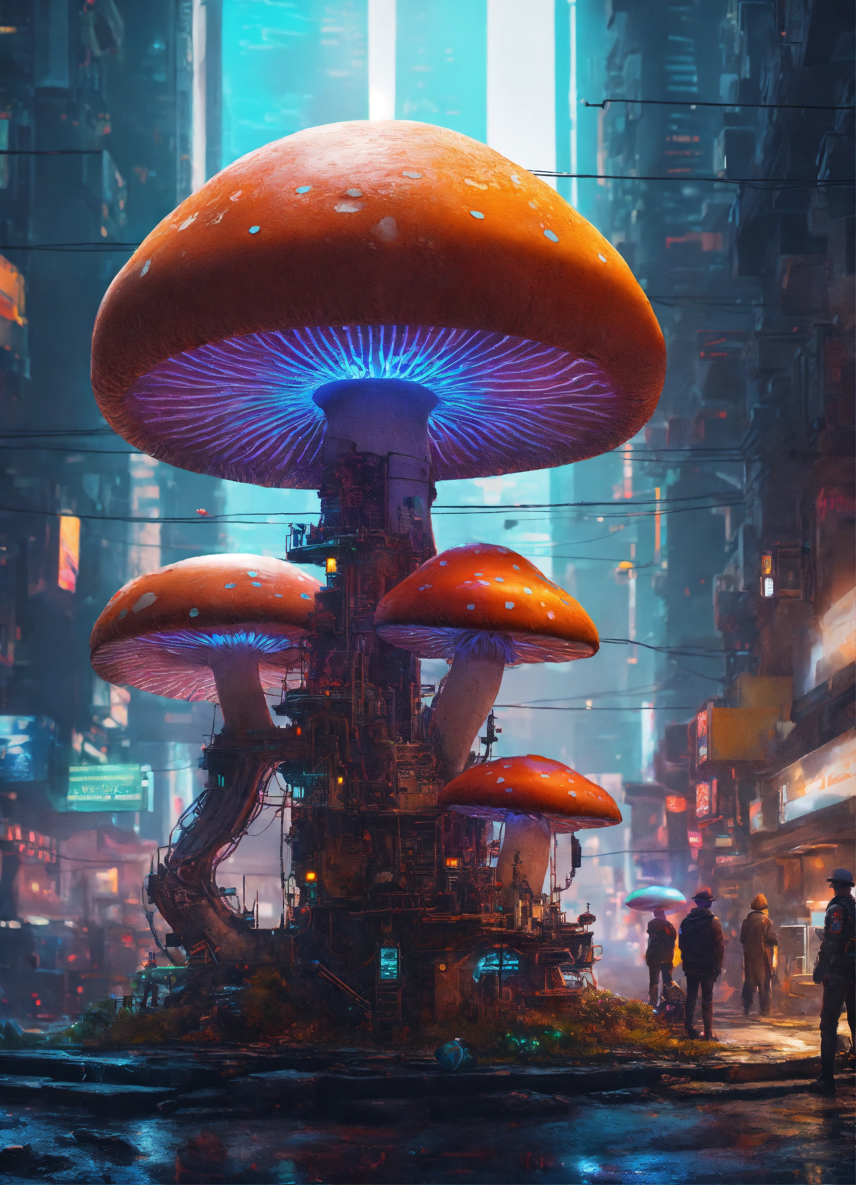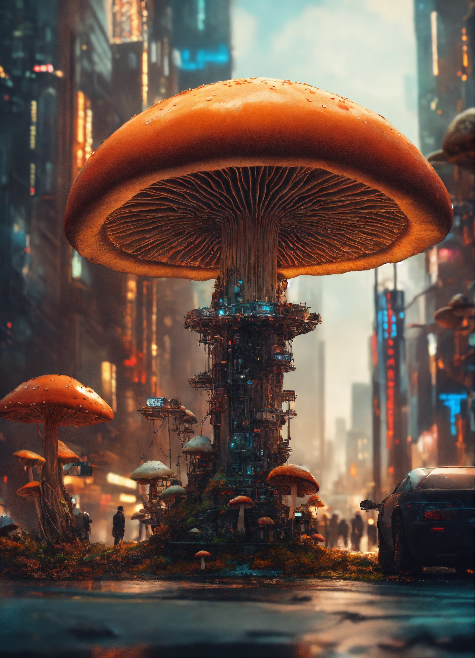 Anamorphic death cap mushroom in a cyberpunk dystopic megacity with futuristic colossal robots observing it in high detail. geometrically aesthetic, photorealistic, fibonacci sequence, rgb pattern, extreme detail, tilt shift.