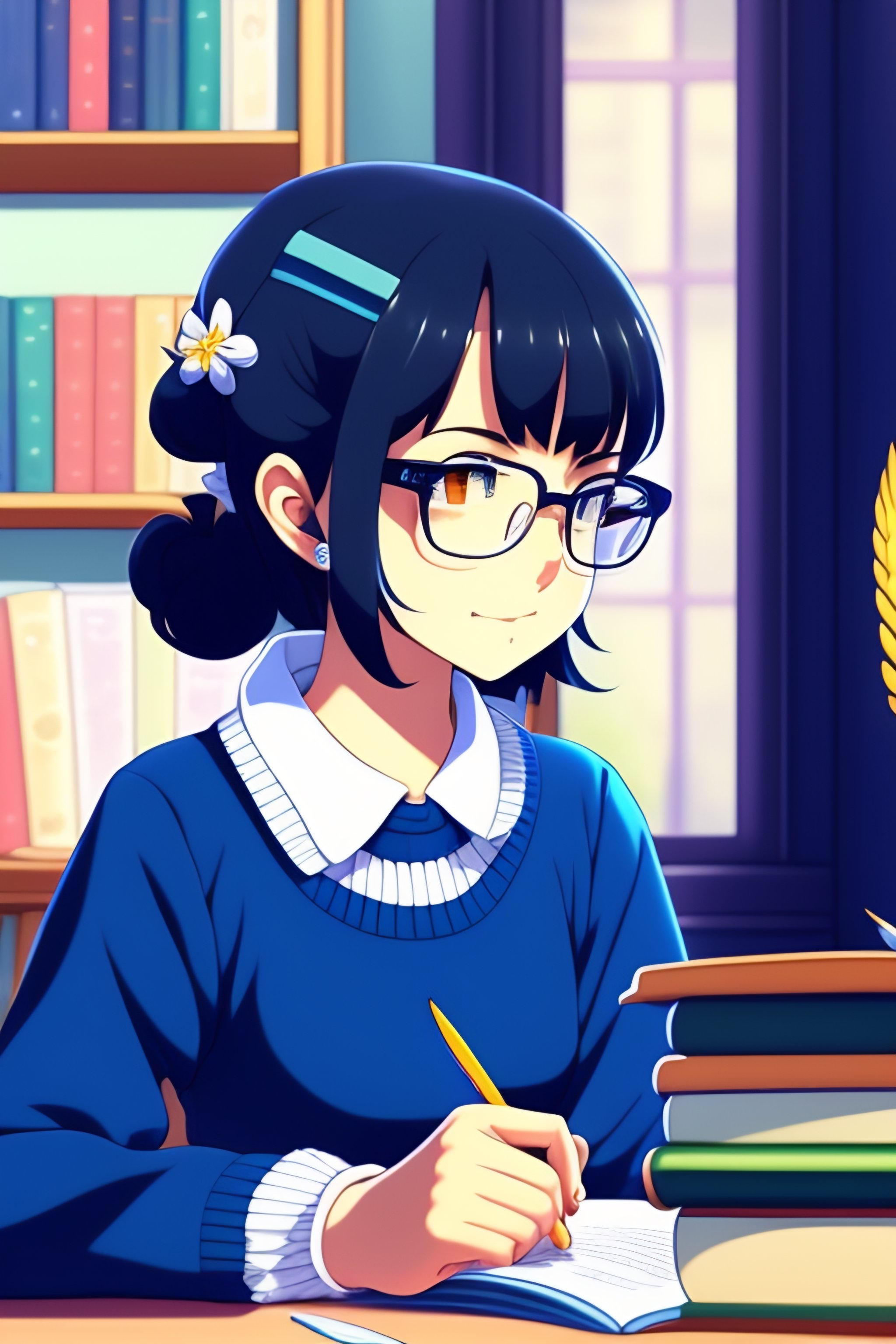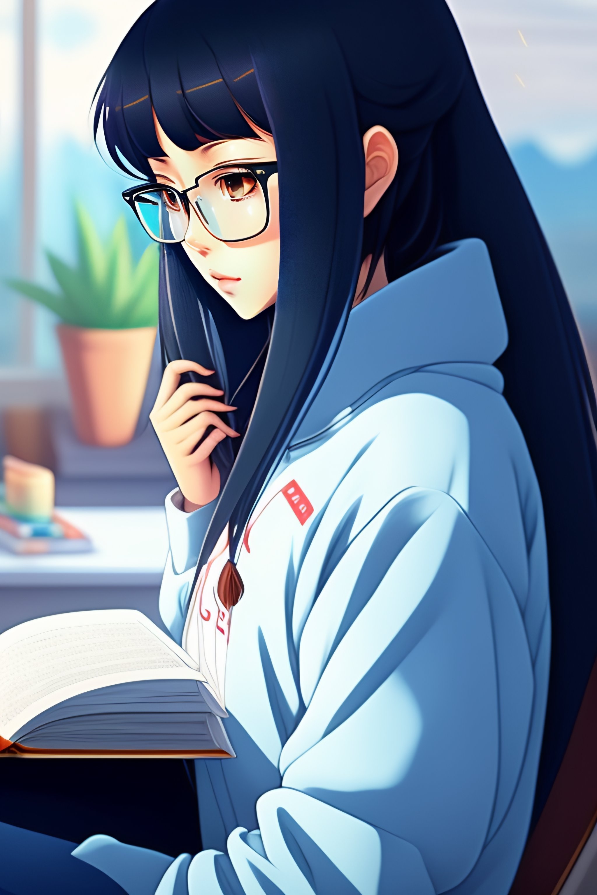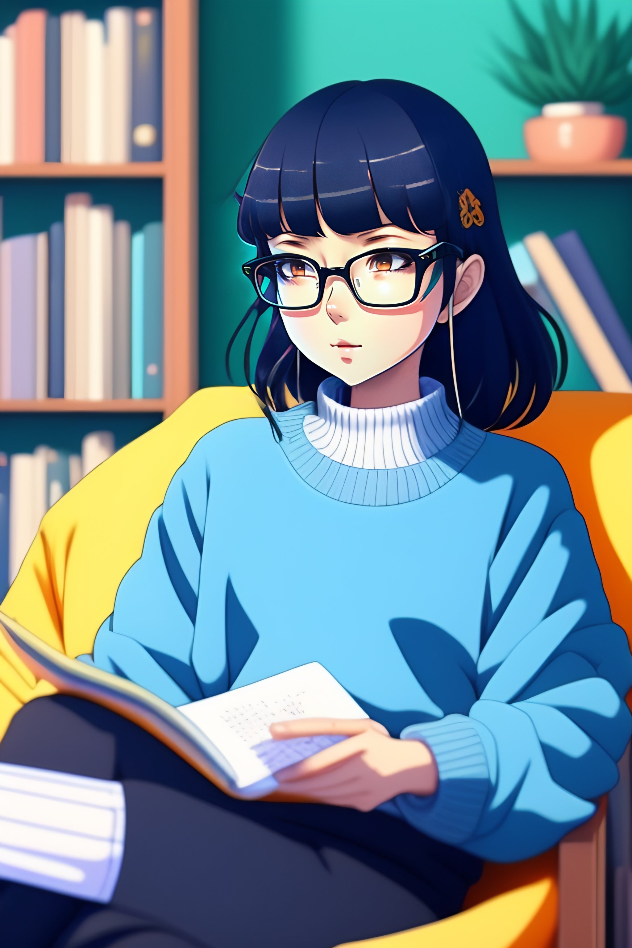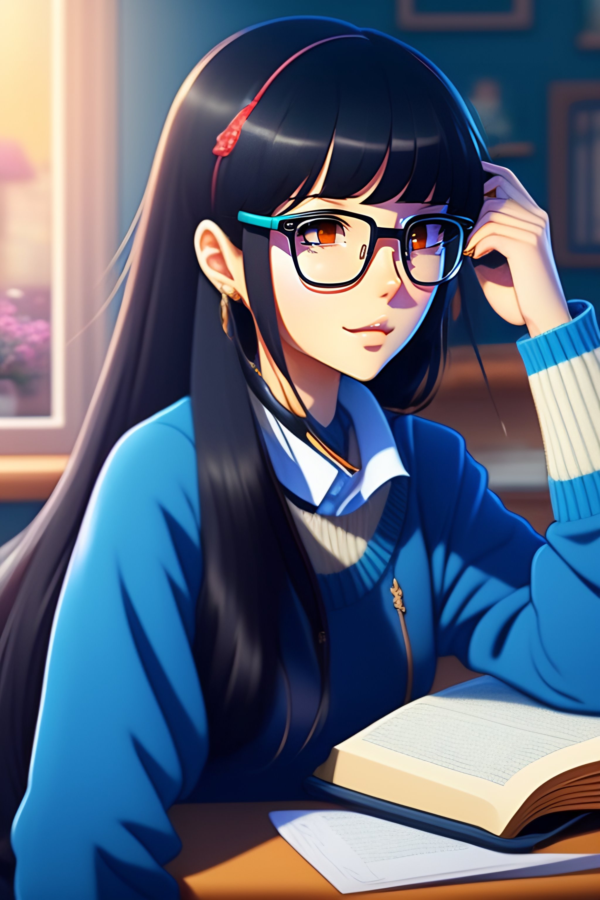 Cute girl in blue sweater black hair black wayfarer glasses sitting inside home doing homework, anime style, ghibli
