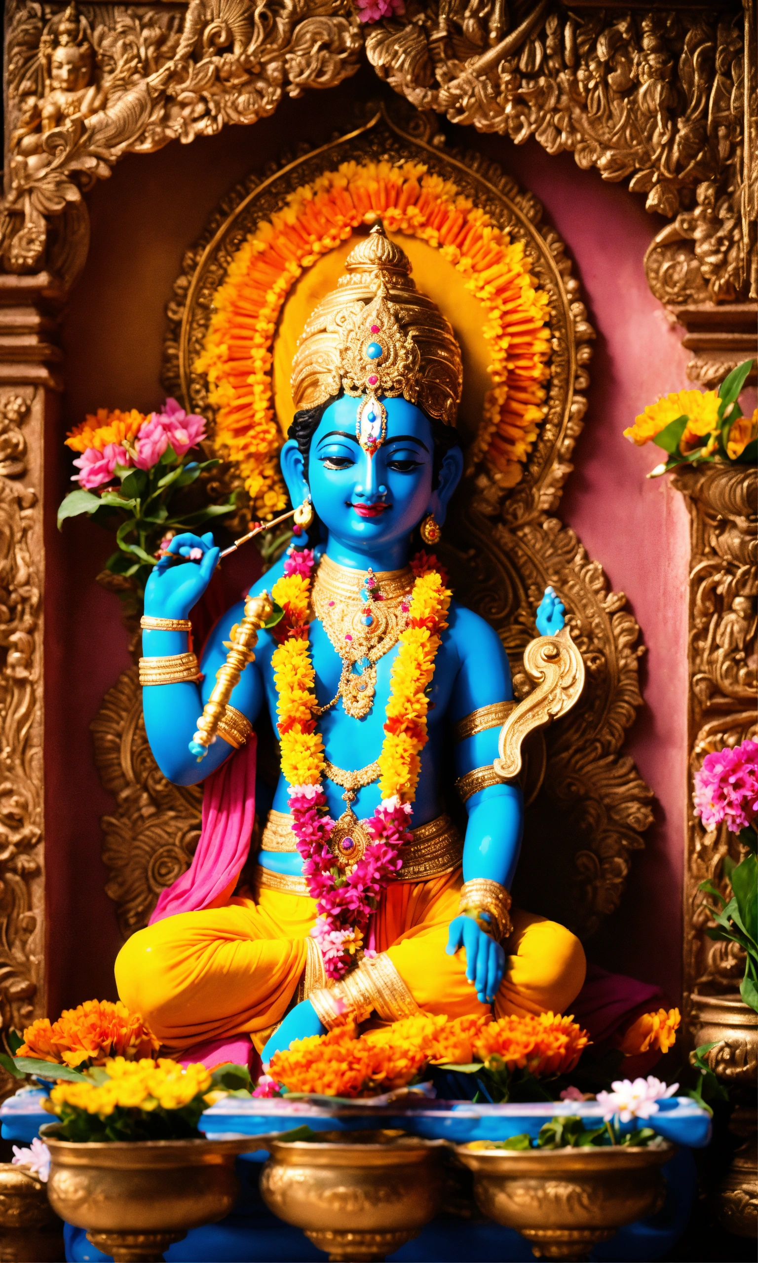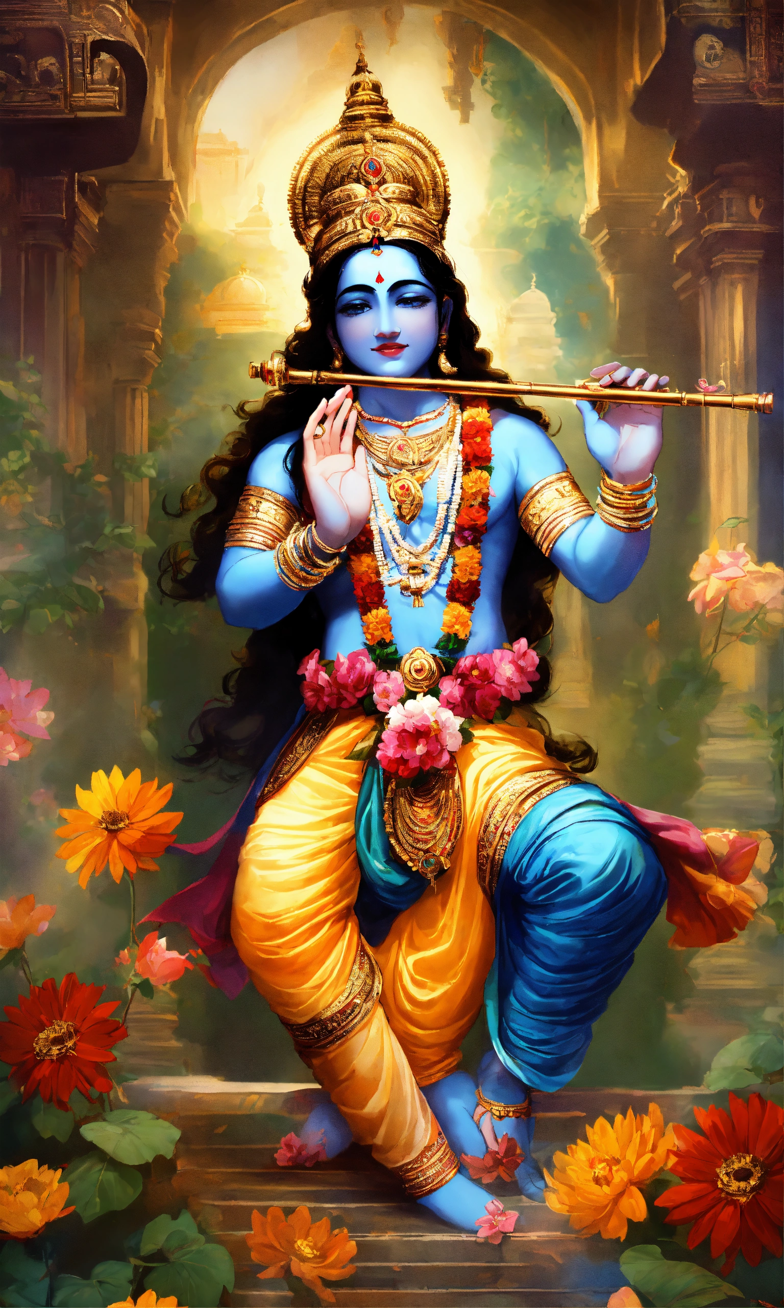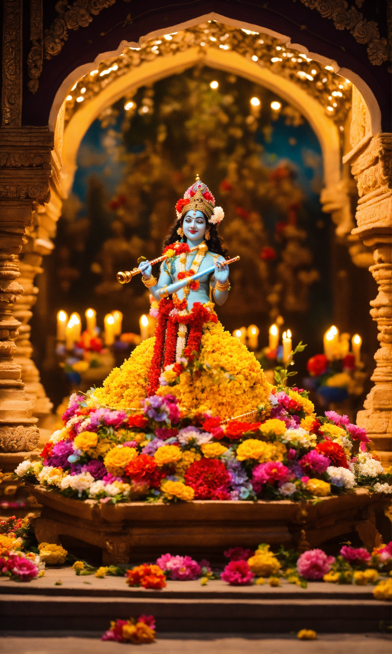 In the center of the temple, an enchanting image of lord krishna stood, adorned with colorful flowers and fragrant incense. the melodious sound of a flute gently filled the air, as if krishna himself were present, playing his divine music.