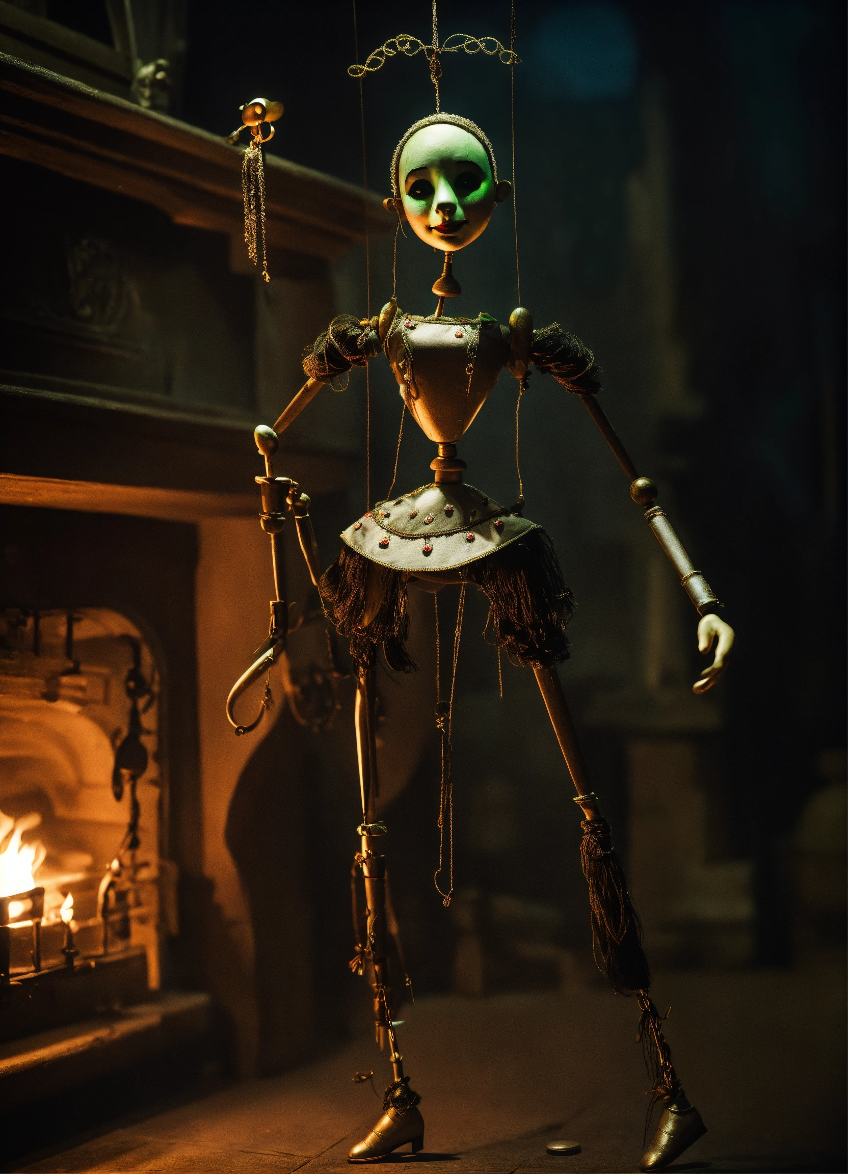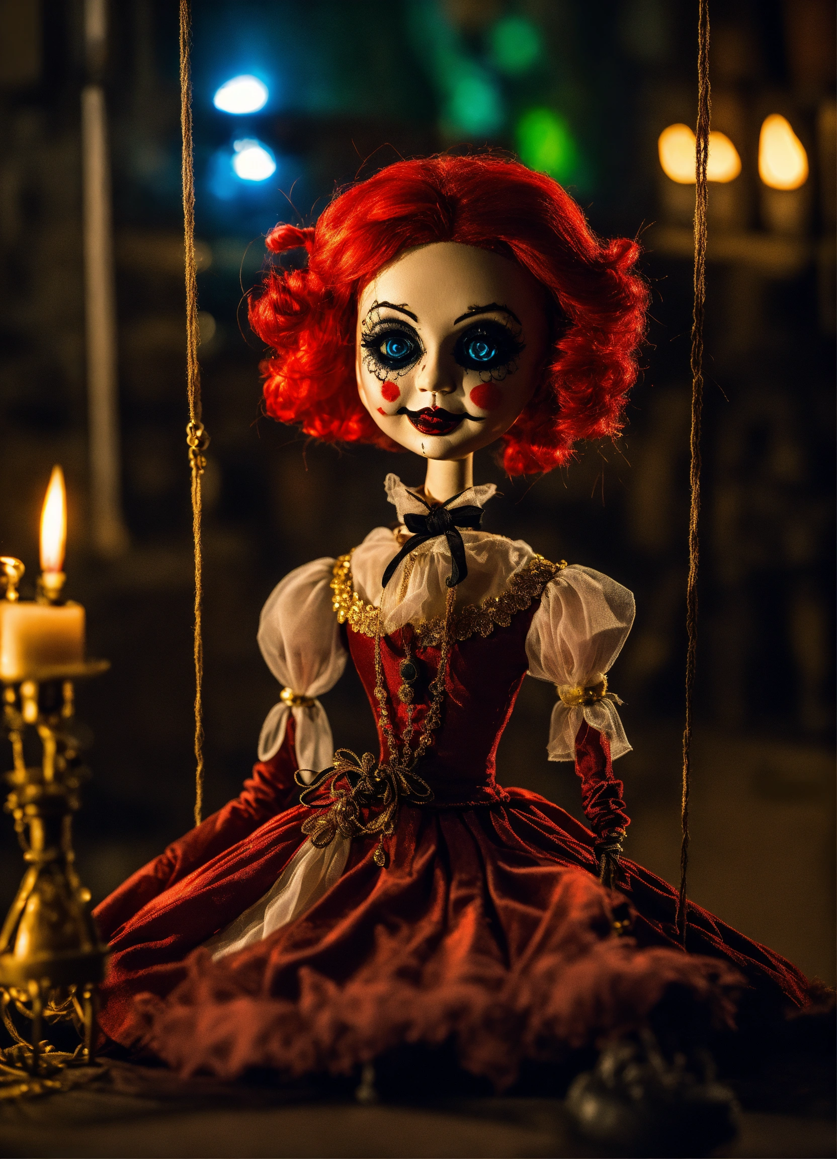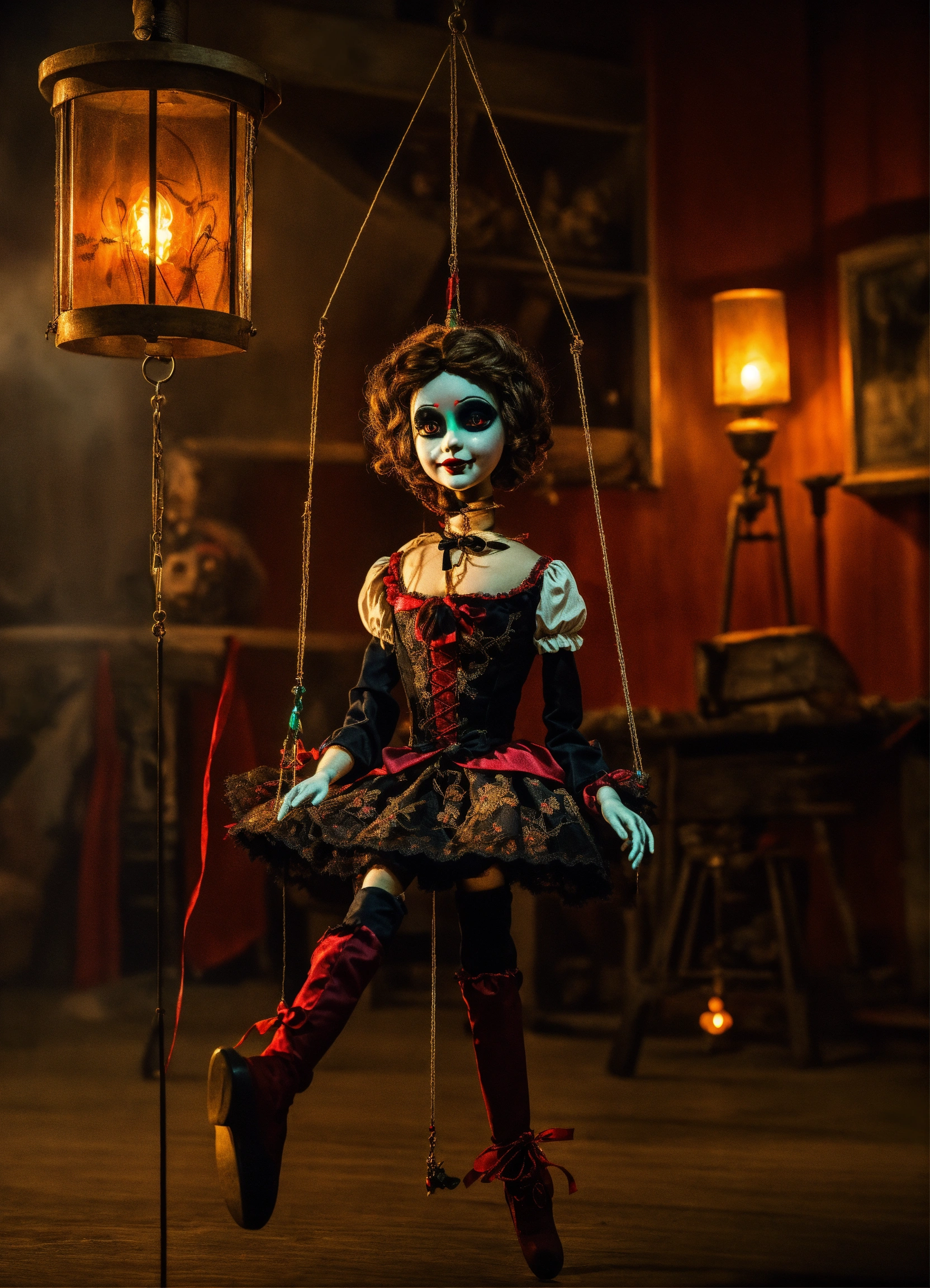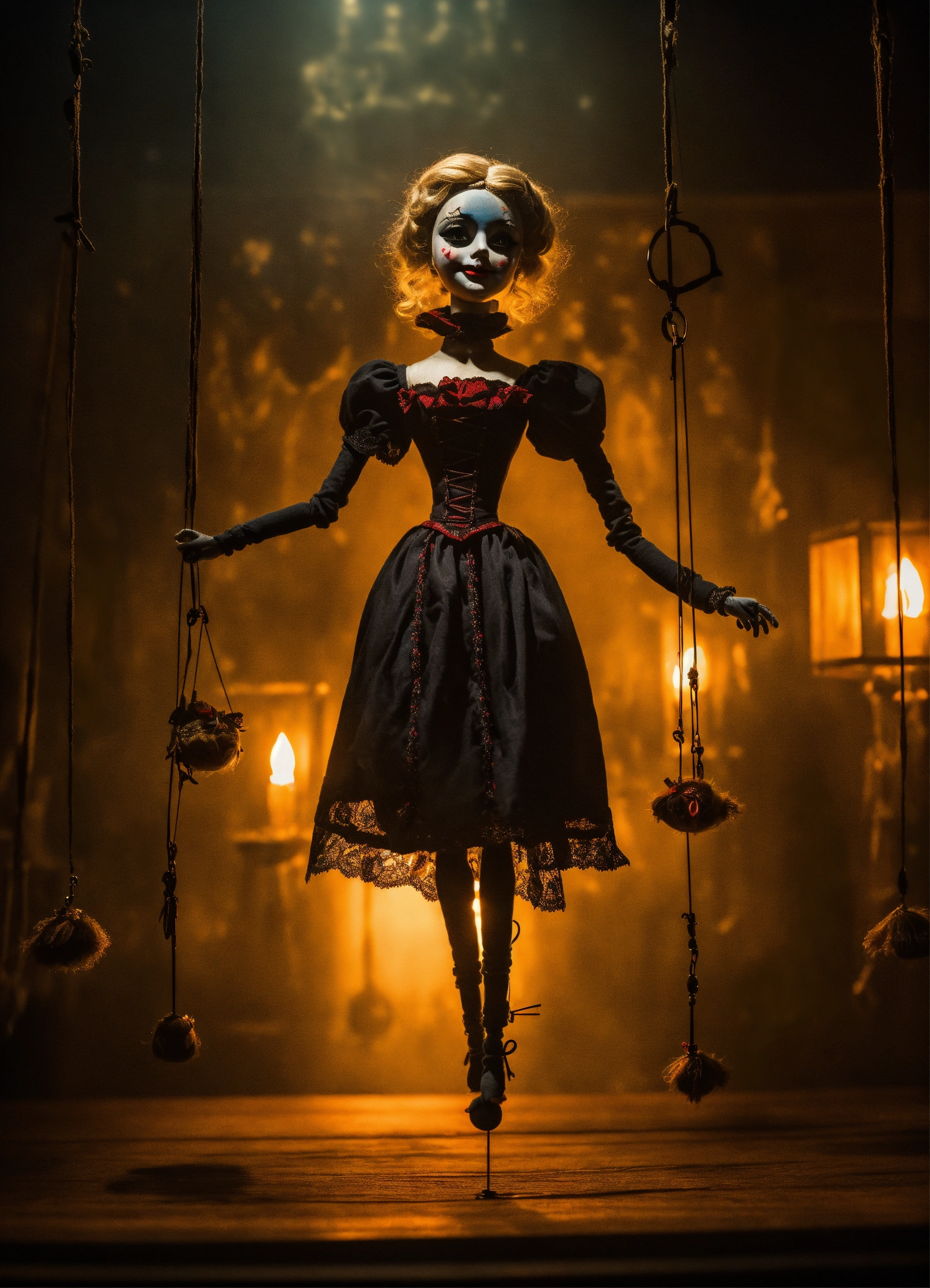 The marionette of a lovely damsel is used as a lure to draw in unsuspecting victims, sinister eyes glow in the darkness behind the marionette