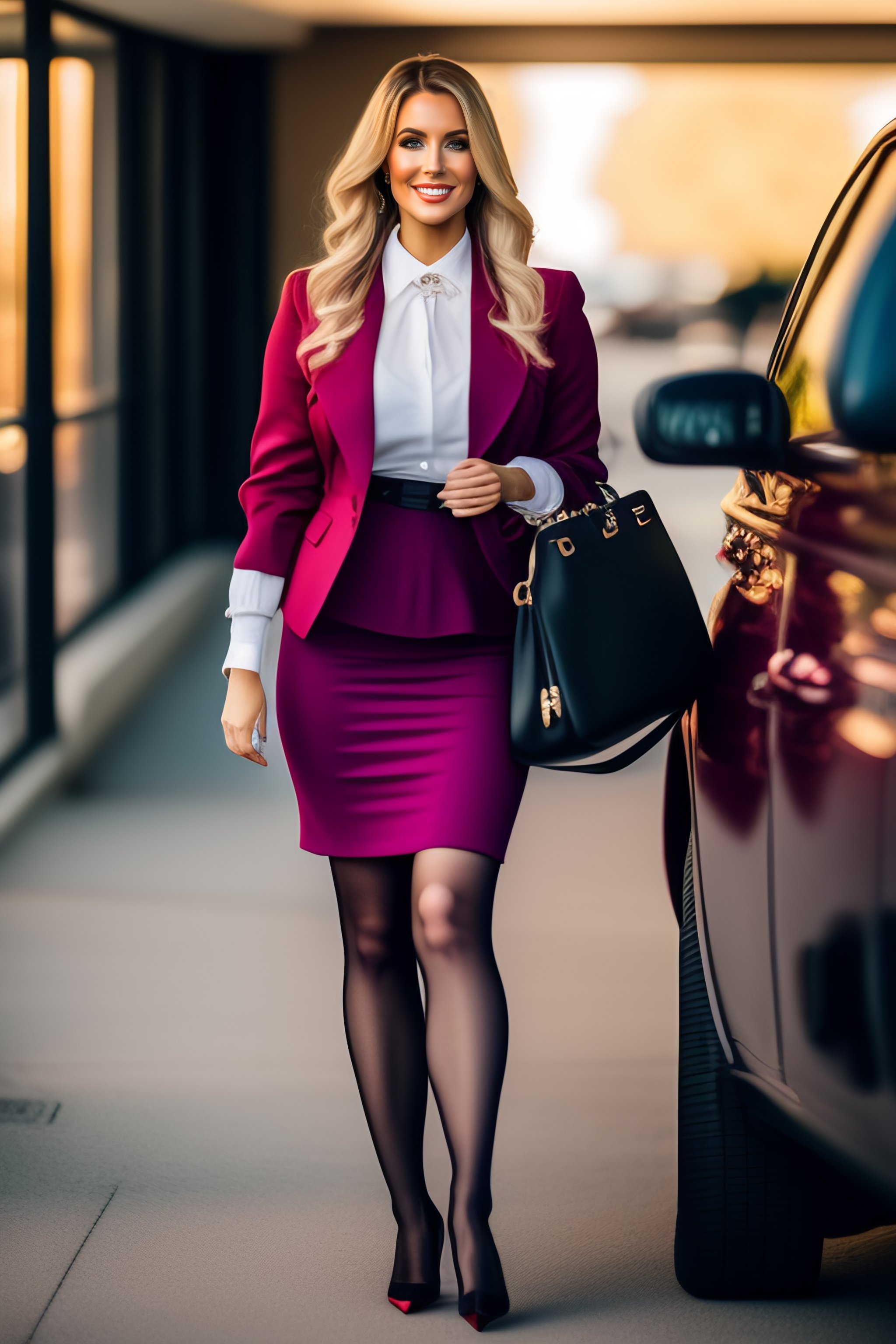 Attractive mid-20s blonde female school teacher, pantyhose and high heels, short sundrrsd blouse, movie film