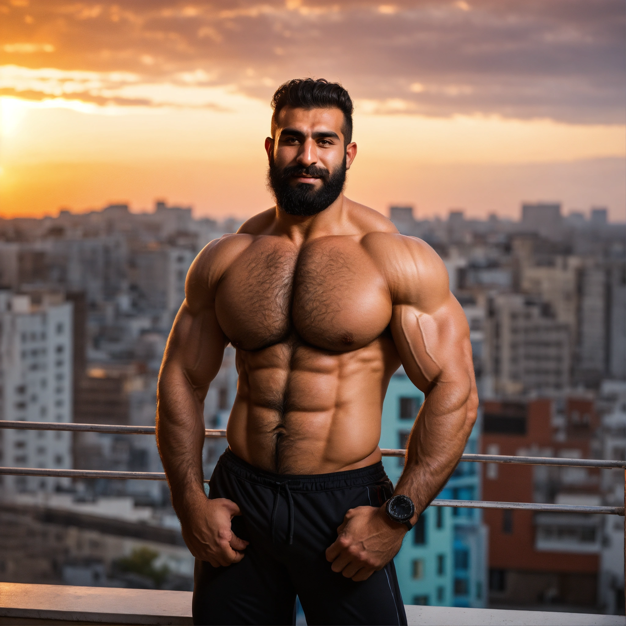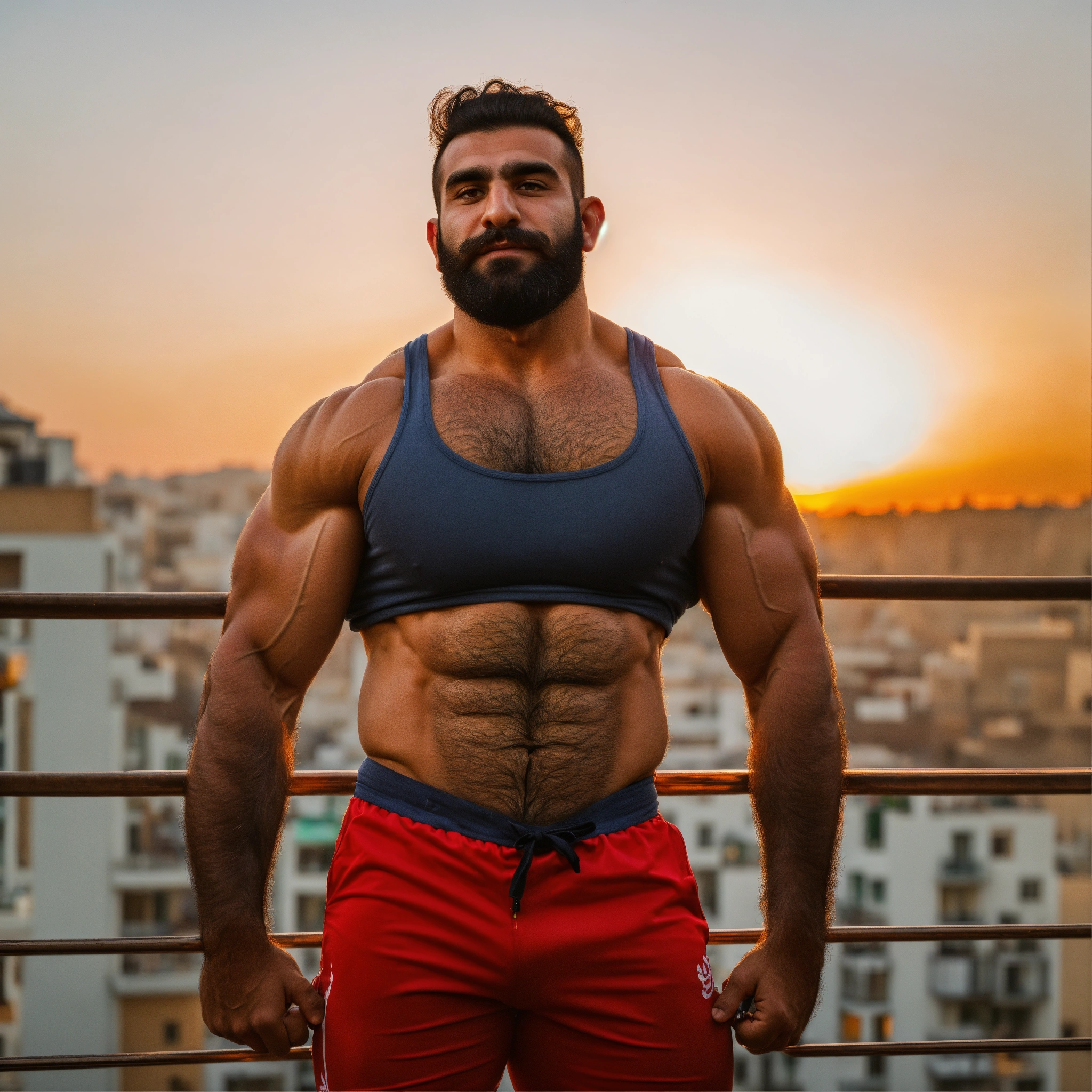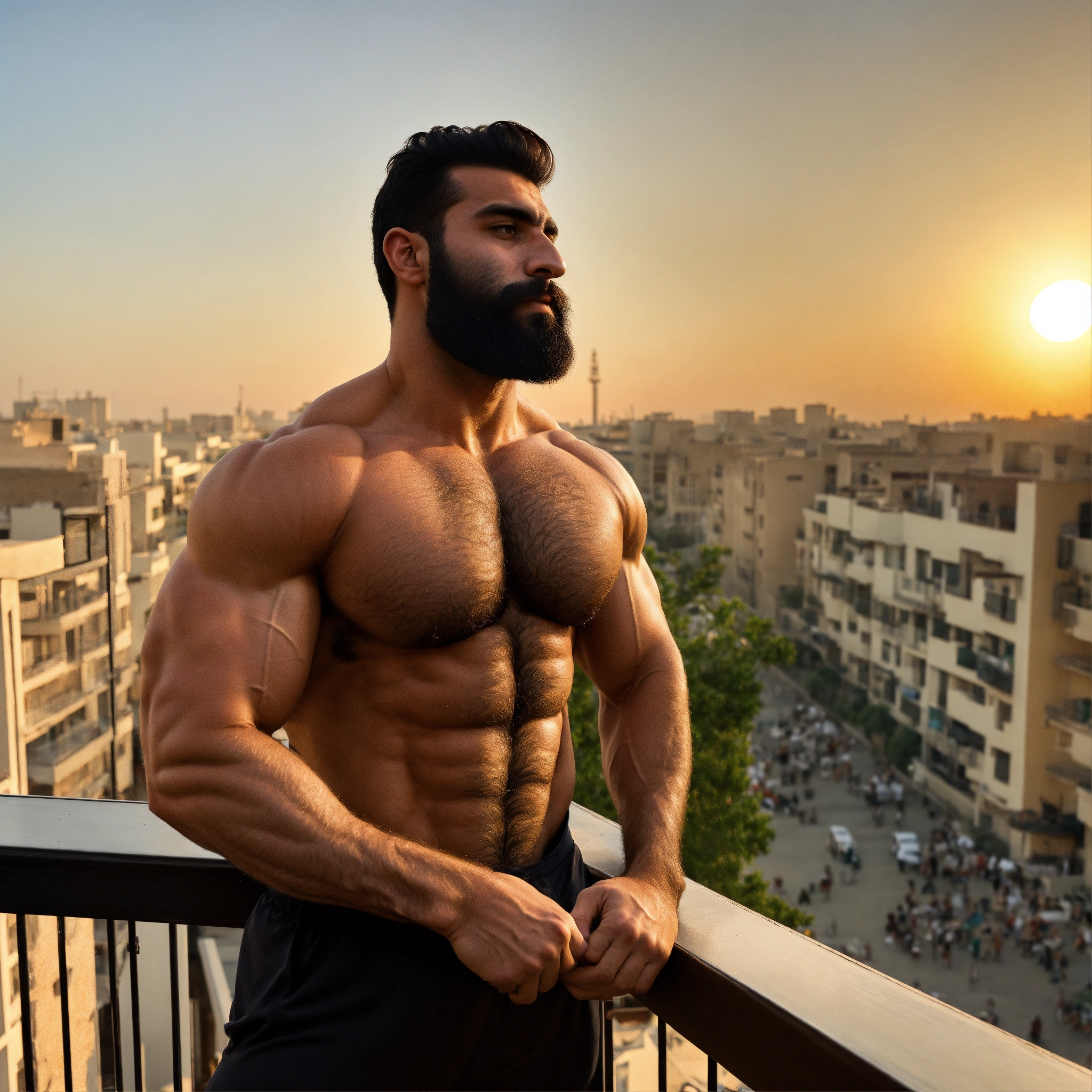30-year-old hairy iranian man with big muscles, big bodybuilder, body like a wrestler, on a balcony at sunset