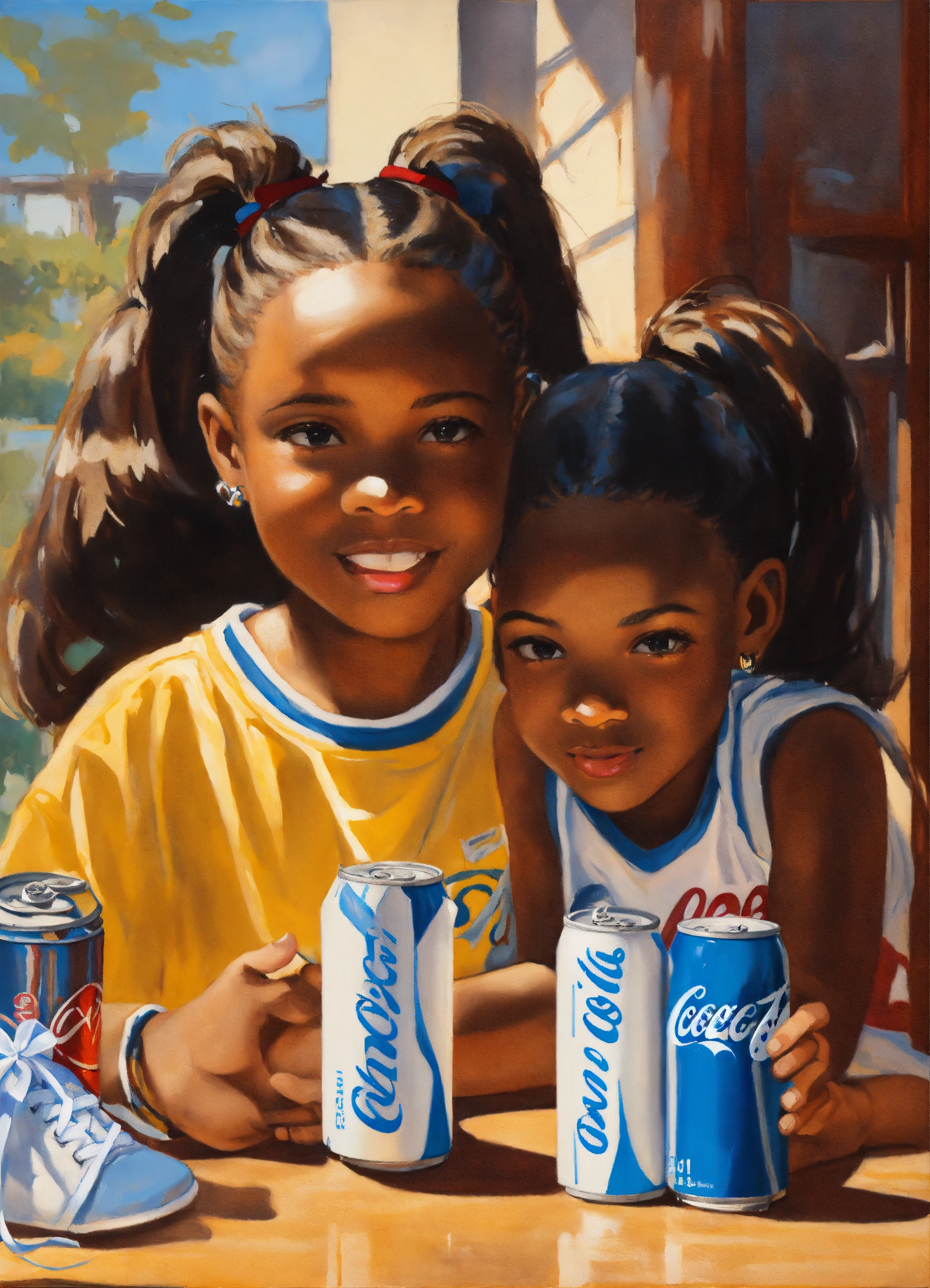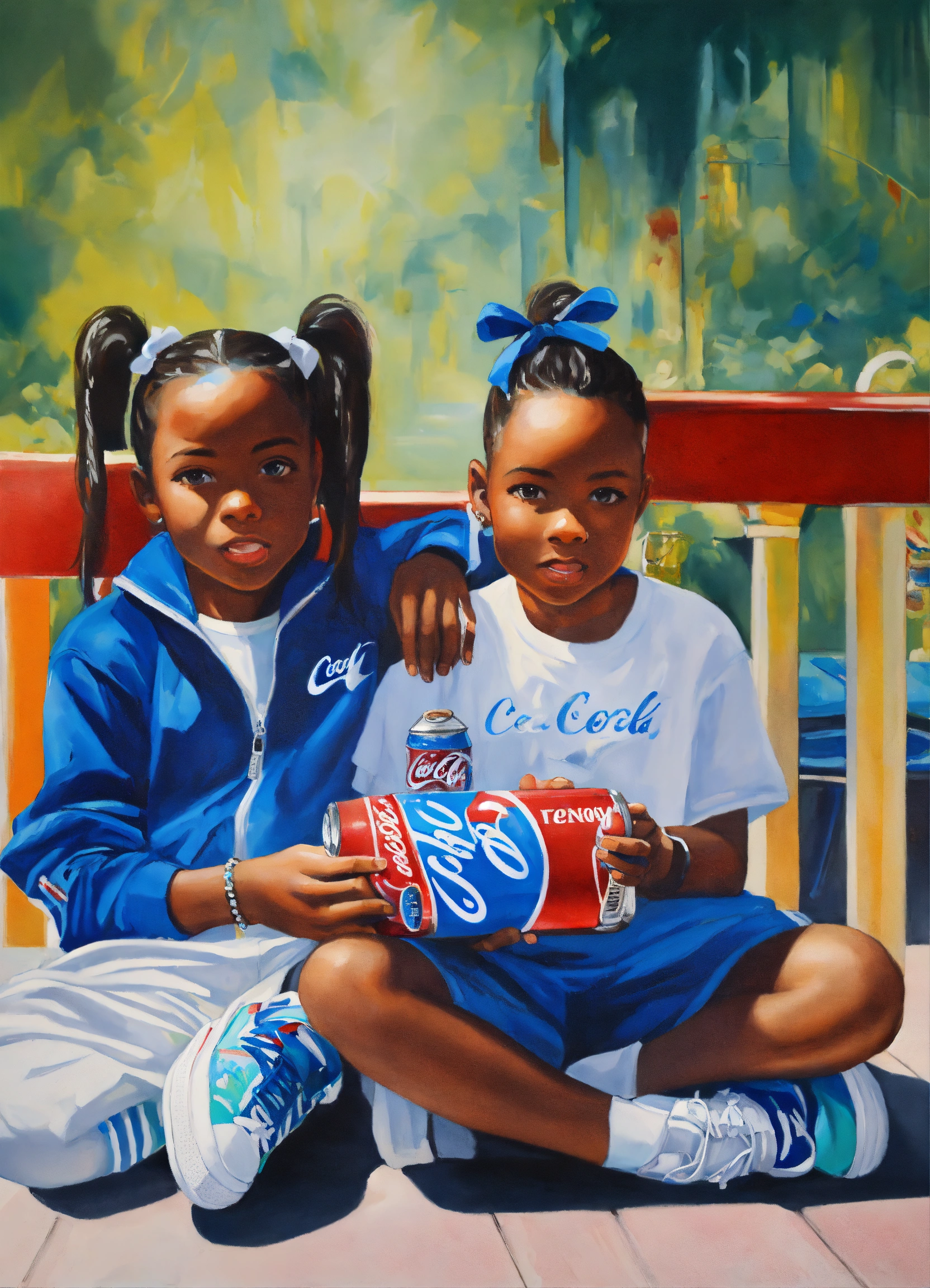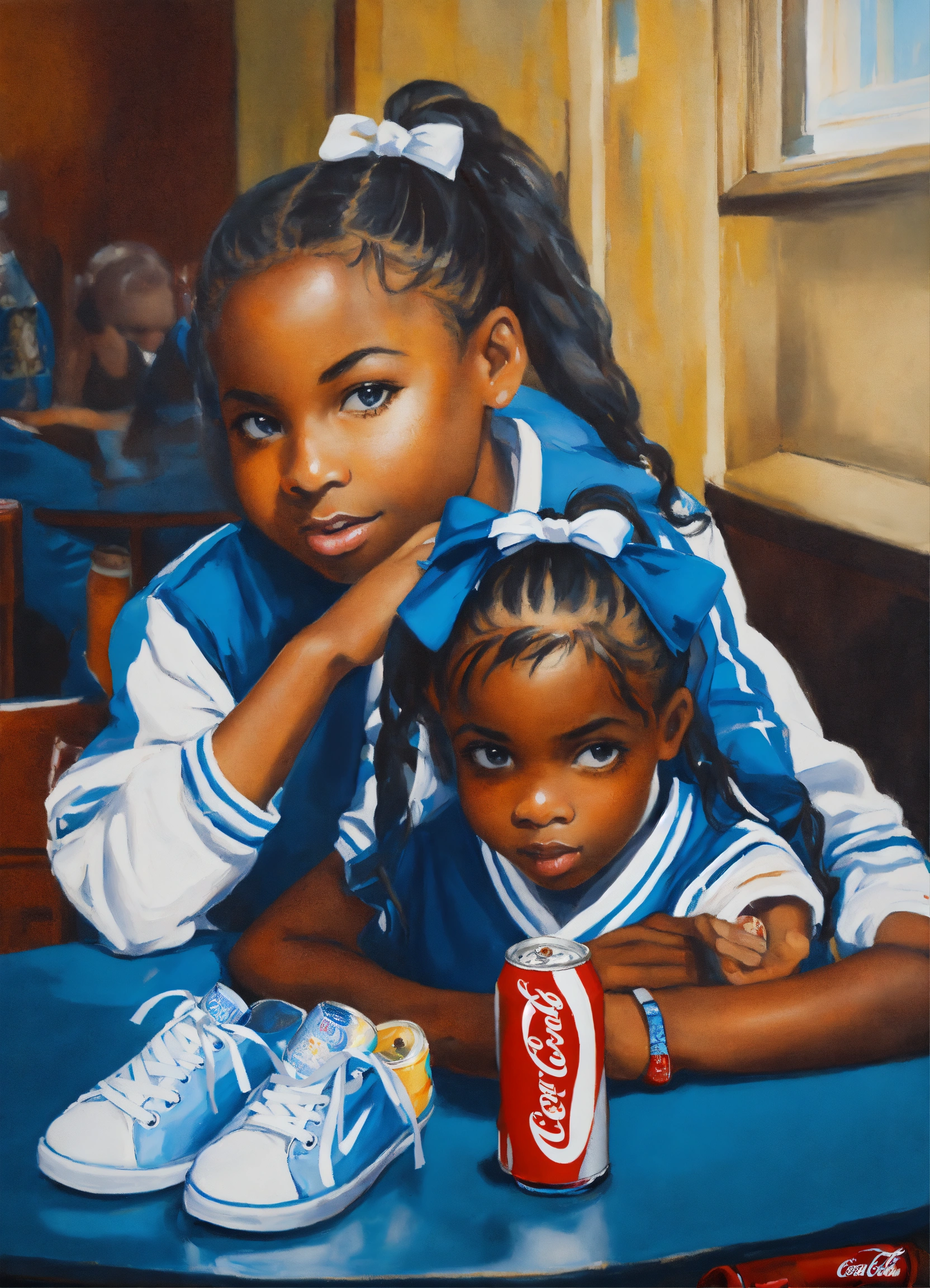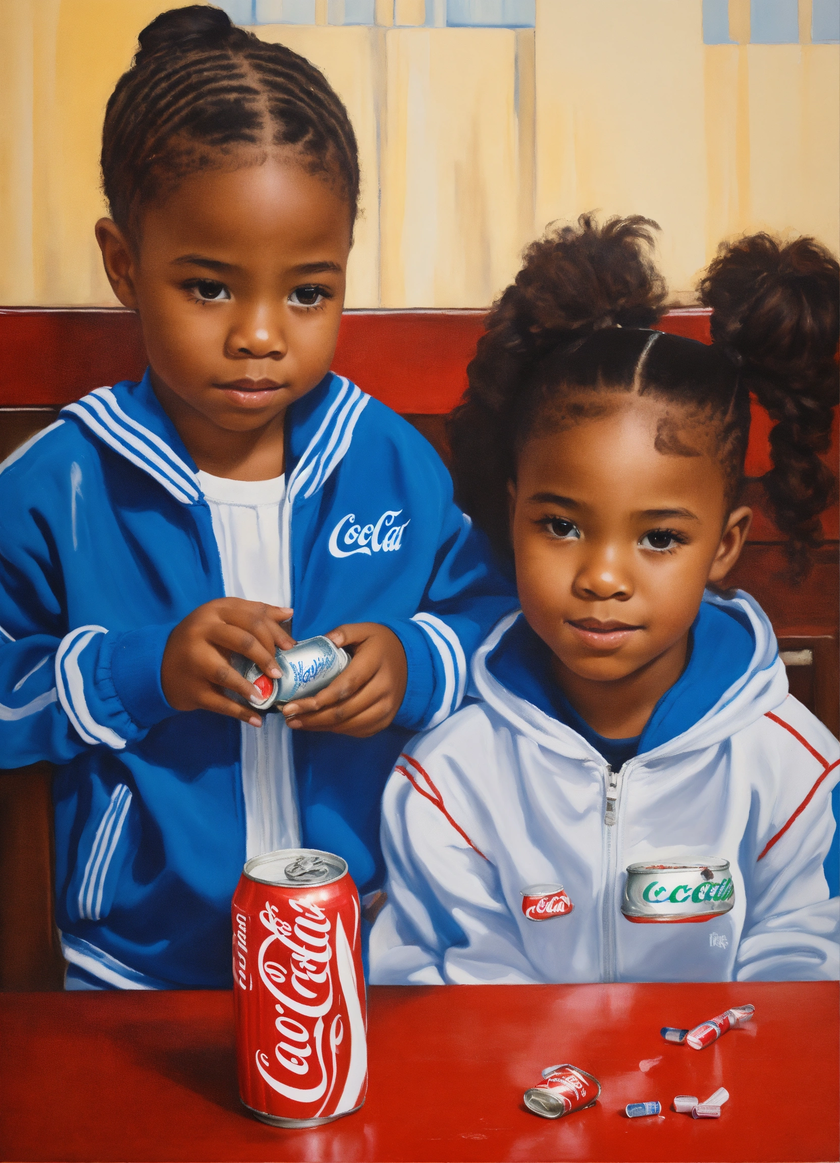 Acrylic painting, african american little boy and little girl with ponytails with white bow, wearing, blue and white track suit, blue and white tennis shoes, silver bracelet, at a table with the word fundraiser written on the front of it, with a coca cola can sitting on the table
