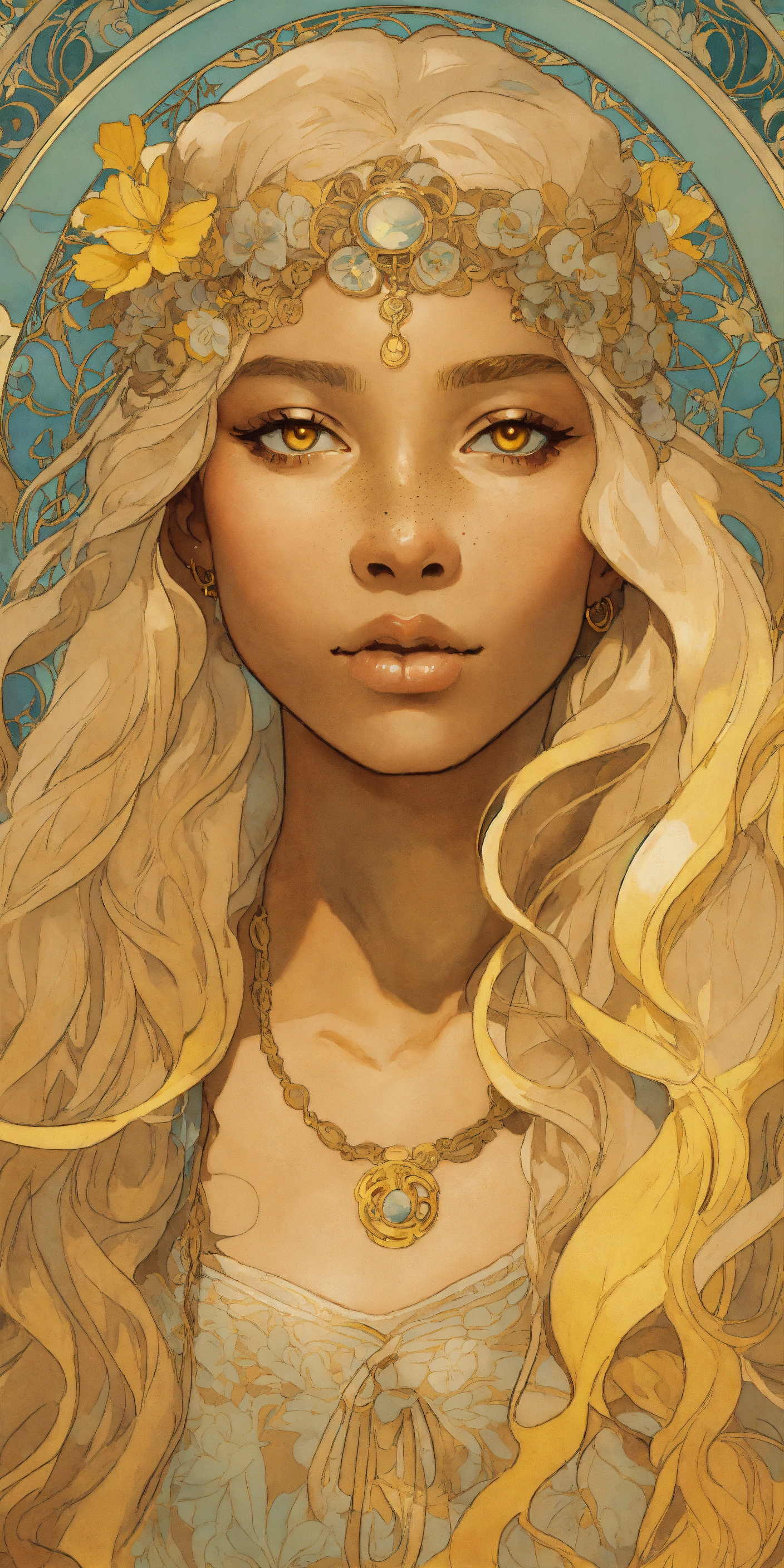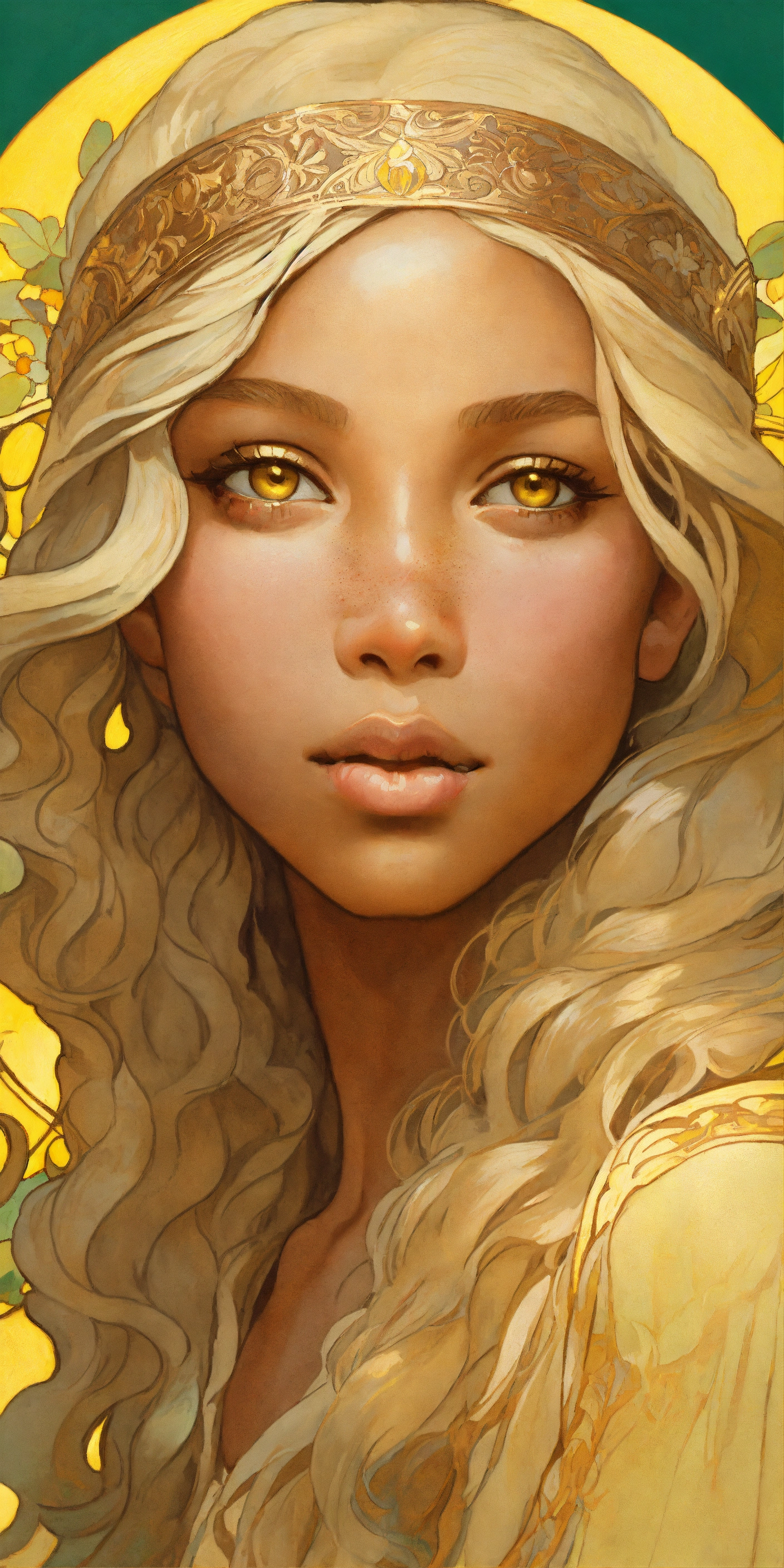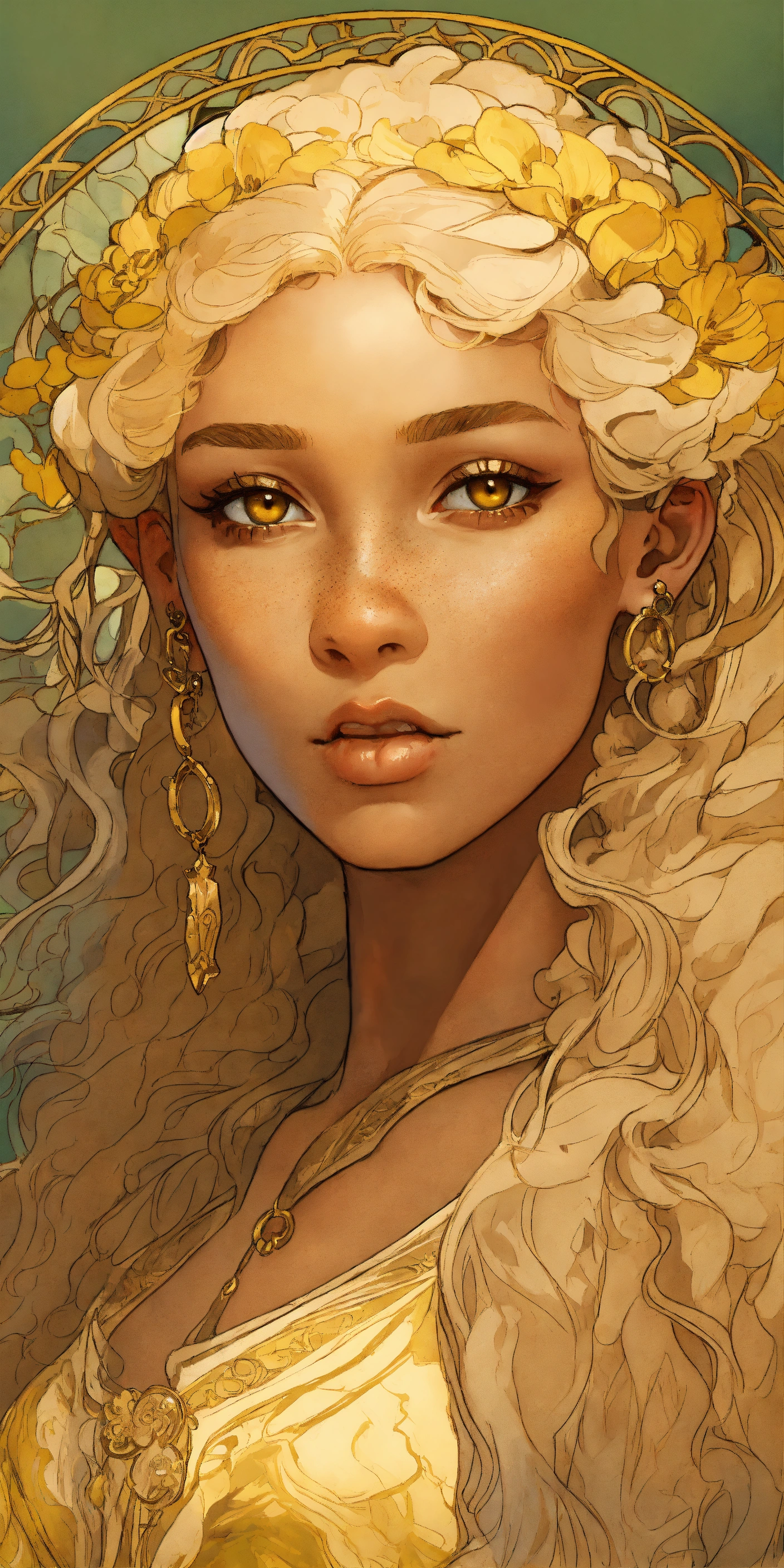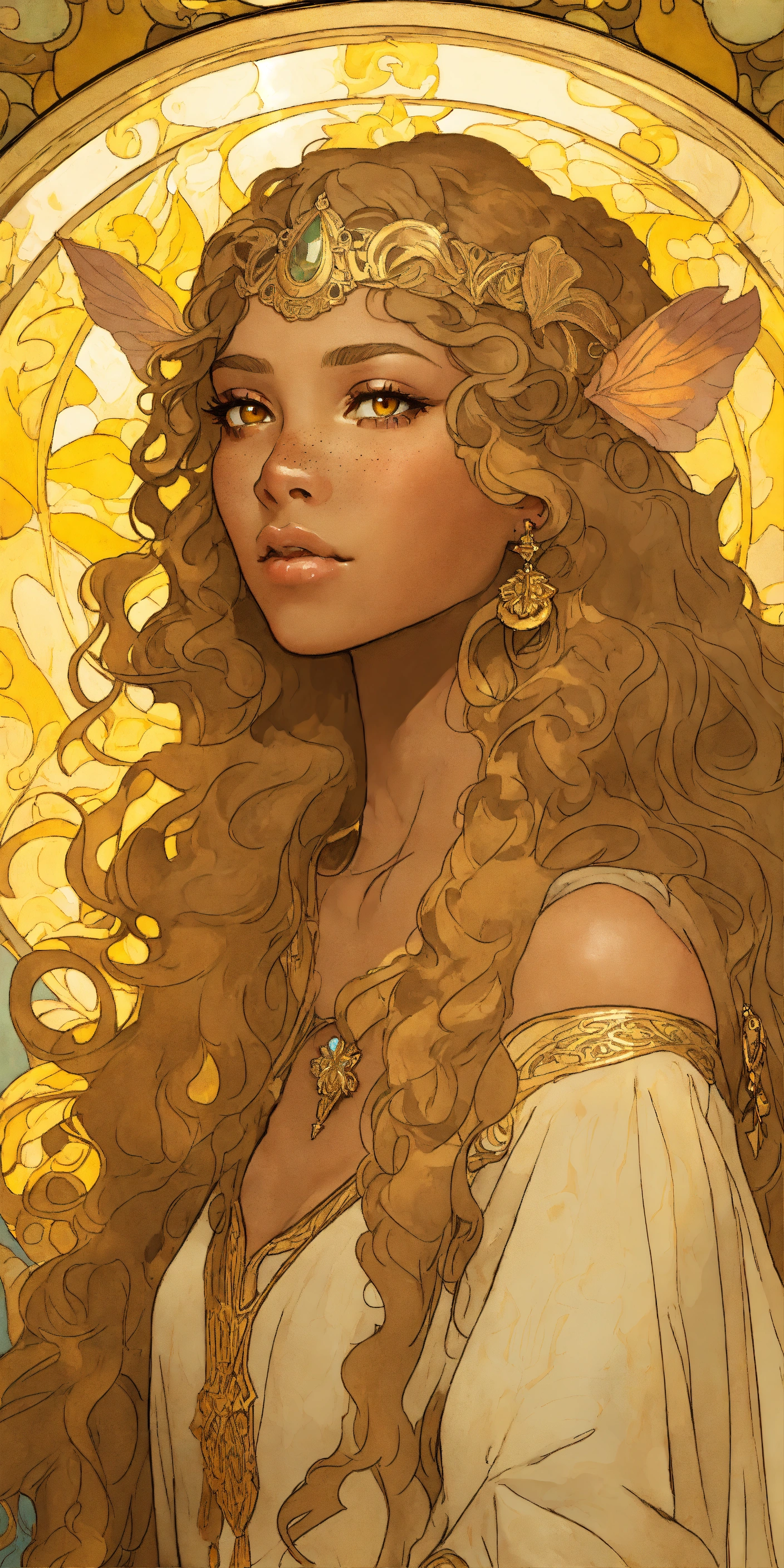 Portrait of a young elf biracial woman with bronze skin, bright yellow eyes, freckles, high cheekbones, long curly blonde hair, wearing light gold women, art by alphonse mucha, stylized, intricate, delicate, princess, mommy