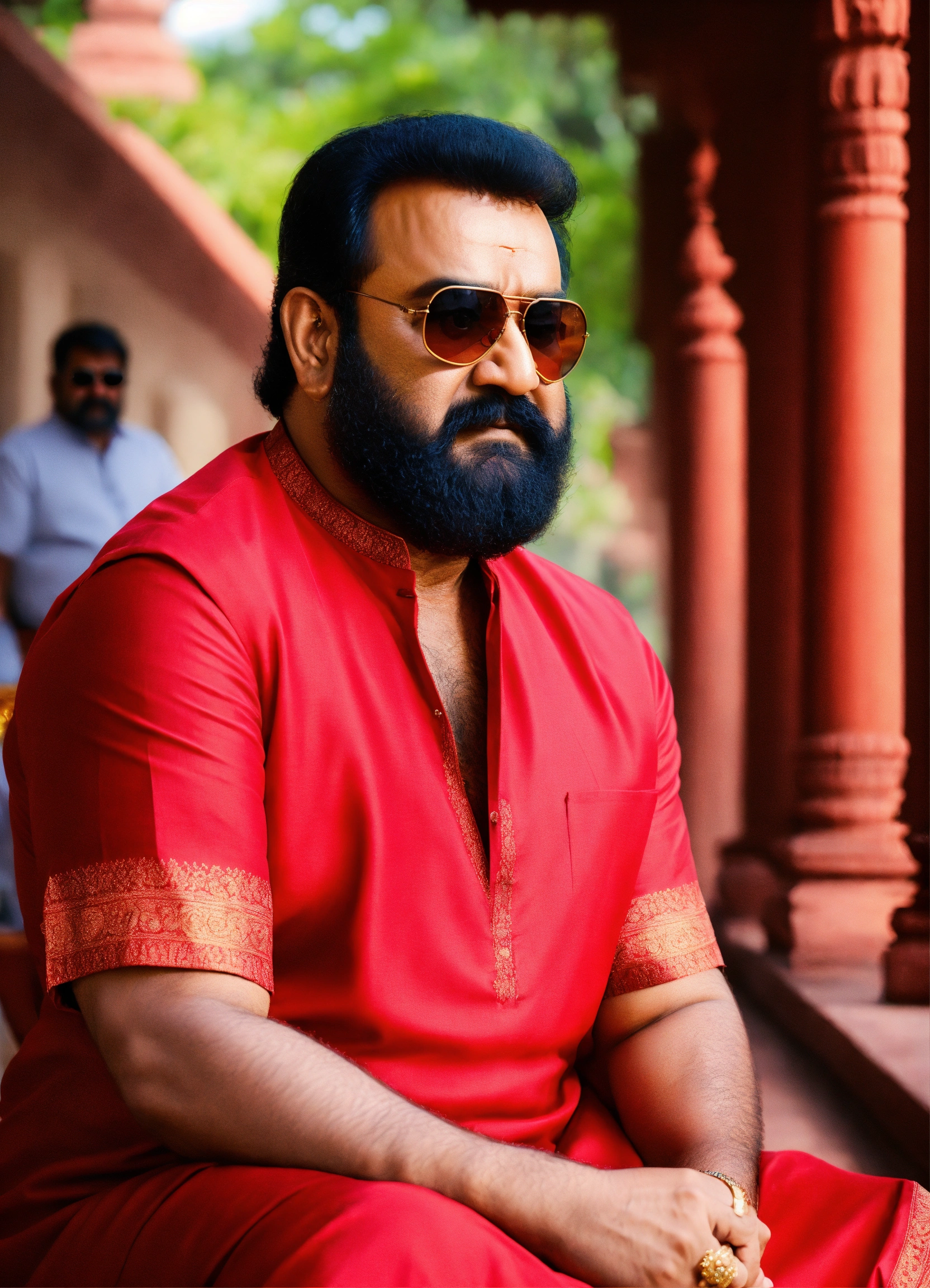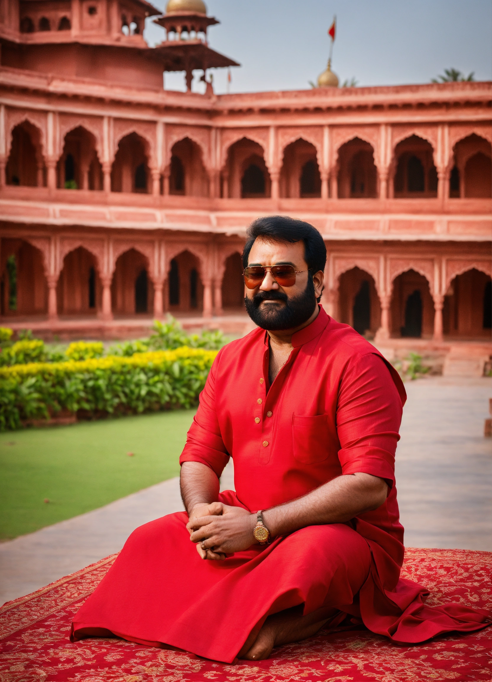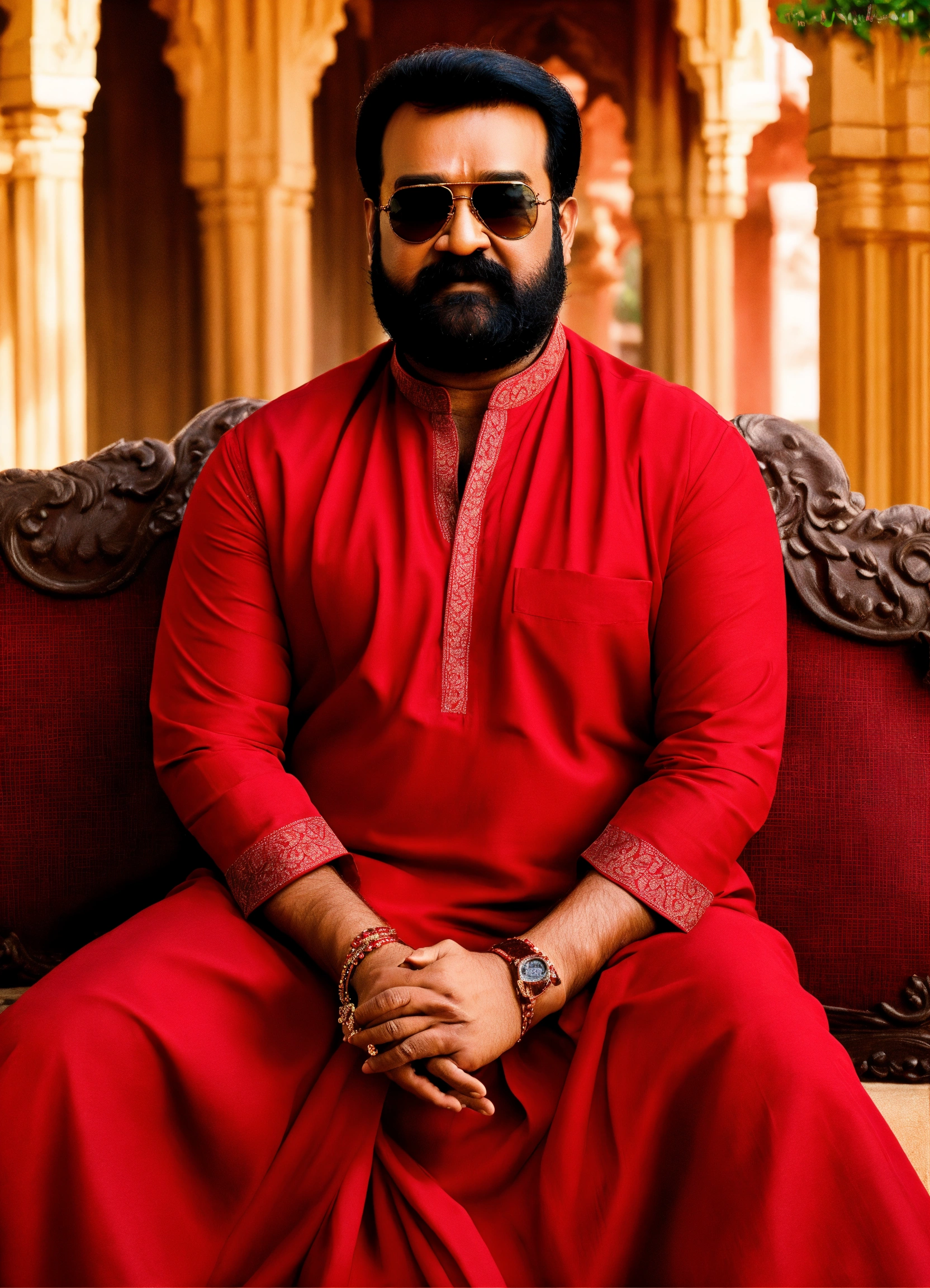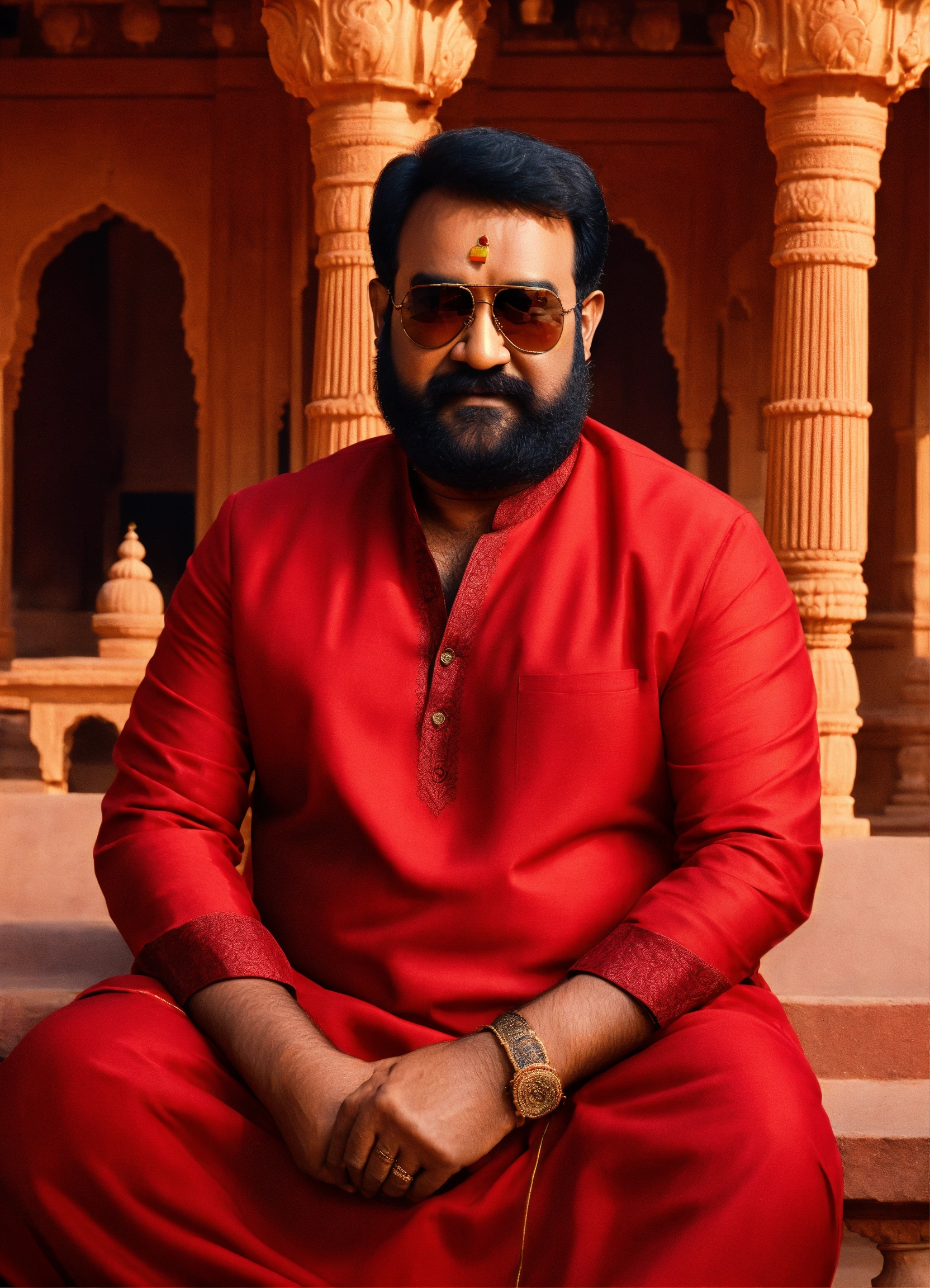 Give me the most realistic image of mohanlal with sunglasses on wearing a red kurta, and sitting in front of a palace